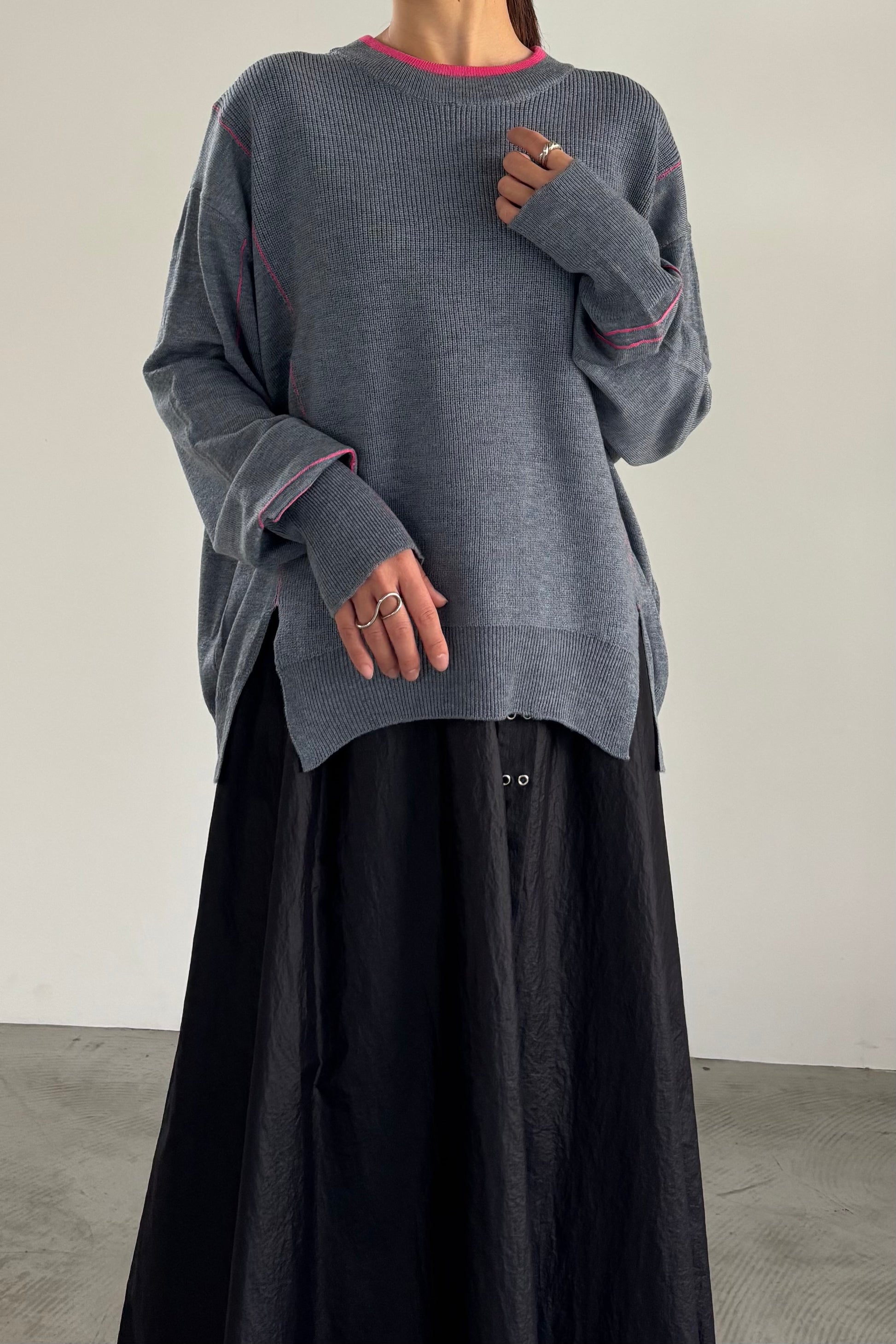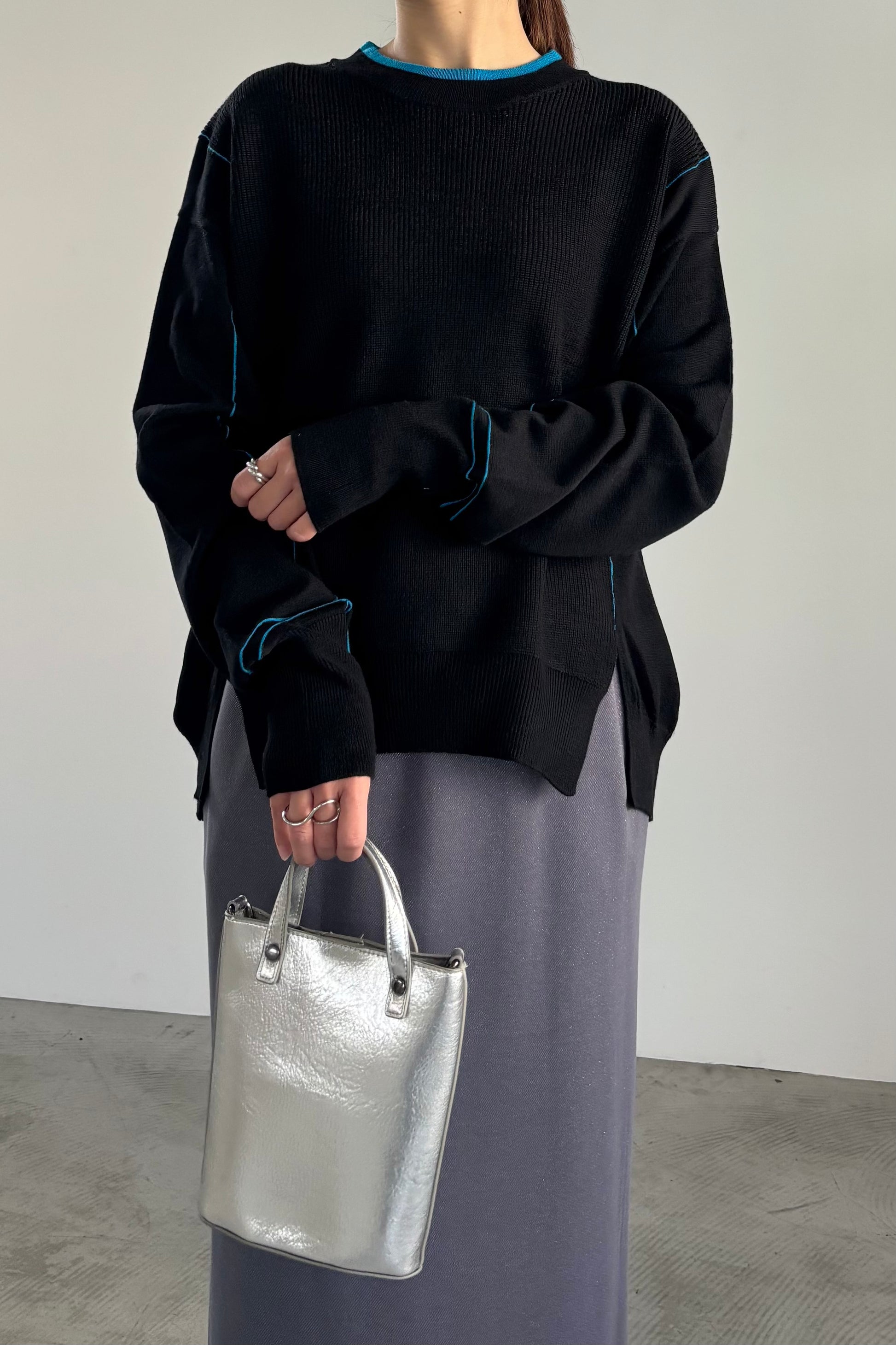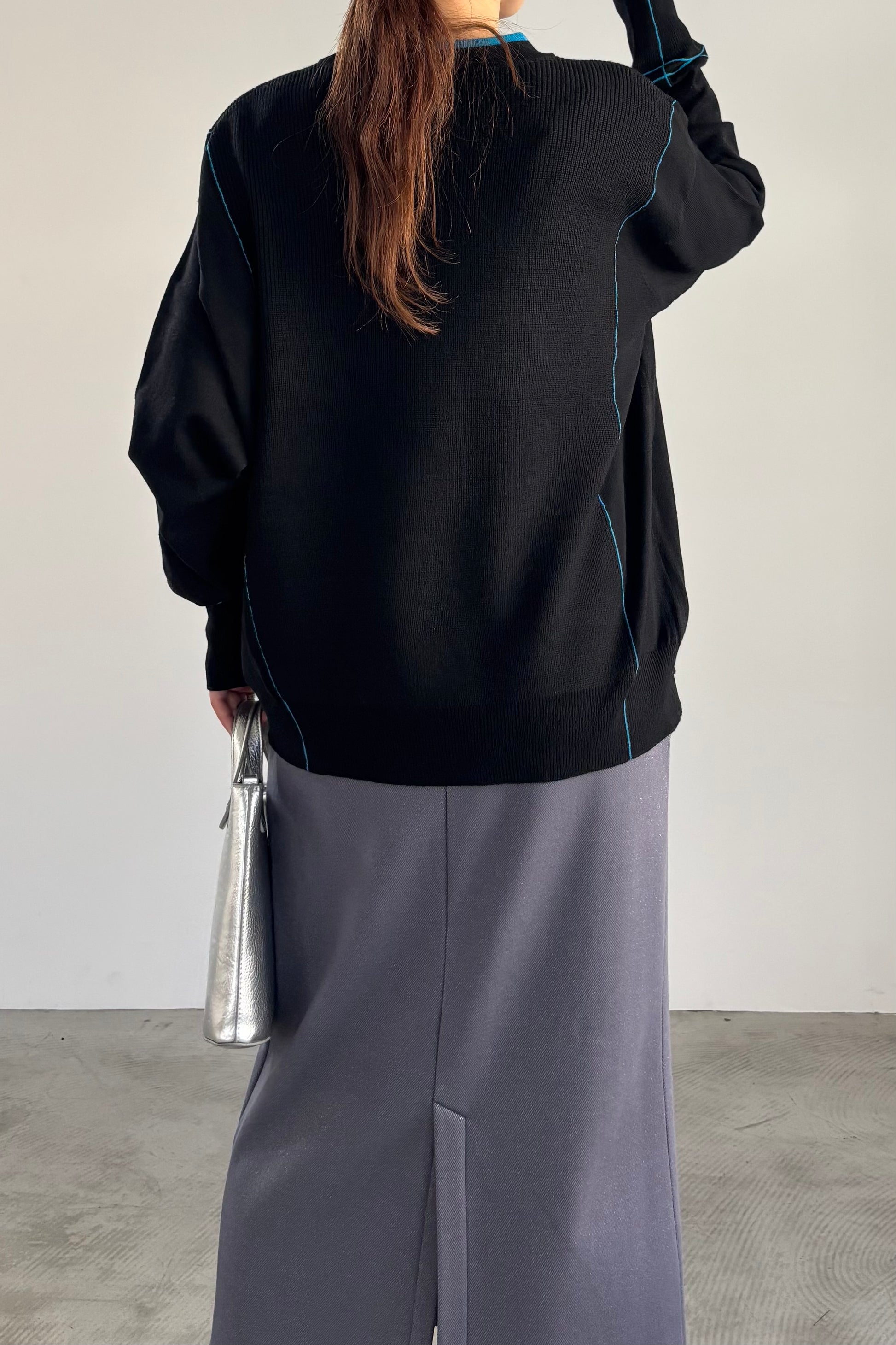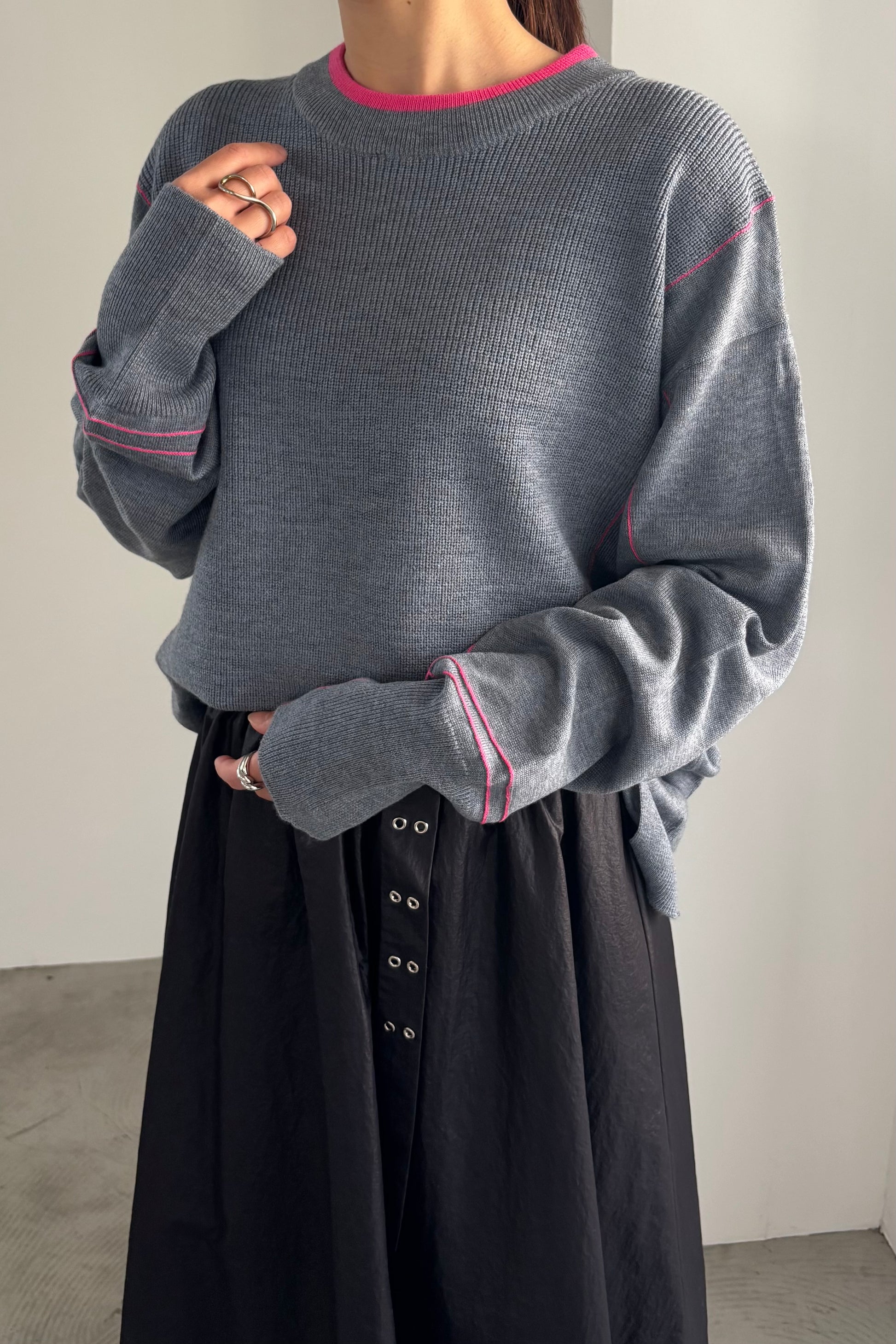 袖口や衿元に施したポップなカラーが目を惹くバイカラーニット。さりげない配色が華やかさをプラスしてくれます。柔らかくしっとりした肌触り且つゆとりのあるシルエットなのでデイリー使いにぴったりのアイテムです。