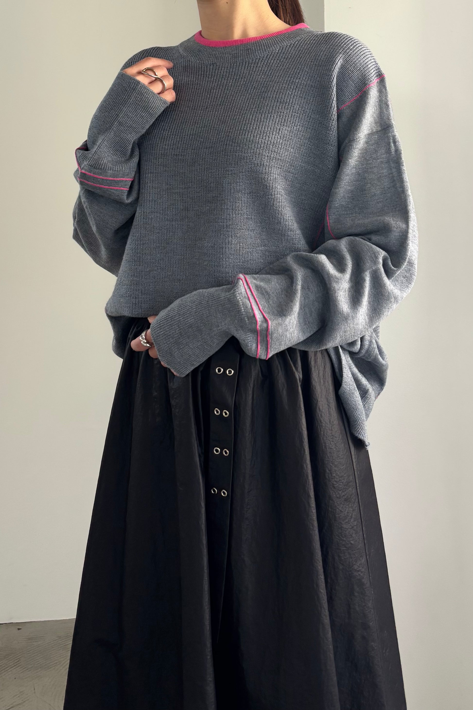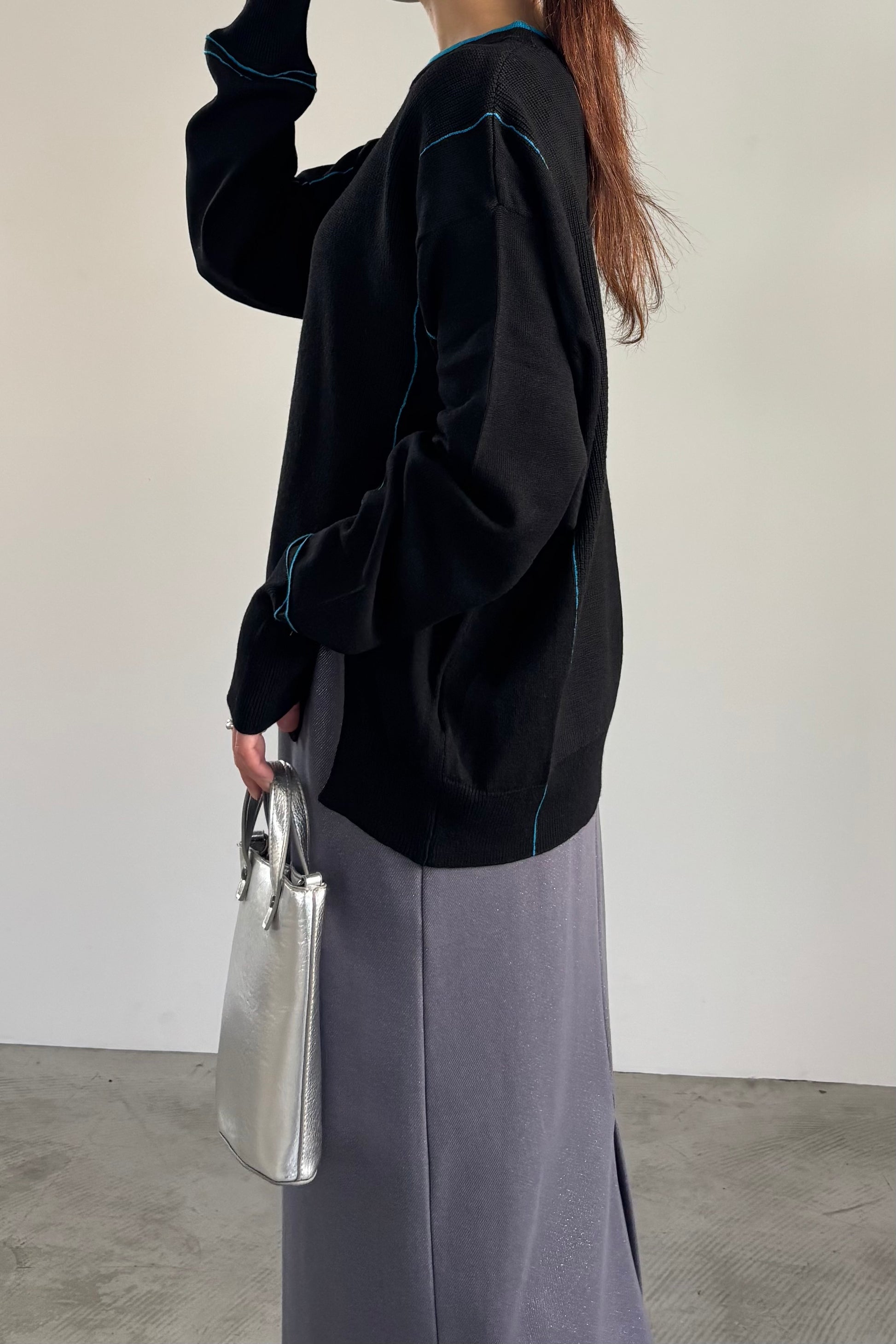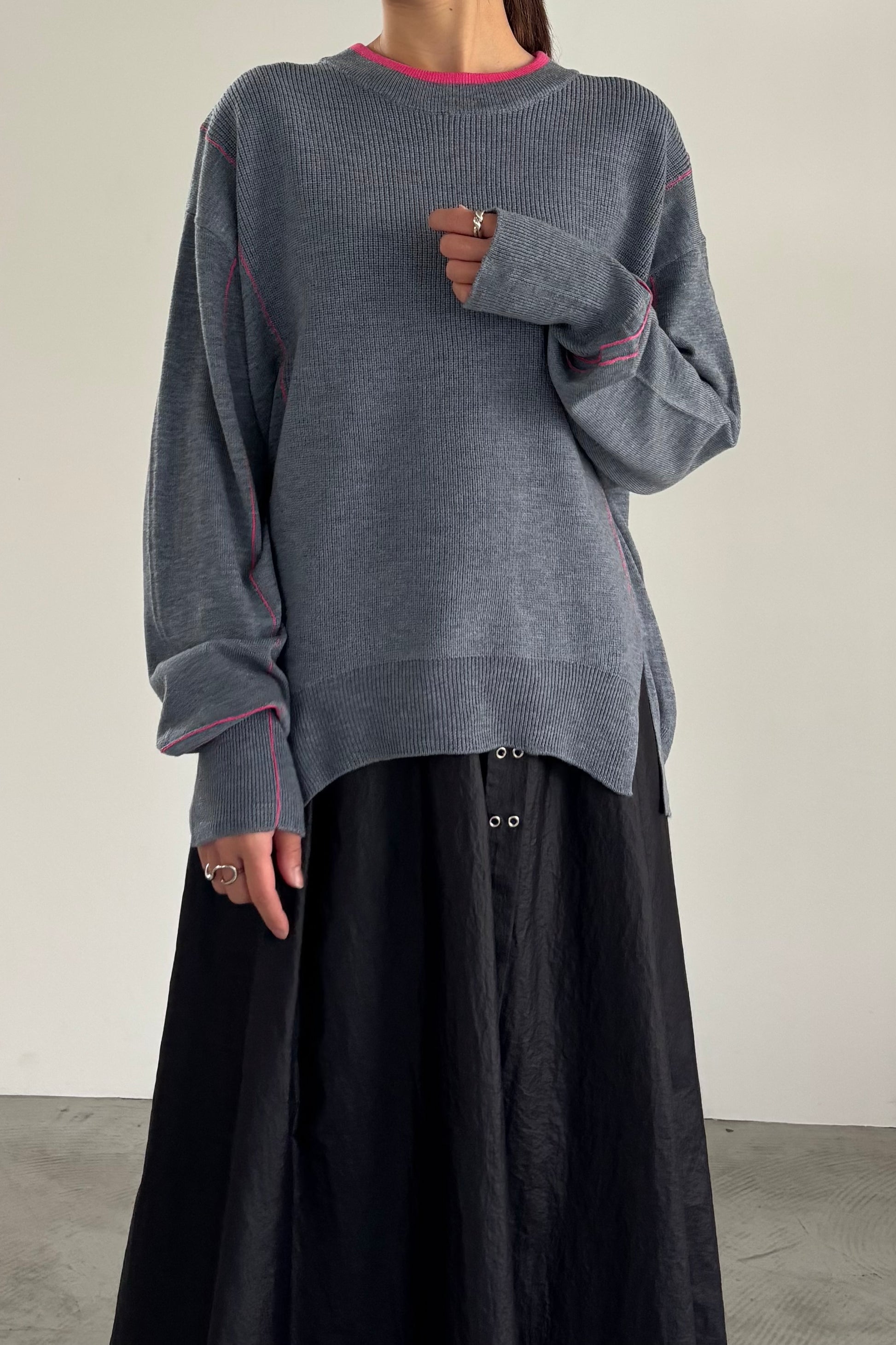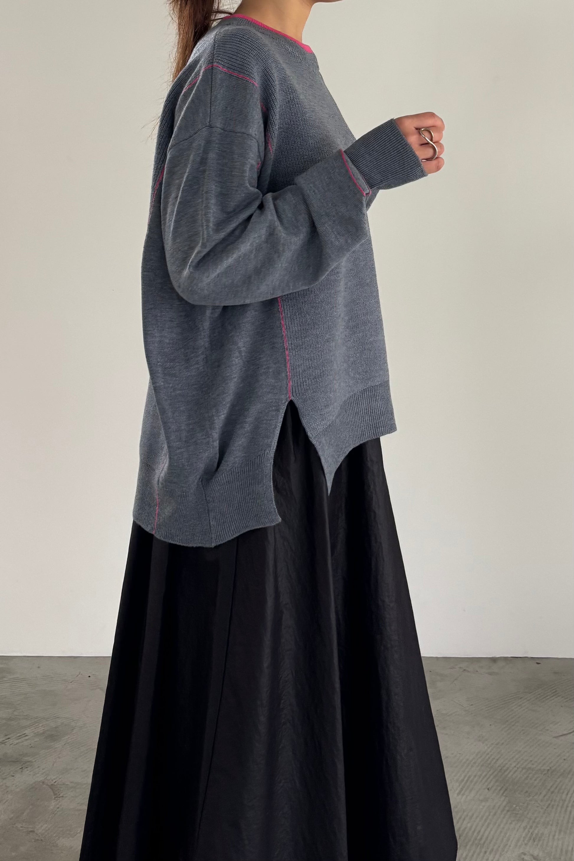 袖口や衿元に施したポップなカラーが目を惹くバイカラーニット。さりげない配色が華やかさをプラスしてくれます。柔らかくしっとりした肌触り且つゆとりのあるシルエットなのでデイリー使いにぴったりのアイテムです。