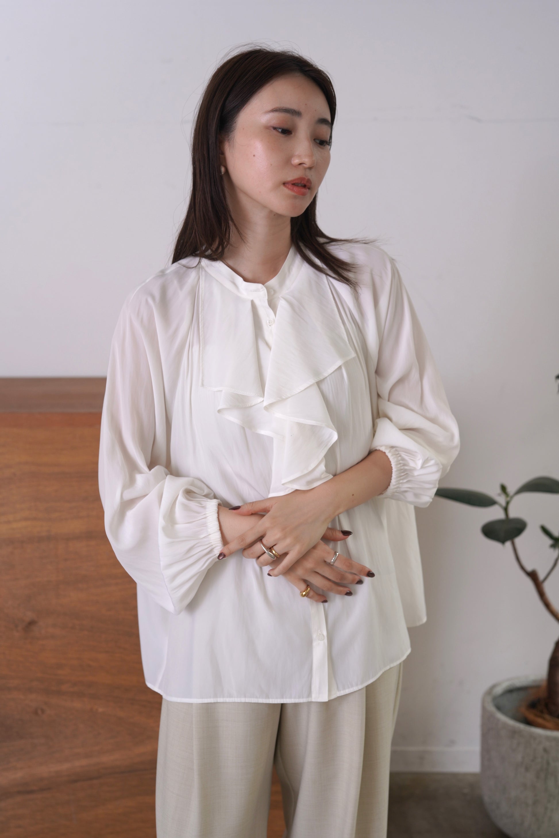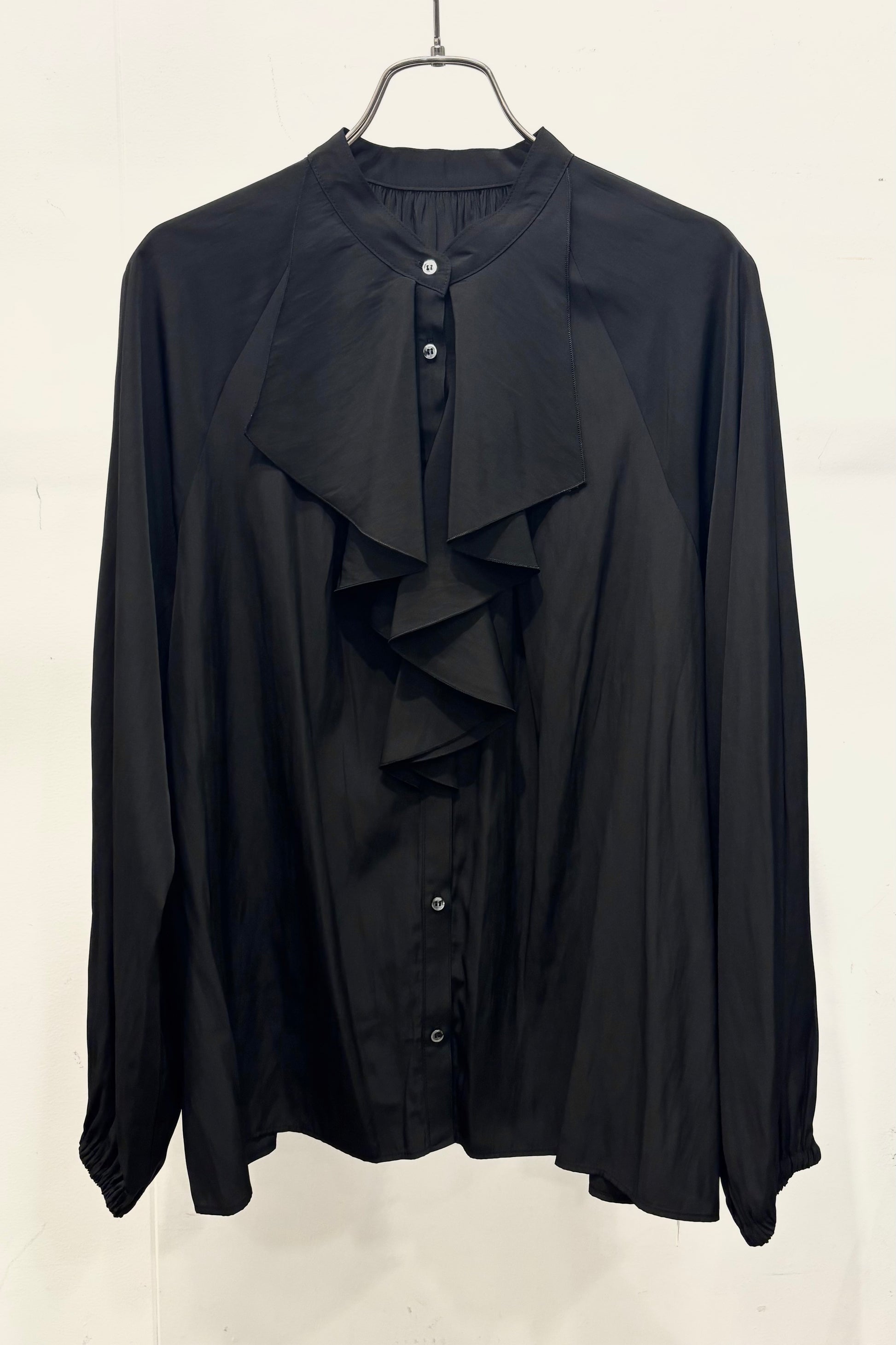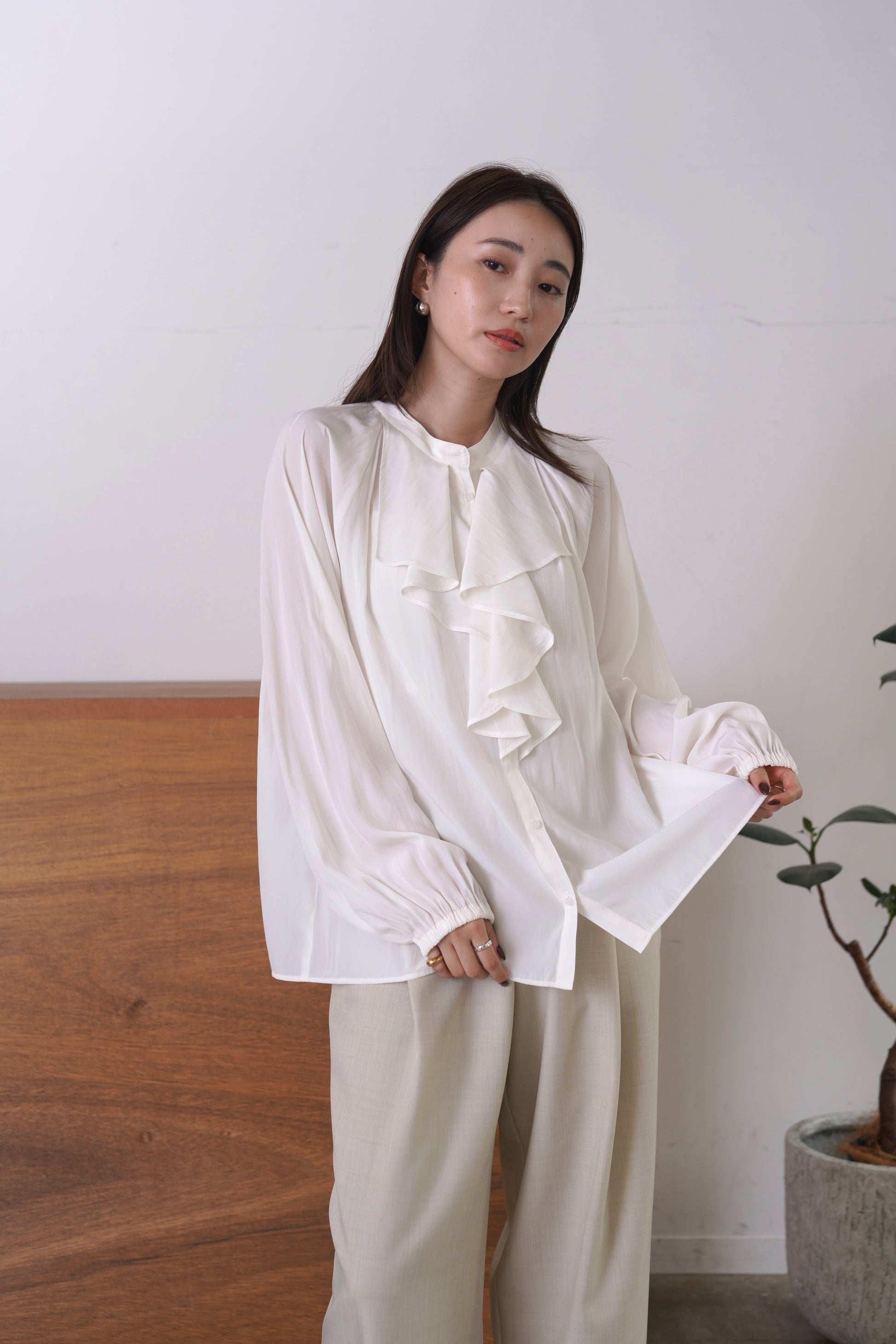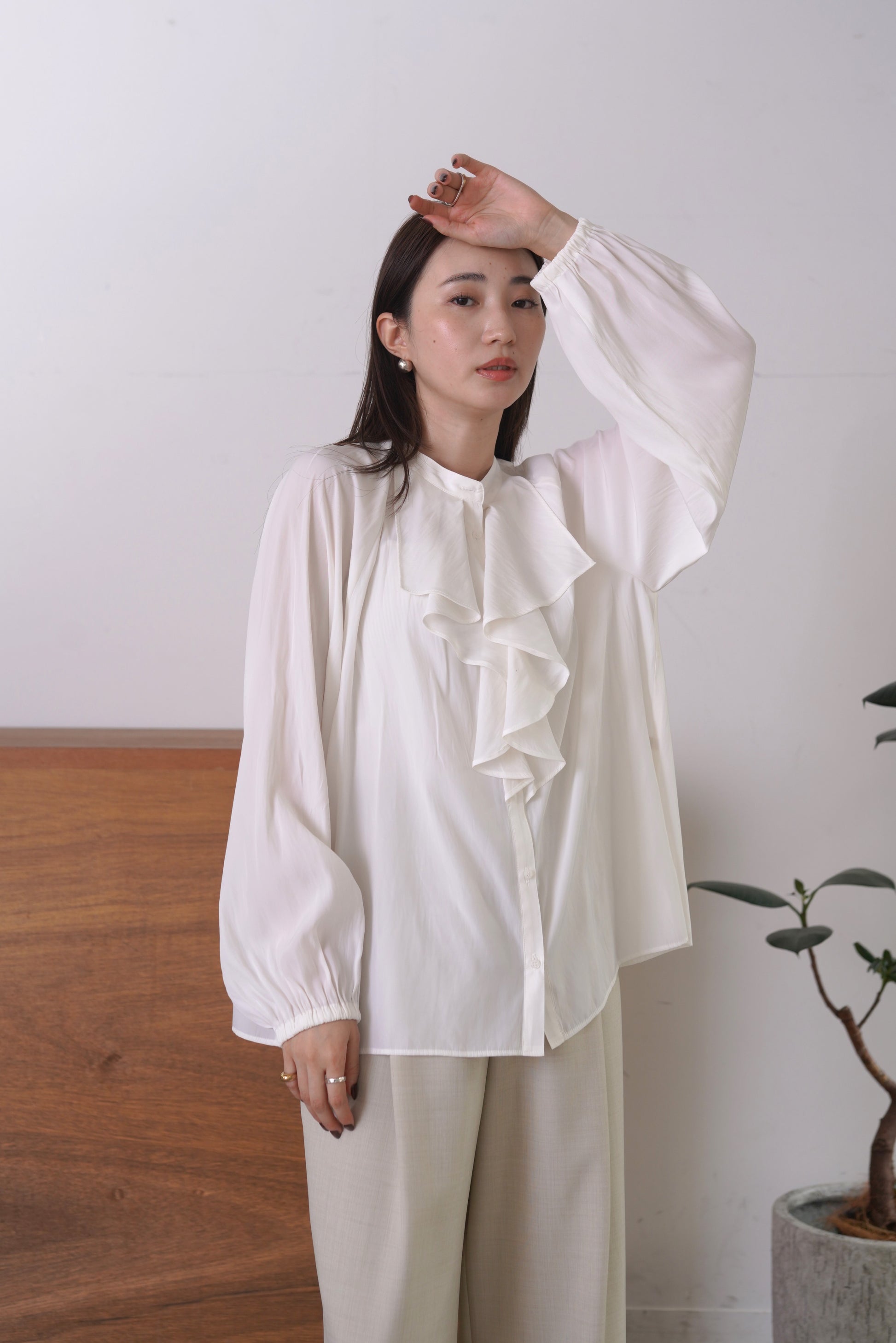 シルクの様な光沢感と軽さの割線サテンブラウス。フロントにあしらったフリルがゆらめき、オフィスやオケージョンシーンはもちろん、あらゆるシーンにフィットする優秀ブラウス。袖口はゴムを入れて、捲り上げやすく仕上げました。イージーケアで、シーズンレスに活躍します。