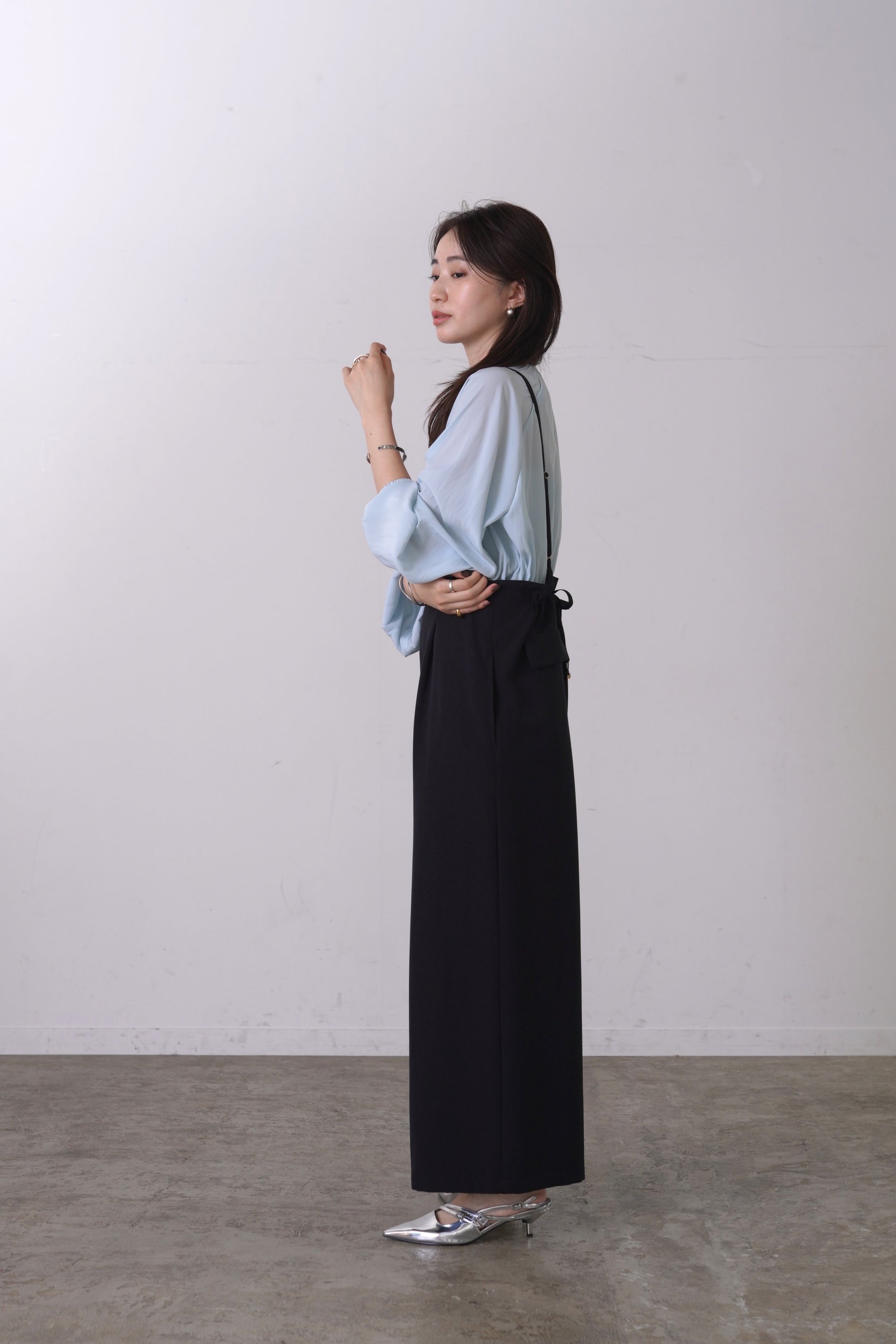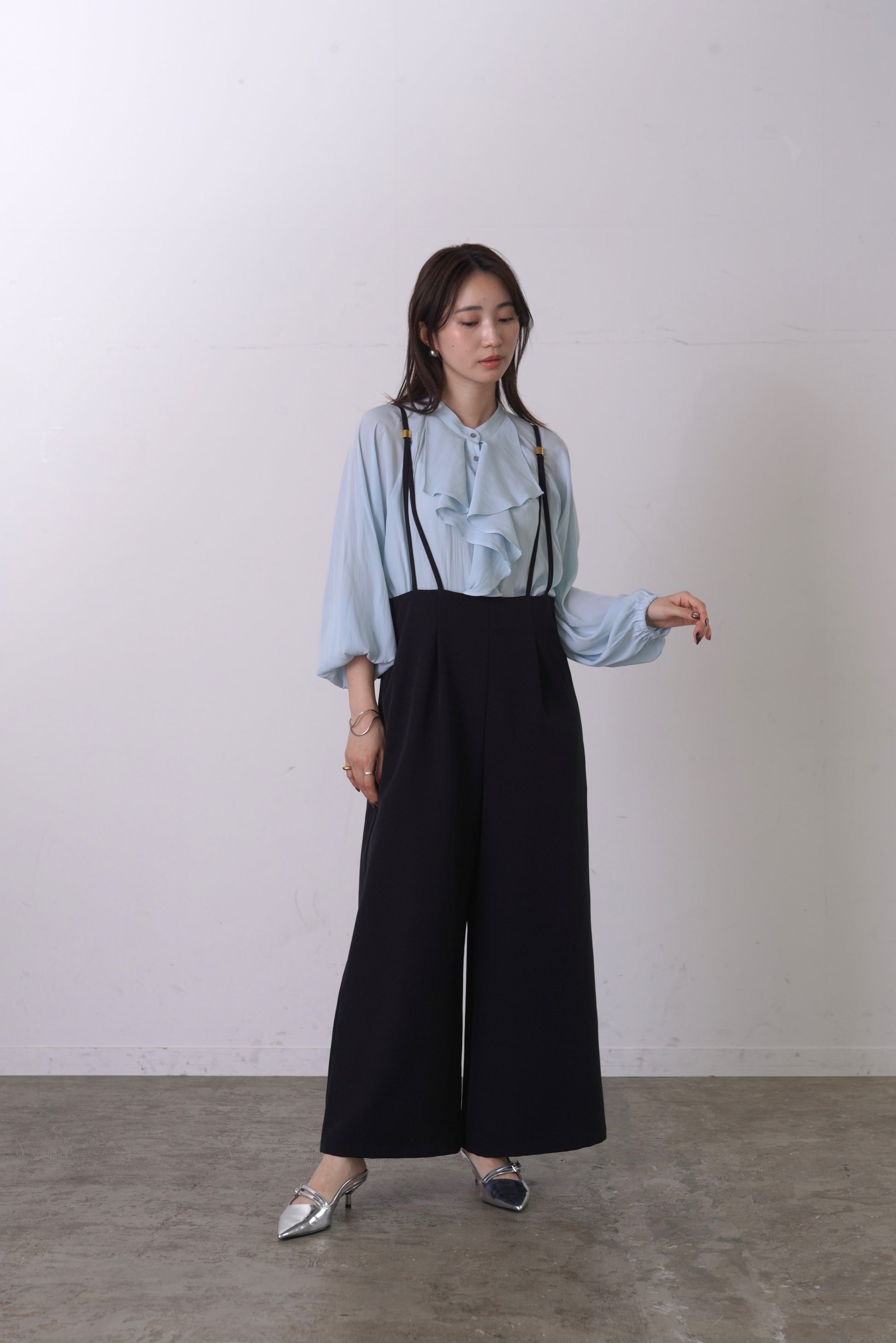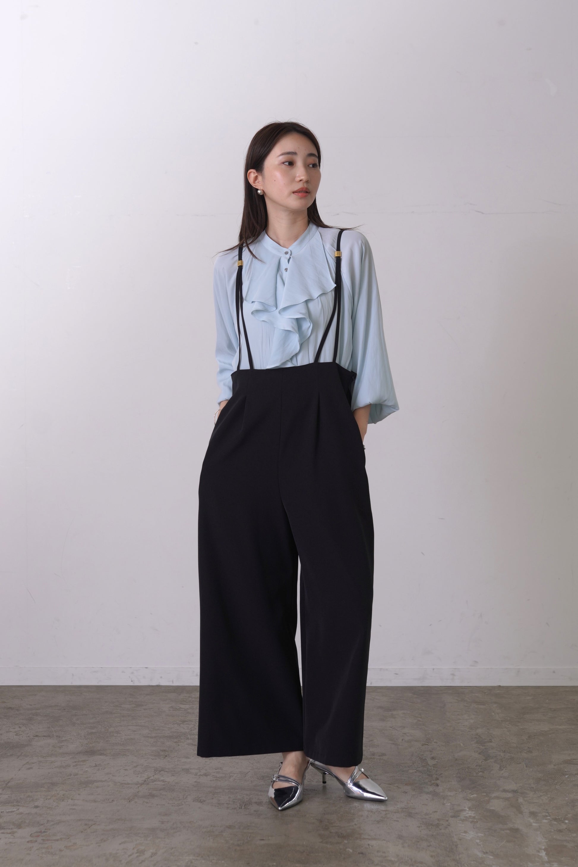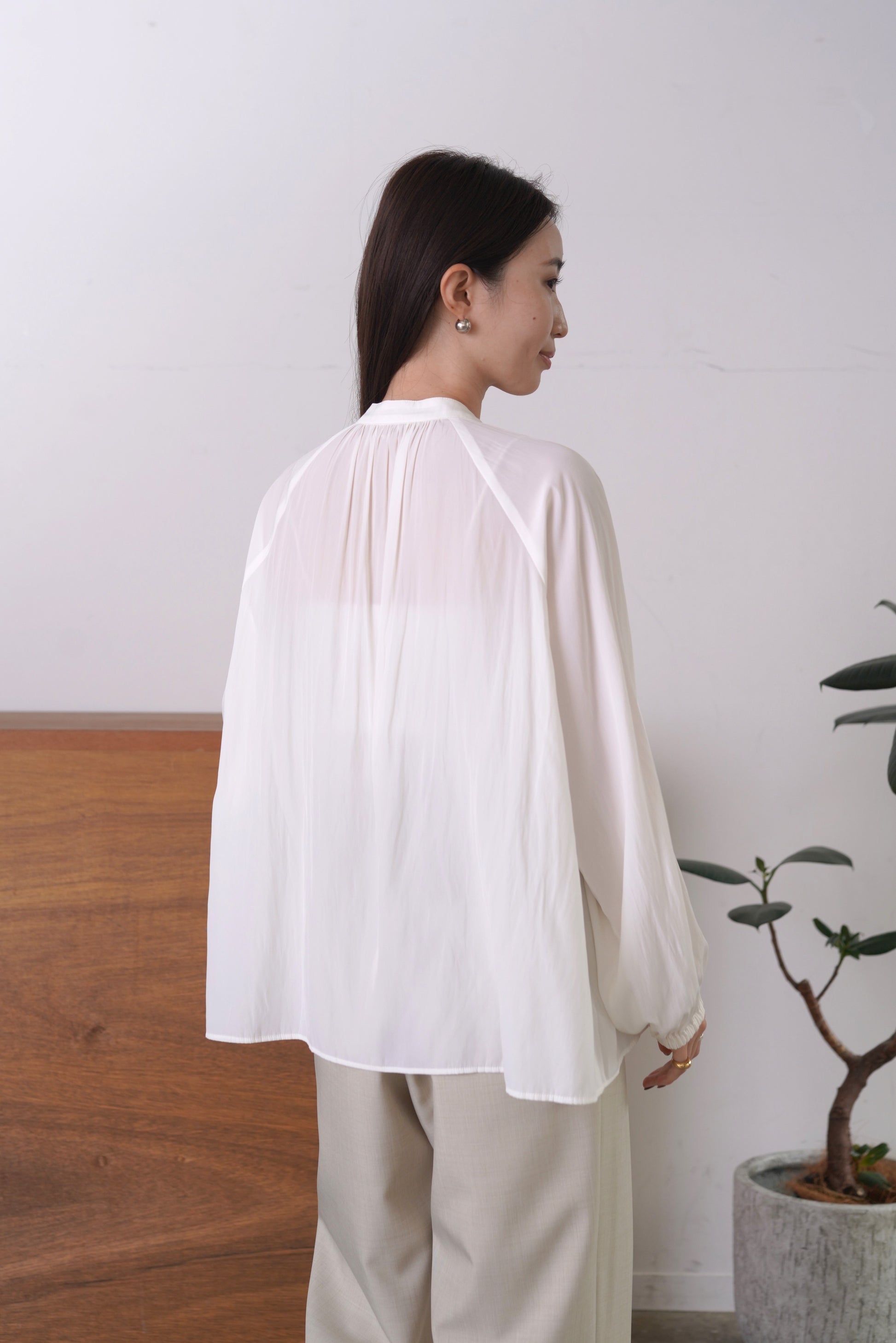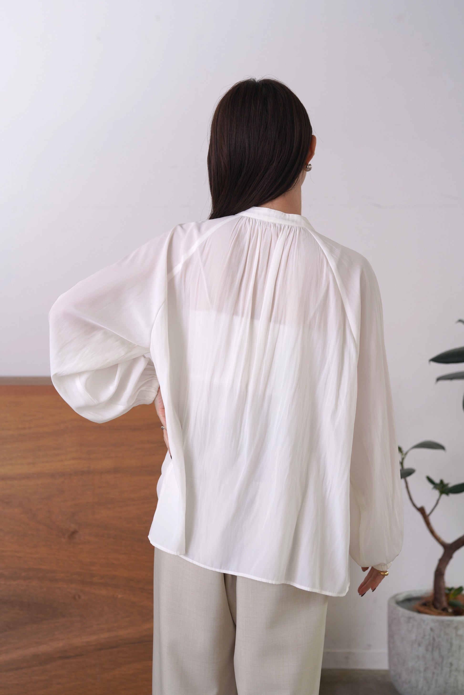 シルクの様な光沢感と軽さの割線サテンブラウス。フロントにあしらったフリルがゆらめき、オフィスやオケージョンシーンはもちろん、あらゆるシーンにフィットする優秀ブラウス。袖口はゴムを入れて、捲り上げやすく仕上げました。イージーケアで、シーズンレスに活躍します。