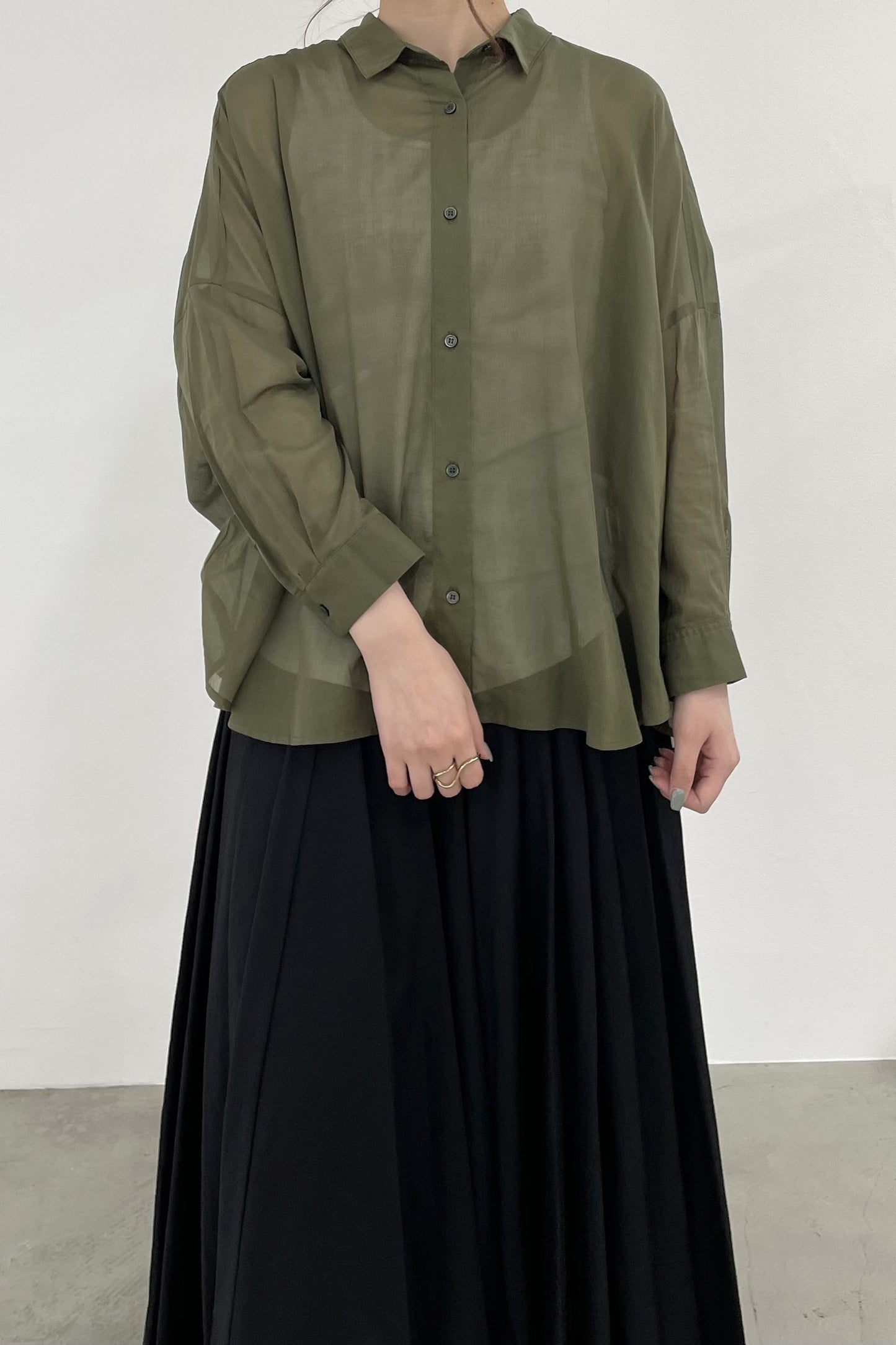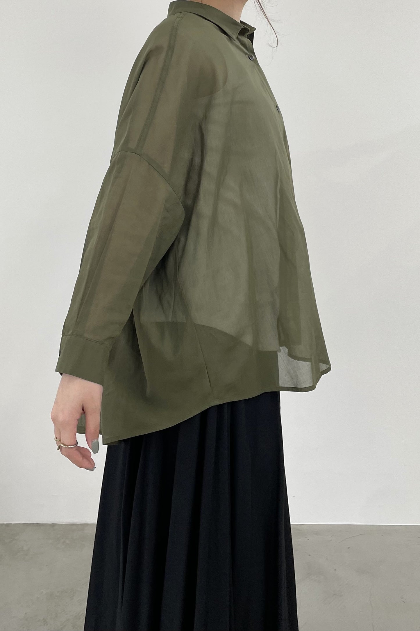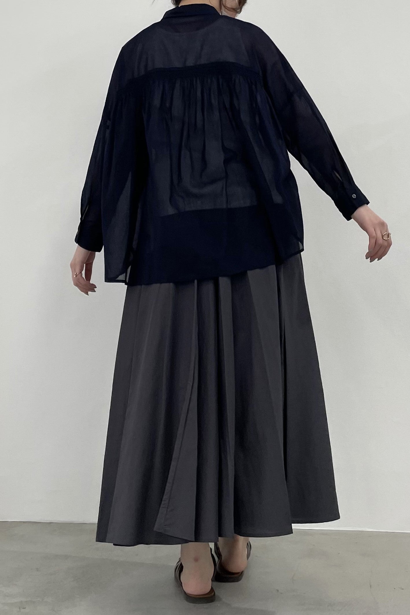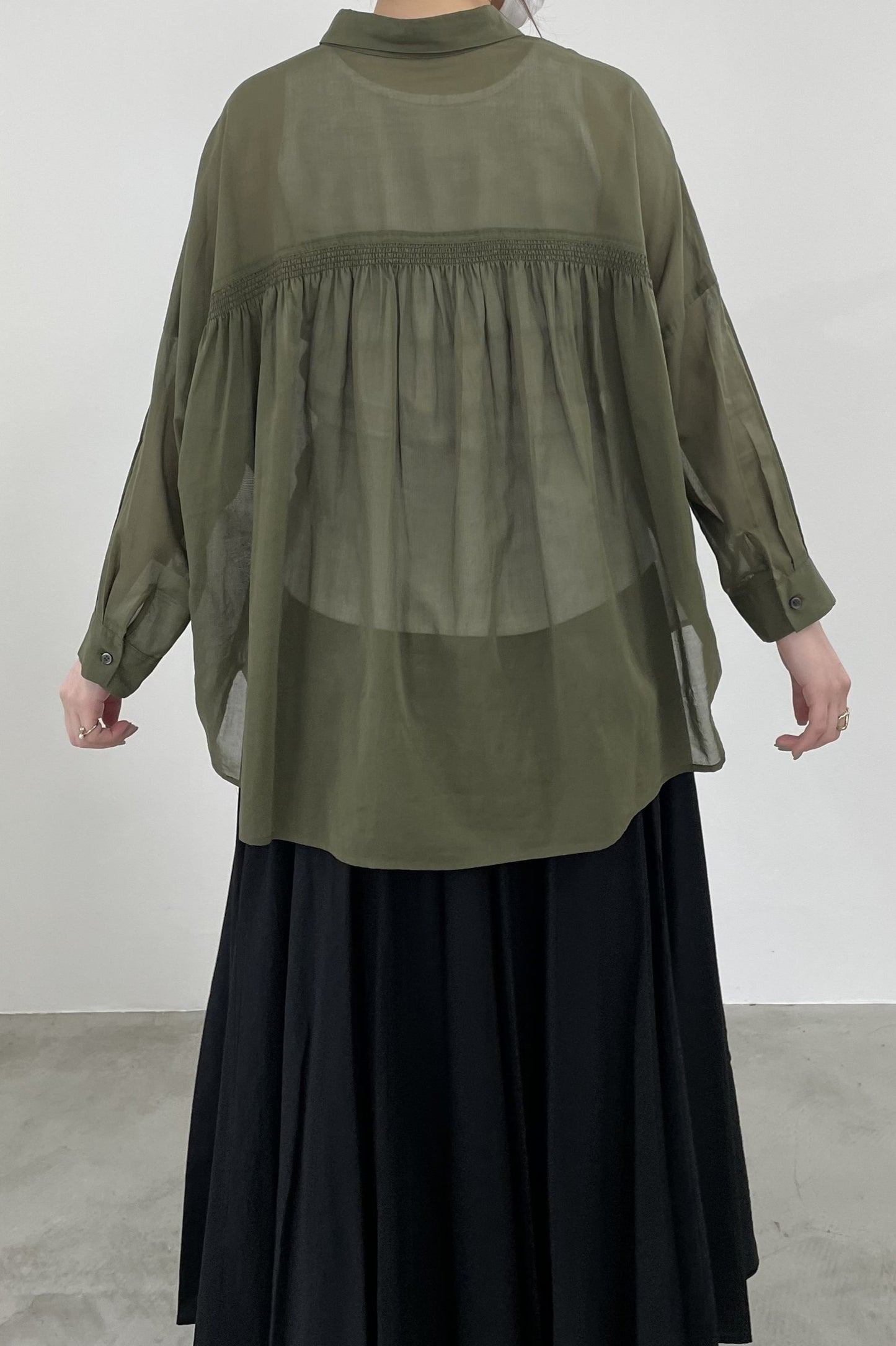 程よい透け感で、肌にまとわりつかないシャリ感のあるコットンボイルシャツ。シンプルなワイドシルエットの形ですが、後身頃はヨークのシャーリングがギャザーディテールを際立たせます。暑い季節の日除けや、冷房避けにぴったりなシャツです。