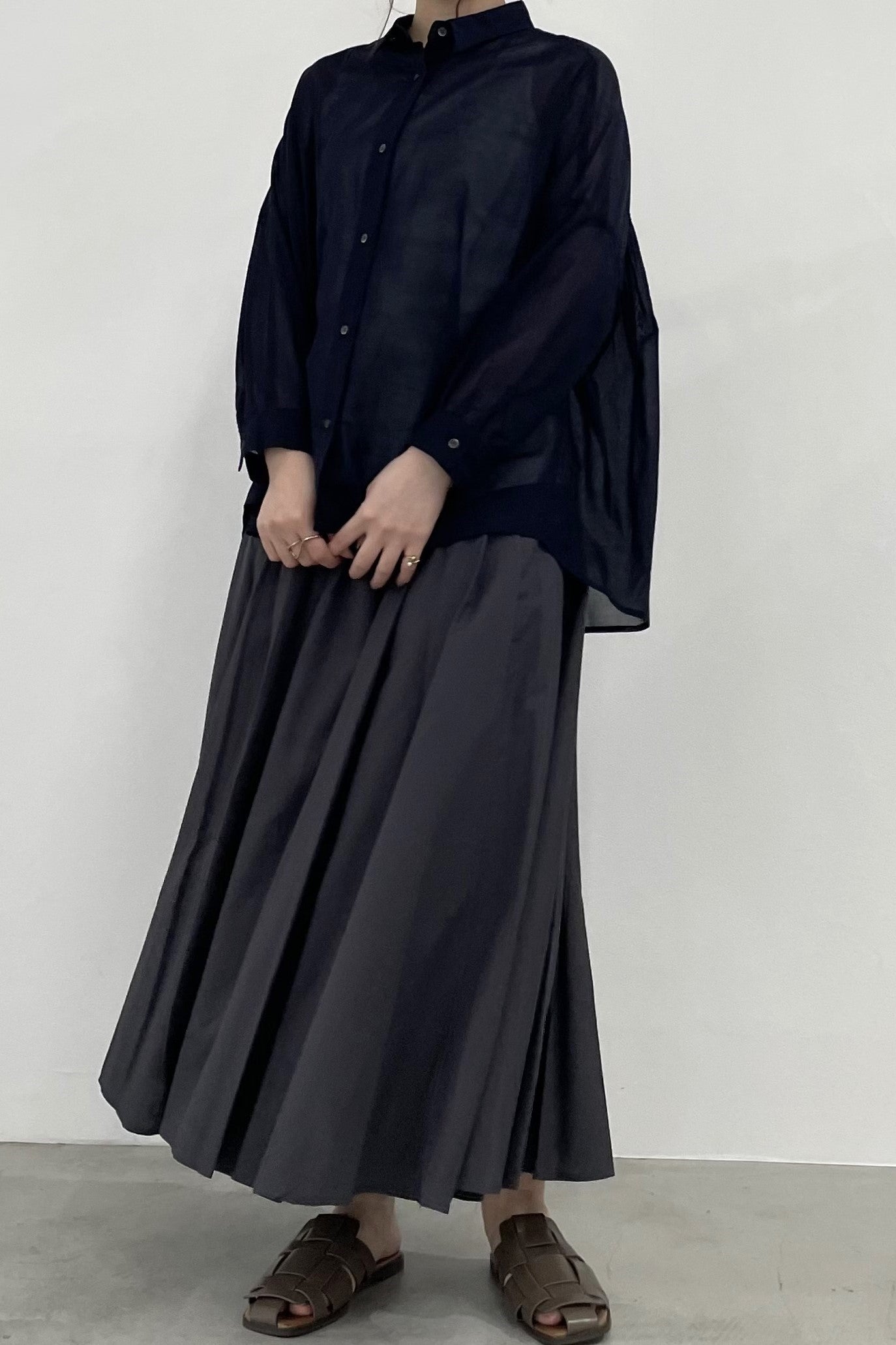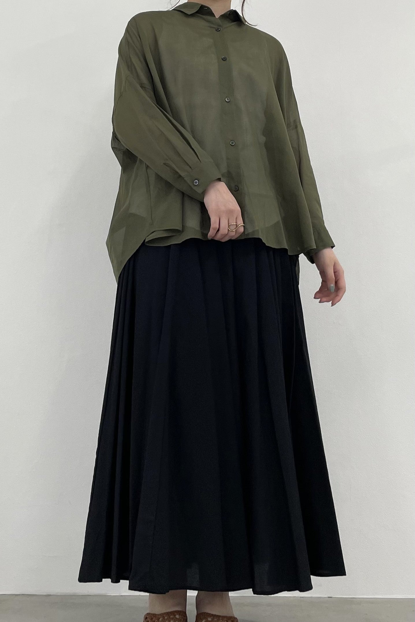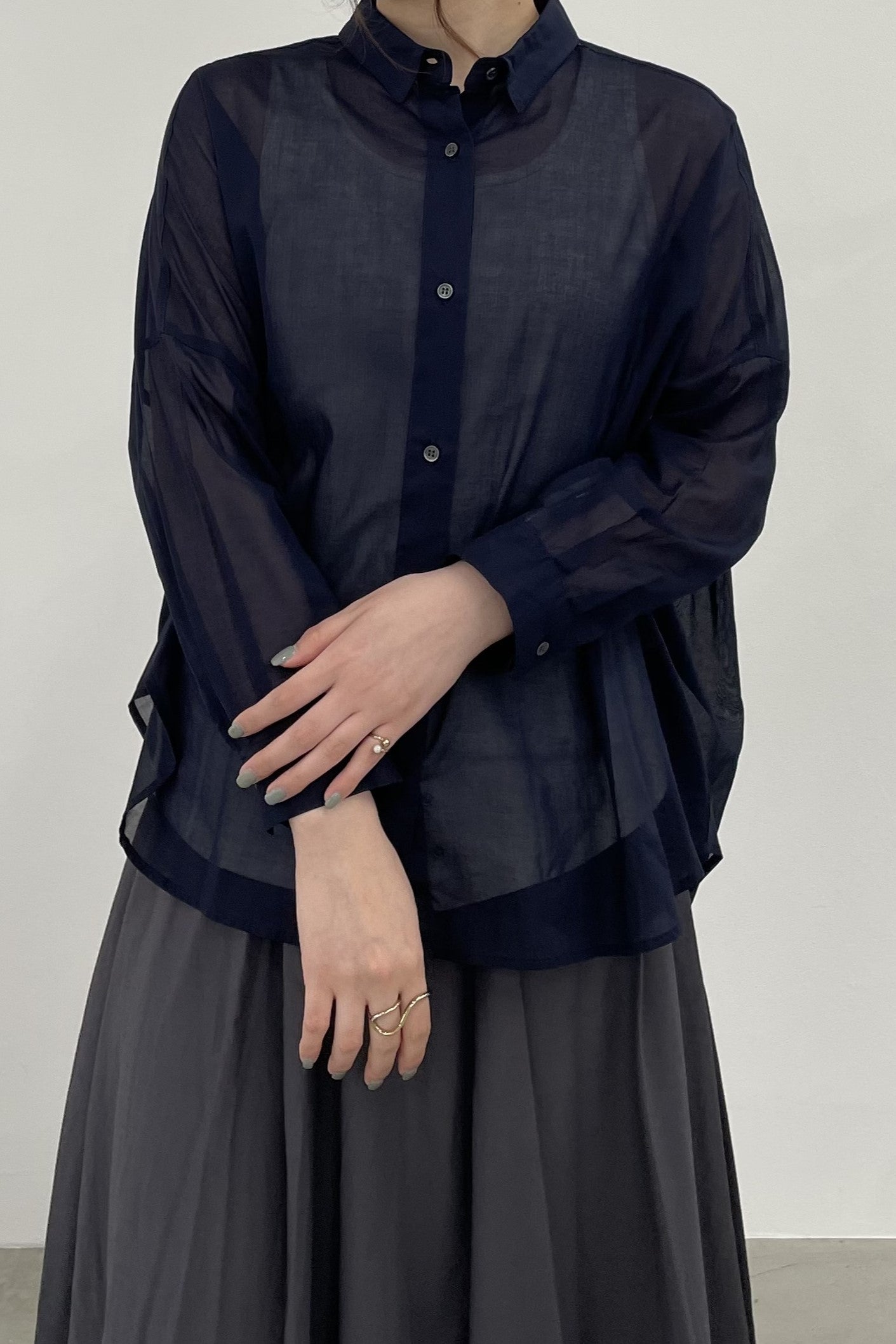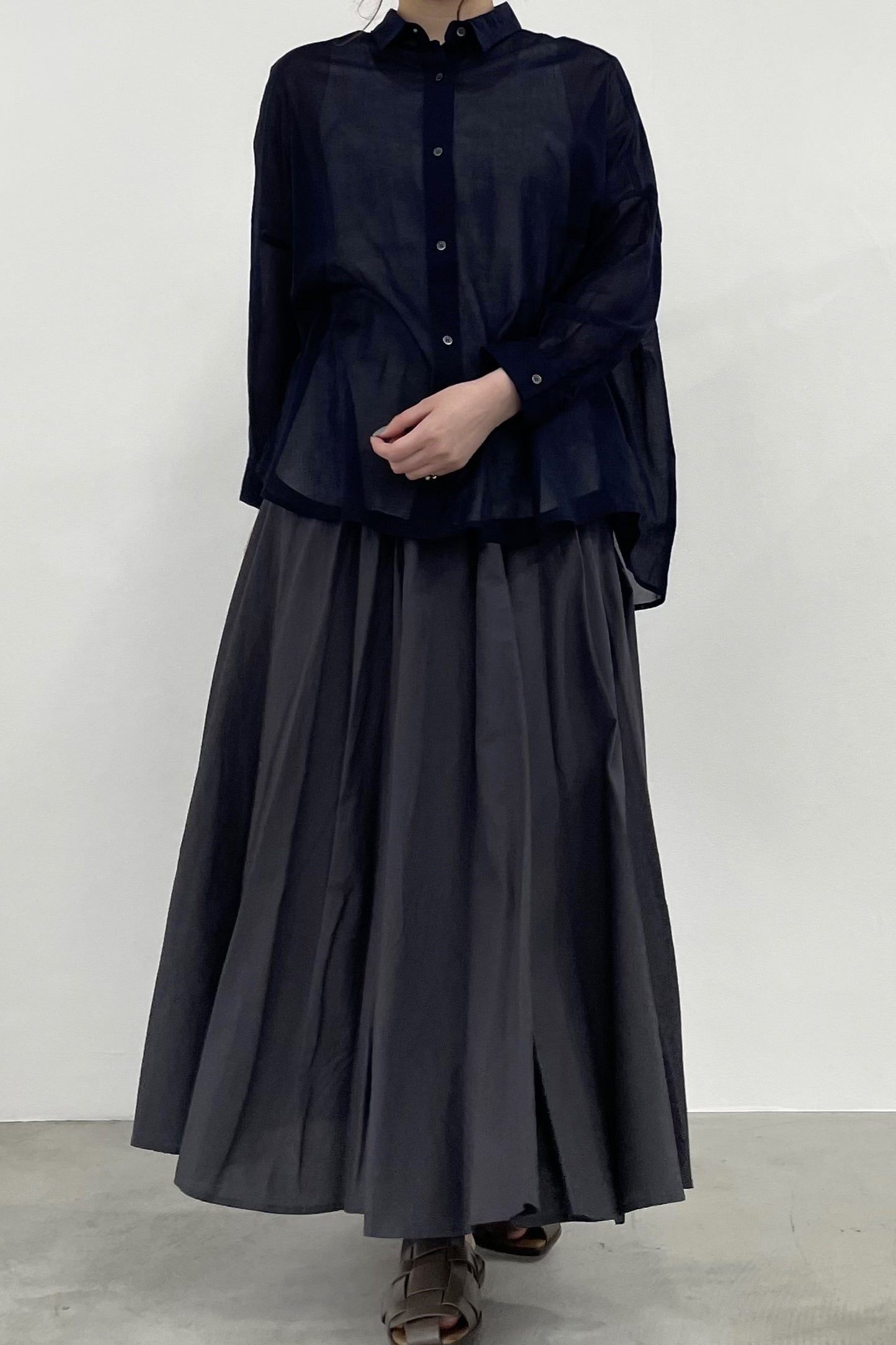 程よい透け感で、肌にまとわりつかないシャリ感のあるコットンボイルシャツ。シンプルなワイドシルエットの形ですが、後身頃はヨークのシャーリングがギャザーディテールを際立たせます。暑い季節の日除けや、冷房避けにぴったりなシャツです。