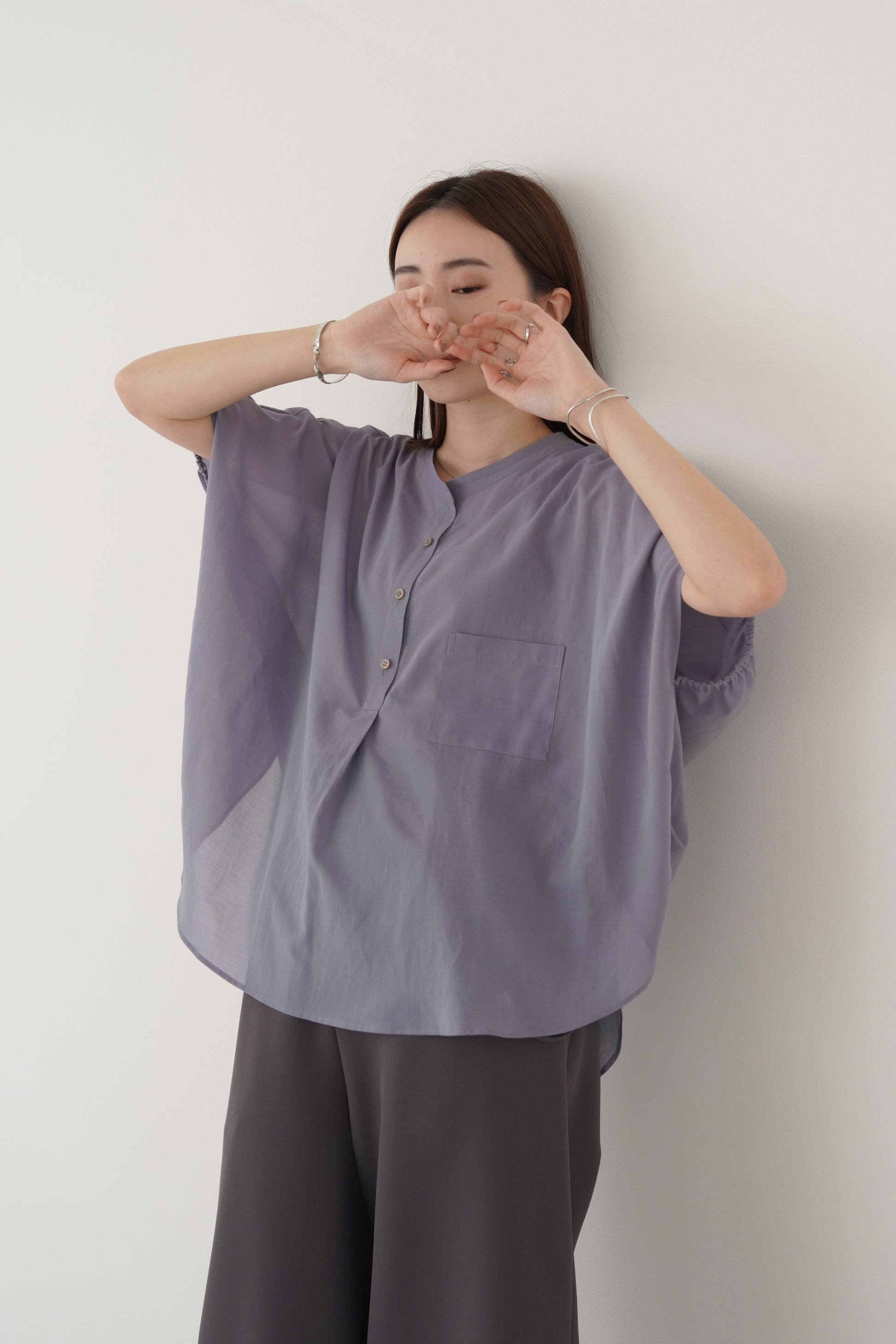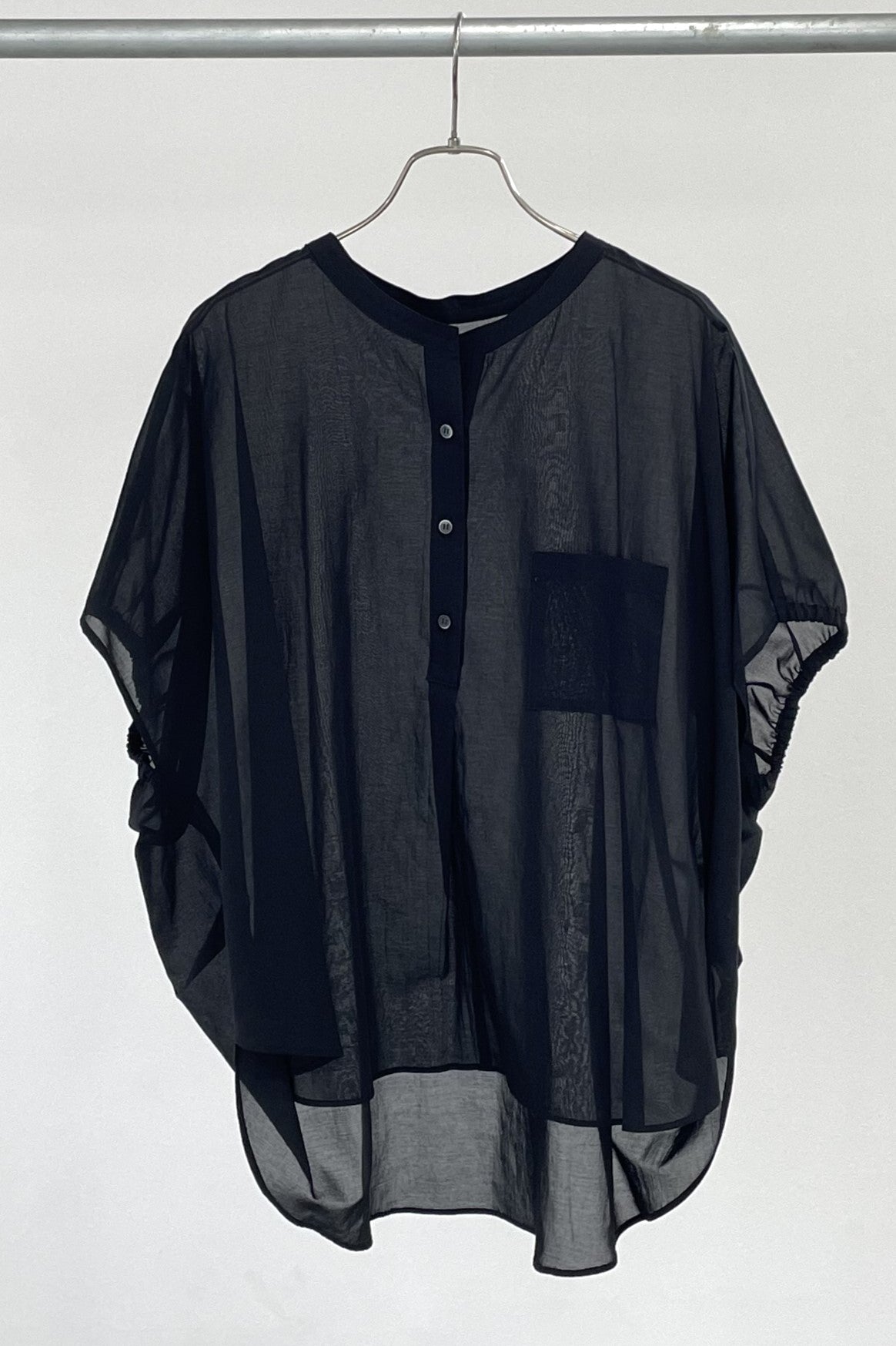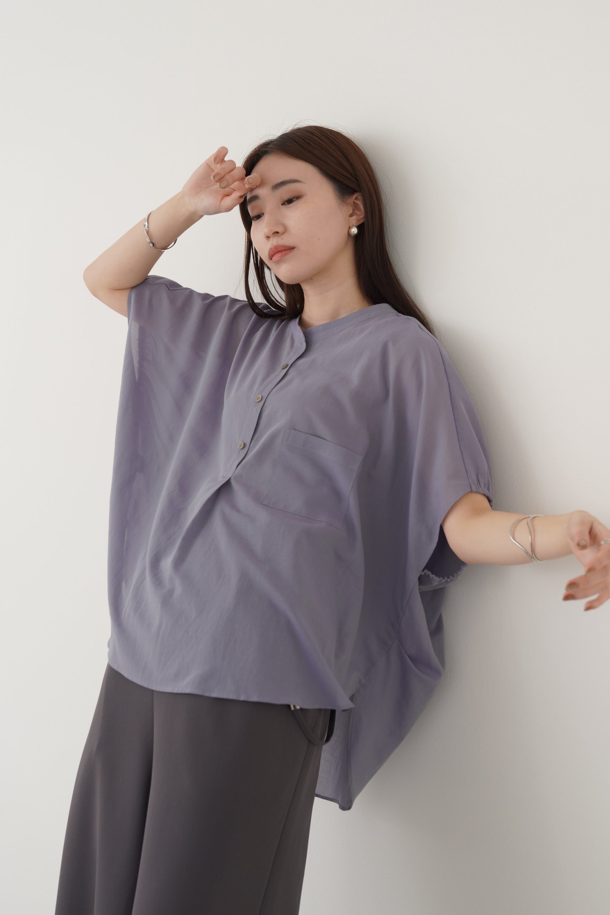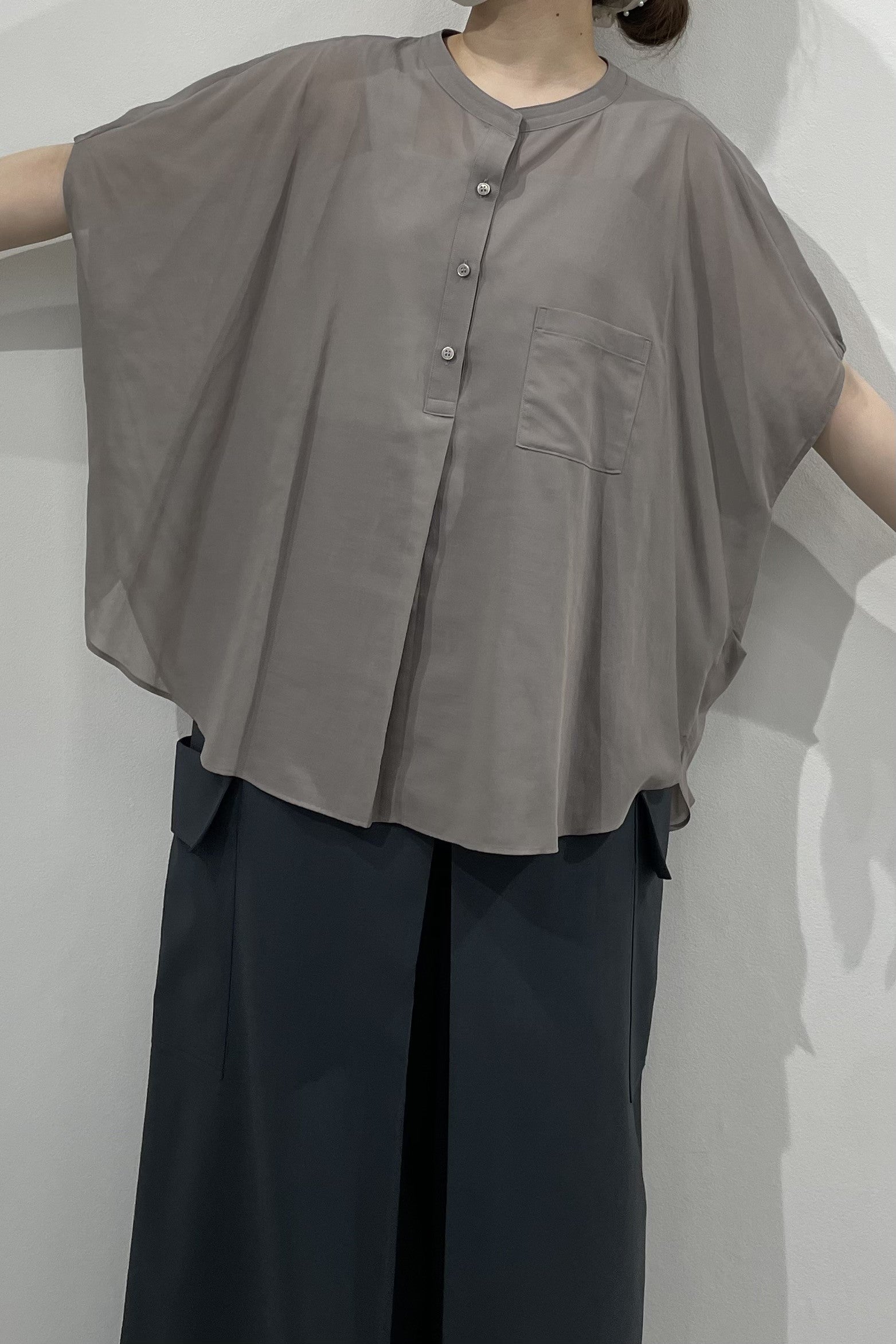 丸みのあるゆったりとしたサイズながら、生地の落ち感がきれいなポンチョシルエットのブラウス。ドライタッチでシアーな風合いの薄手シフォンを使用しており、シワになりづらく、生地の良さを感じて頂けるブラウスです。