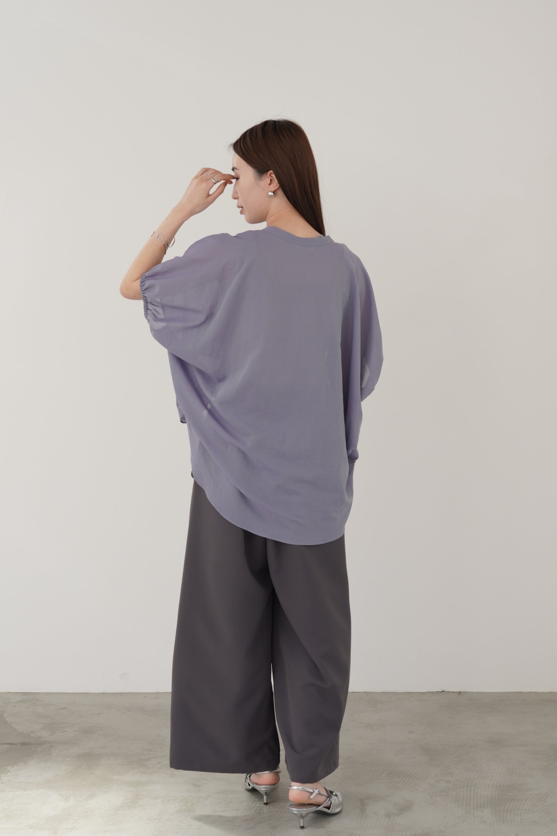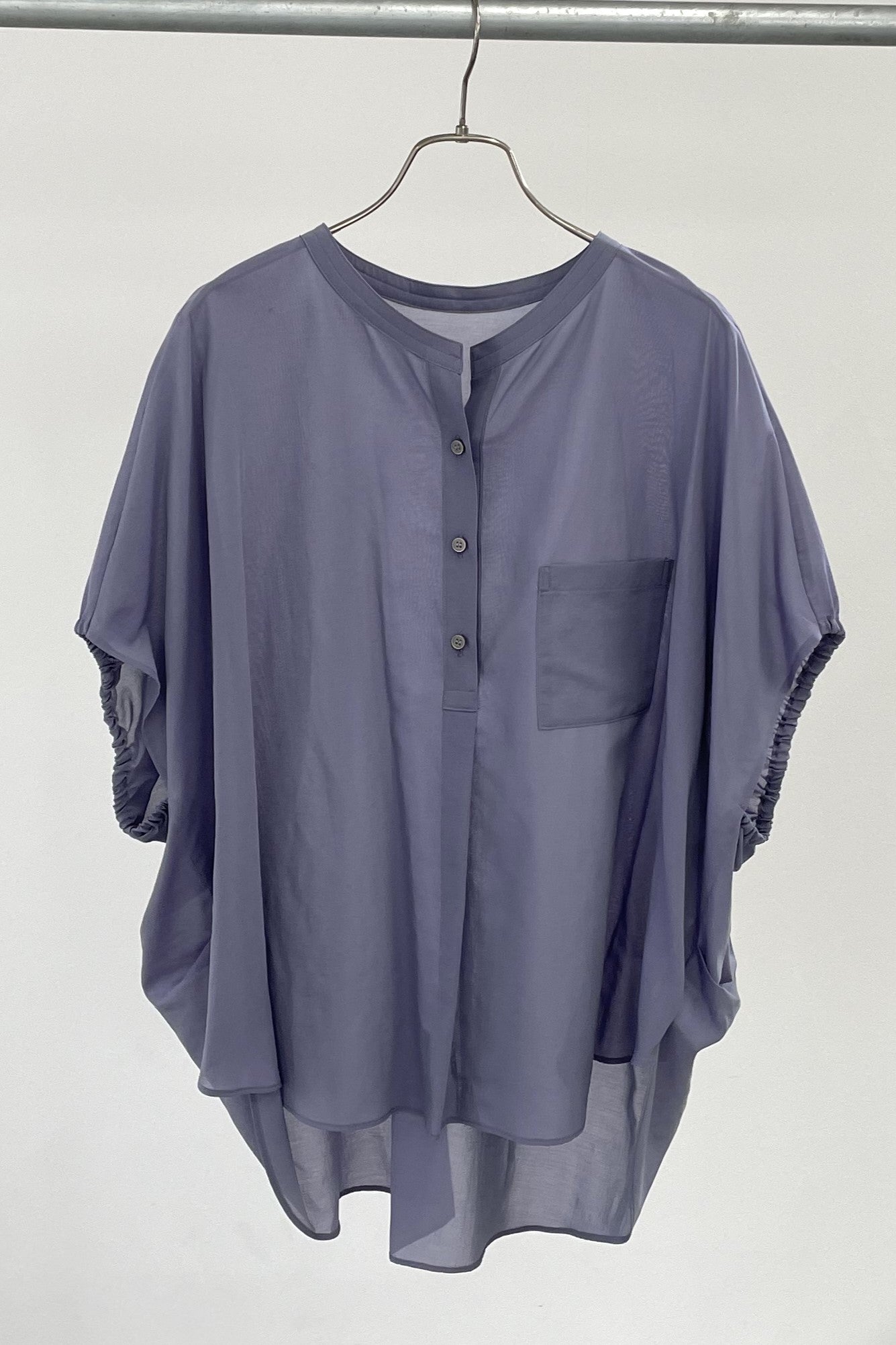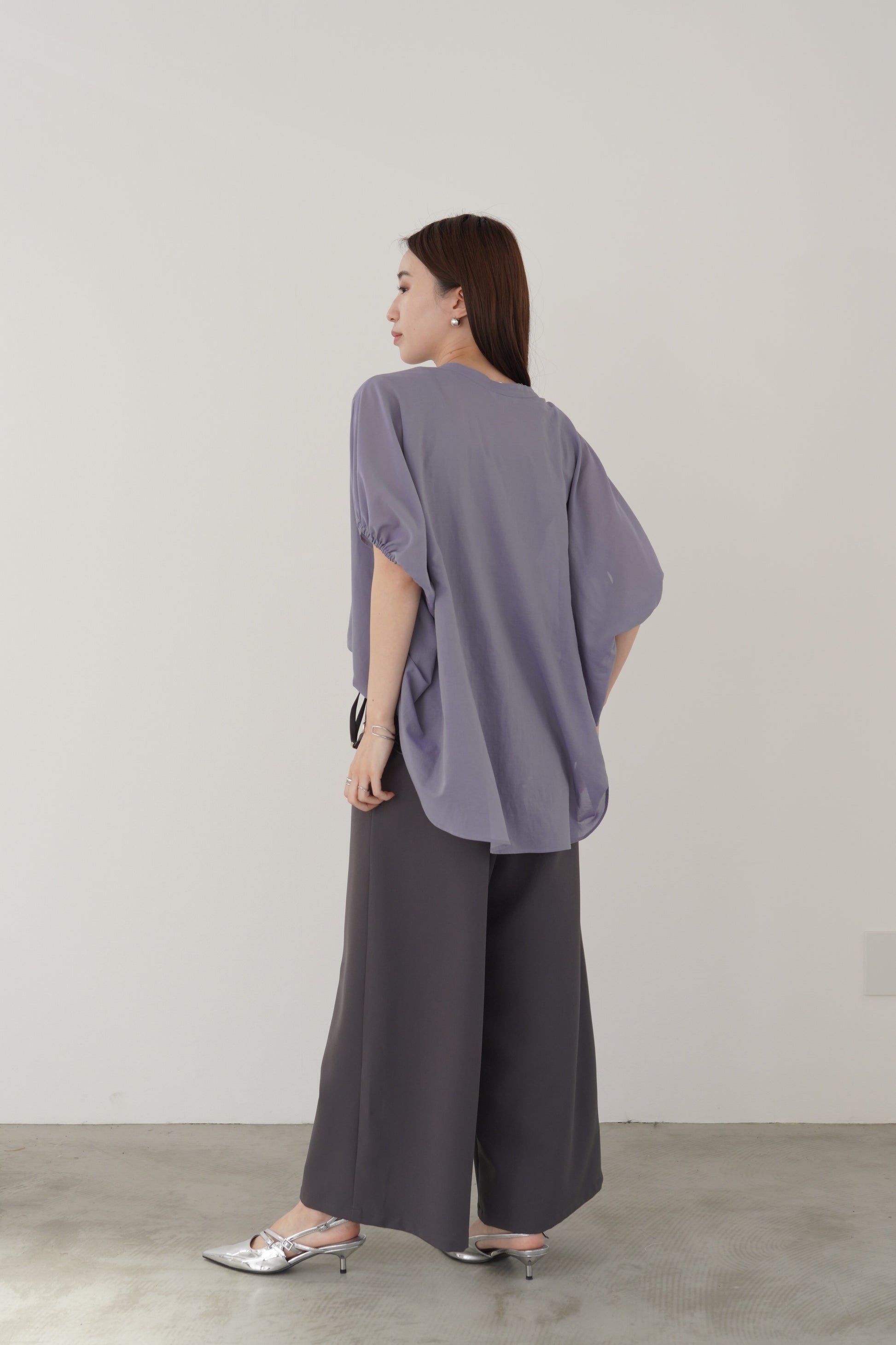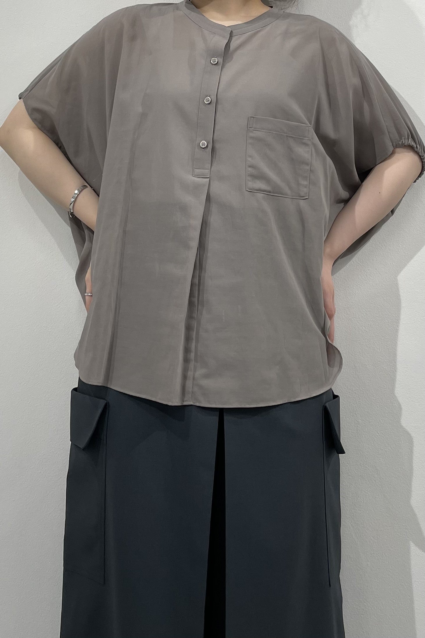 丸みのあるゆったりとしたサイズながら、生地の落ち感がきれいなポンチョシルエットのブラウス。ドライタッチでシアーな風合いの薄手シフォンを使用しており、シワになりづらく、生地の良さを感じて頂けるブラウスです。