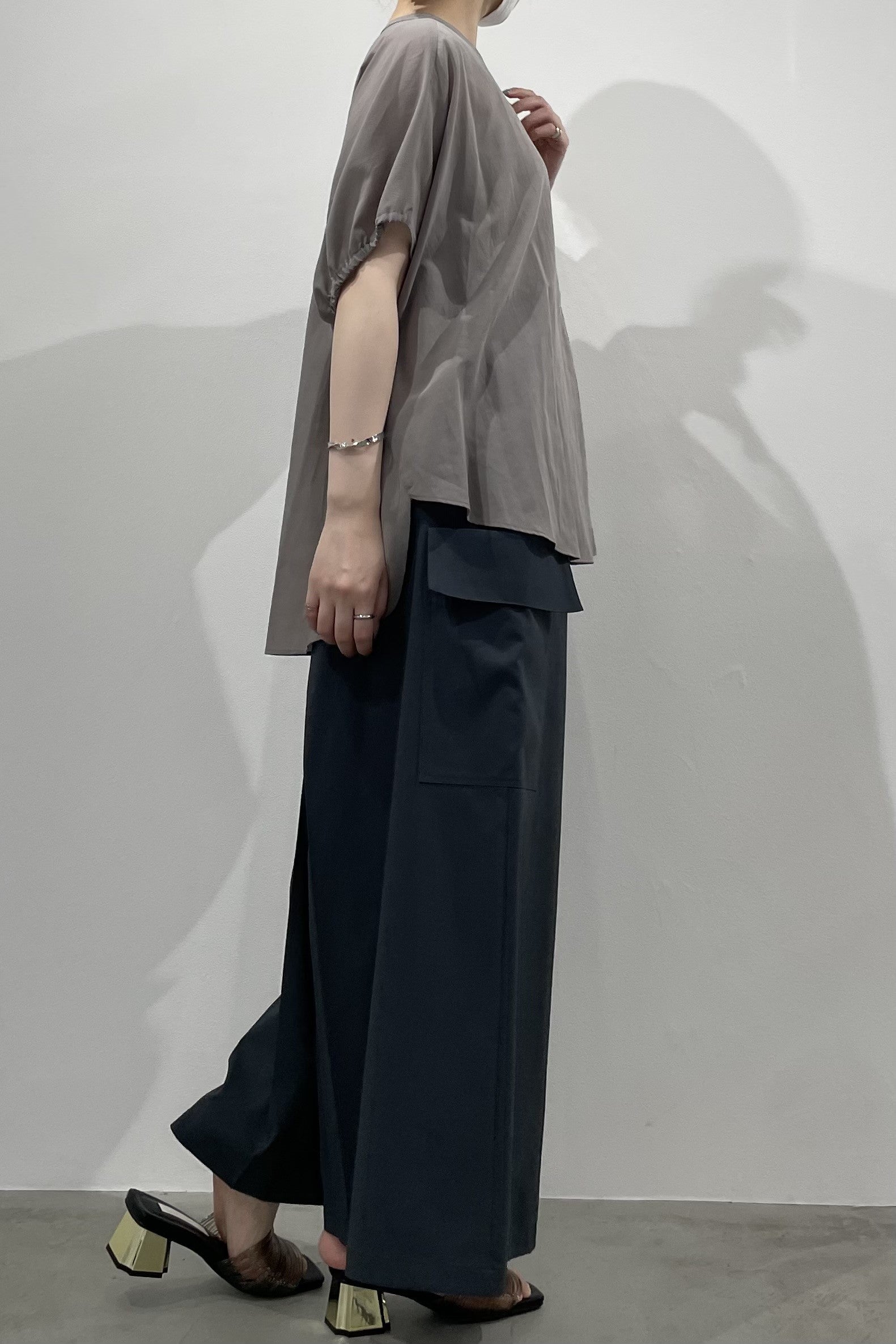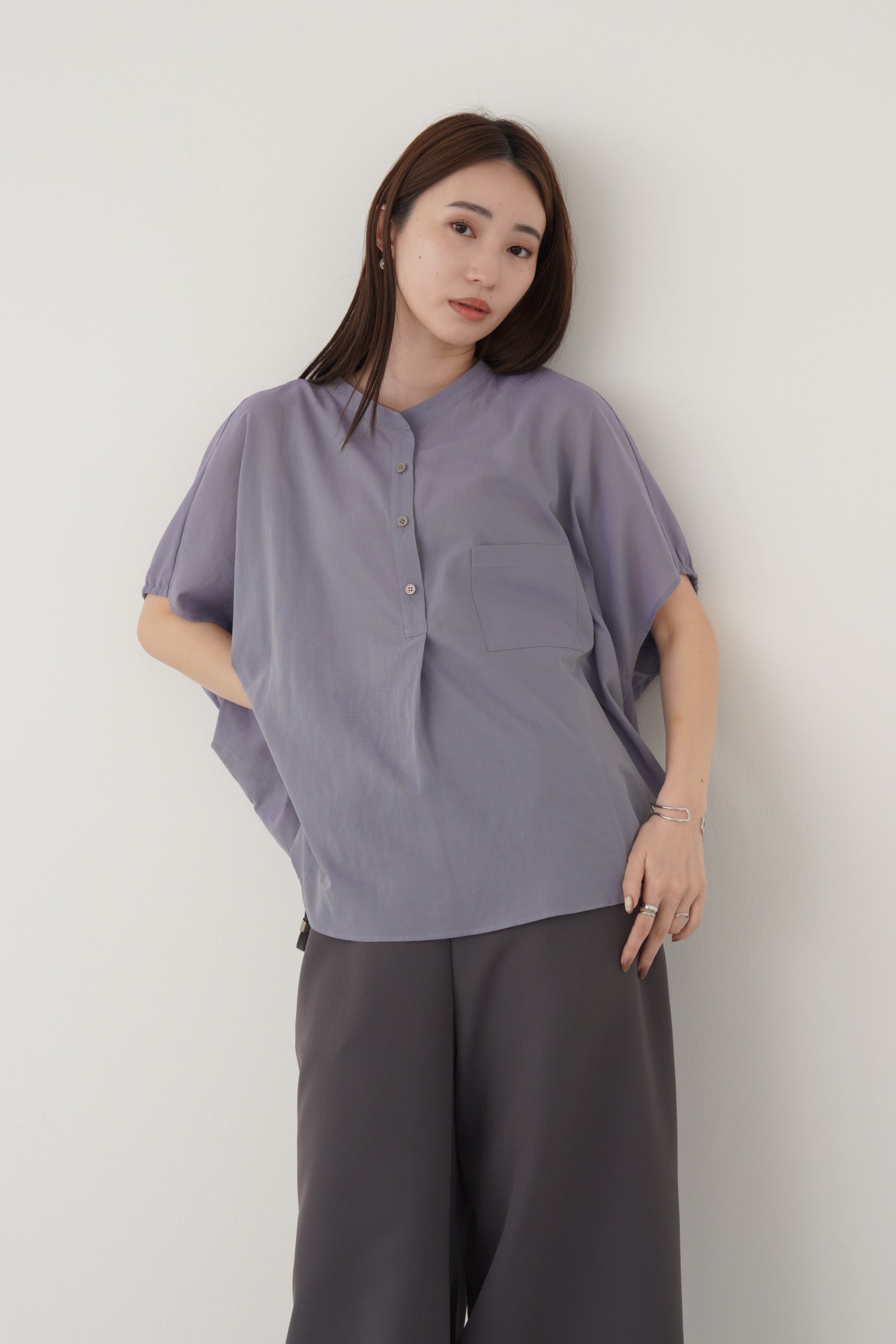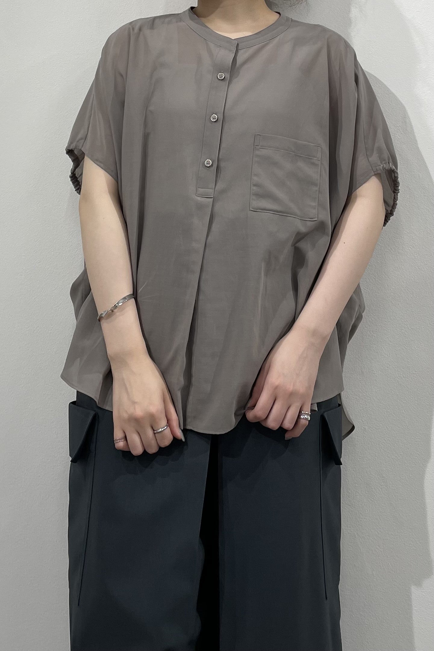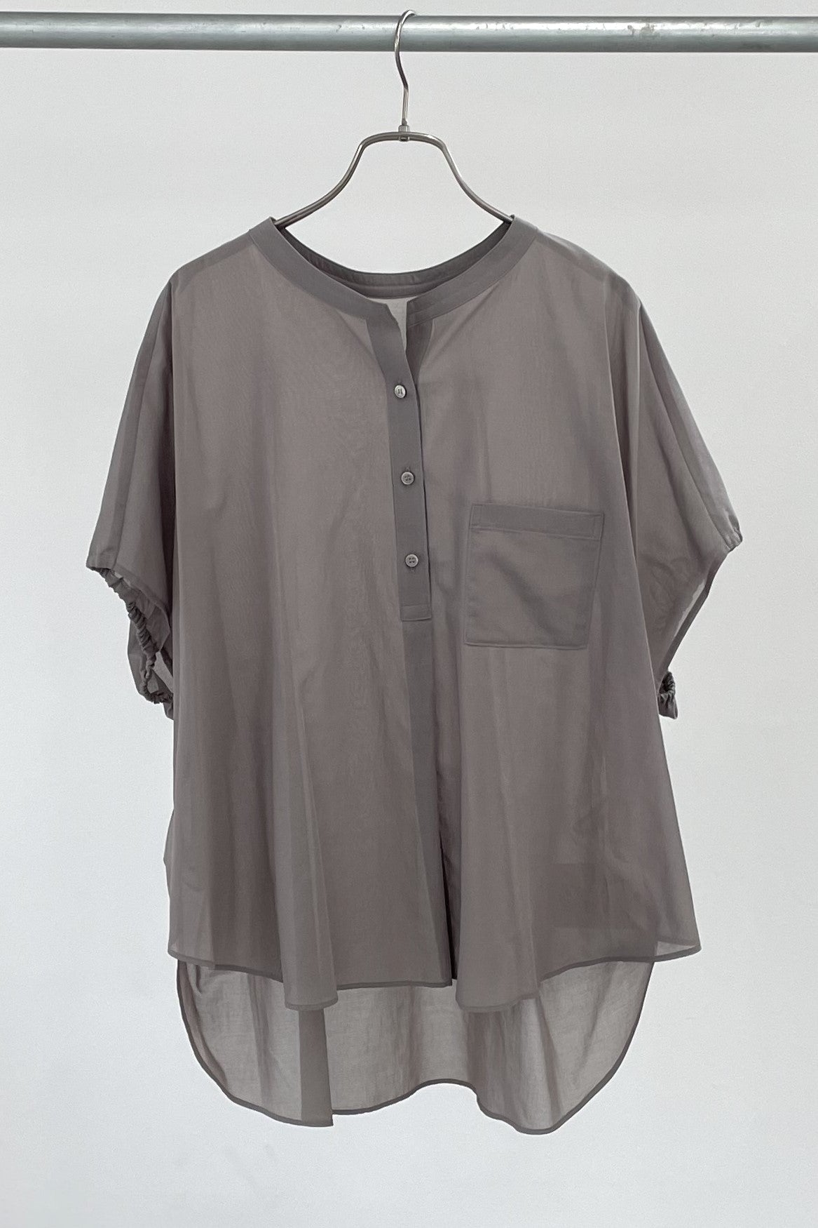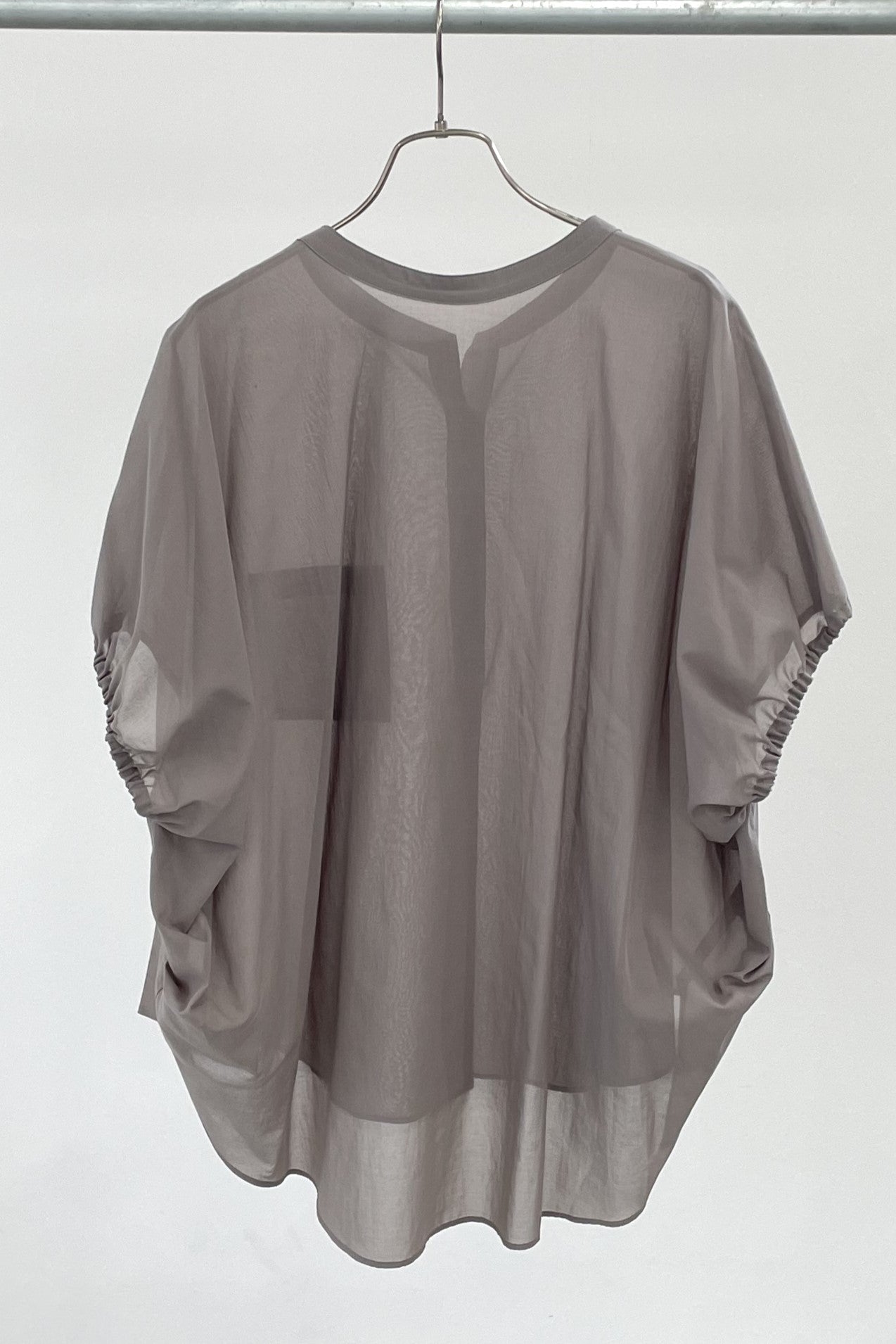丸みのあるゆったりとしたサイズながら、生地の落ち感がきれいなポンチョシルエットのブラウス。ドライタッチでシアーな風合いの薄手シフォンを使用しており、シワになりづらく、生地の良さを感じて頂けるブラウスです。