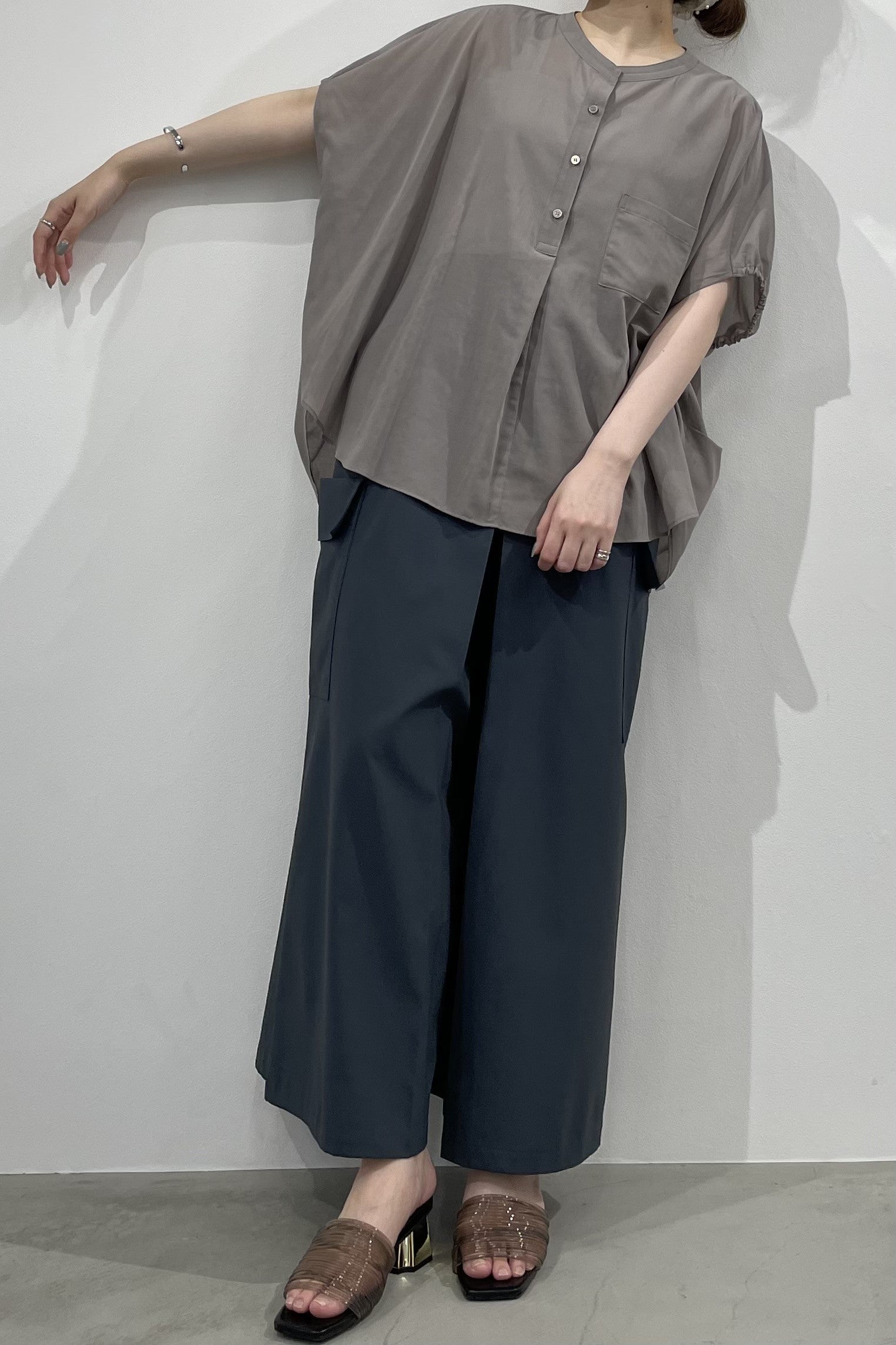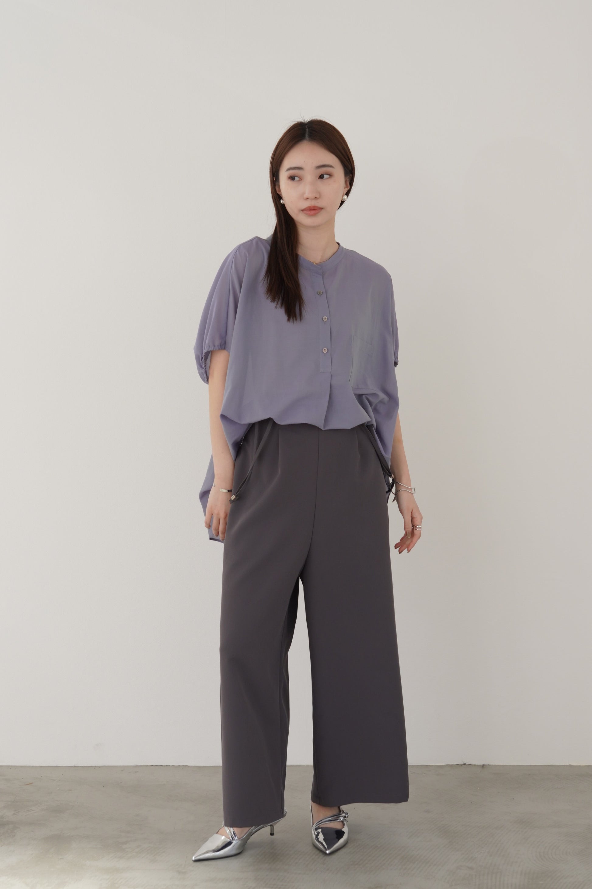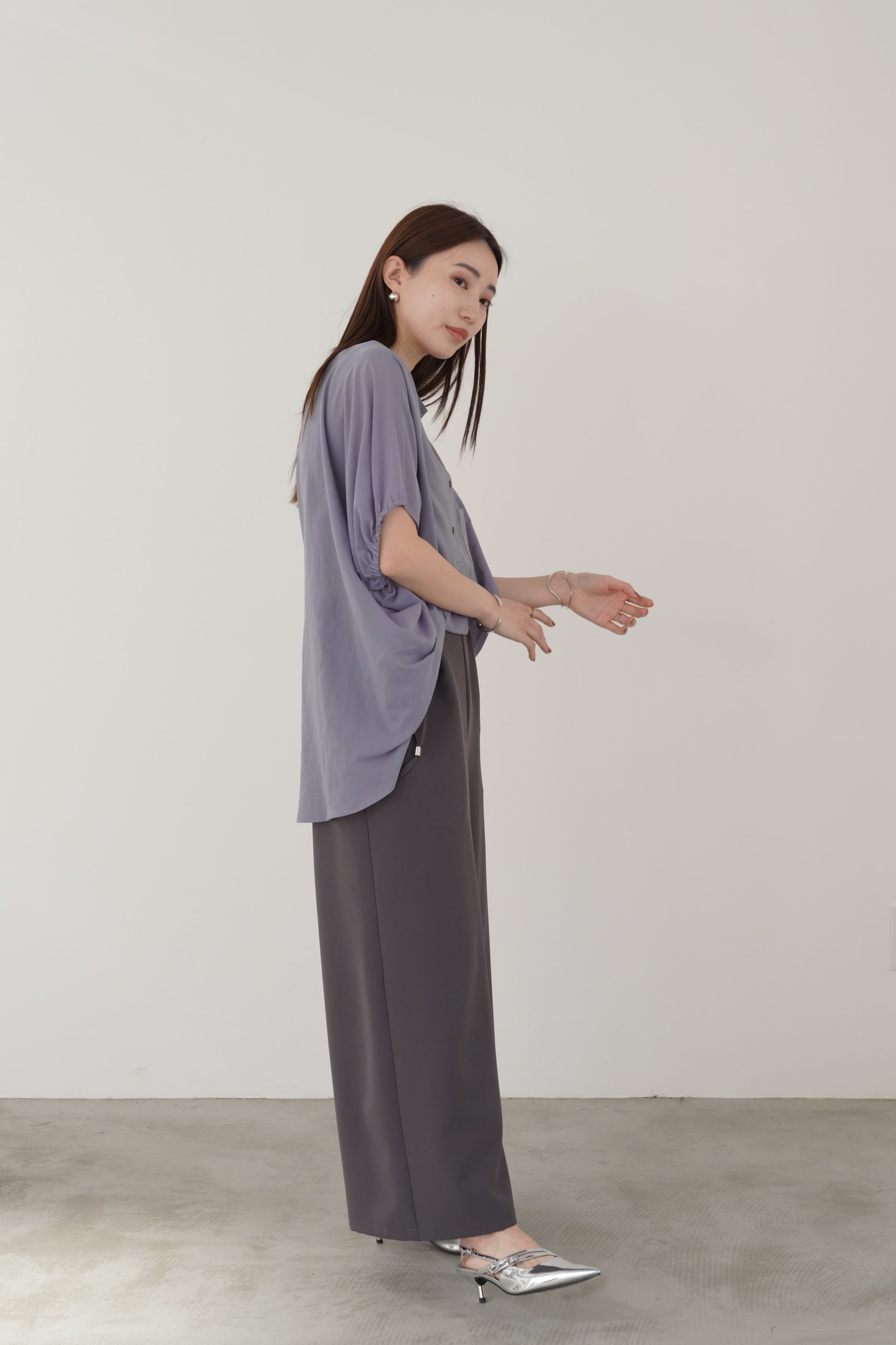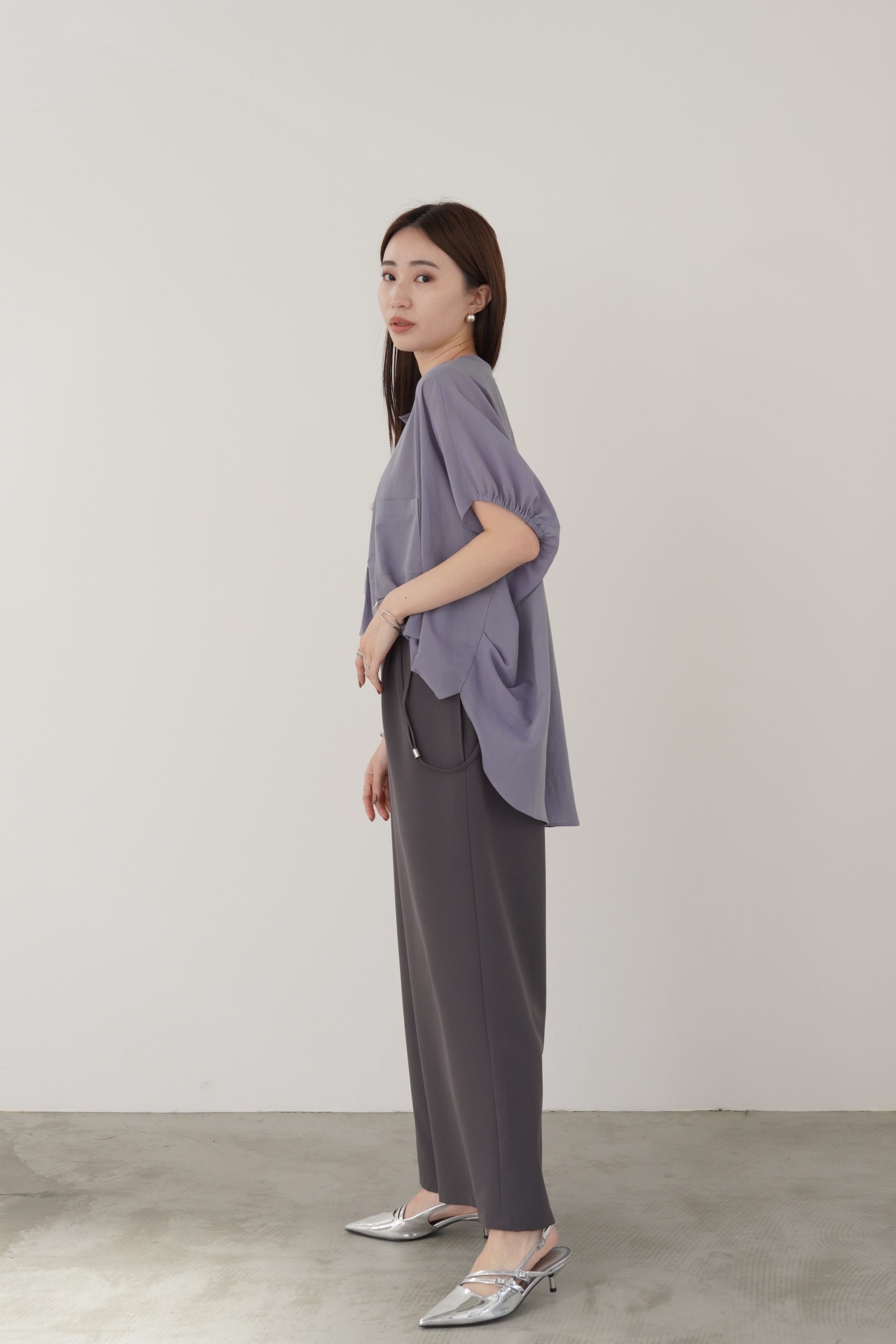 丸みのあるゆったりとしたサイズながら、生地の落ち感がきれいなポンチョシルエットのブラウス。ドライタッチでシアーな風合いの薄手シフォンを使用しており、シワになりづらく、生地の良さを感じて頂けるブラウスです。