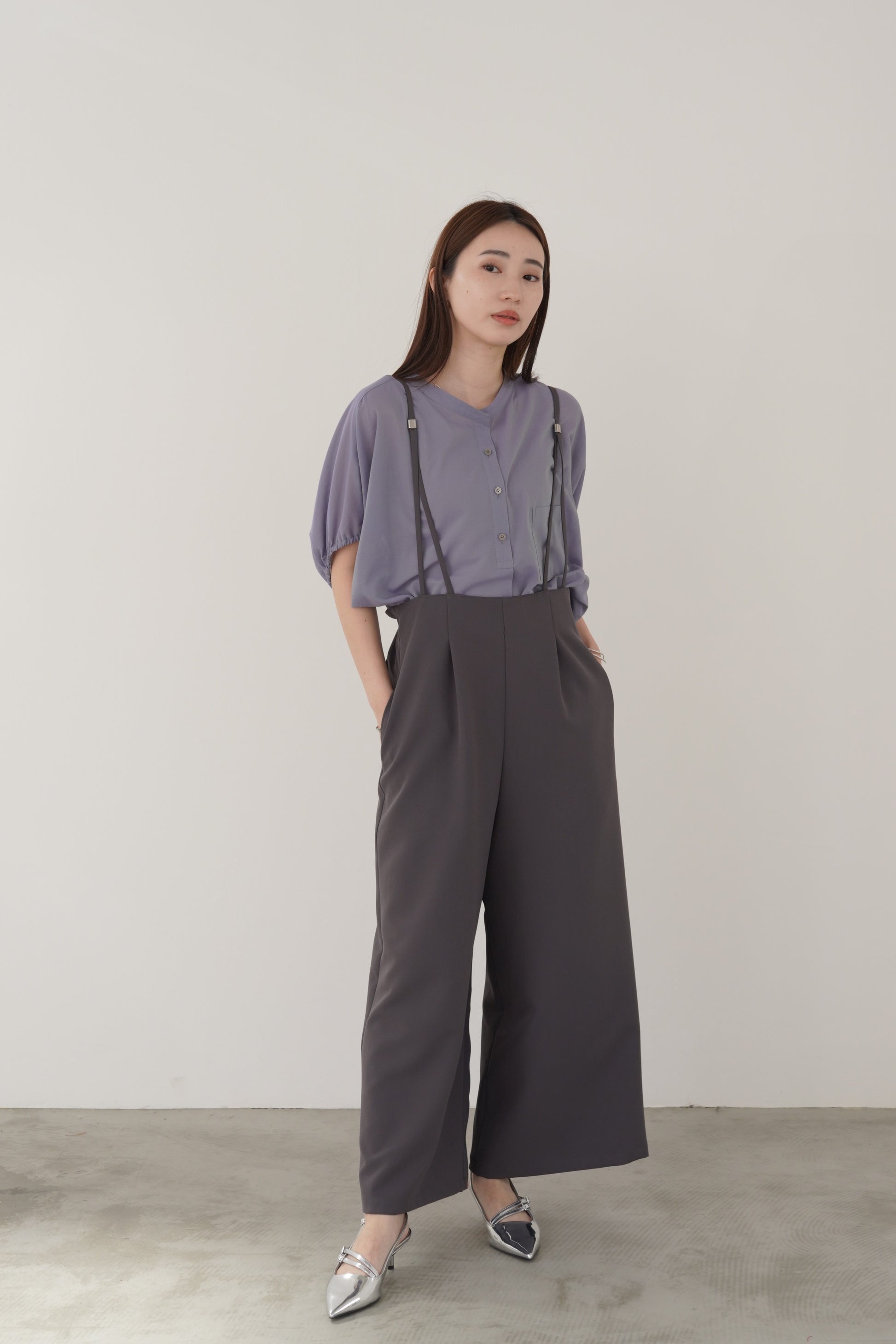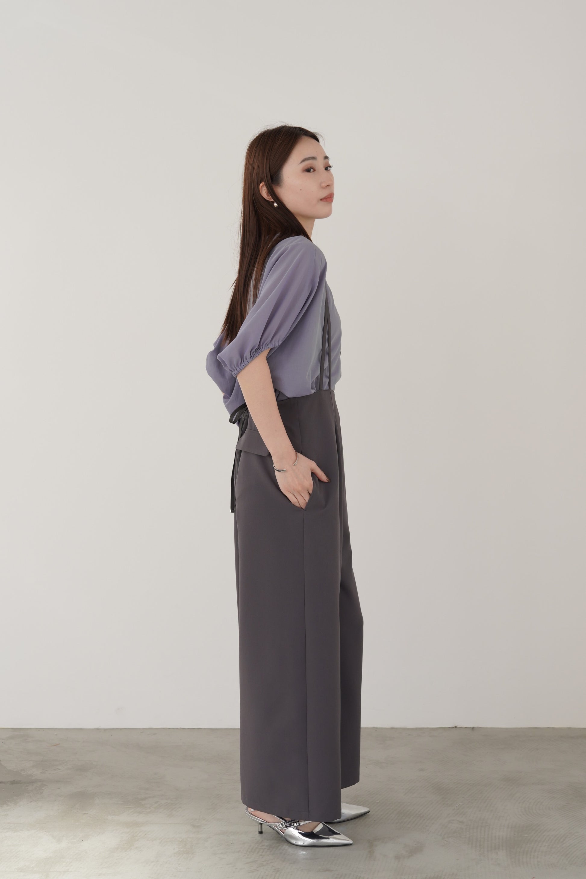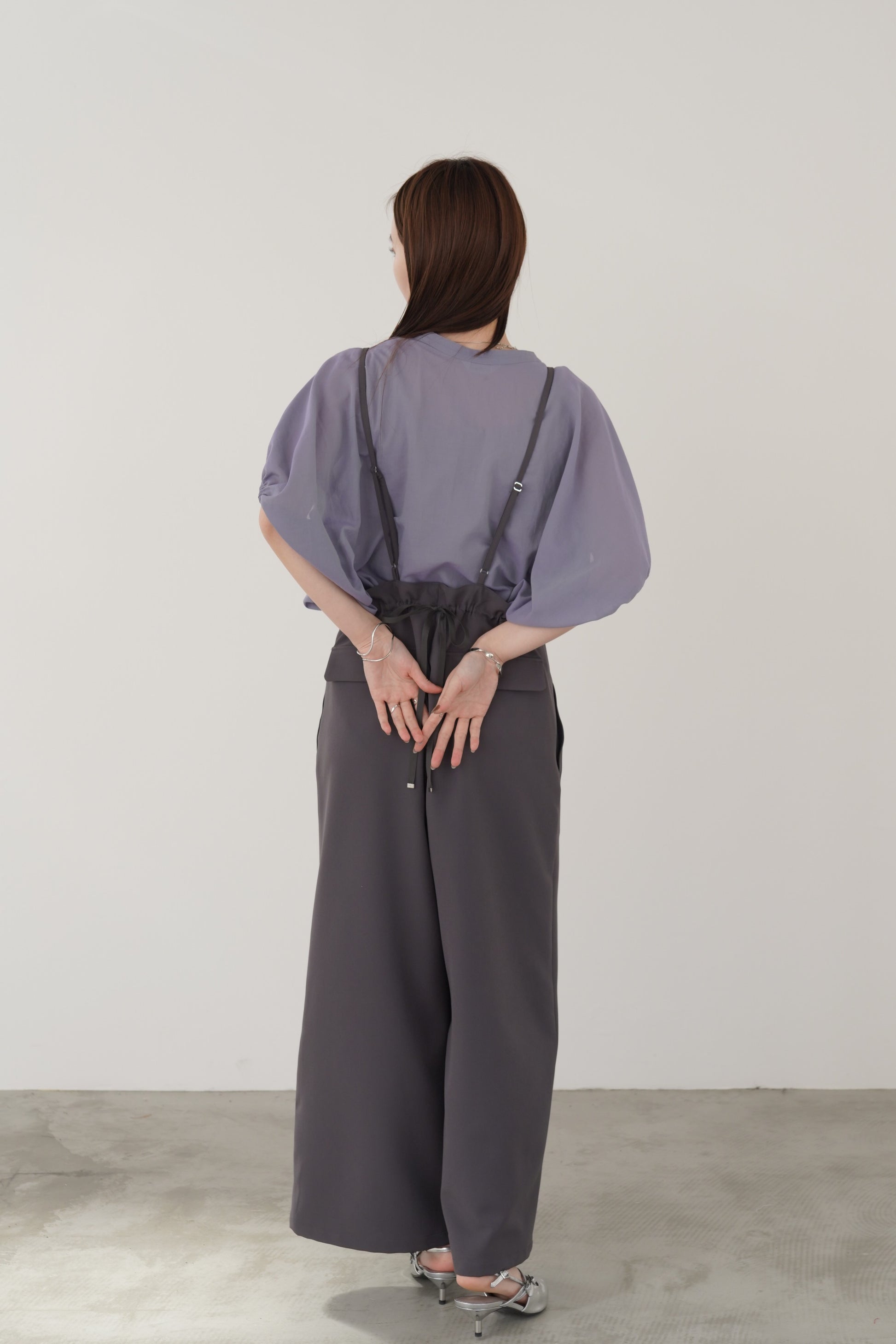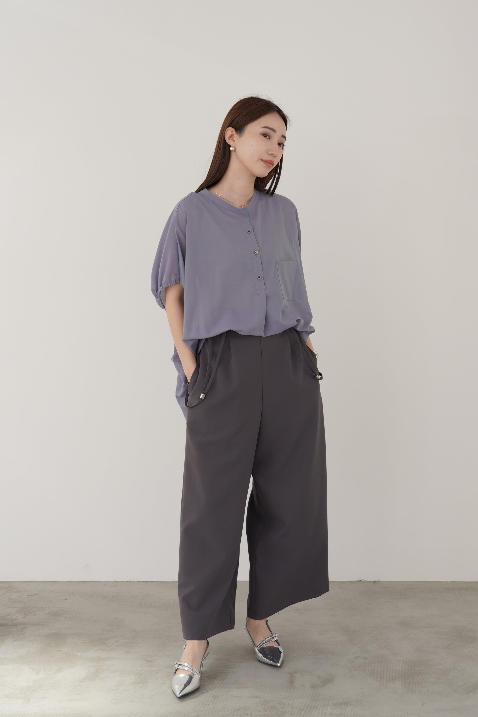 丸みのあるゆったりとしたサイズながら、生地の落ち感がきれいなポンチョシルエットのブラウス。ドライタッチでシアーな風合いの薄手シフォンを使用しており、シワになりづらく、生地の良さを感じて頂けるブラウスです。