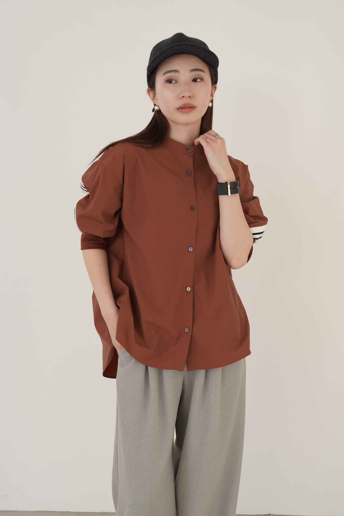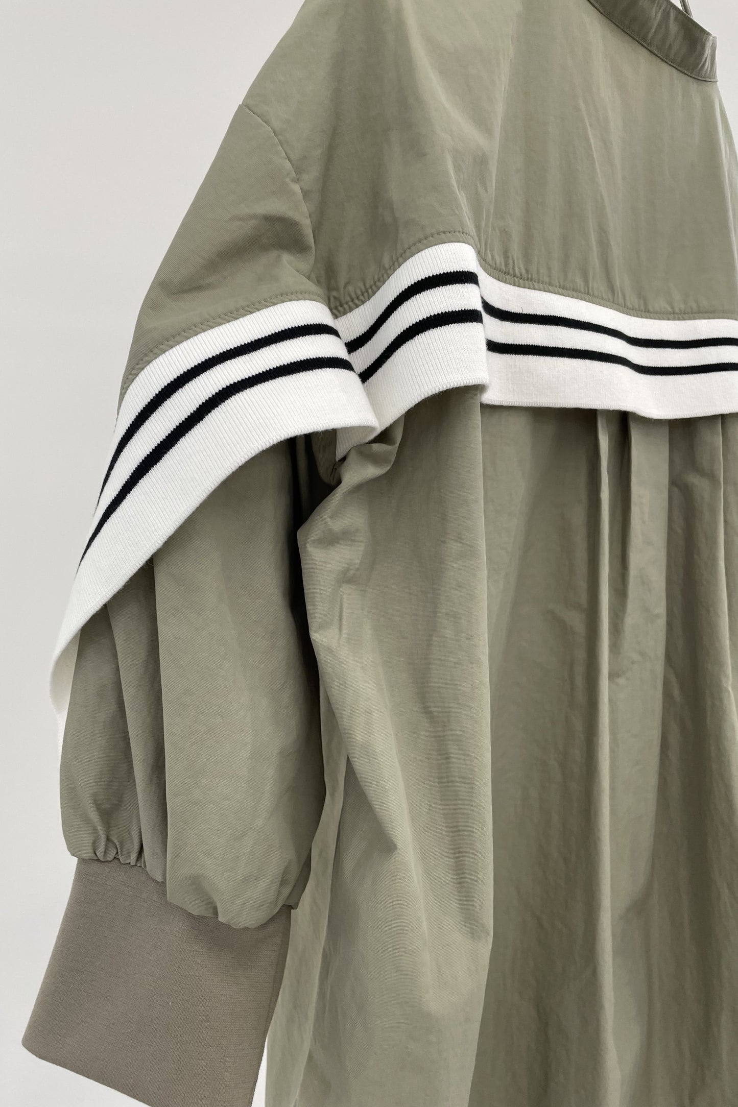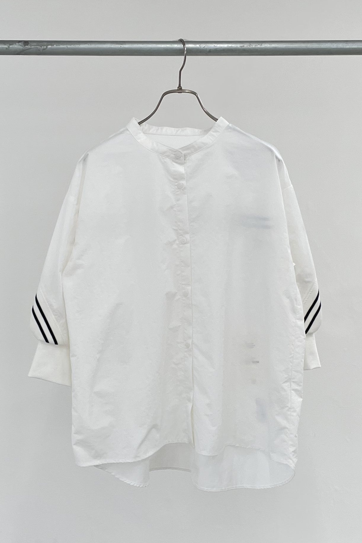 キャッチーなライン入りのニットリブが目を惹く1着。ライトコートの様なハリのあるナイロン/コットンをノーカラーシャツに落とし込みました。袖をたくし上げやすくする為、袖口をジャージ素材で切り替えています。