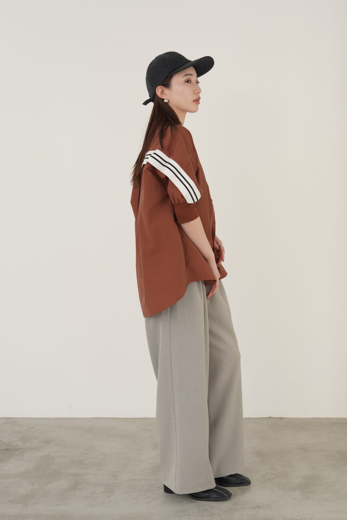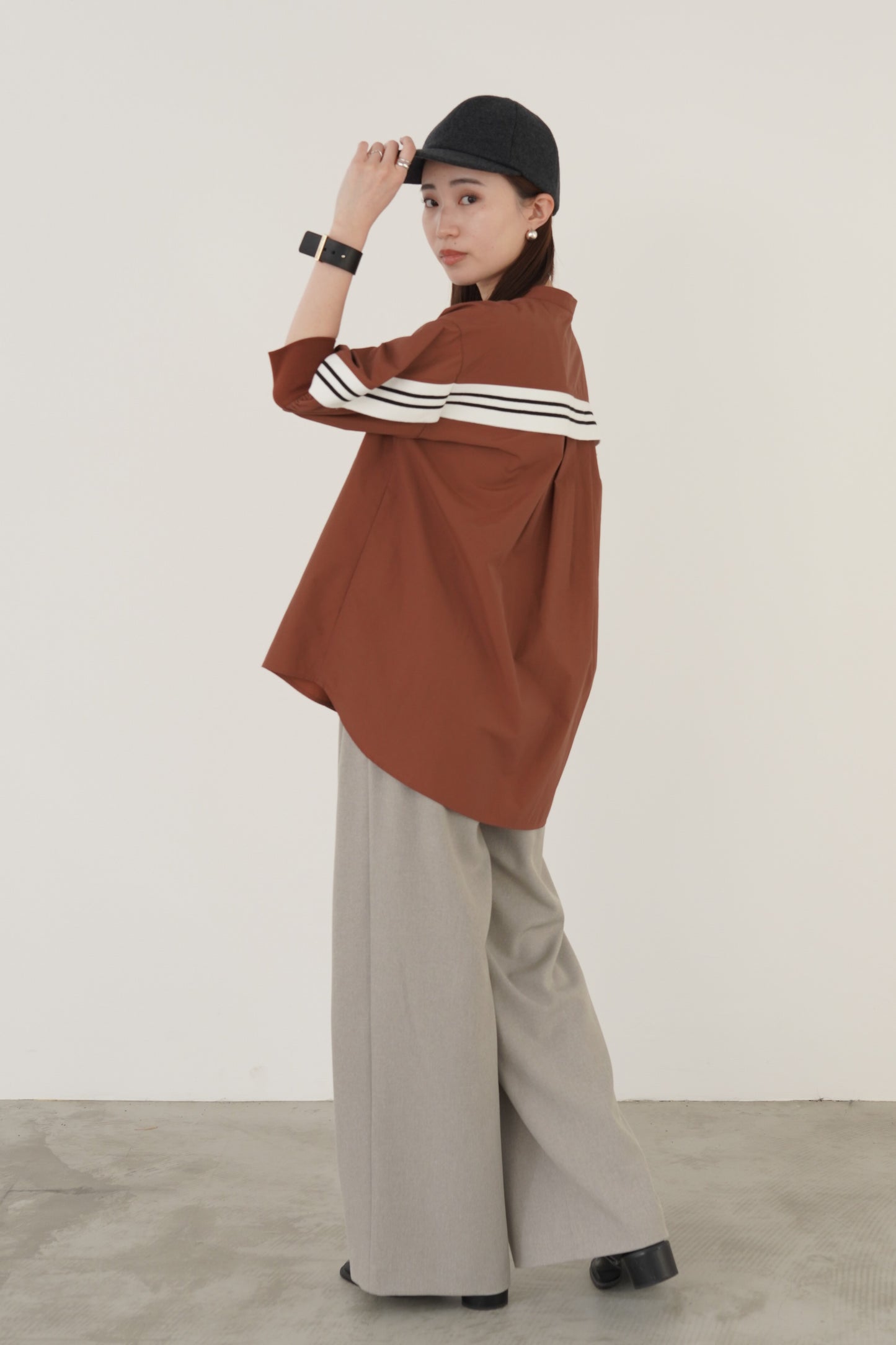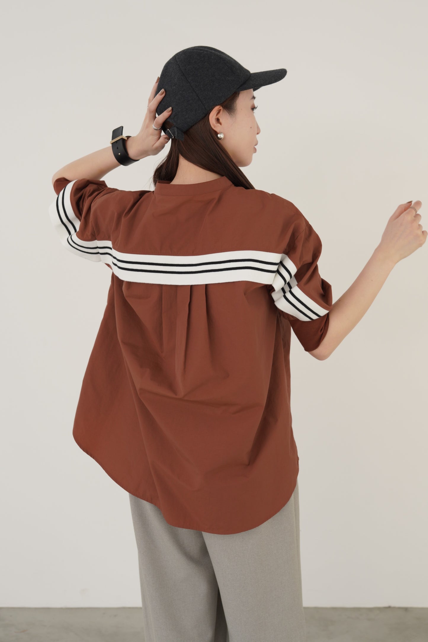 キャッチーなライン入りのニットリブが目を惹く1着。ライトコートの様なハリのあるナイロン/コットンをノーカラーシャツに落とし込みました。袖をたくし上げやすくする為、袖口をジャージ素材で切り替えています。