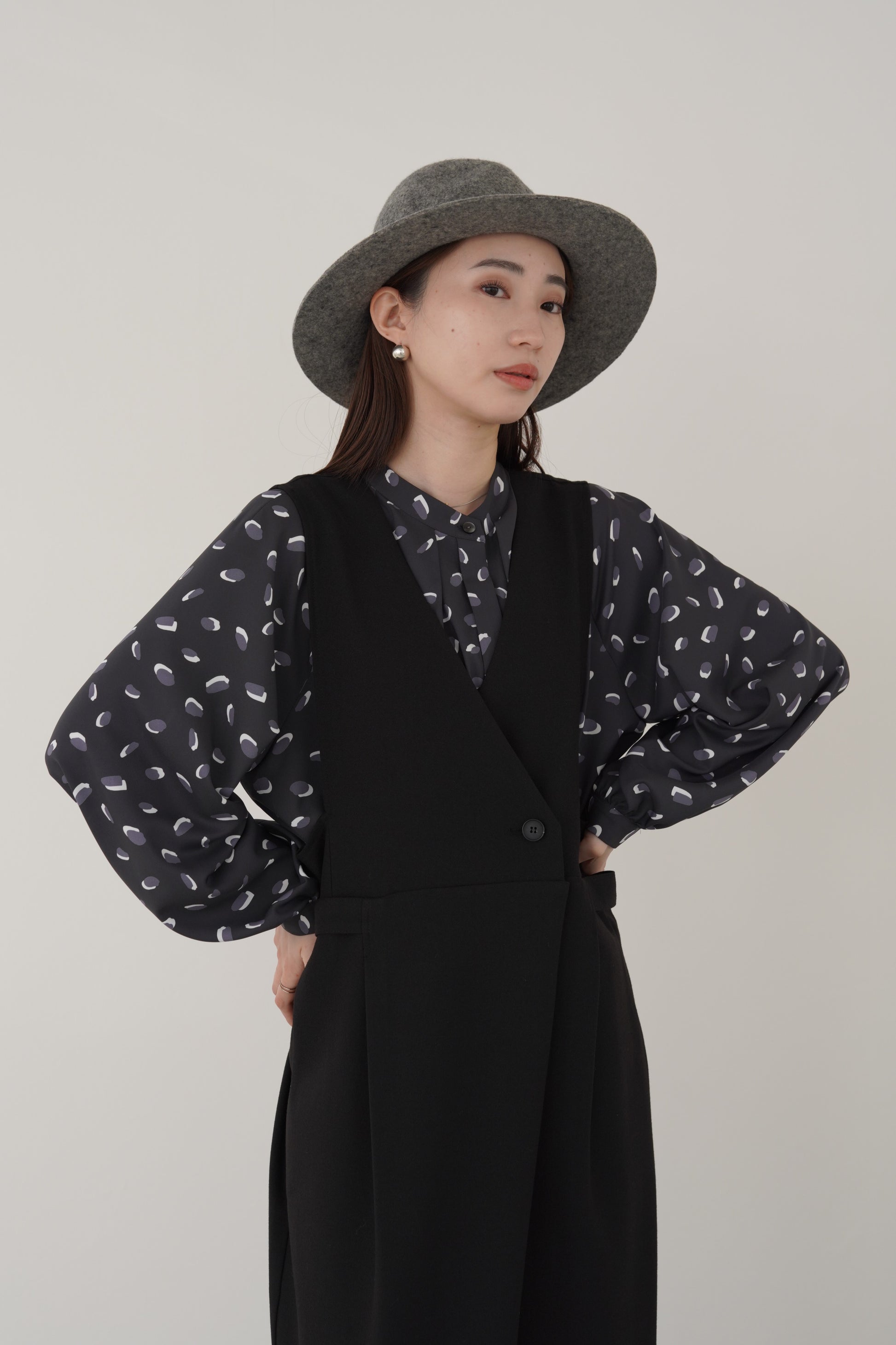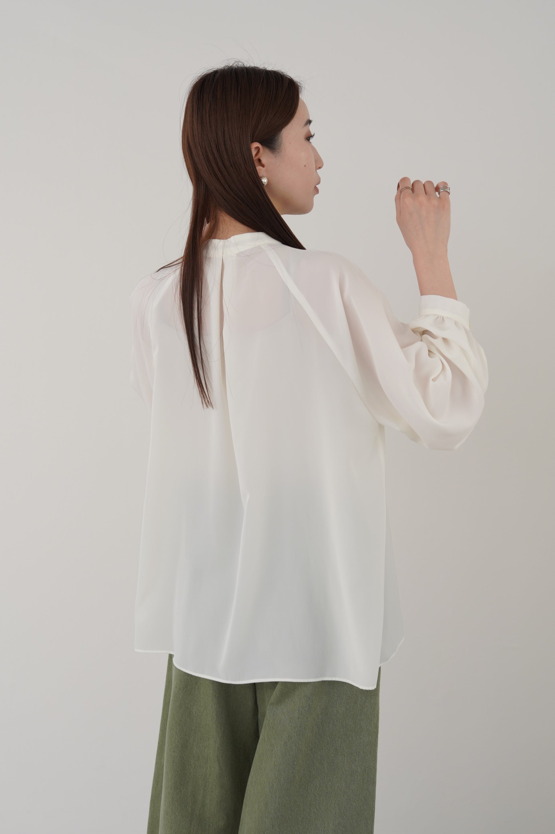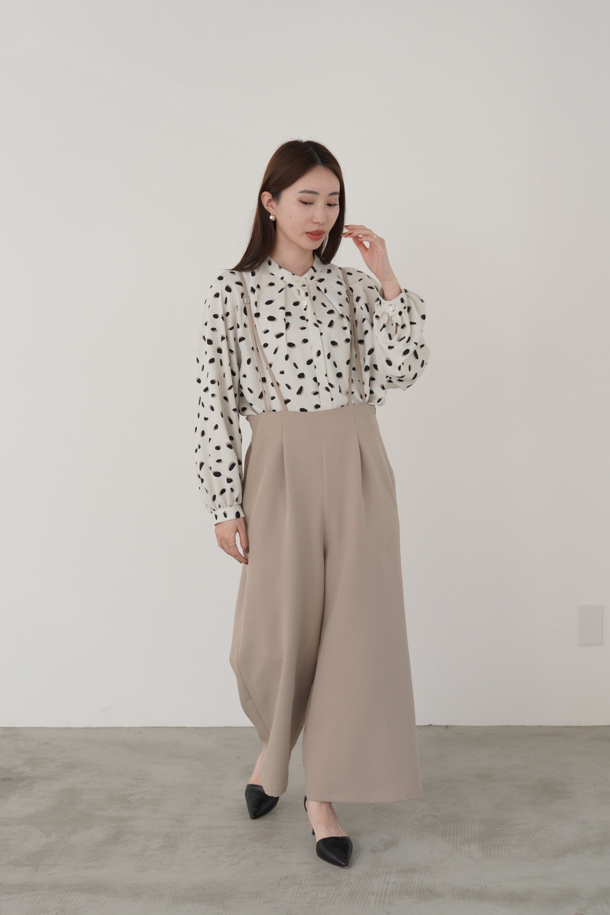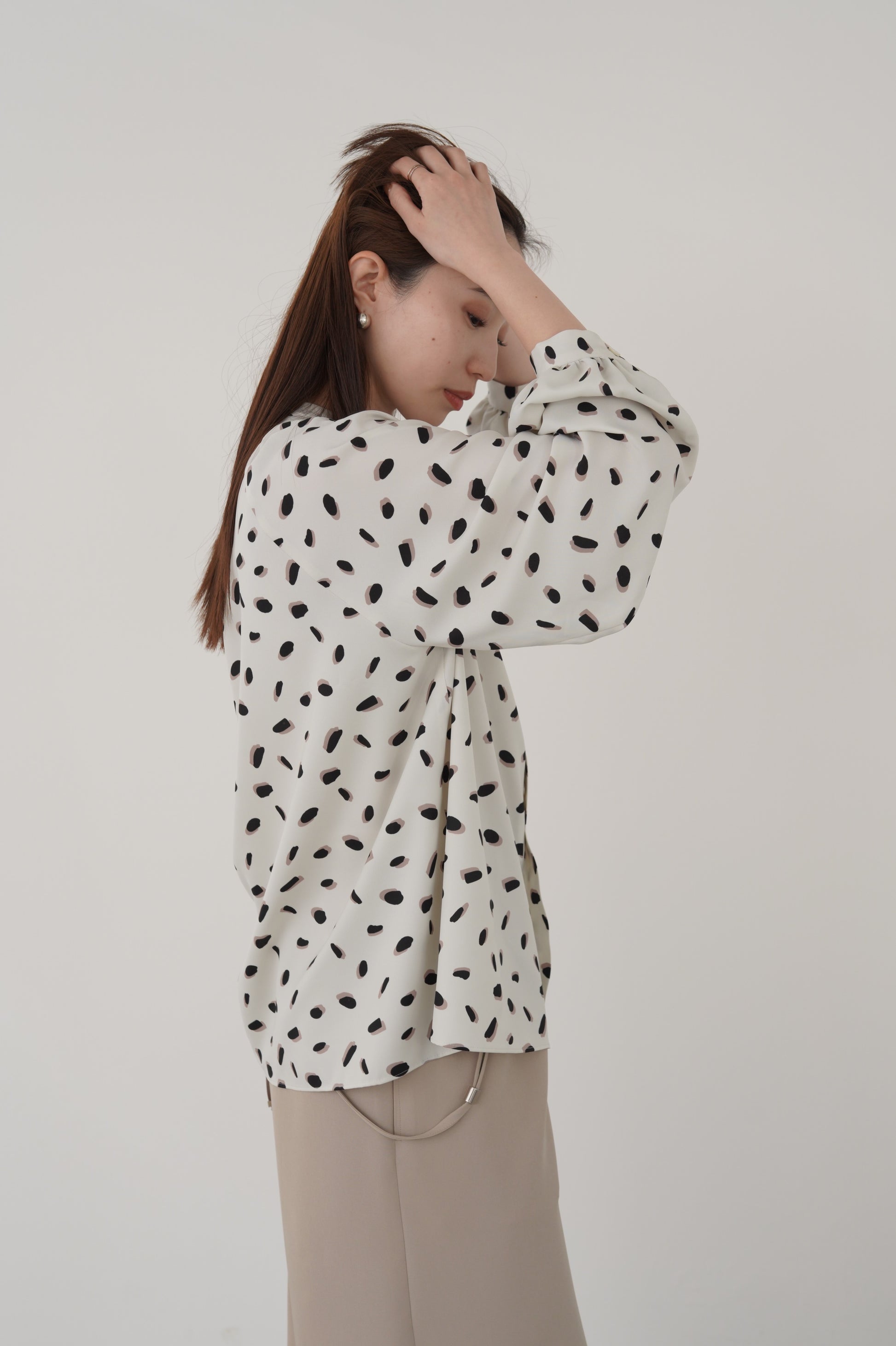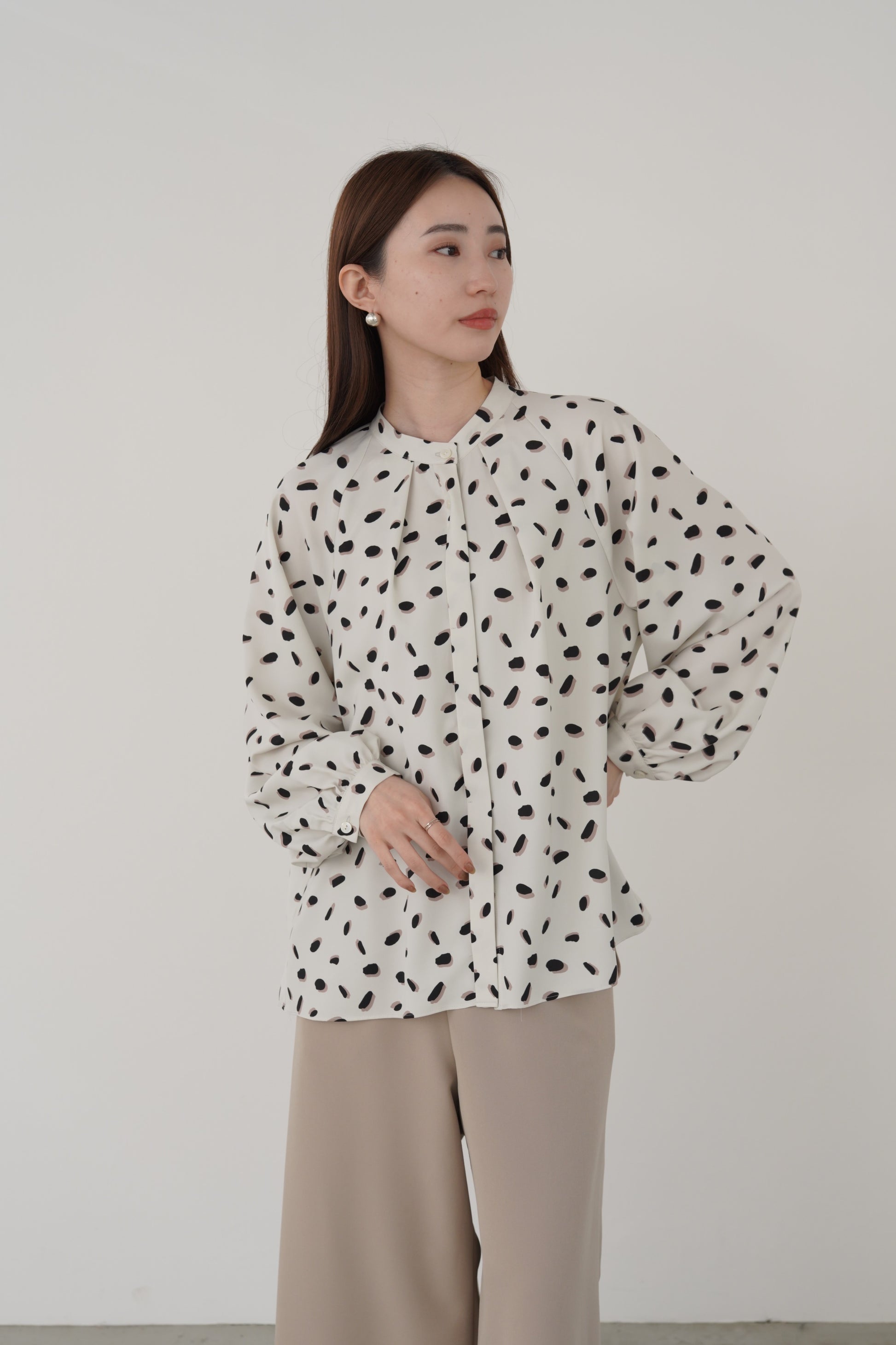 比翼デザインできちんと感のある、タックデザインのブラウス。優しい風合いの柔らかいデシン素材の無地と、アート風なドットプリントの展開で、スイッチシーズンに活躍する1着。