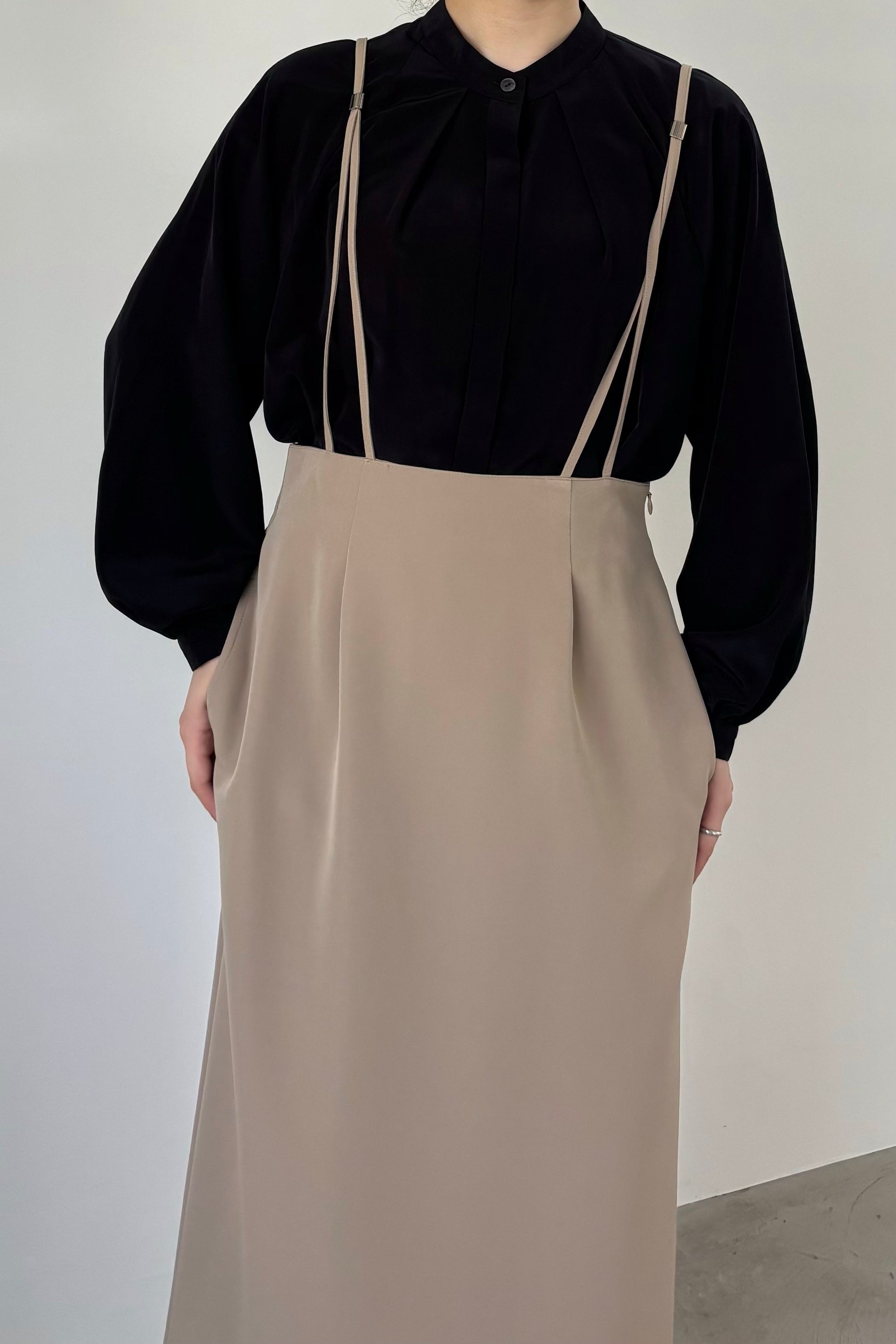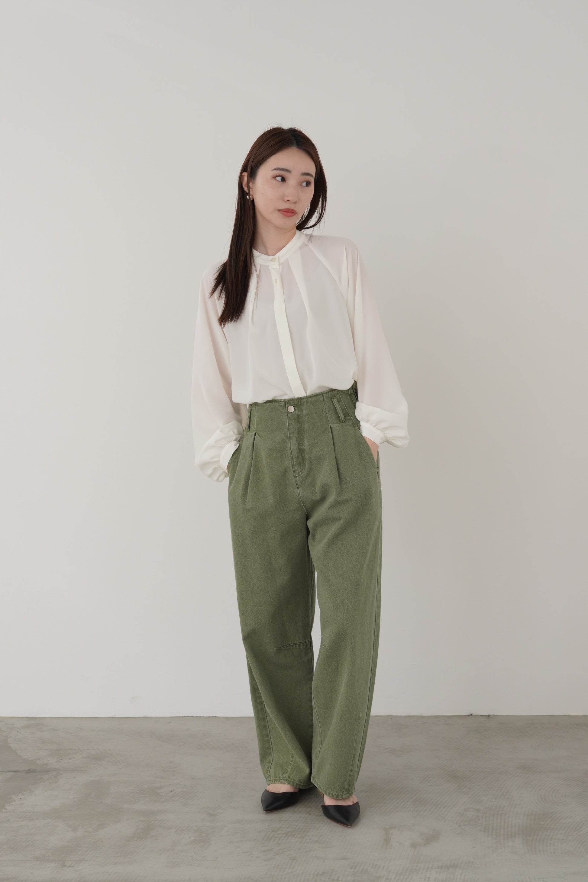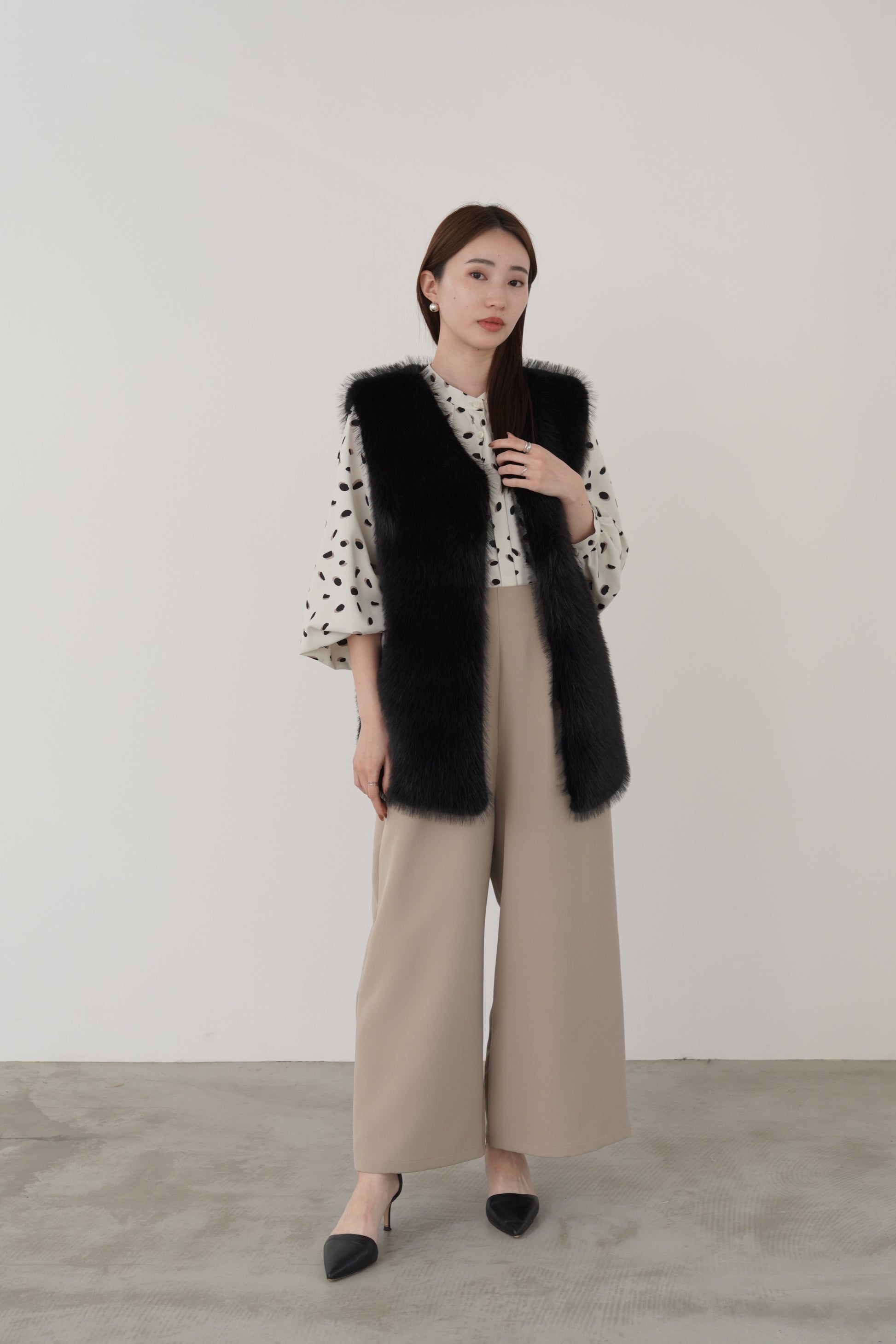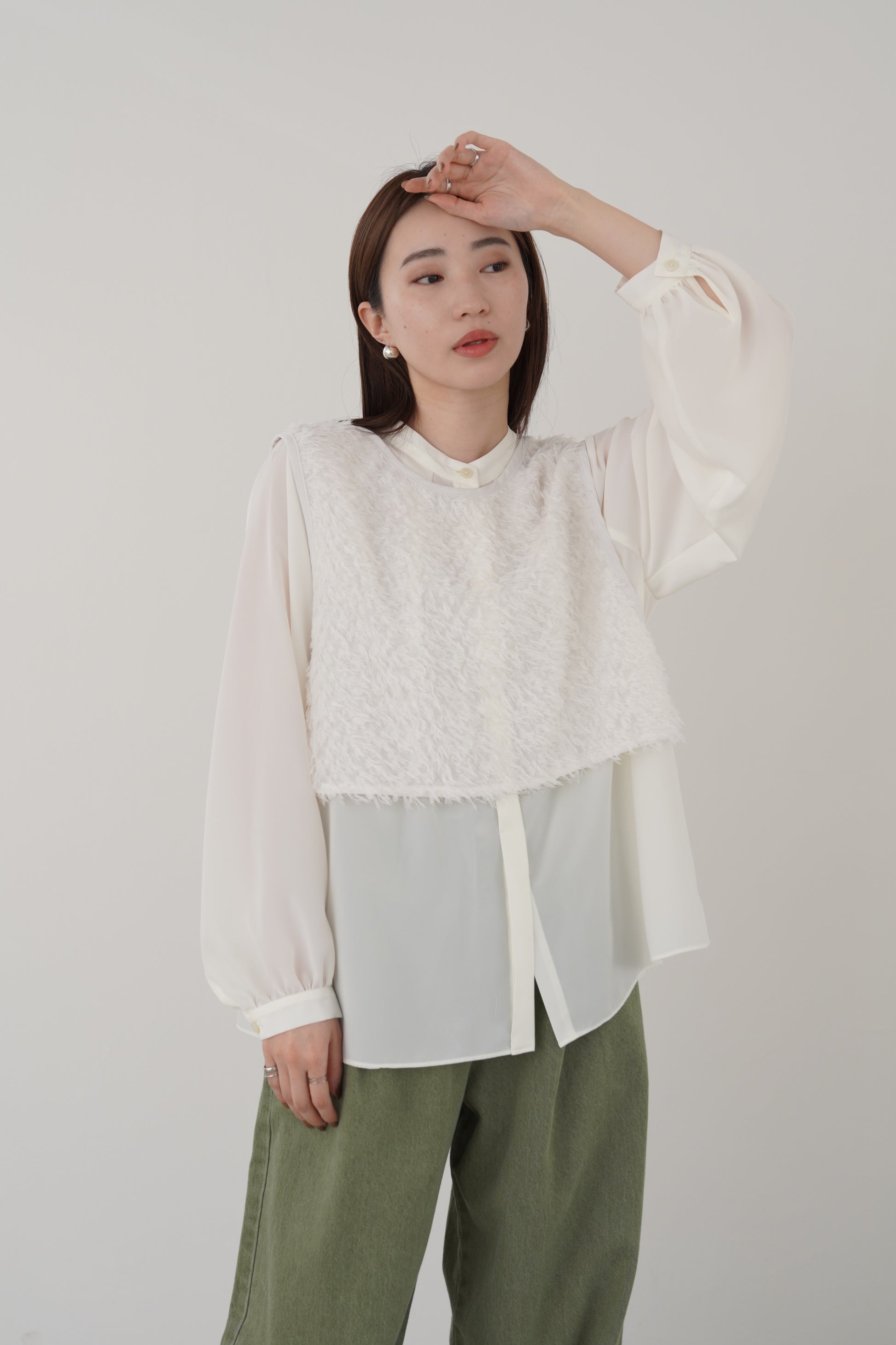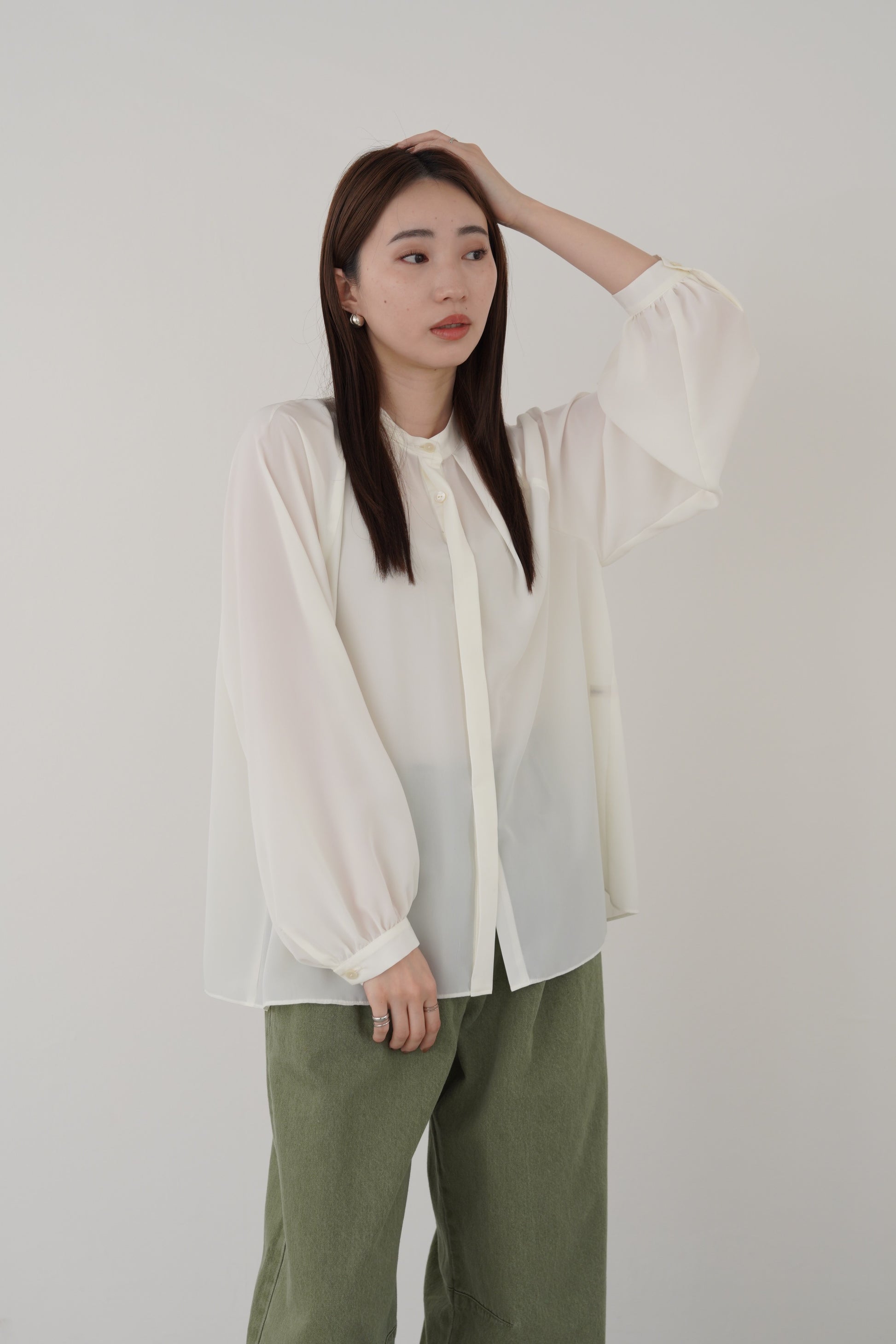 比翼デザインできちんと感のある、タックデザインのブラウス。優しい風合いの柔らかいデシン素材の無地と、アート風なドットプリントの展開で、スイッチシーズンに活躍する1着。