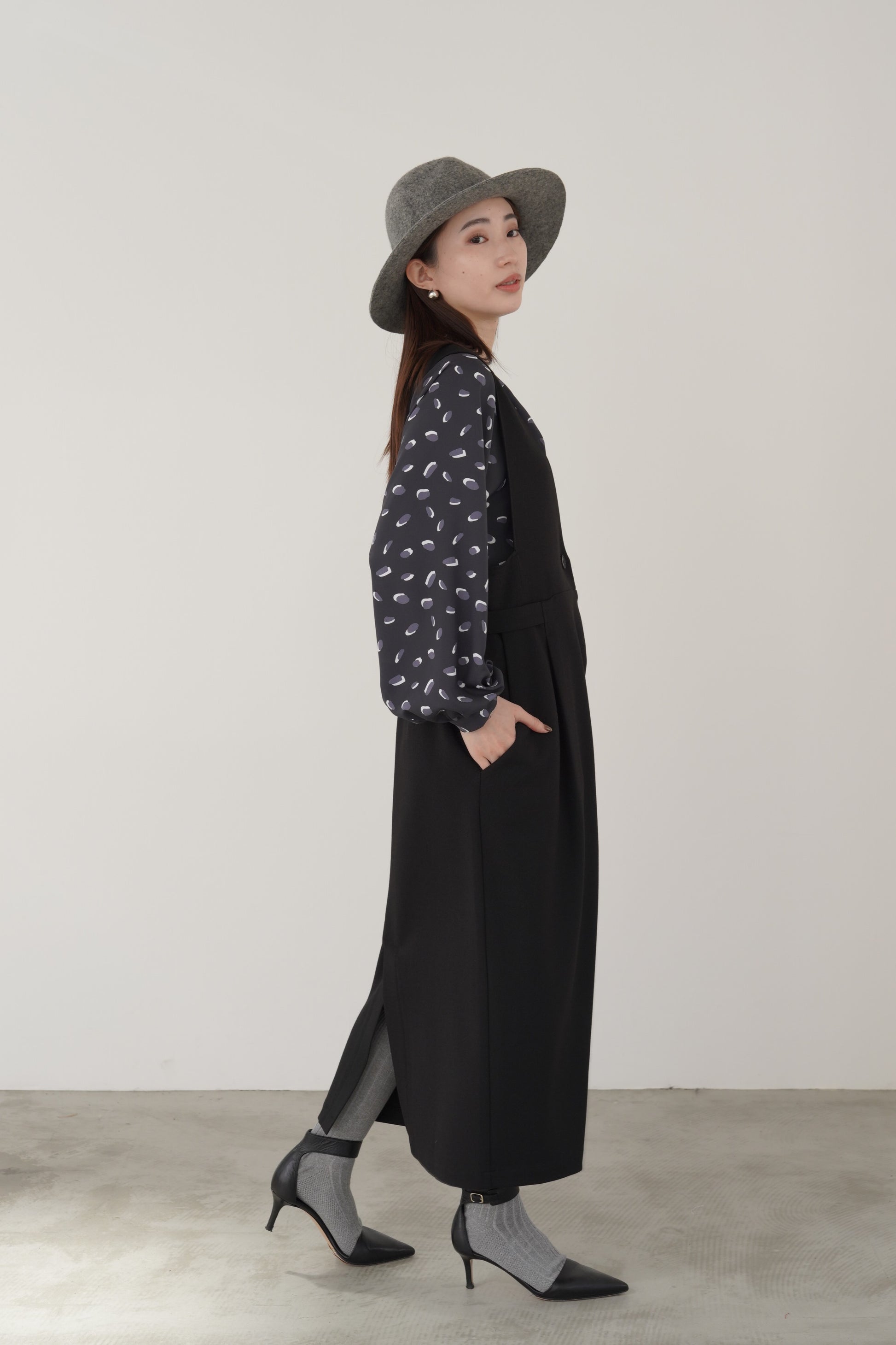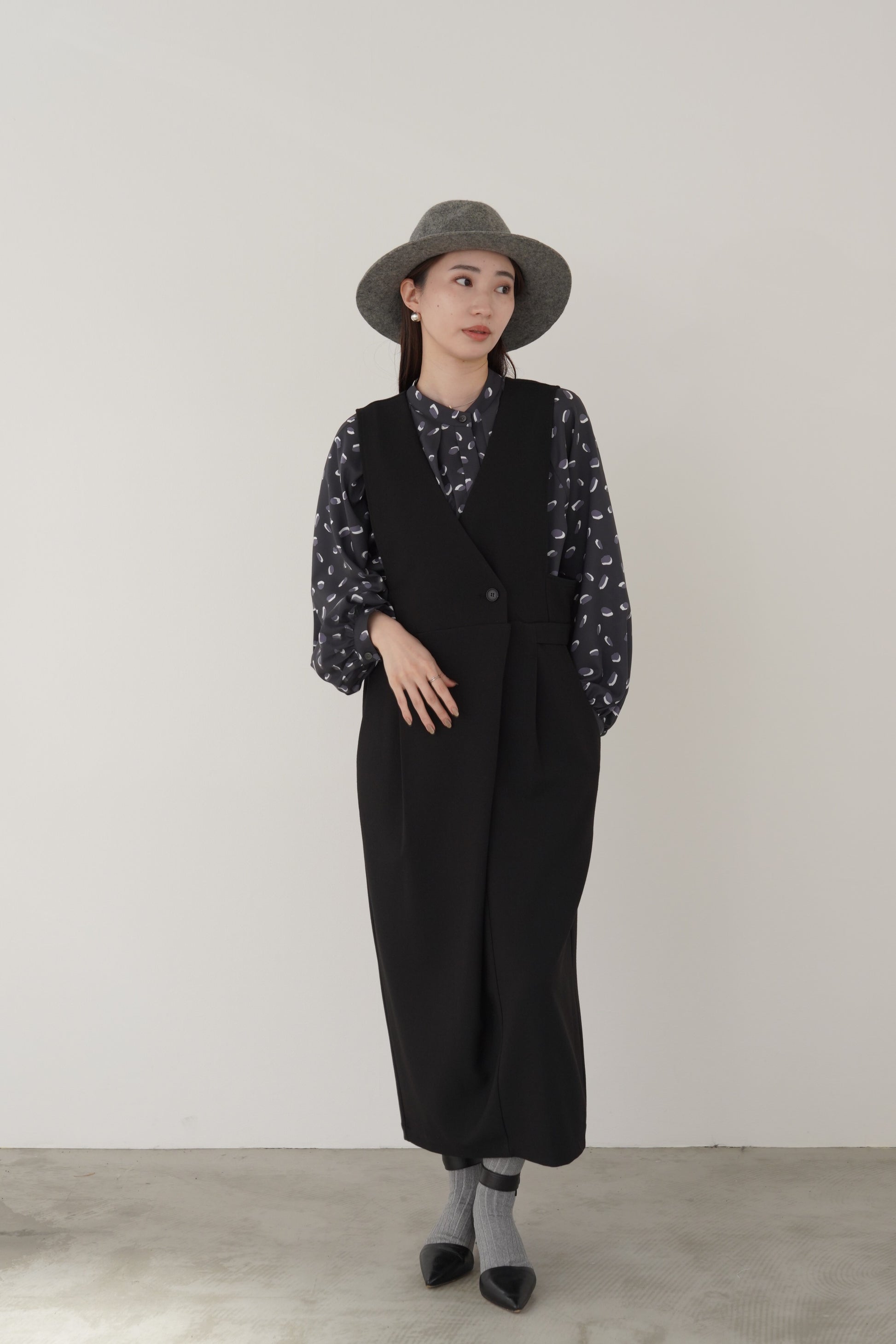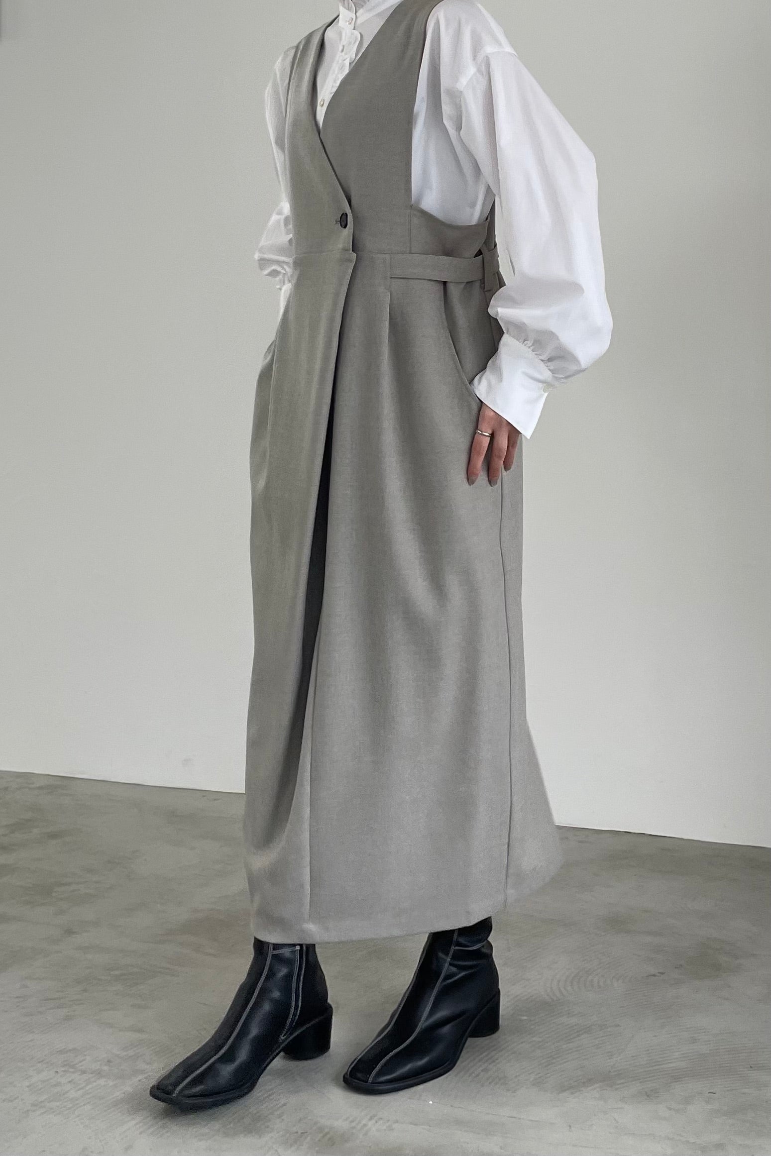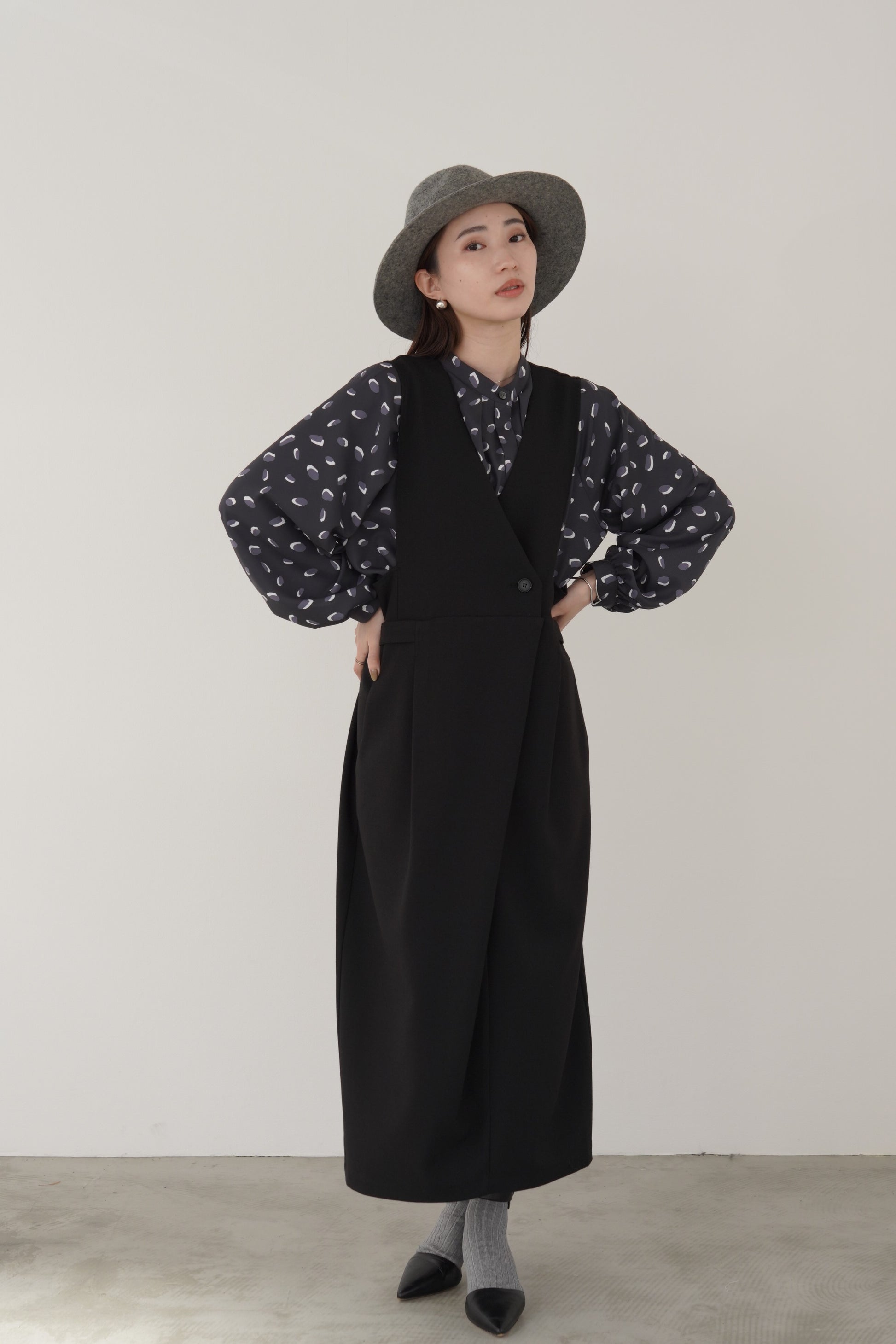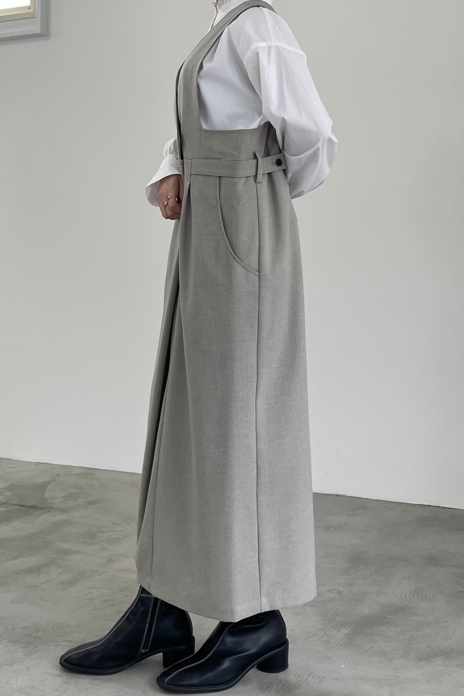 ツイード調のポリエステル/レーヨンを使用した、ラップ風のディテールが印象的なジャンパースカート。ウエストの内側にはボタンが付いており、ラップデザインが安定します。また、後ろウエストのタブでウエストの調節が可能です。裏地がなく、見た目より軽い仕上がりです。