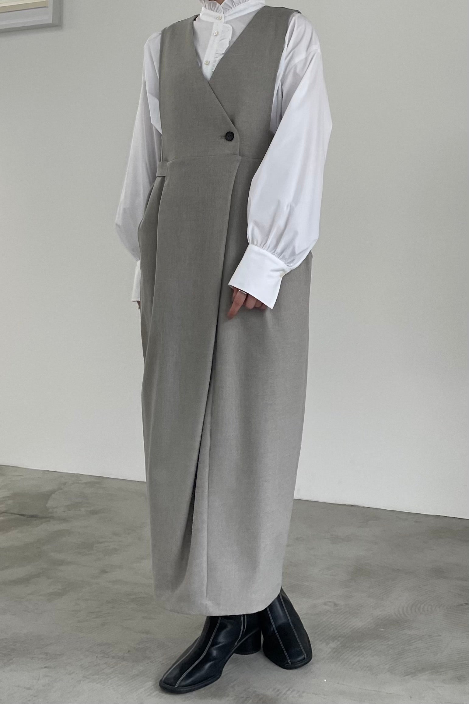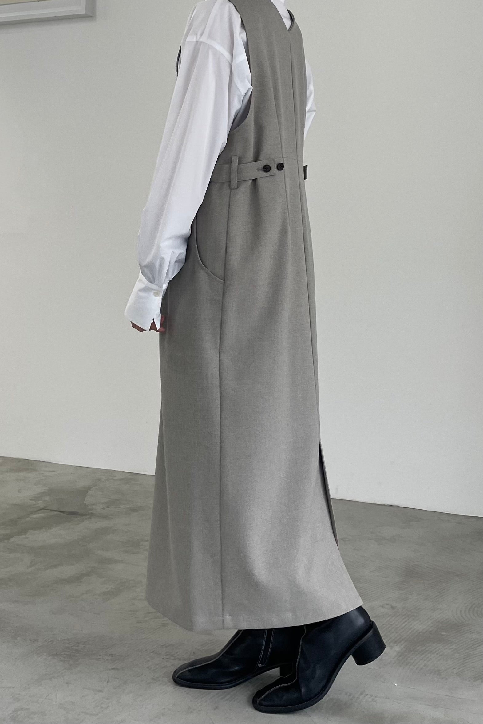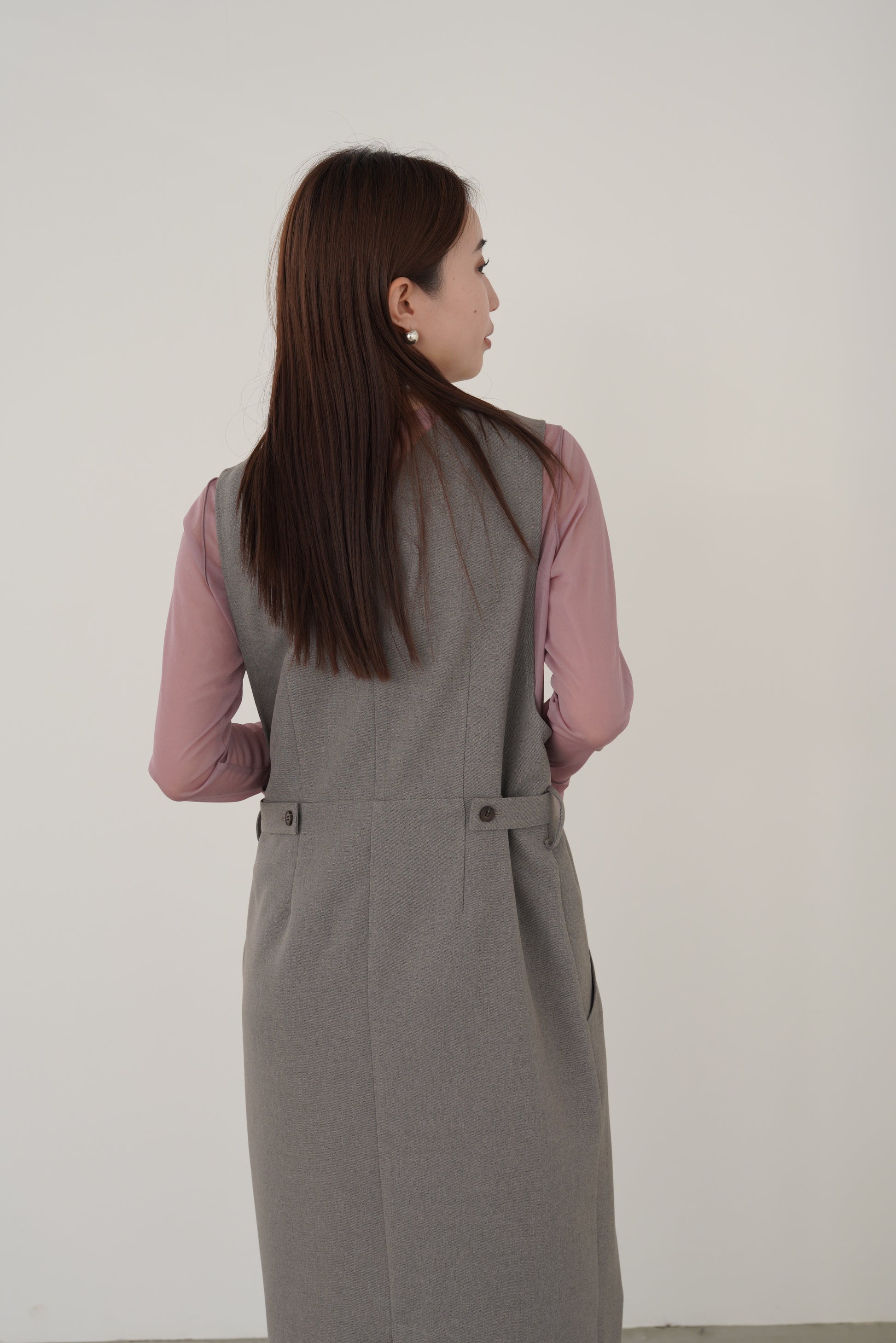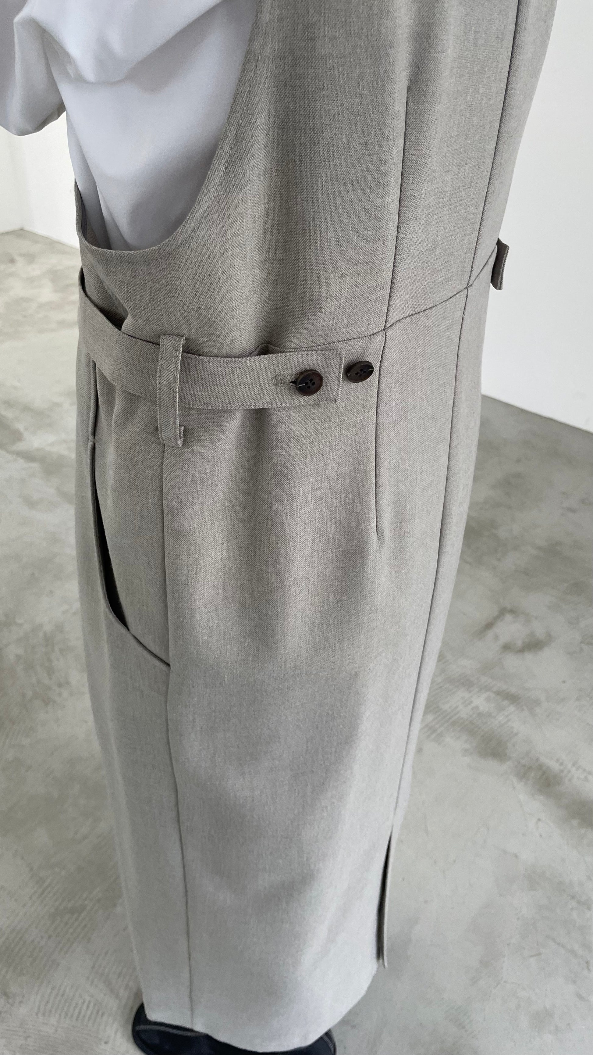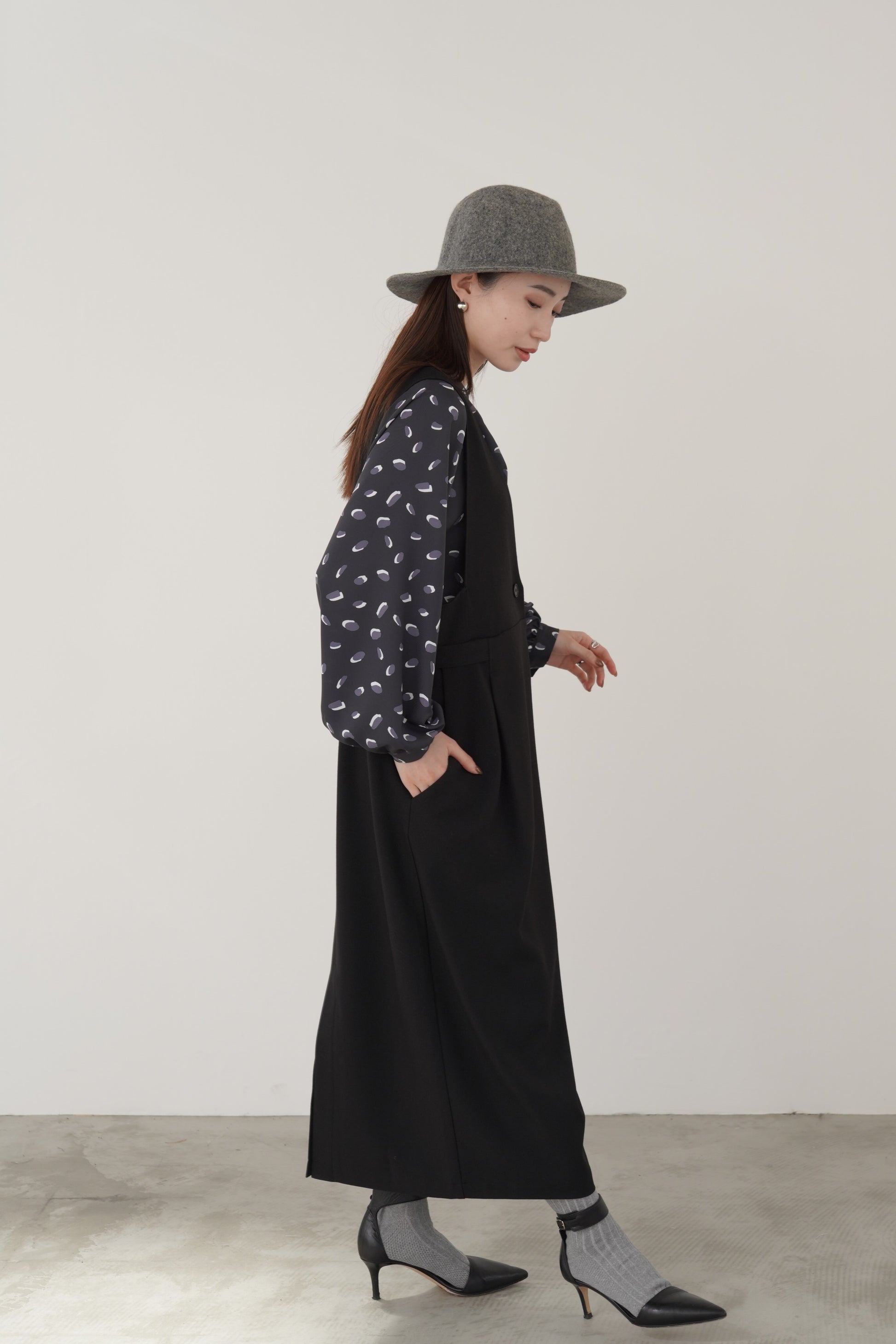 ツイード調のポリエステル/レーヨンを使用した、ラップ風のディテールが印象的なジャンパースカート。ウエストの内側にはボタンが付いており、ラップデザインが安定します。また、後ろウエストのタブでウエストの調節が可能です。裏地がなく、見た目より軽い仕上がりです。