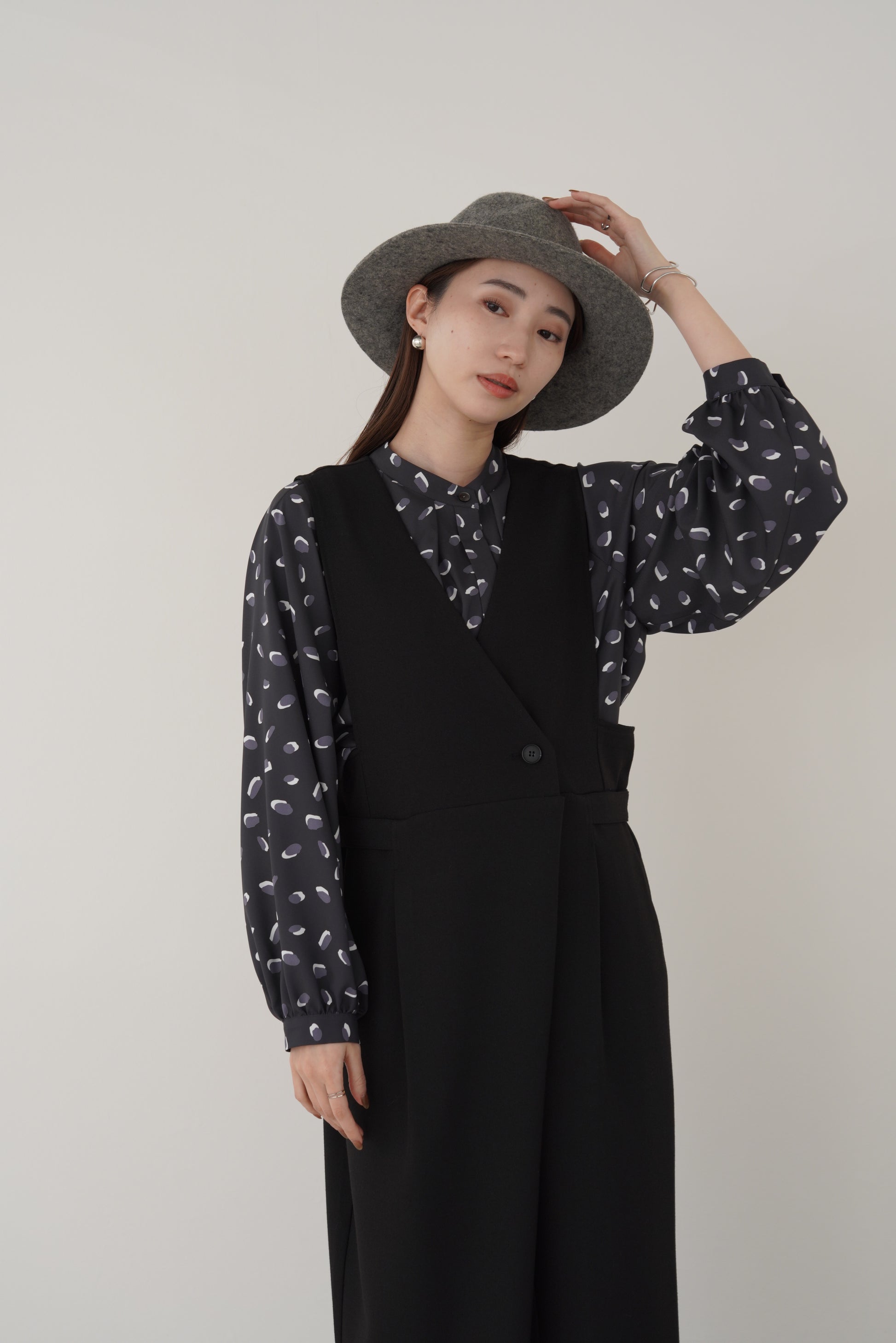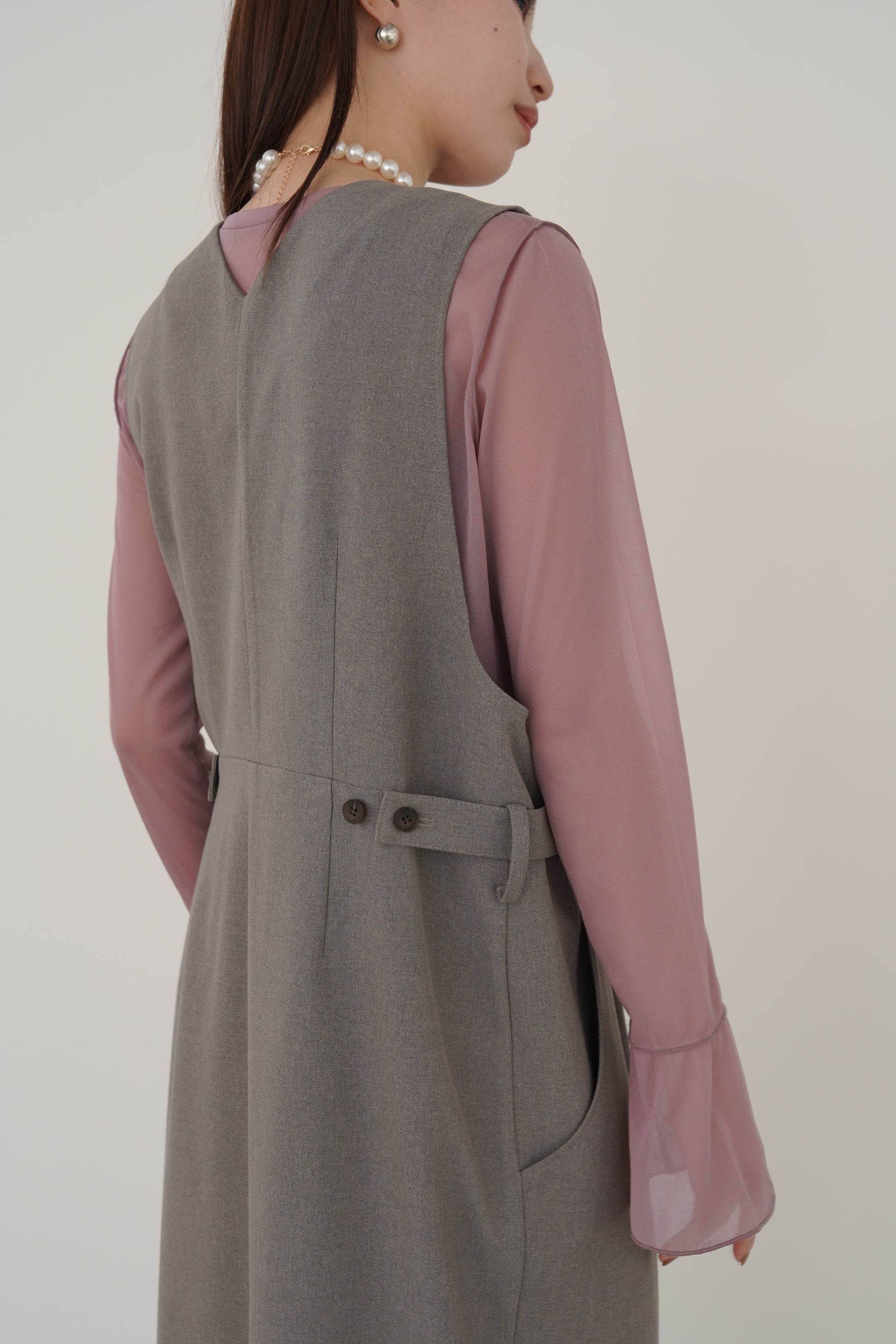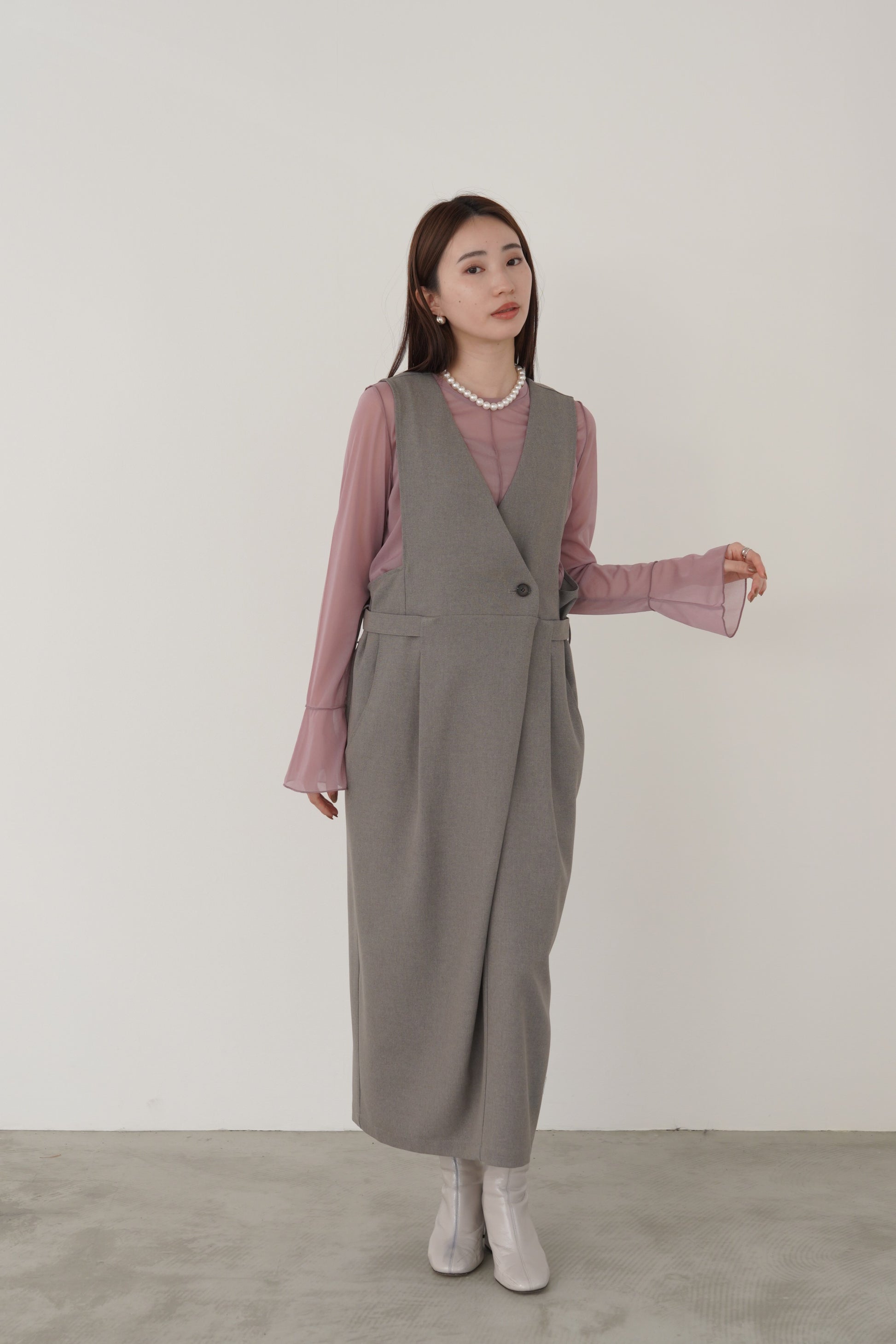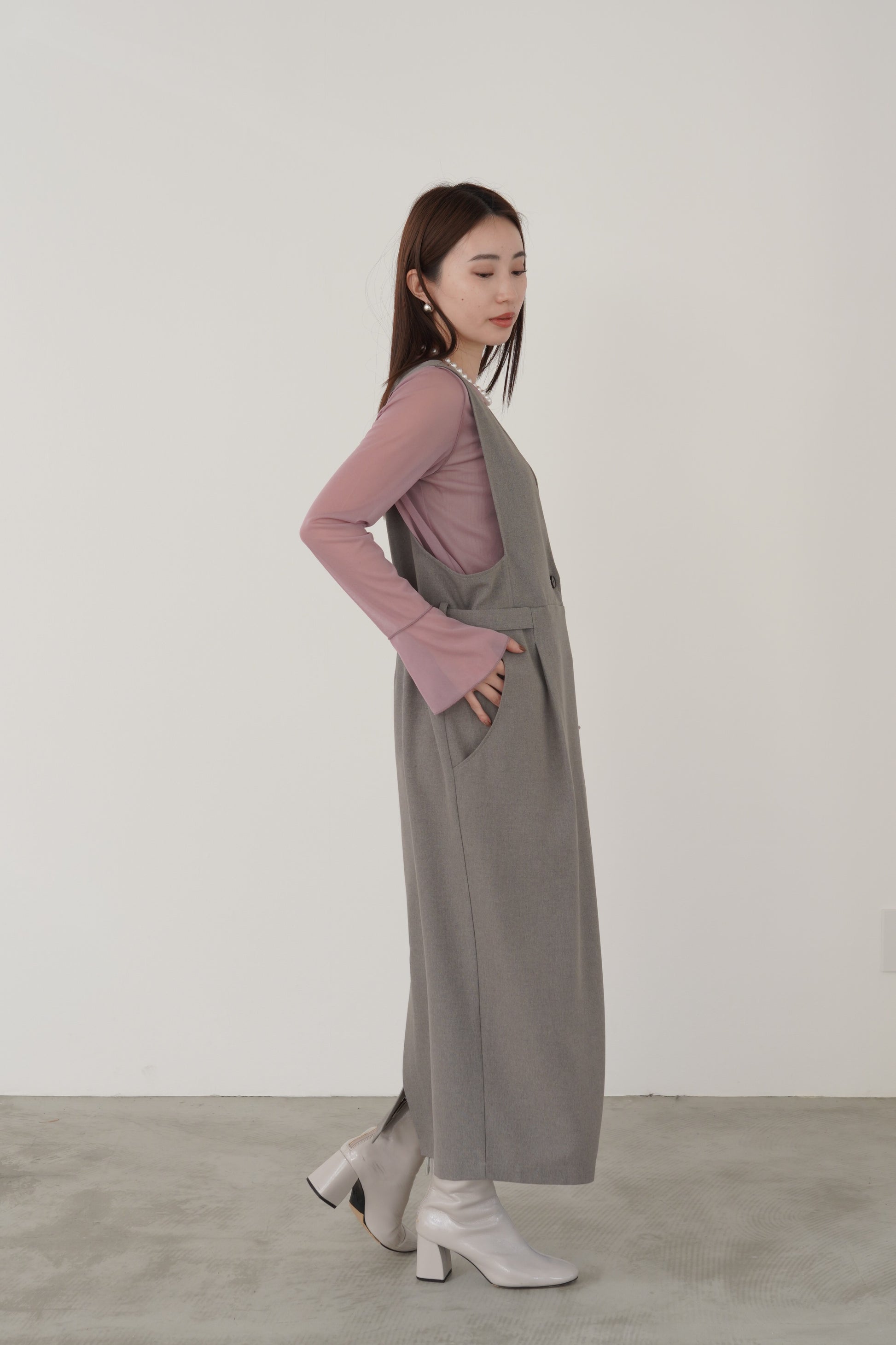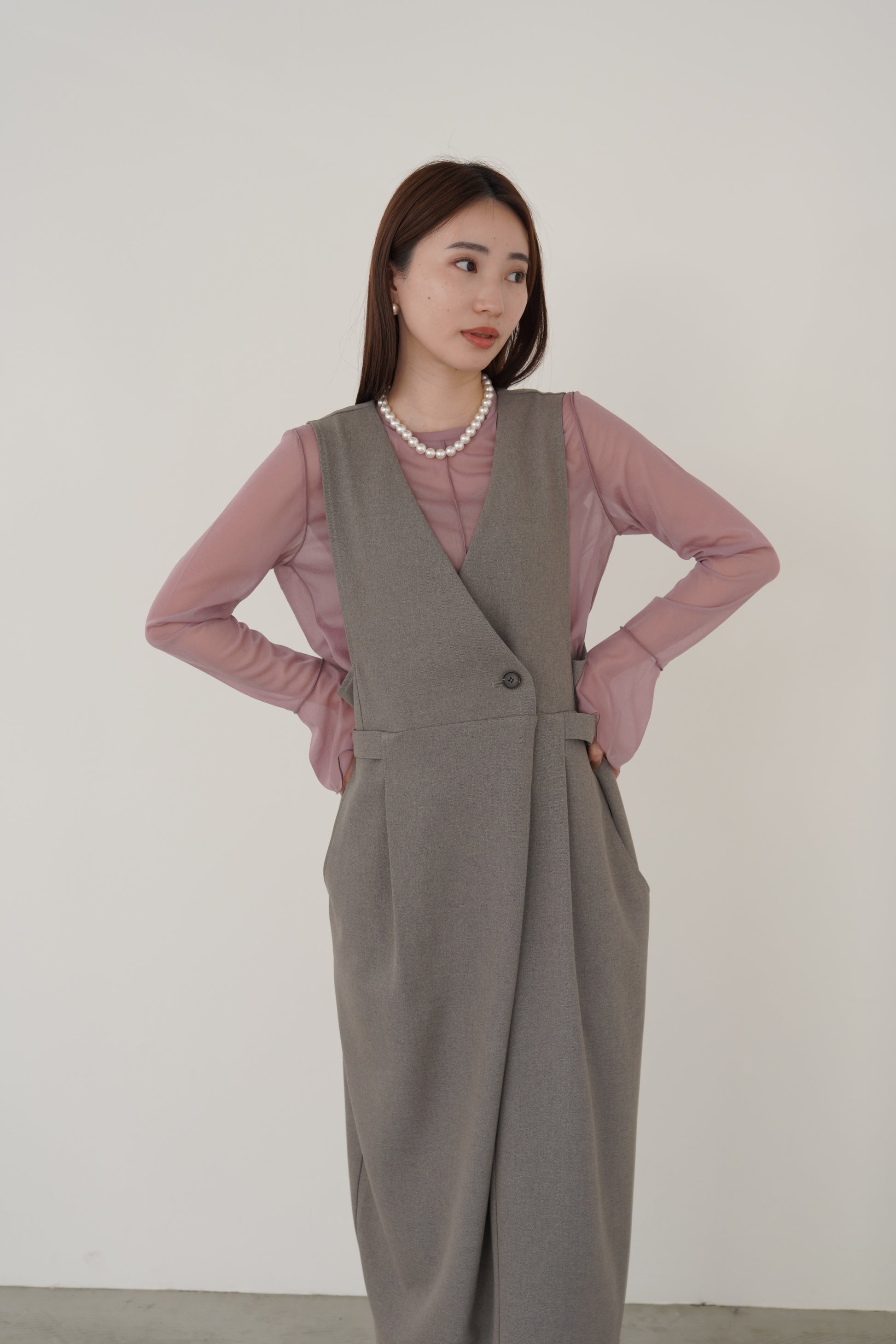 ツイード調のポリエステル/レーヨンを使用した、ラップ風のディテールが印象的なジャンパースカート。ウエストの内側にはボタンが付いており、ラップデザインが安定します。また、後ろウエストのタブでウエストの調節が可能です。裏地がなく、見た目より軽い仕上がりです。