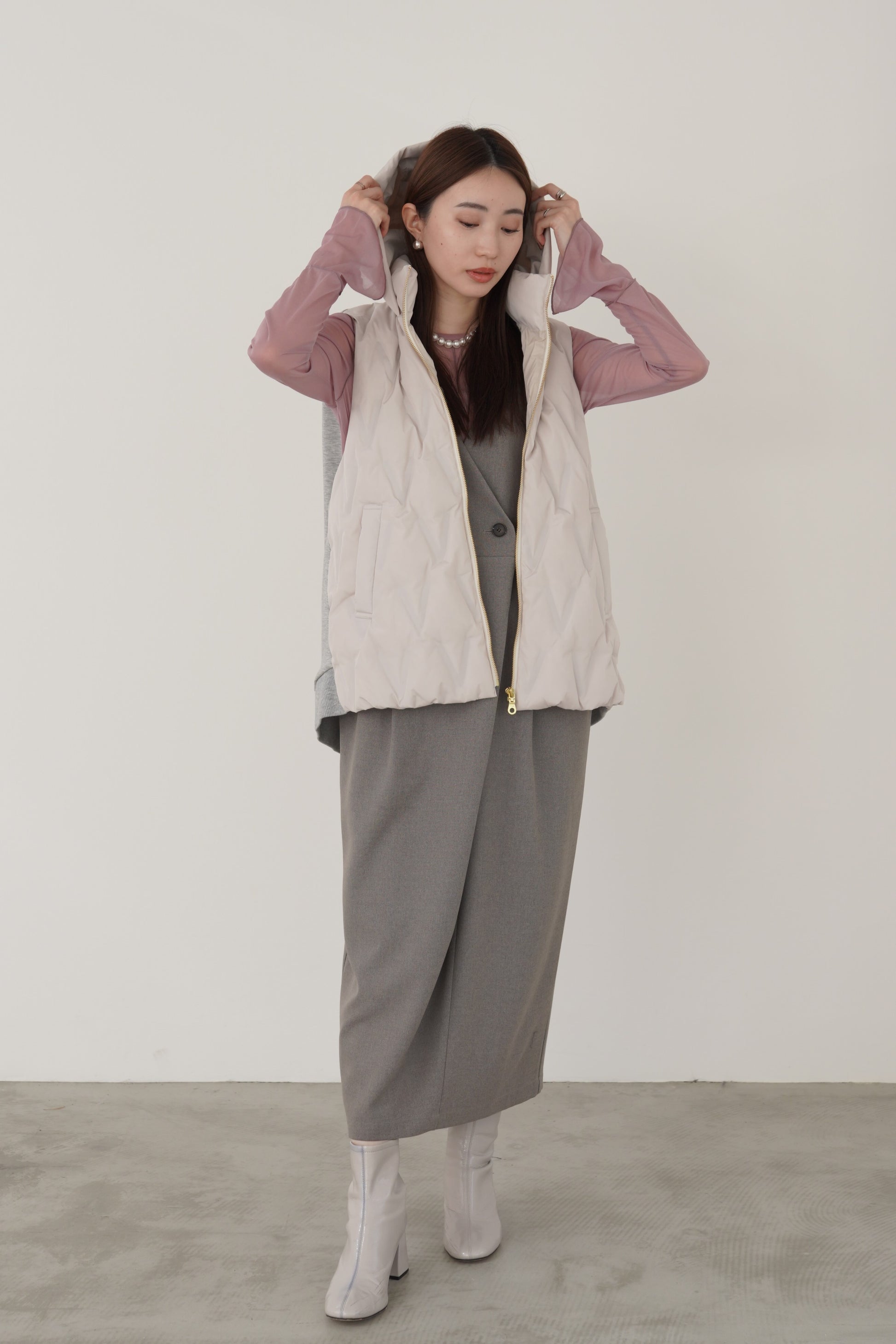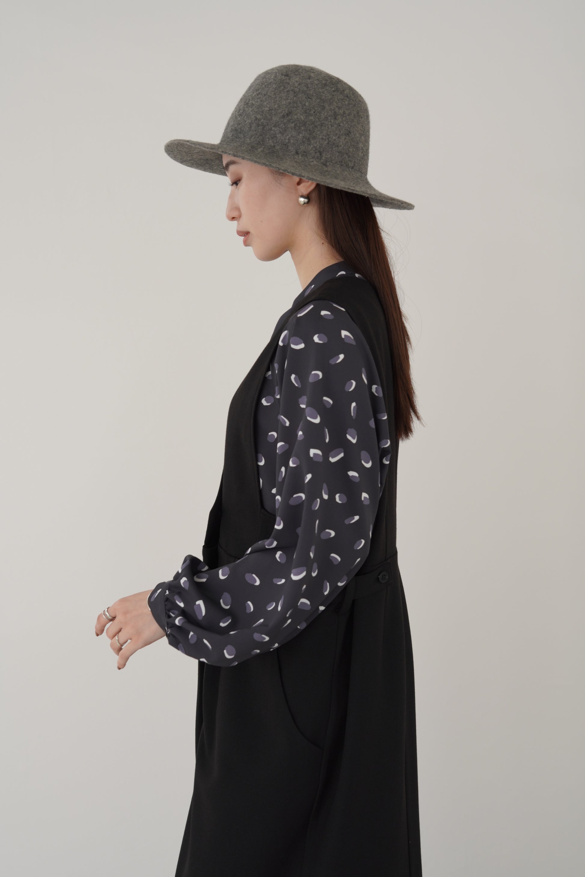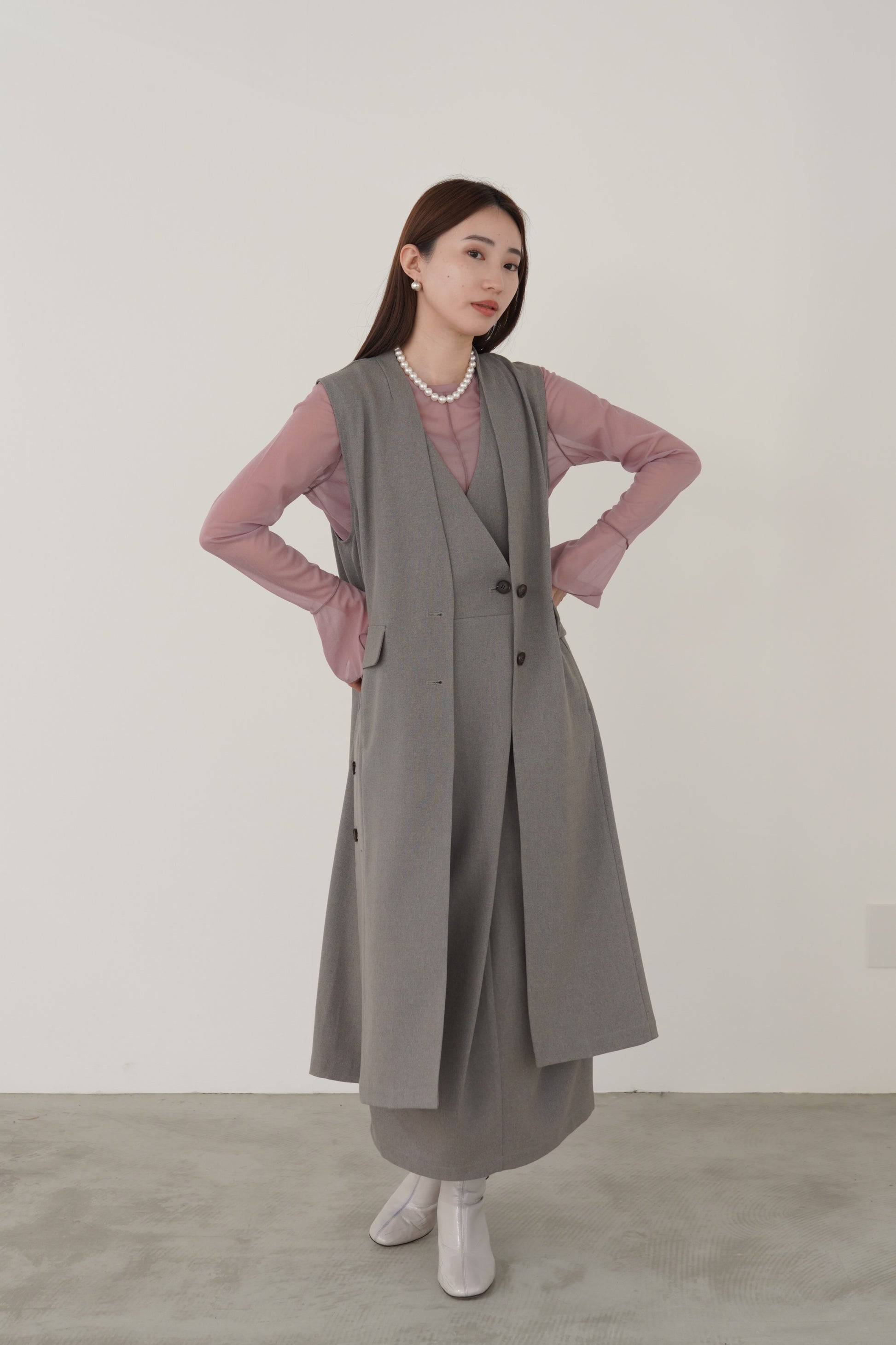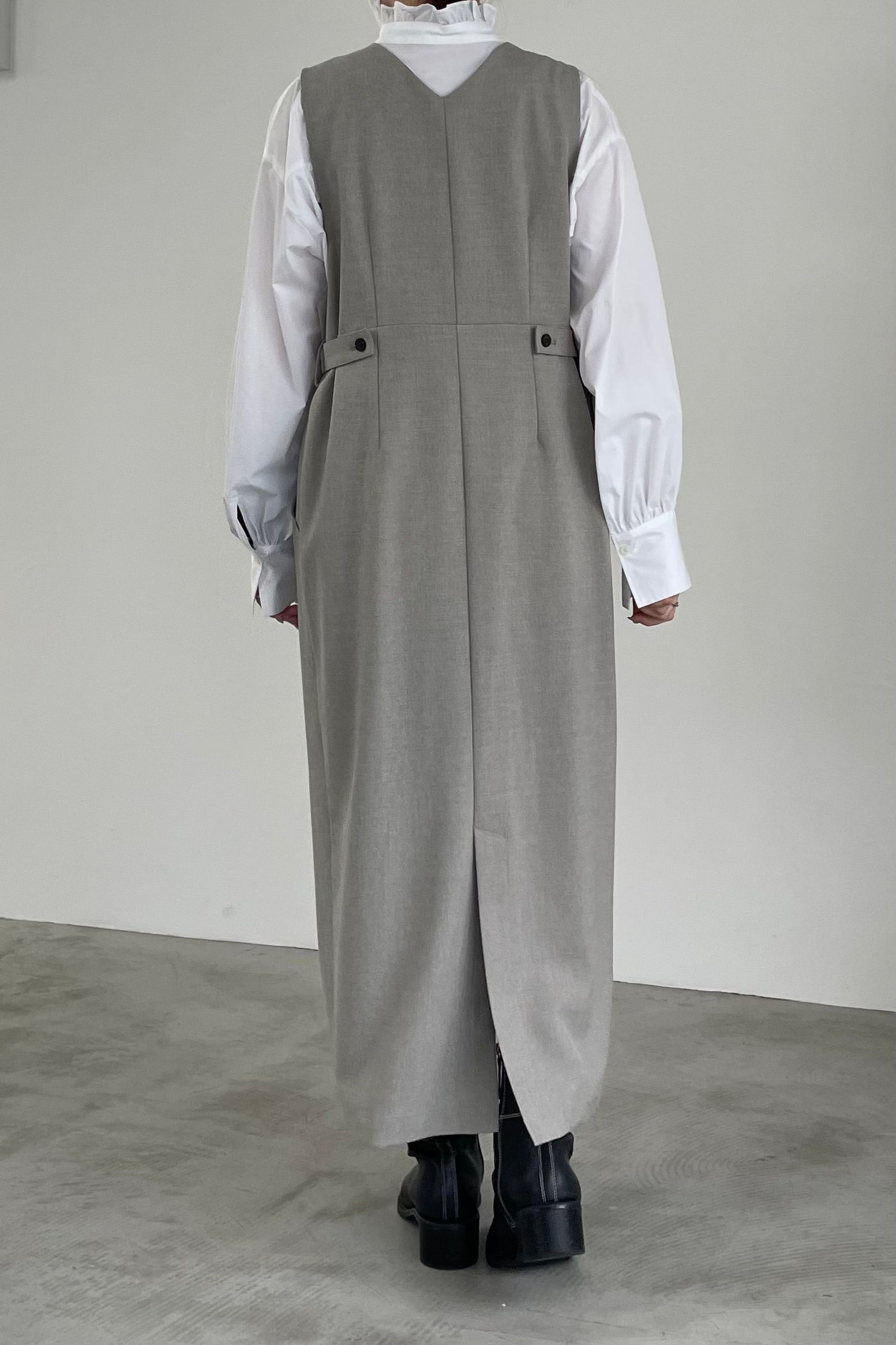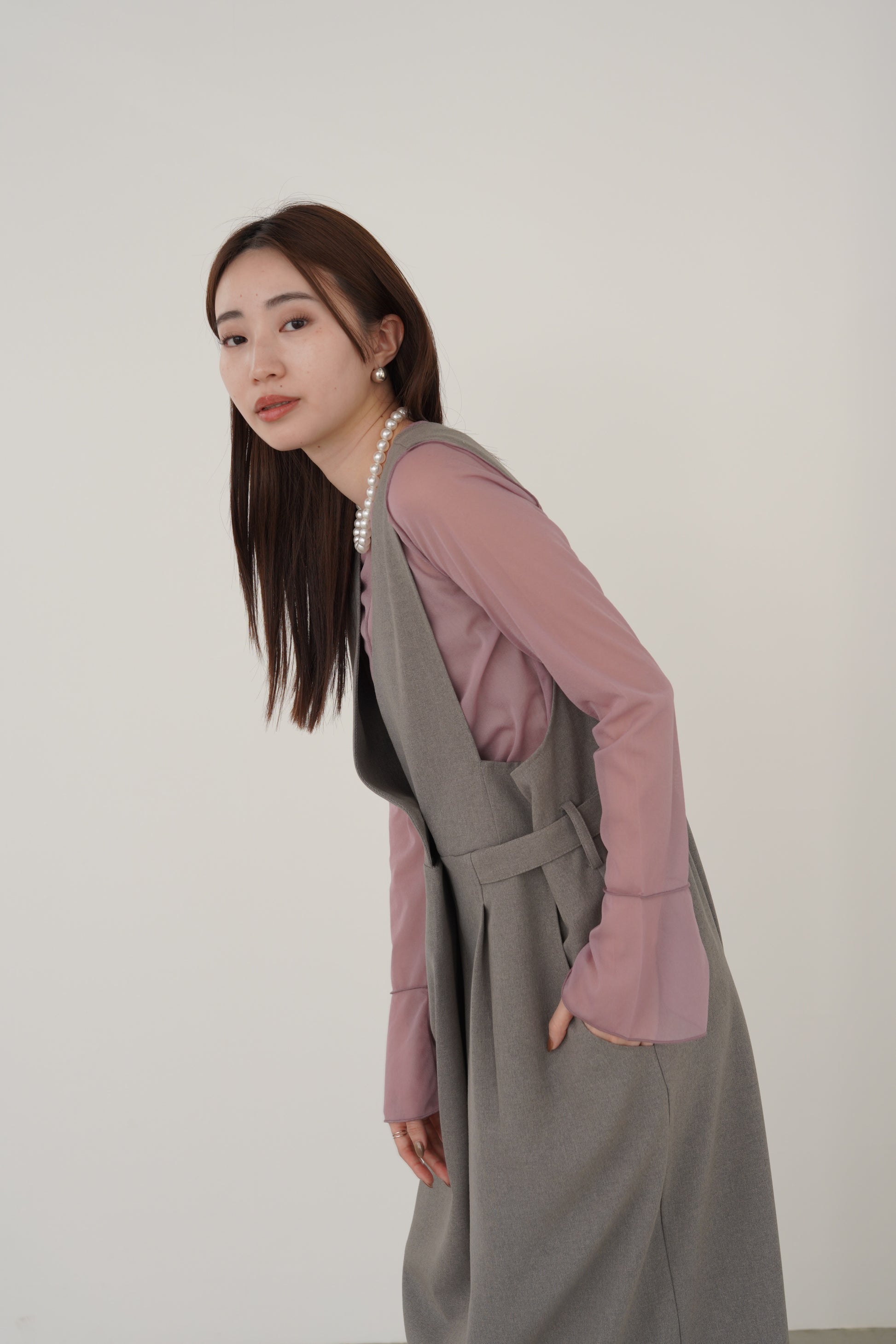 ツイード調のポリエステル/レーヨンを使用した、ラップ風のディテールが印象的なジャンパースカート。ウエストの内側にはボタンが付いており、ラップデザインが安定します。また、後ろウエストのタブでウエストの調節が可能です。裏地がなく、見た目より軽い仕上がりです。