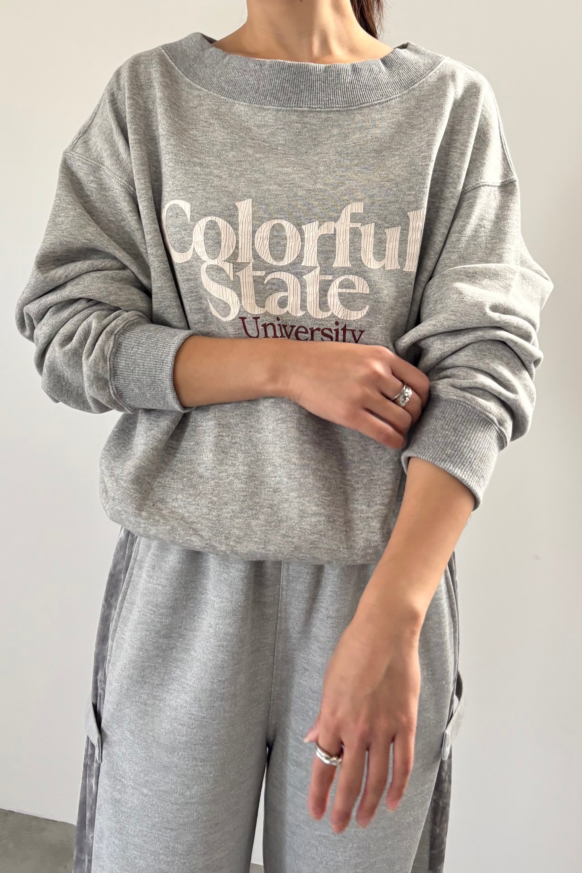 べーシックな国産裏毛を使用した、羽織りとしても着用可能な2WAYロゴスウェット。古着のようなヴィンテージ感のあるクラック(ひび割れ)プリントを施しました。オフショル風のネックラインが、カジュアルな中にも女性らしいヘルシーさを演出してくれます。