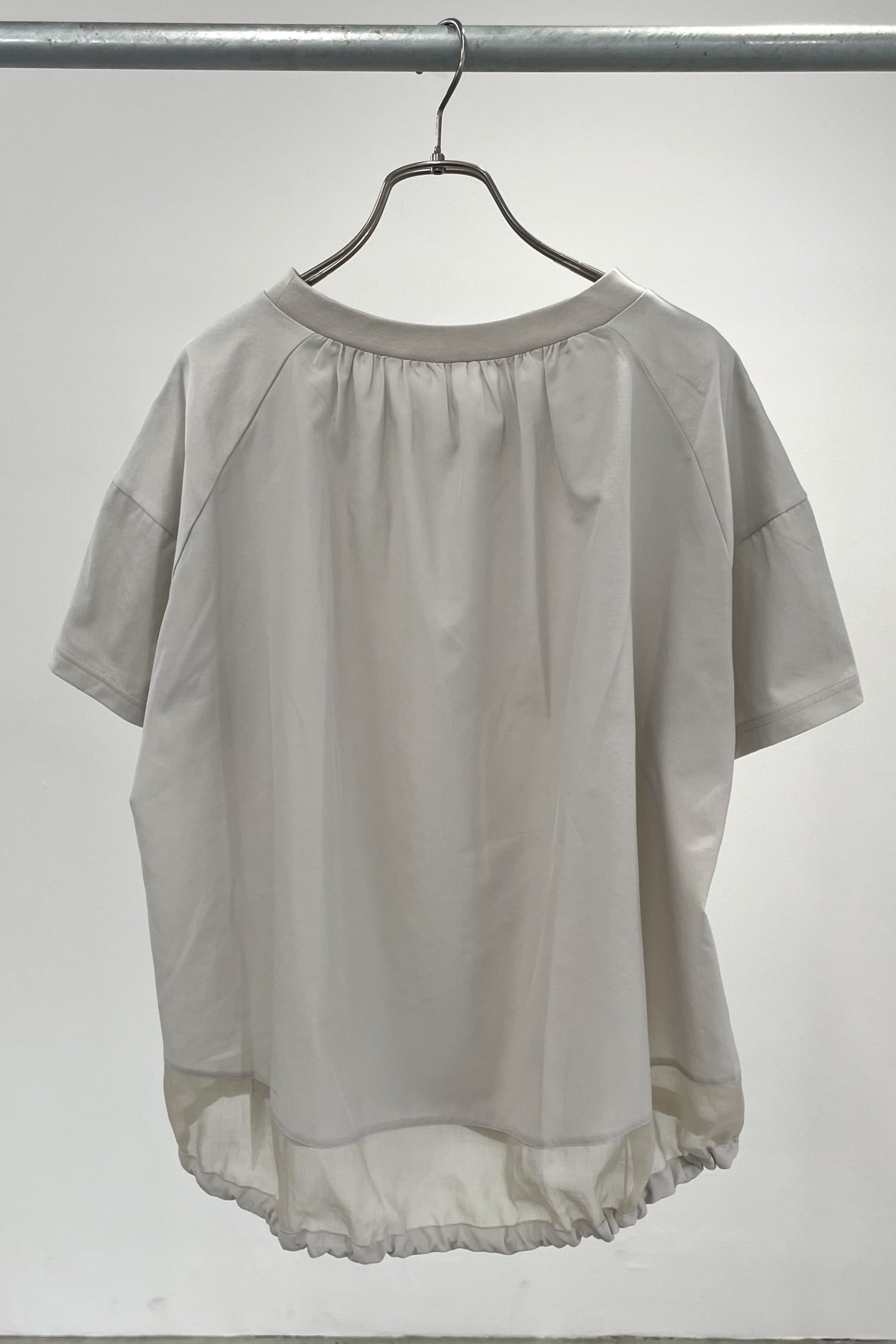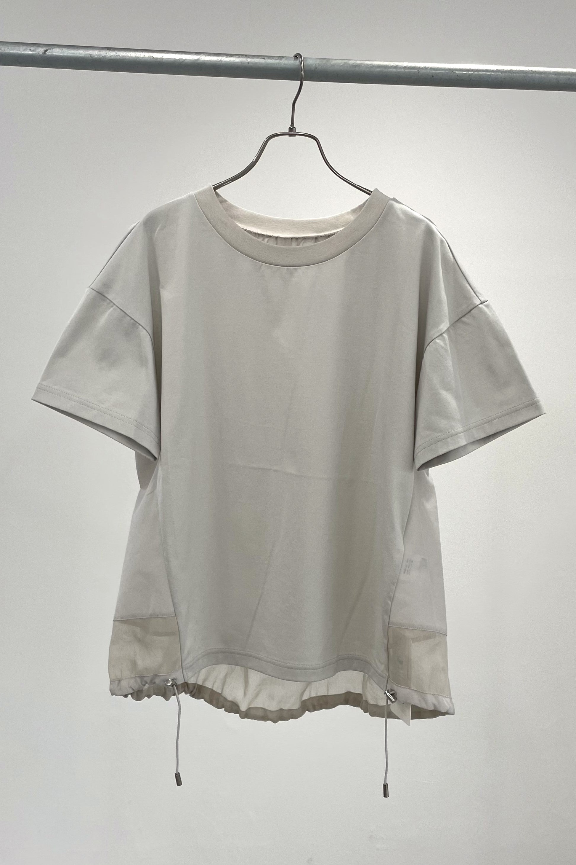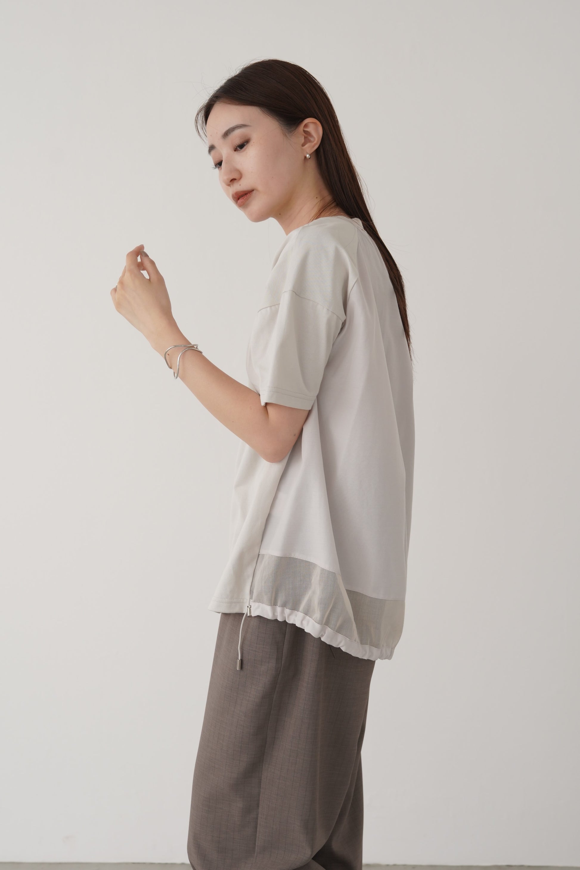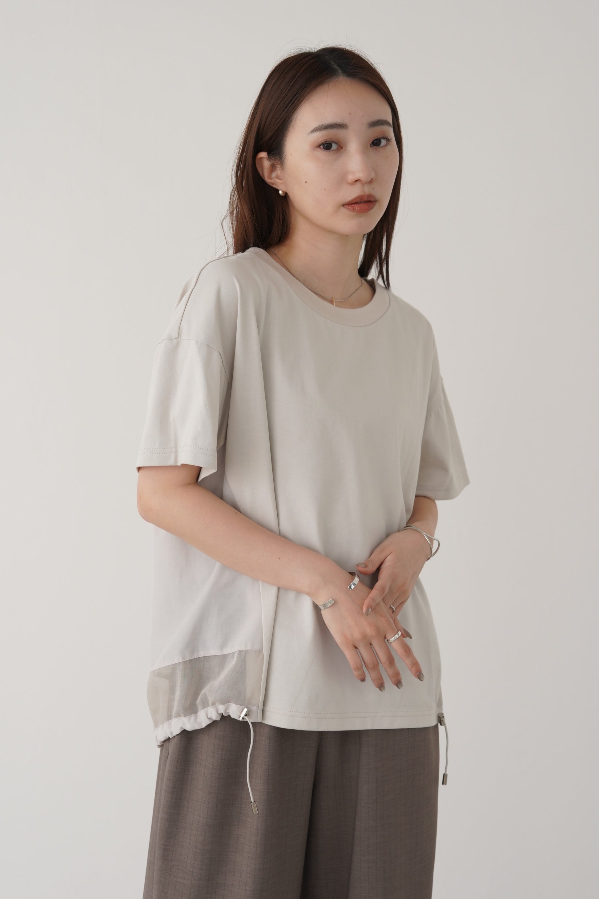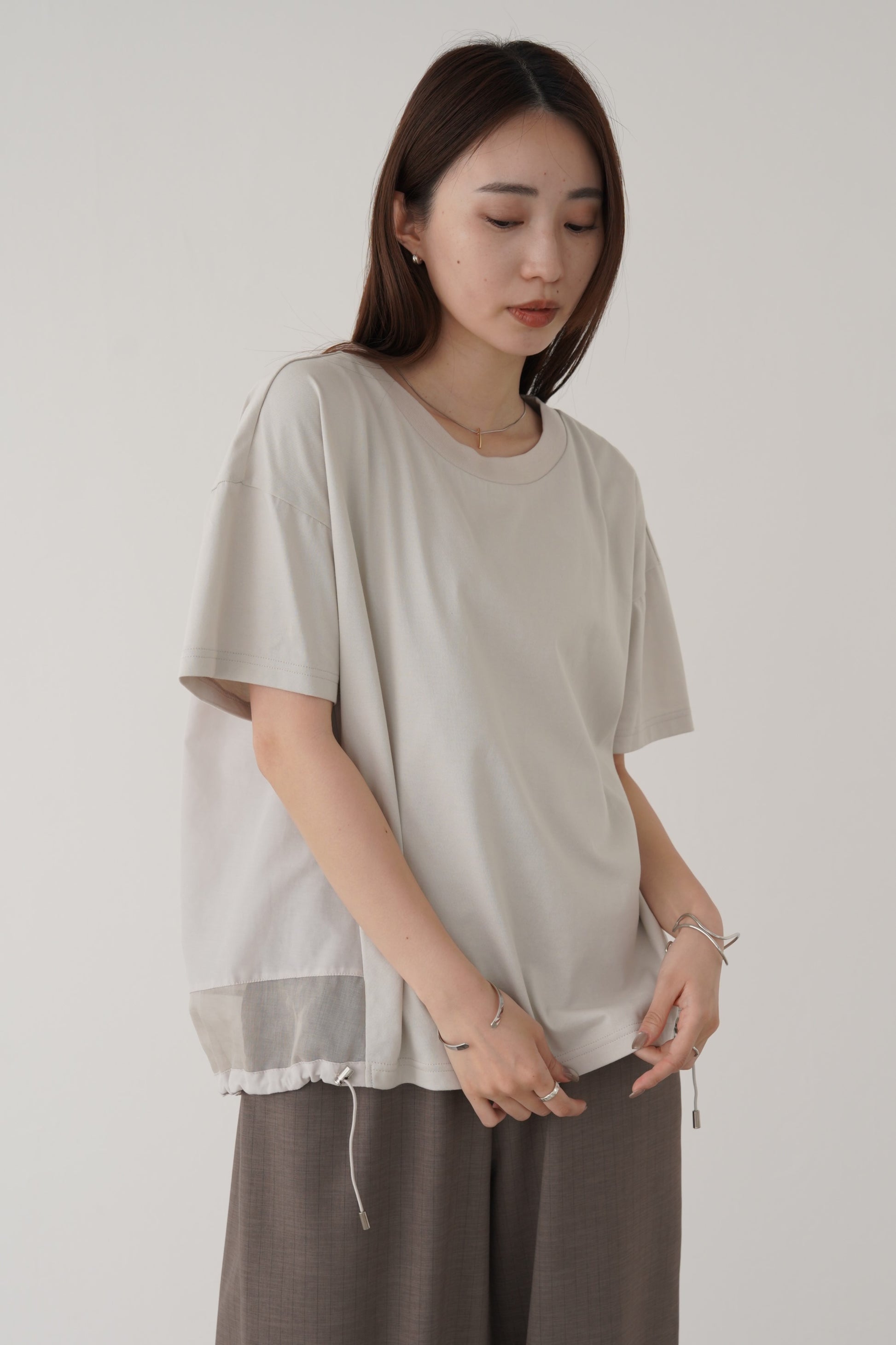 ヴィンテージ感のある天竺にシワになりにくいシャツ地を組み合わせたカットソー。後ろ身頃裾をシアー素材で切り替えて抜け感をプラスしました。裾のドローコードでお好みのサイズ感に調節していただけます。