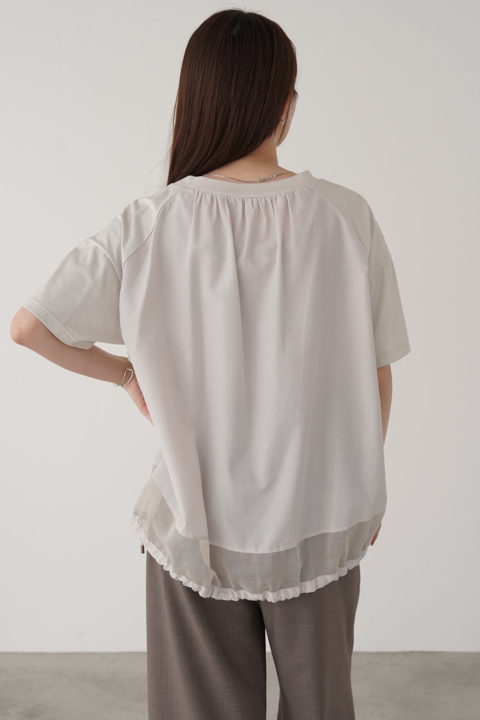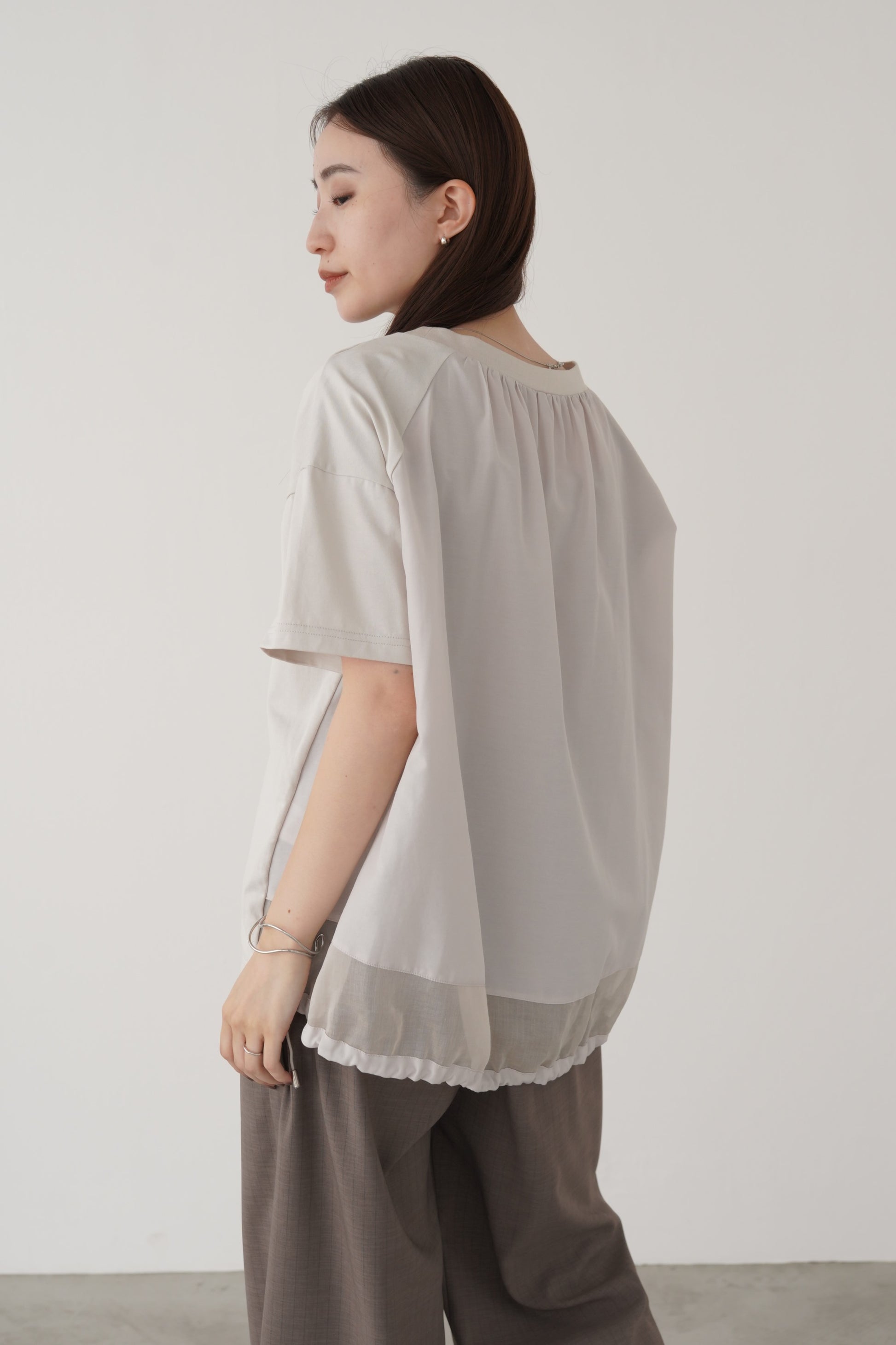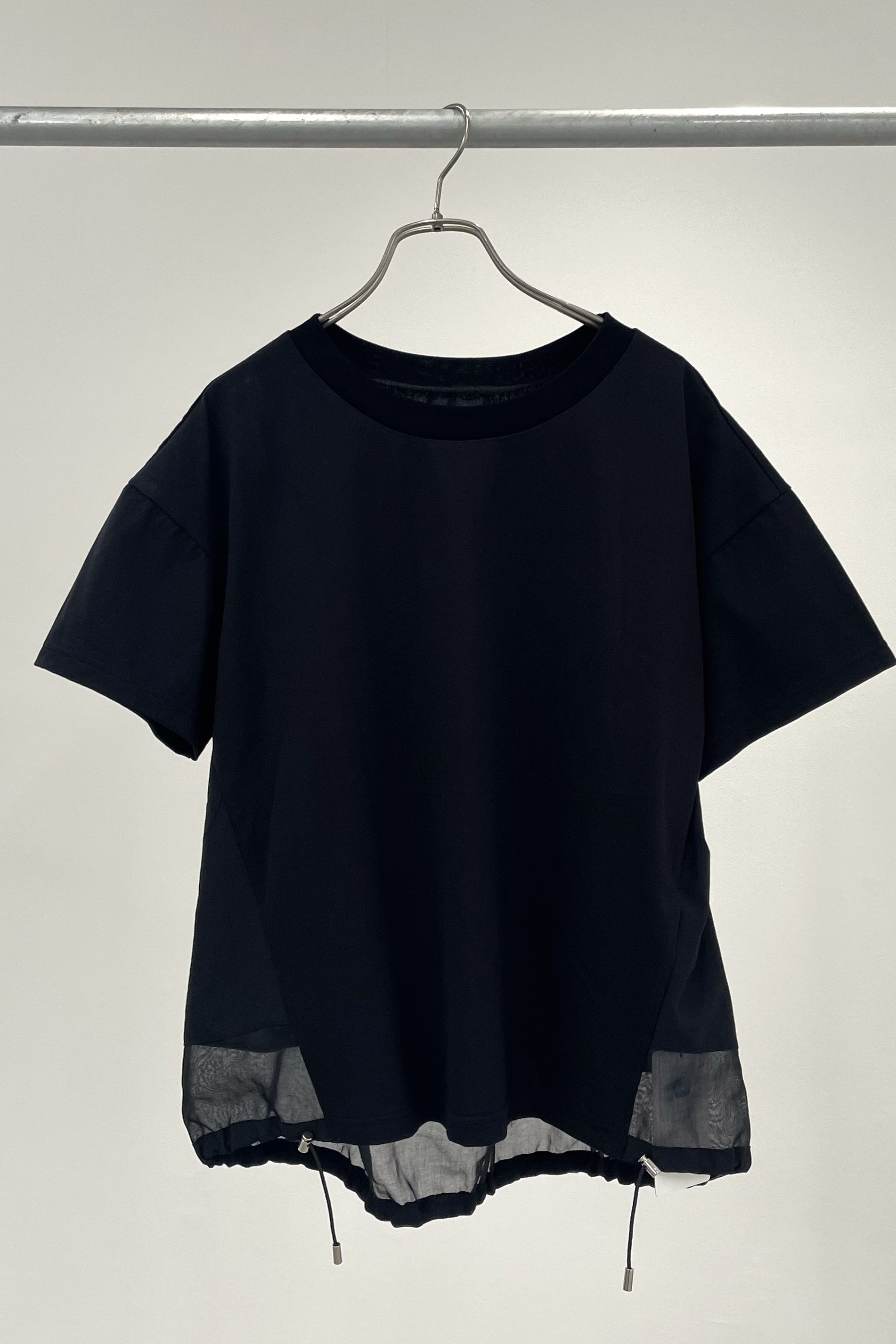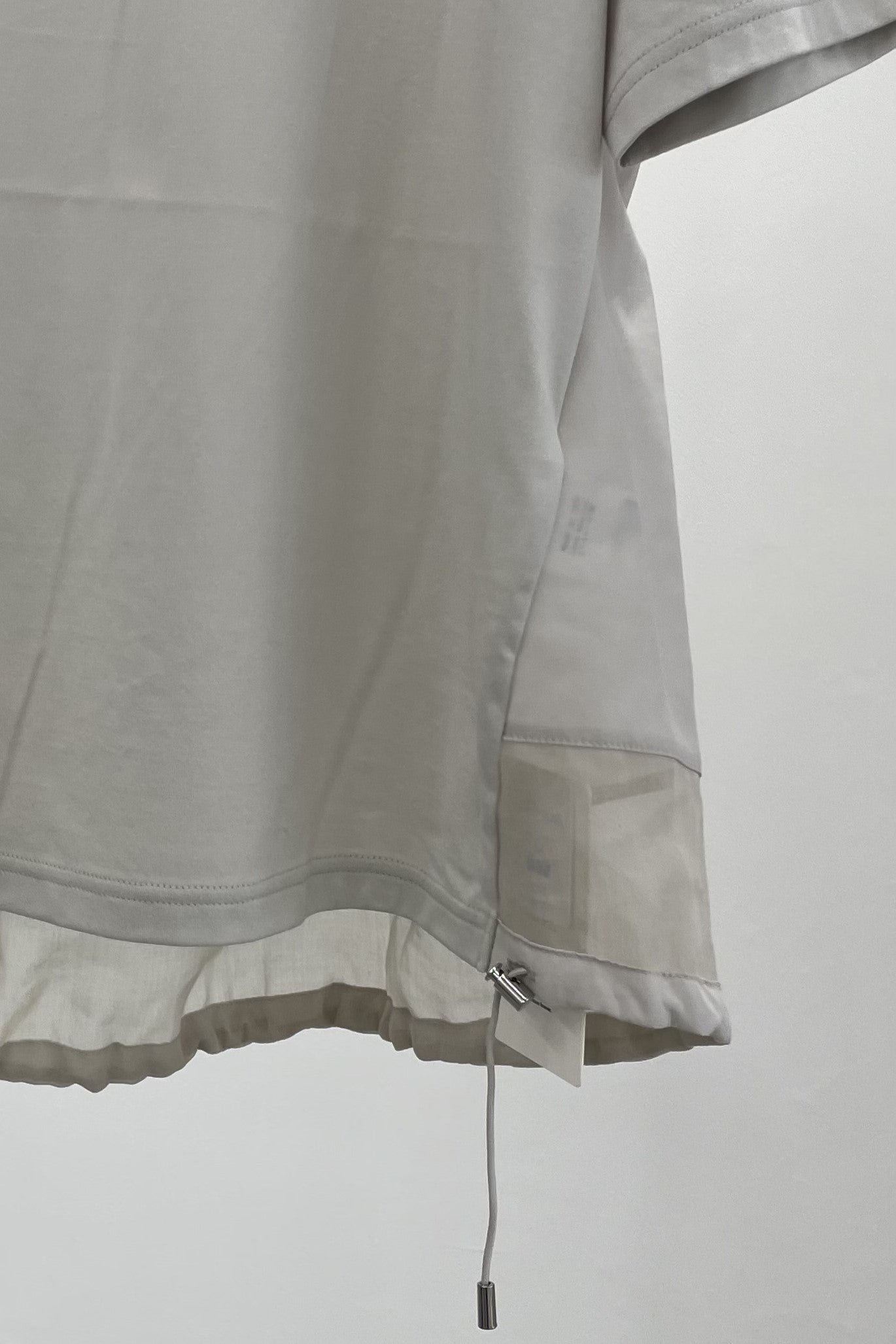 ヴィンテージ感のある天竺にシワになりにくいシャツ地を組み合わせたカットソー。後ろ身頃裾をシアー素材で切り替えて抜け感をプラスしました。裾のドローコードでお好みのサイズ感に調節していただけます。