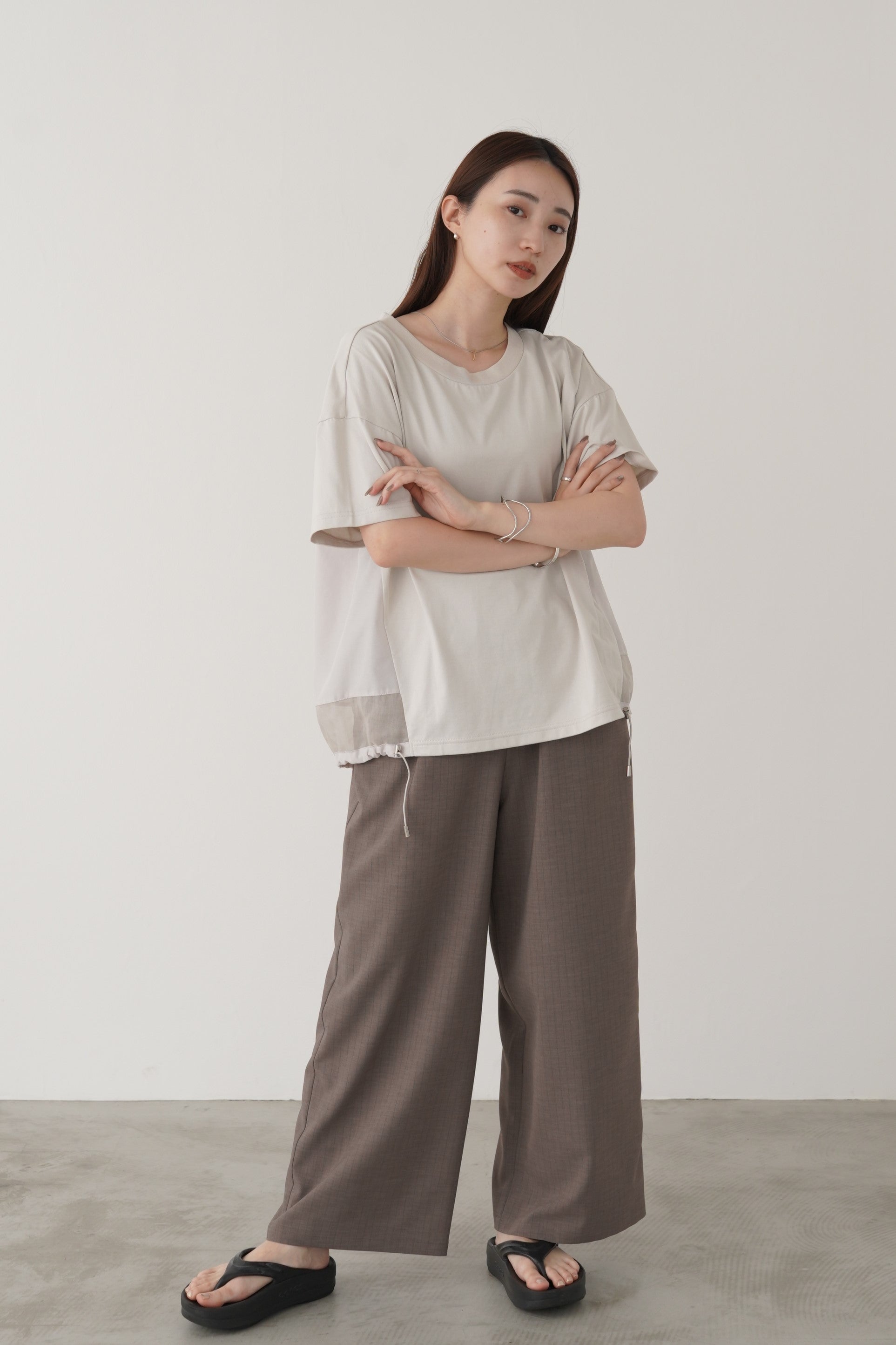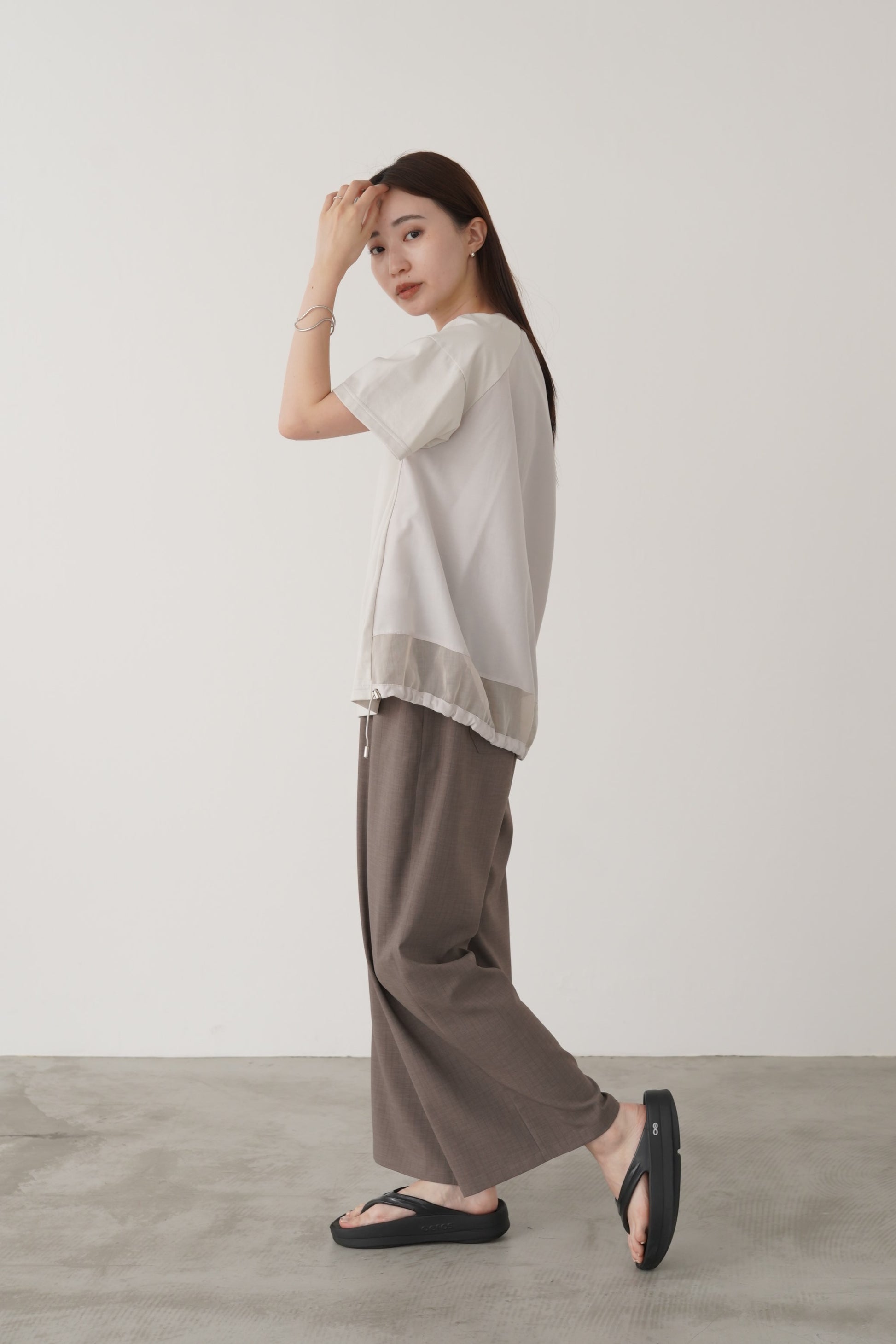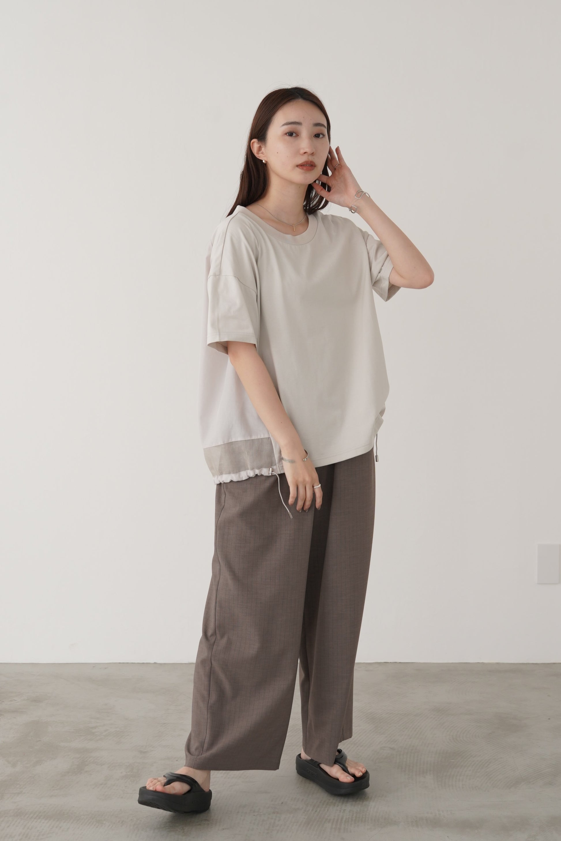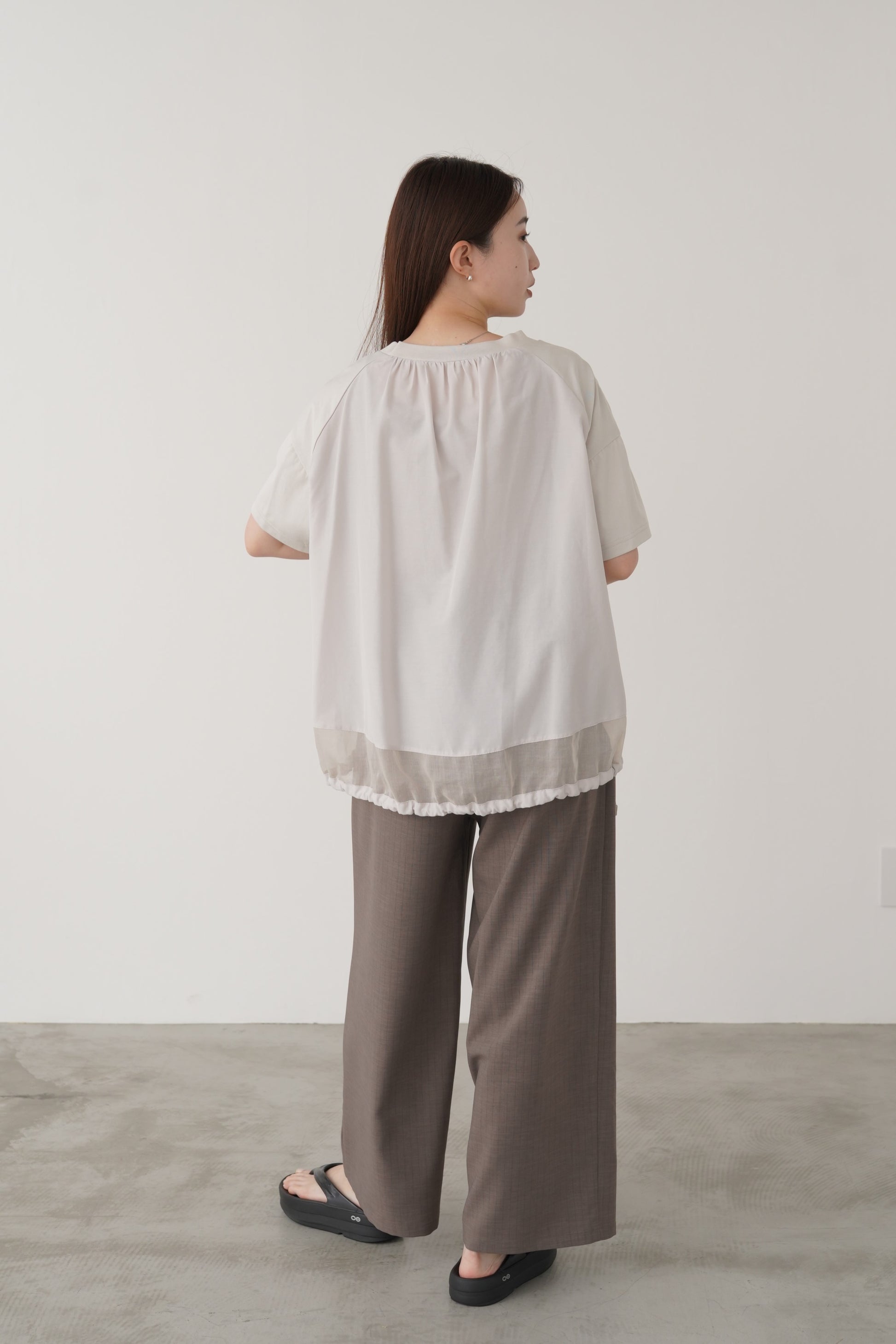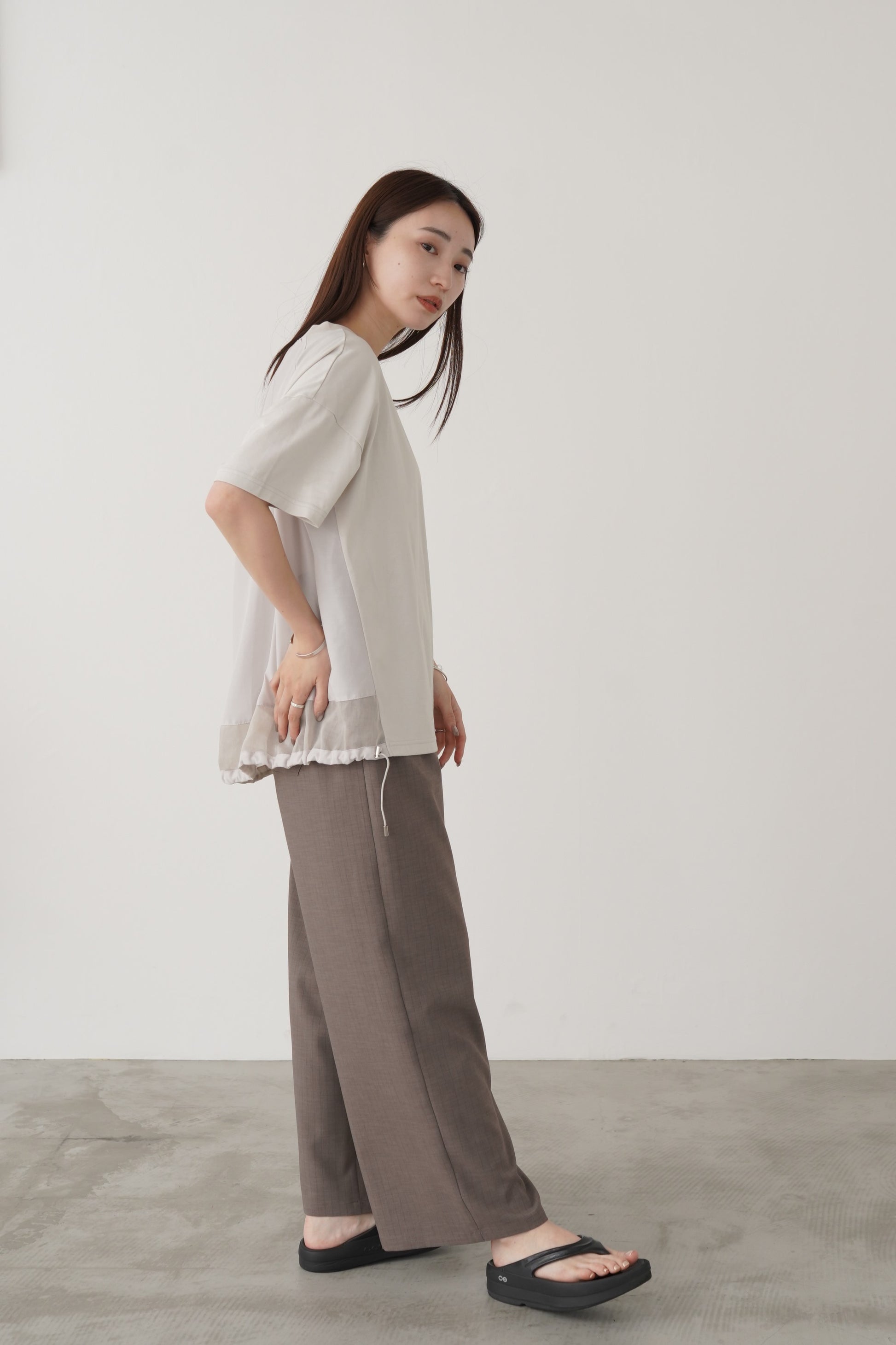 ヴィンテージ感のある天竺にシワになりにくいシャツ地を組み合わせたカットソー。後ろ身頃裾をシアー素材で切り替えて抜け感をプラスしました。裾のドローコードでお好みのサイズ感に調節していただけます。