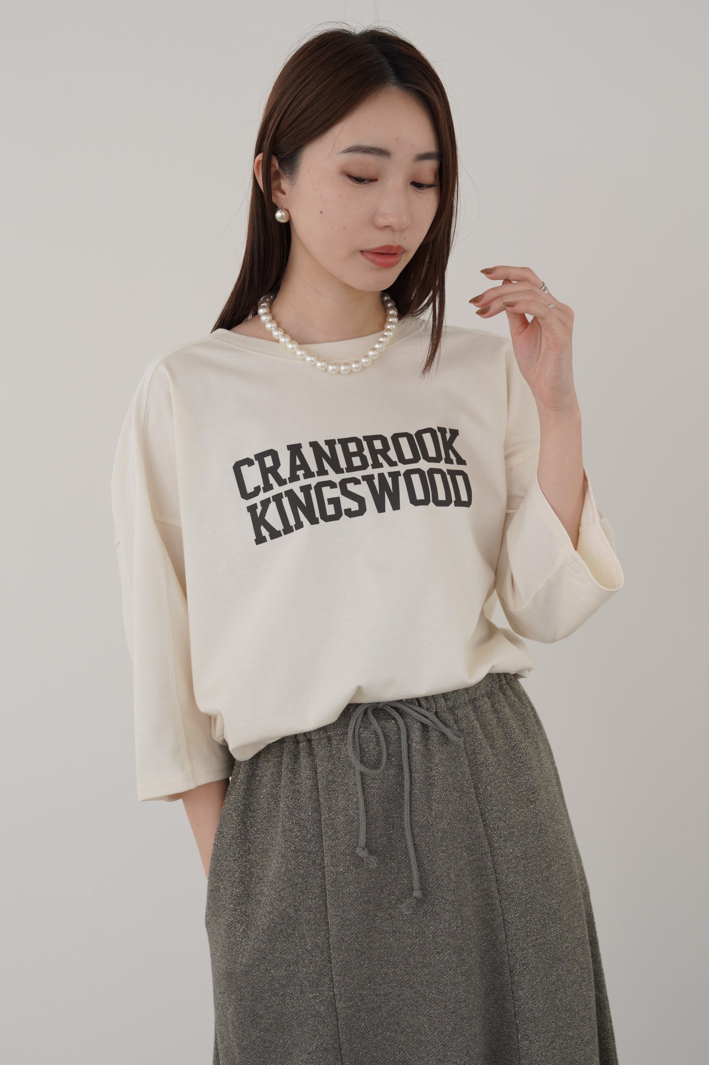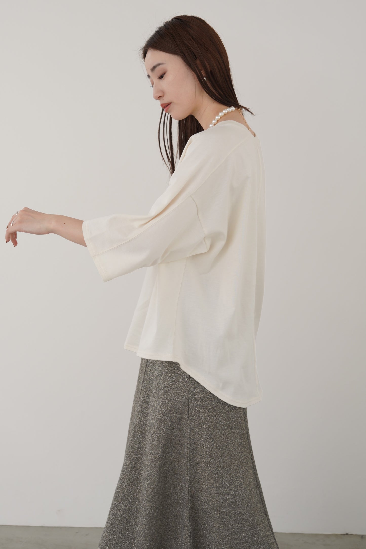 しっとりとして肌触りが良く、1枚で着用しても透けにくいTシャツ。変形スリーブでゆとりのあるシルエット。袖丈は肘までカバーしてくれる長さですが、軽くロールアップして着るのもおすすめです。