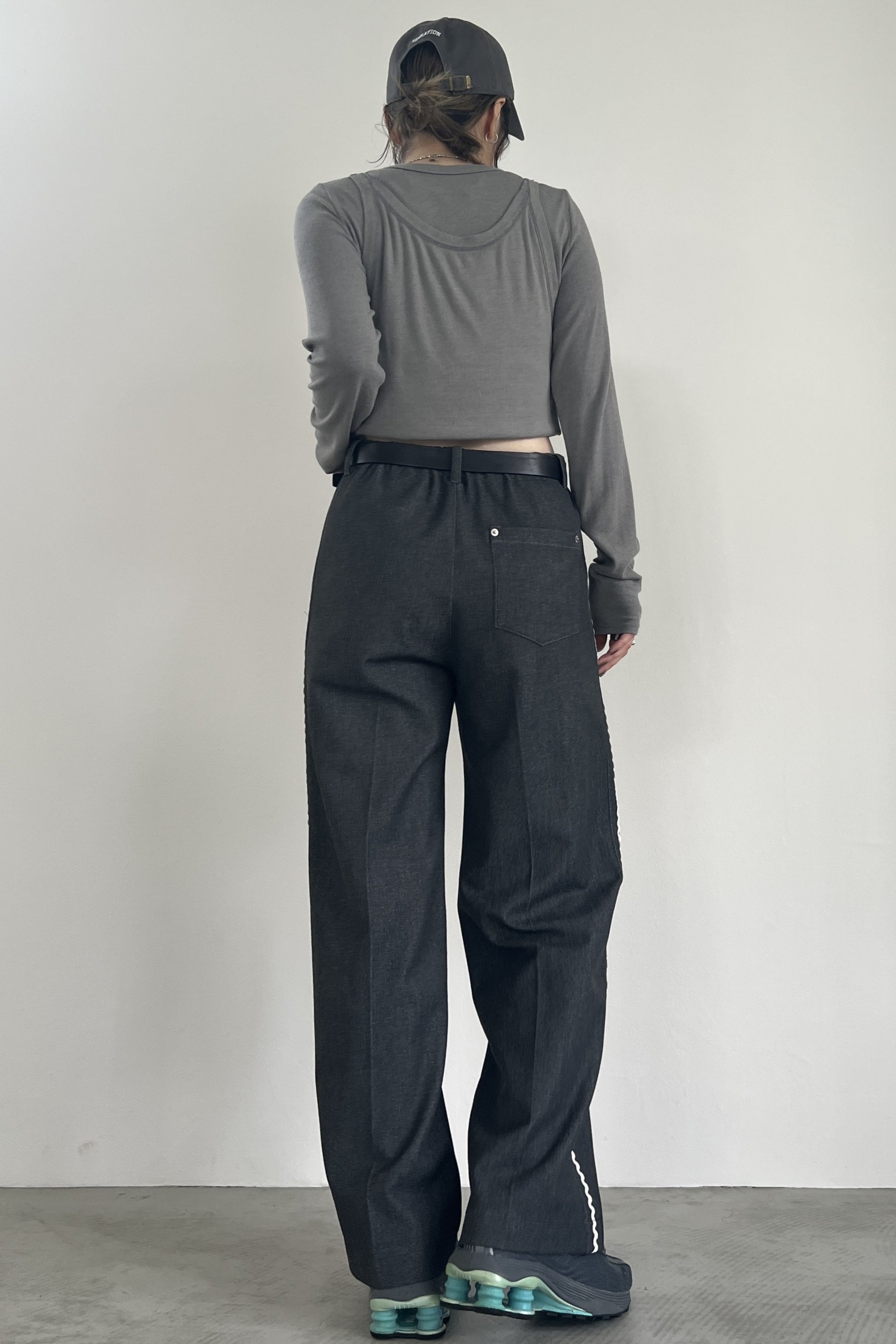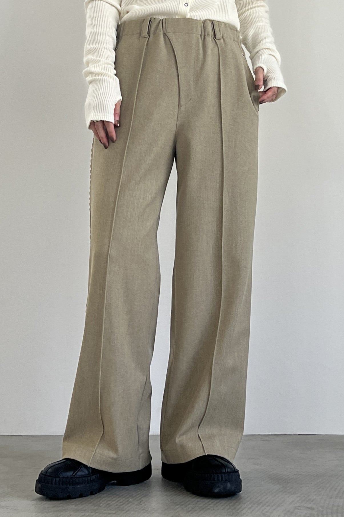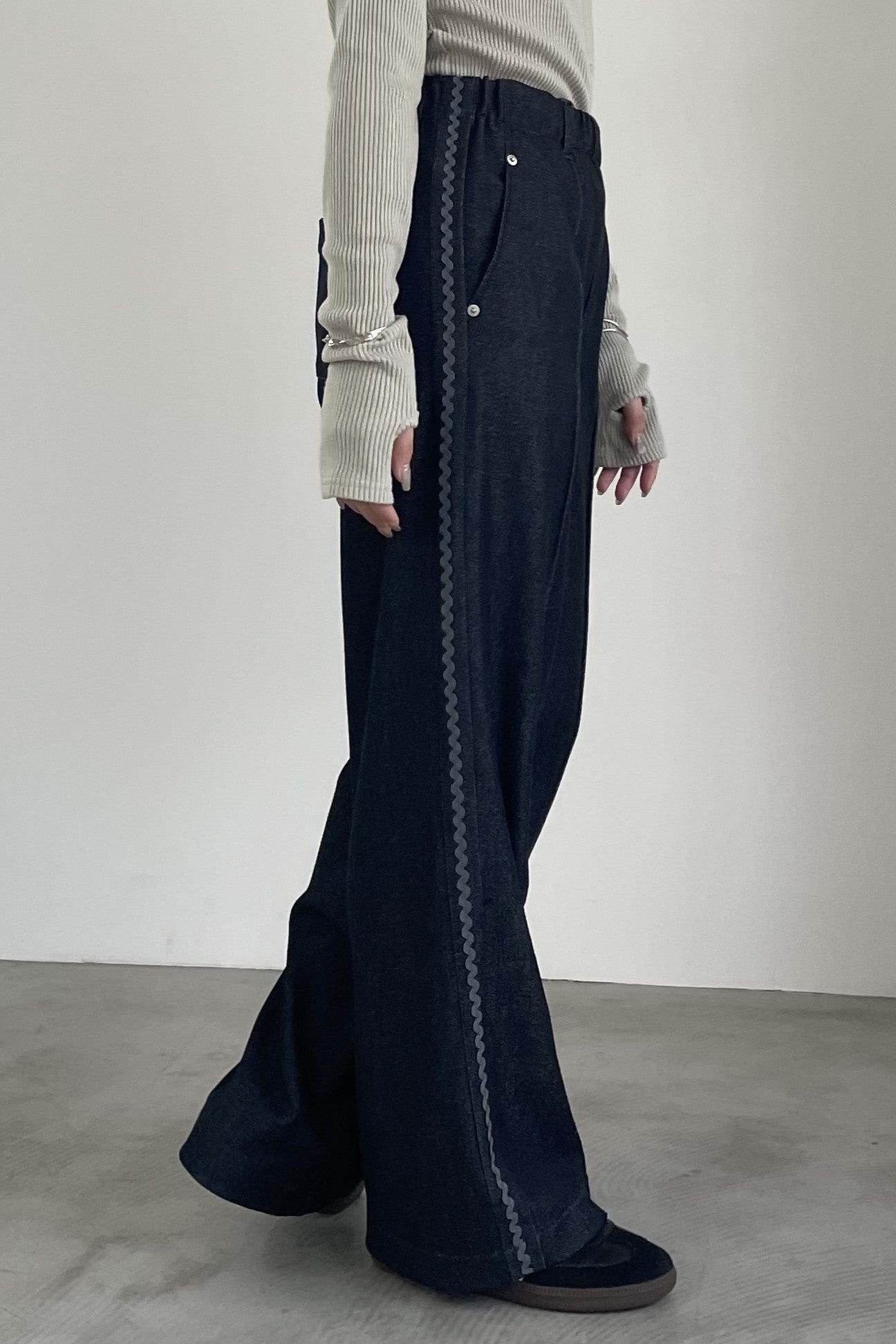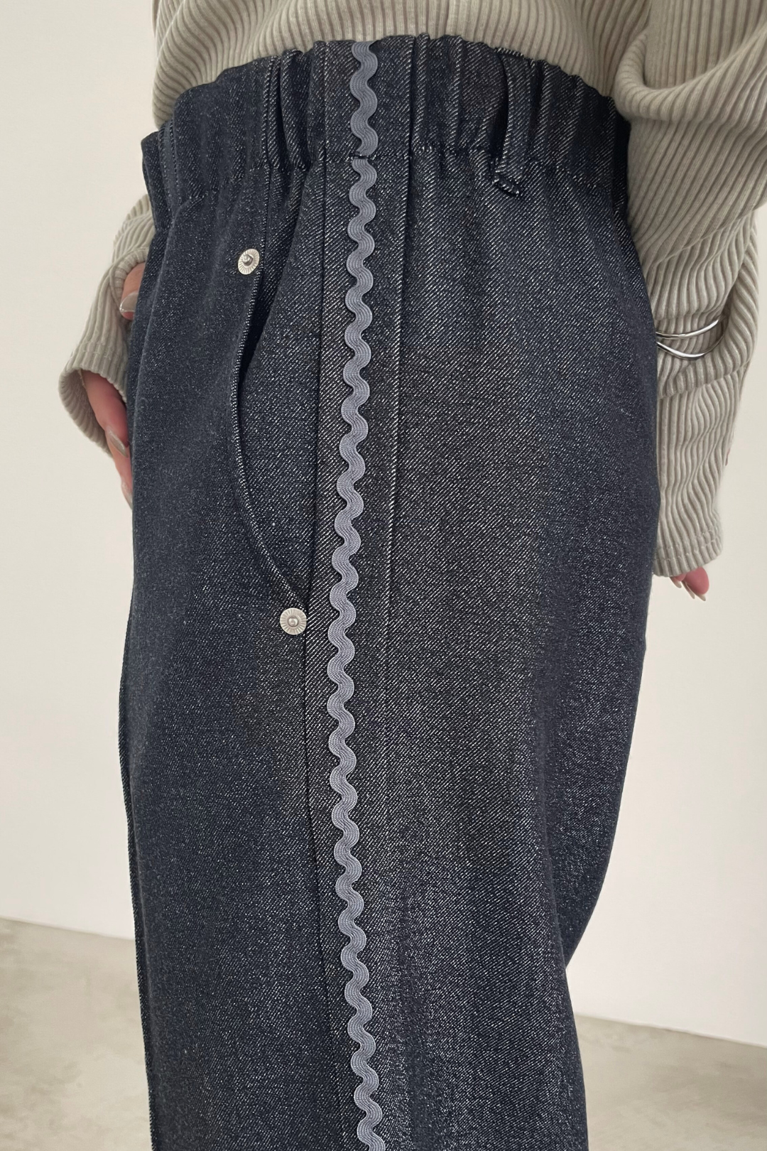 吸湿発熱性のある、デニムライクなツイル素材を使用した、スラックスパンツ。サイドにウェーブモチーフのラインを施し、一味違うラインパンツに仕上げました。ウエストは総ゴム仕様で、素材自体が4WAYストレッチなので履き心地も抜群です。見た目はスラックスなのにデニムのカジュアルさもあり、オンオフどちらも使っていただけるパンツです。
