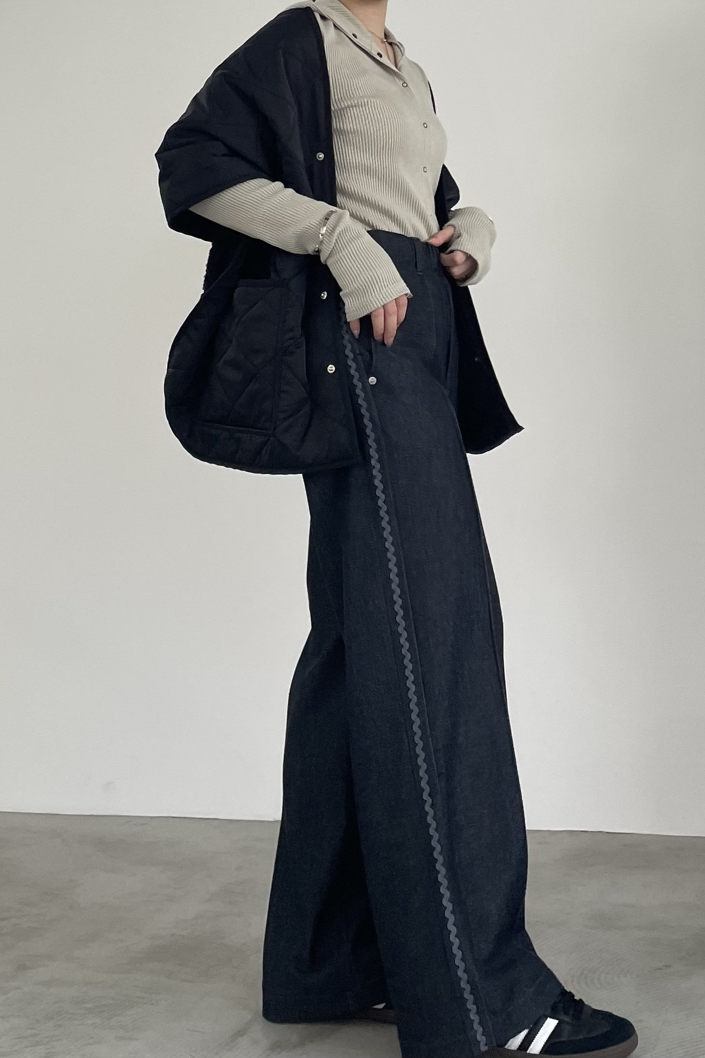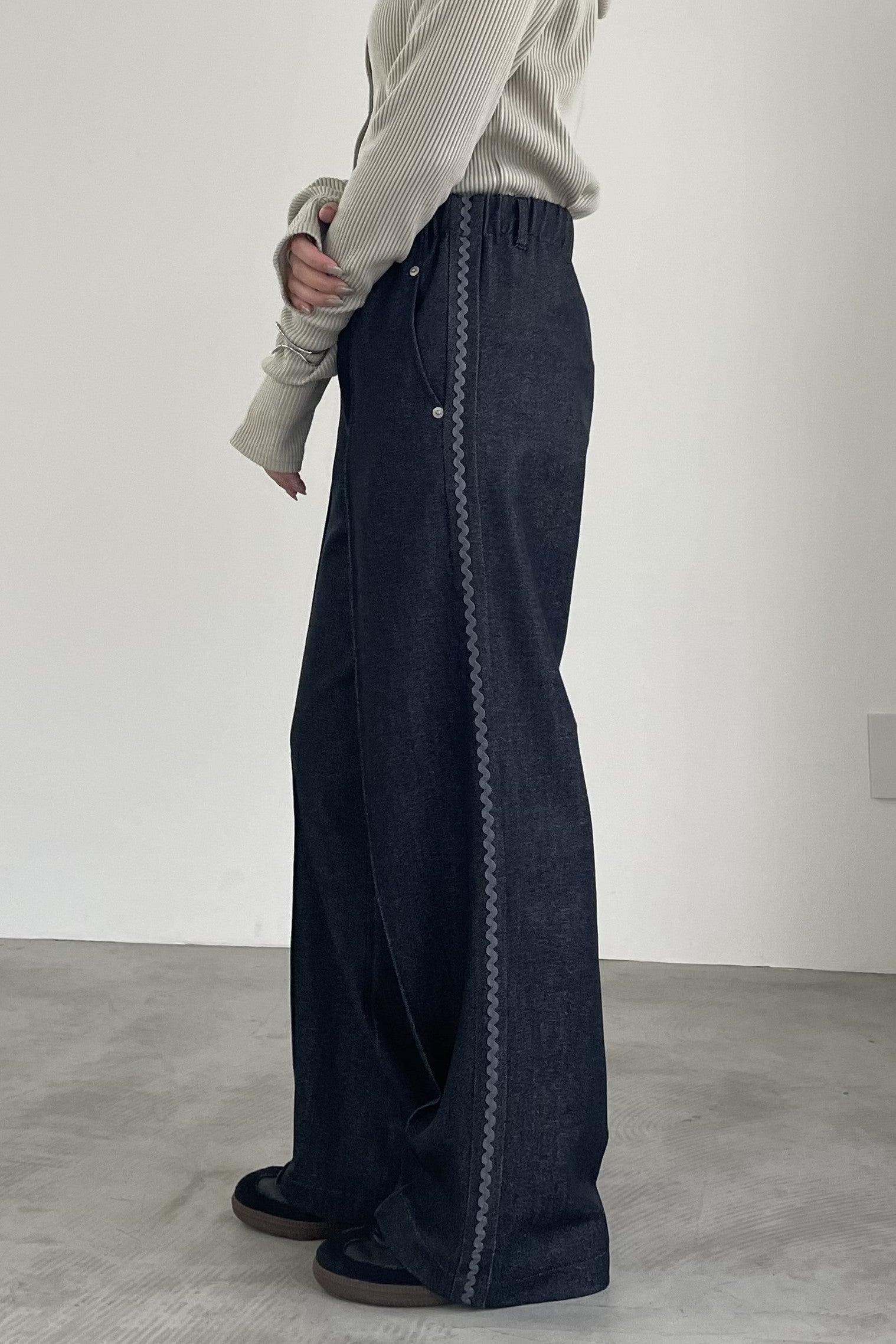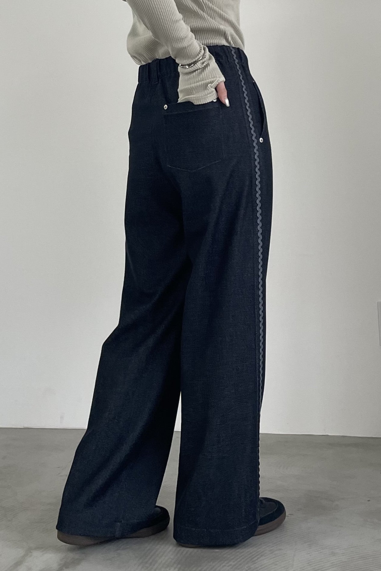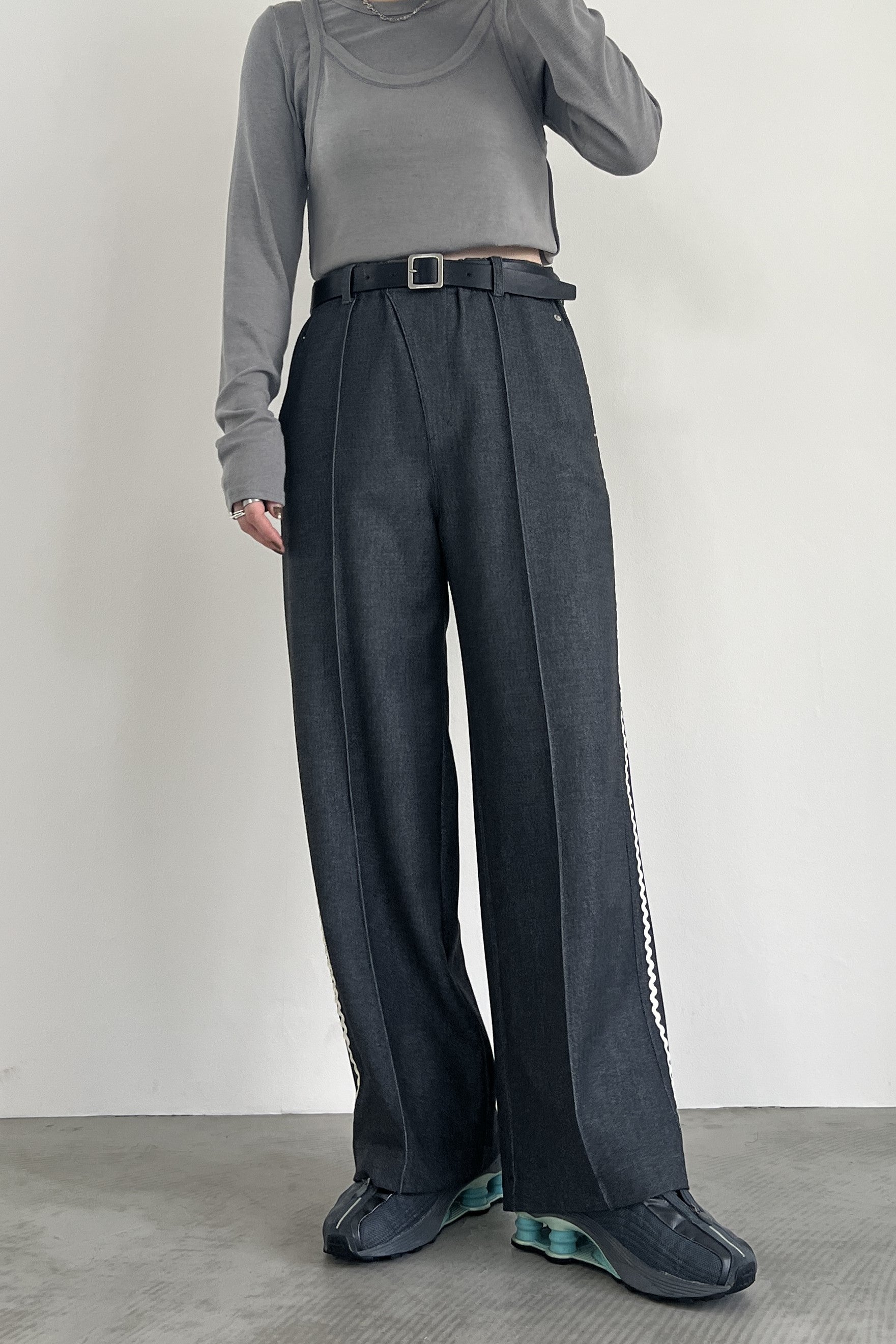 吸湿発熱性のある、デニムライクなツイル素材を使用した、スラックスパンツ。サイドにウェーブモチーフのラインを施し、一味違うラインパンツに仕上げました。ウエストは総ゴム仕様で、素材自体が4WAYストレッチなので履き心地も抜群です。見た目はスラックスなのにデニムのカジュアルさもあり、オンオフどちらも使っていただけるパンツです。