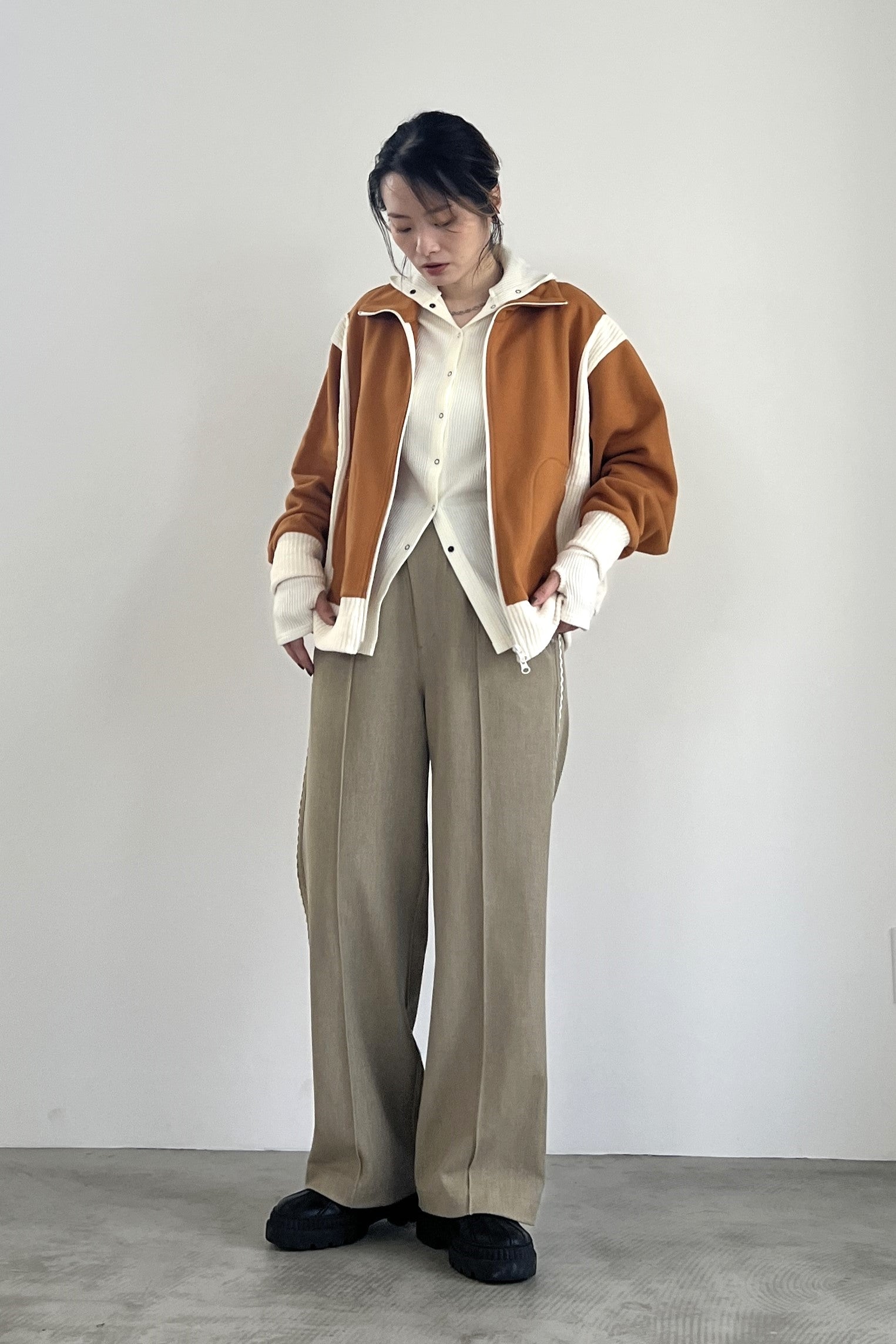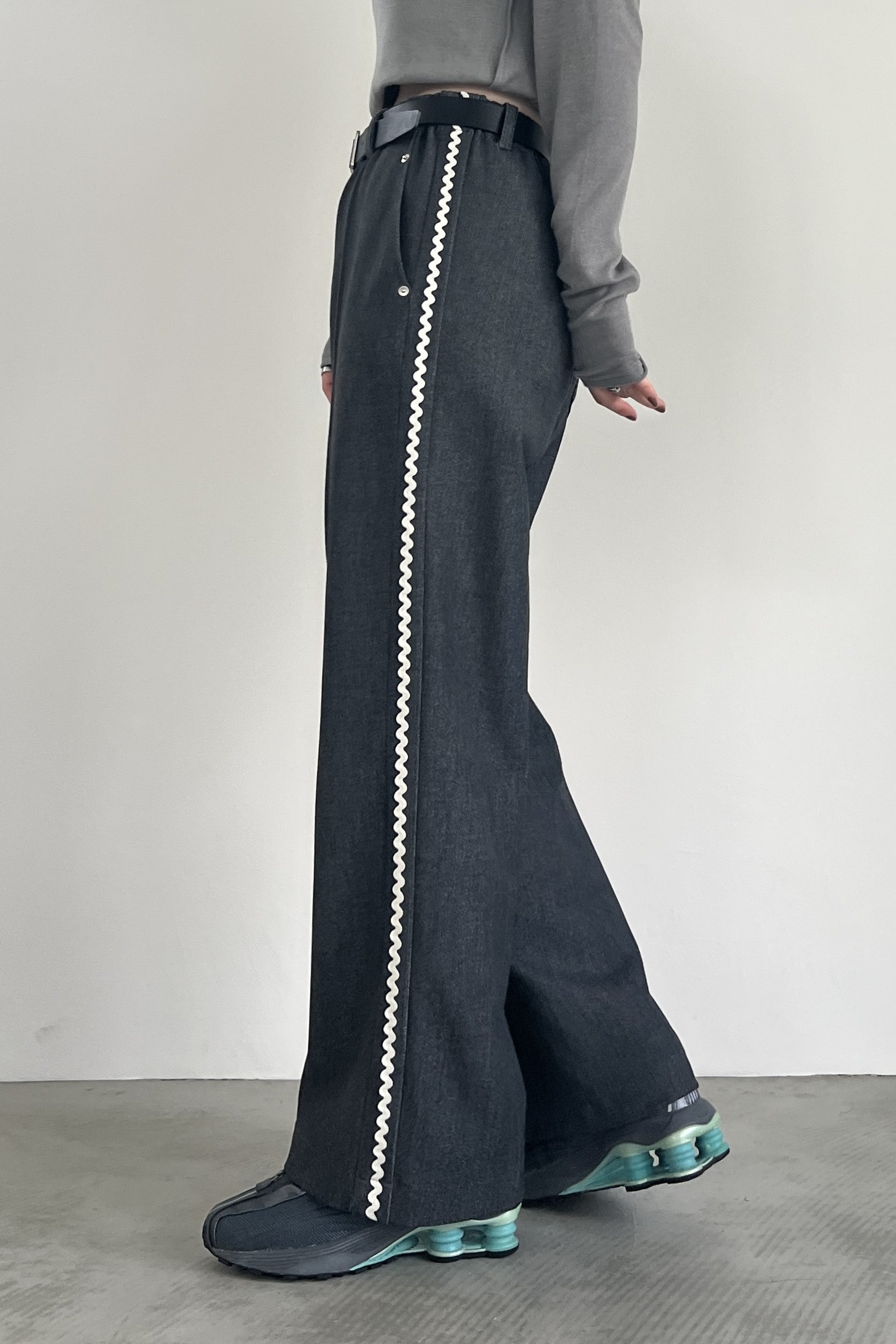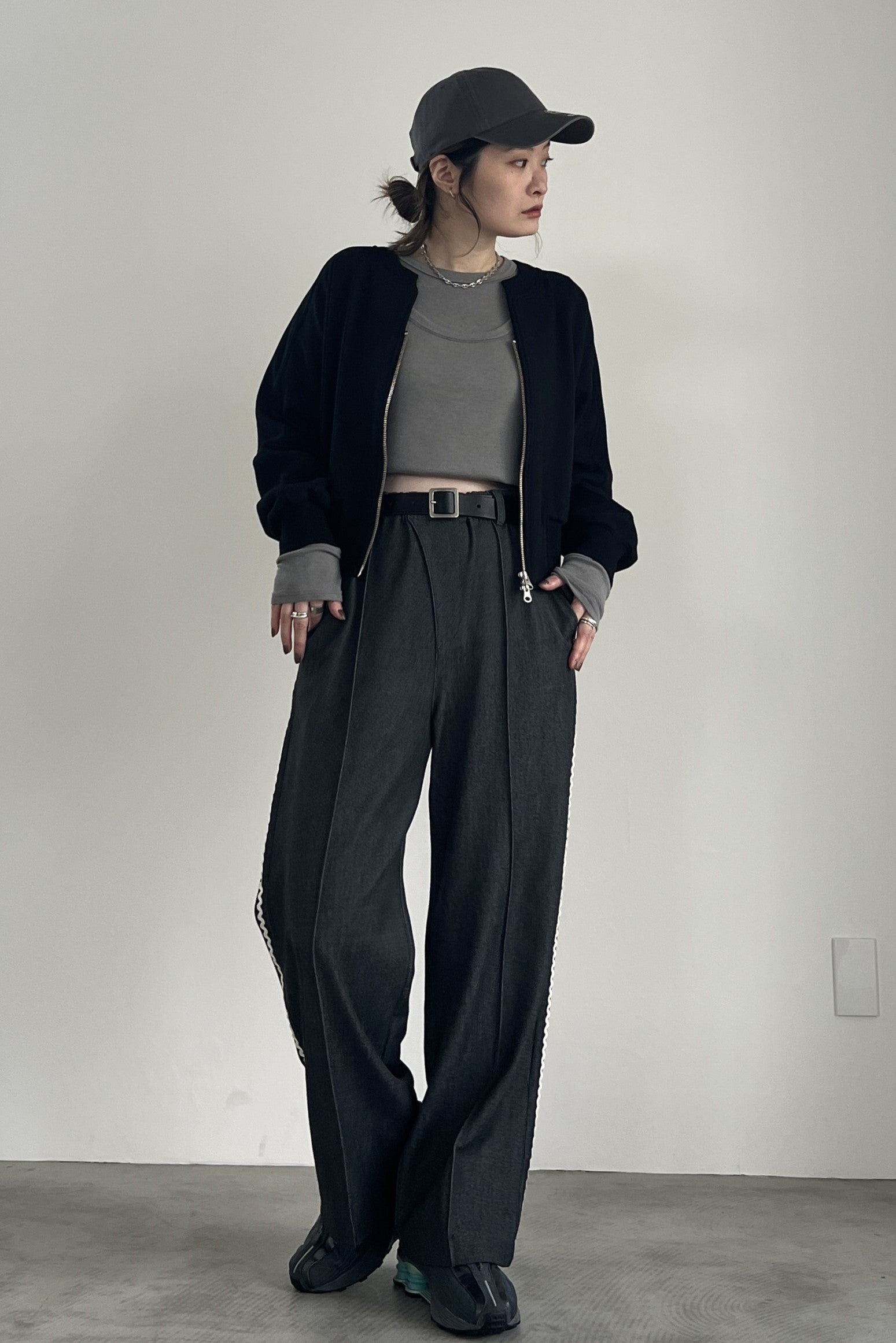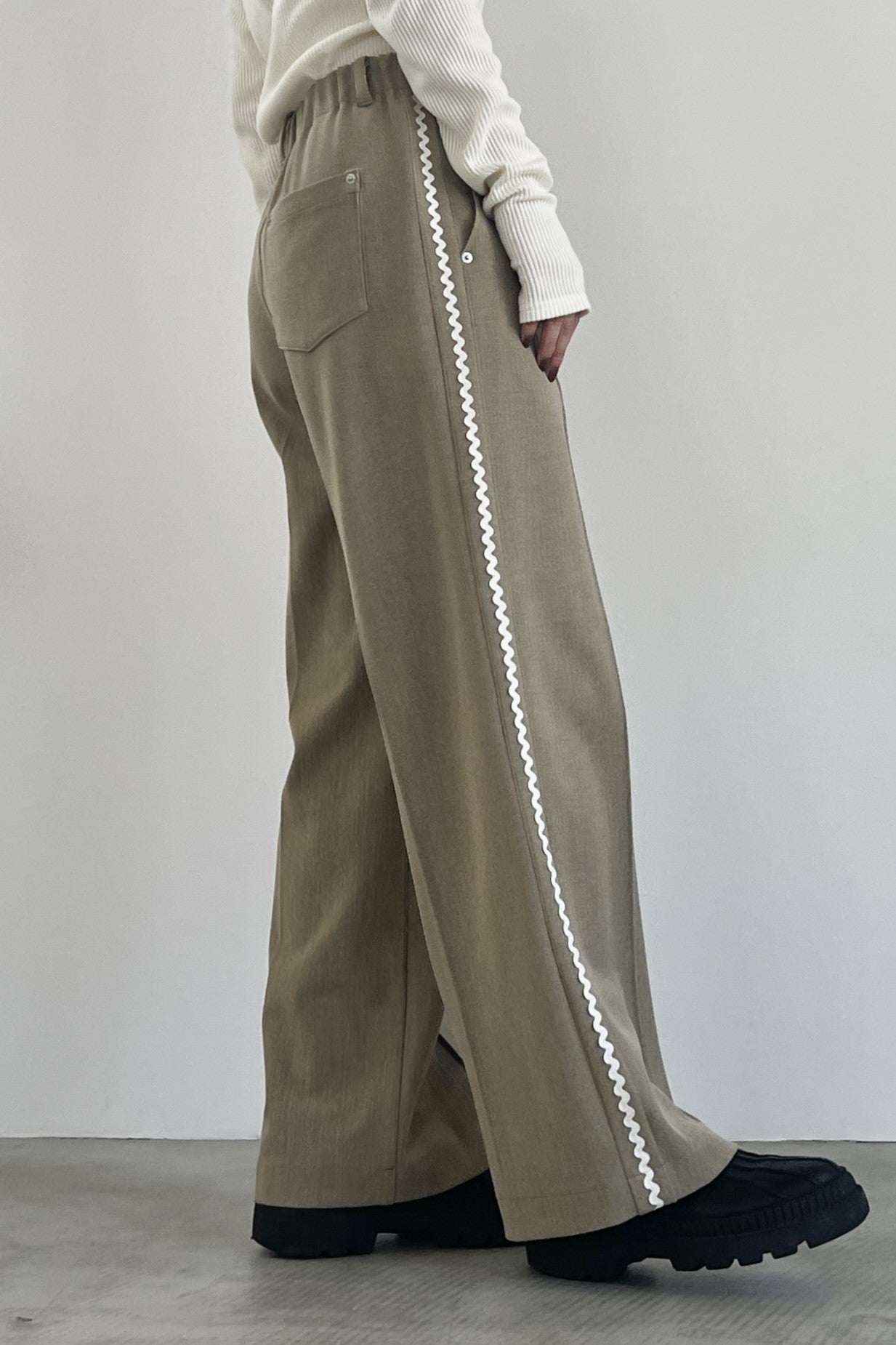吸湿発熱性のある、デニムライクなツイル素材を使用した、スラックスパンツ。サイドにウェーブモチーフのラインを施し、一味違うラインパンツに仕上げました。ウエストは総ゴム仕様で、素材自体が4WAYストレッチなので履き心地も抜群です。見た目はスラックスなのにデニムのカジュアルさもあり、オンオフどちらも使っていただけるパンツです。