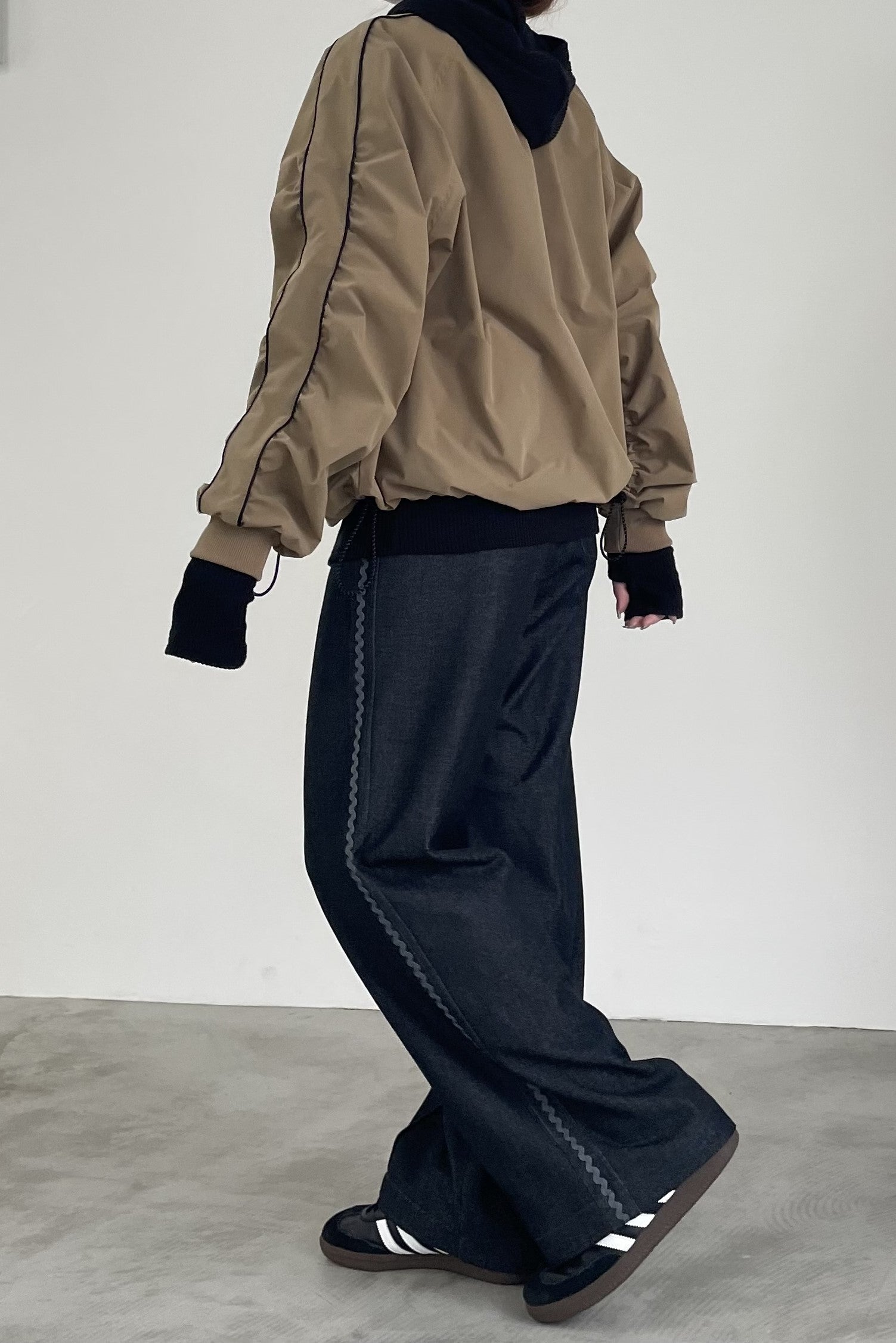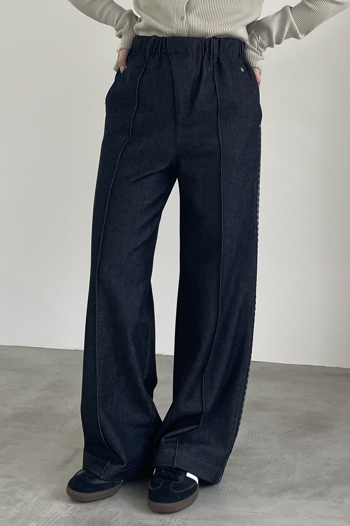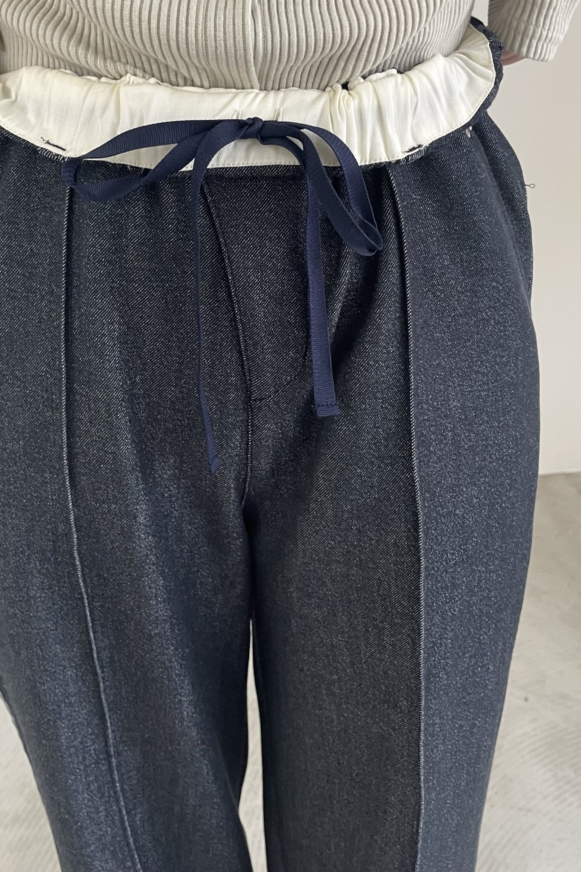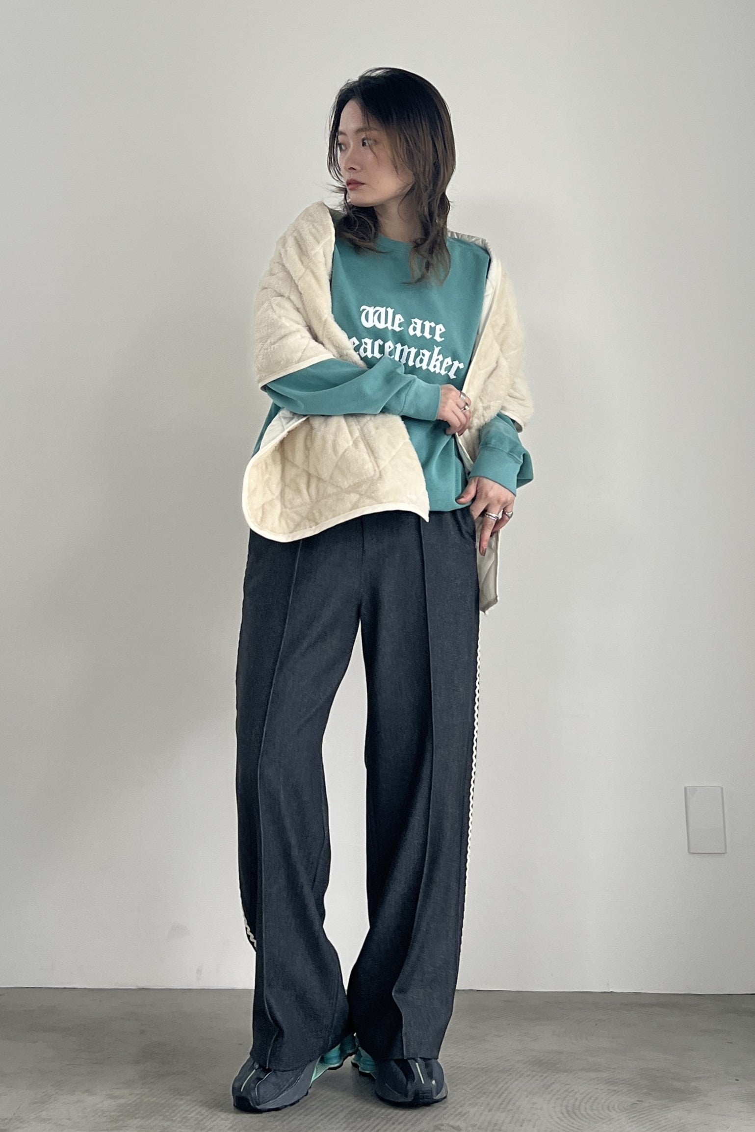 吸湿発熱性のある、デニムライクなツイル素材を使用した、スラックスパンツ。サイドにウェーブモチーフのラインを施し、一味違うラインパンツに仕上げました。ウエストは総ゴム仕様で、素材自体が4WAYストレッチなので履き心地も抜群です。見た目はスラックスなのにデニムのカジュアルさもあり、オンオフどちらも使っていただけるパンツです。