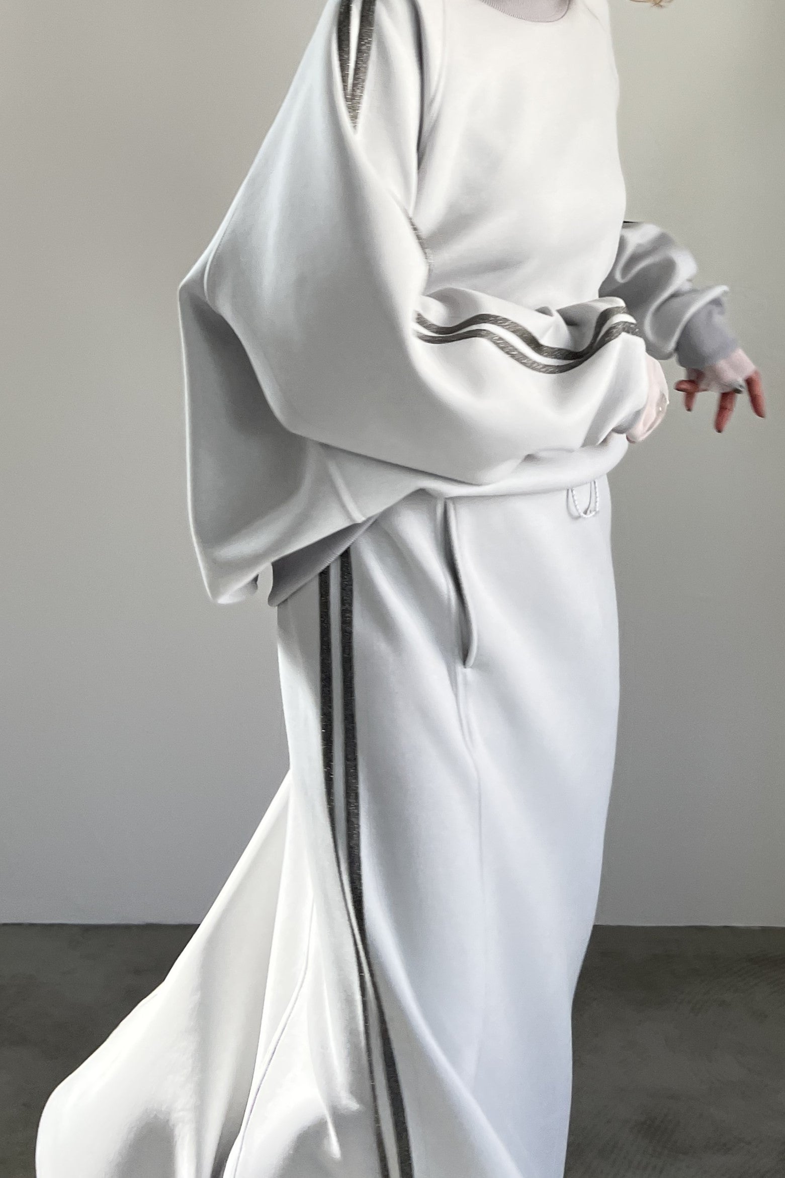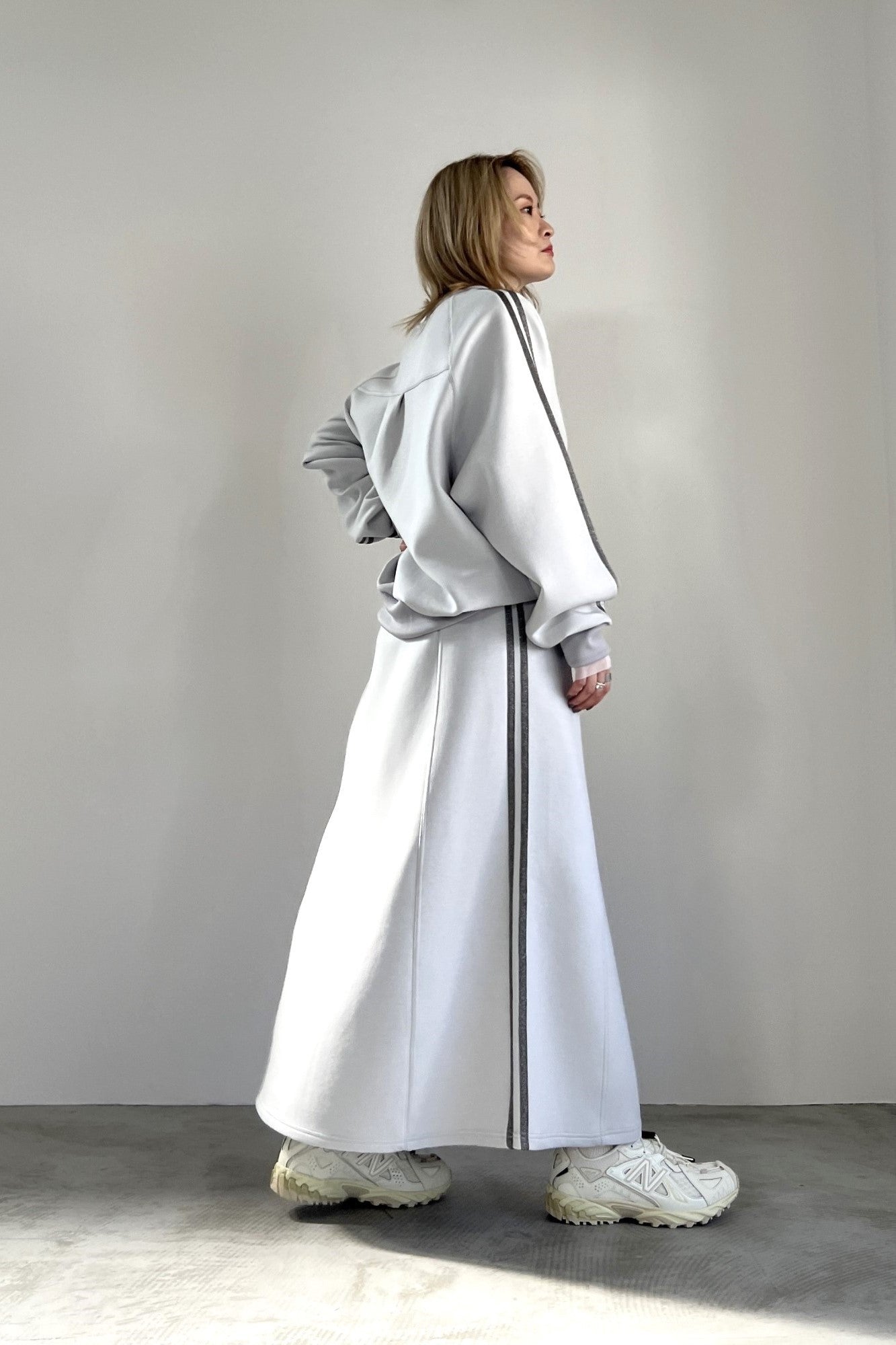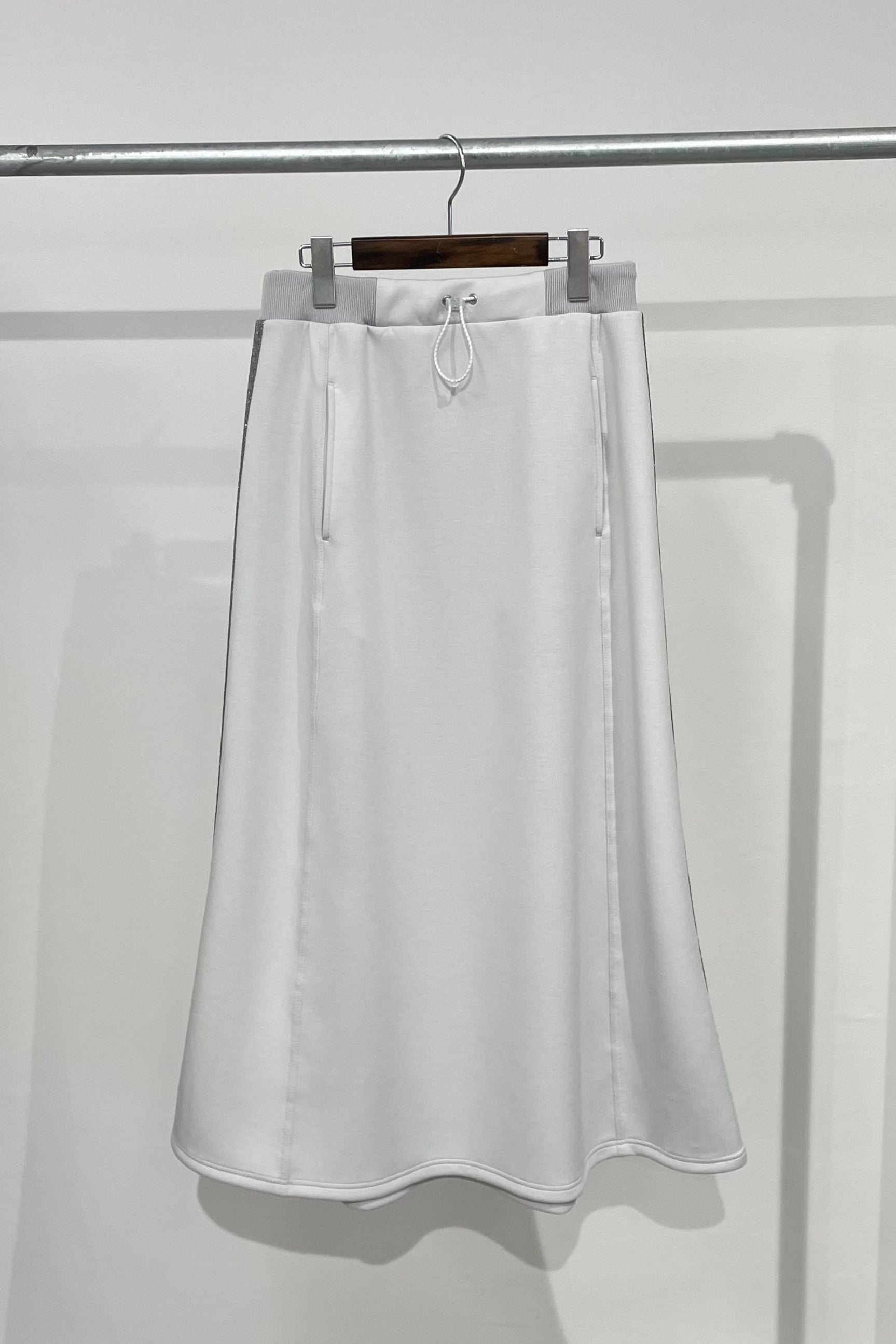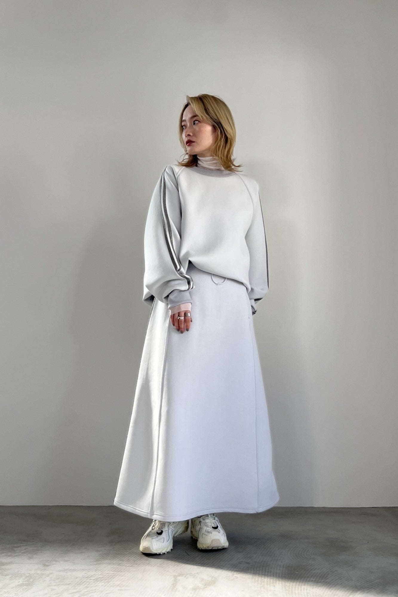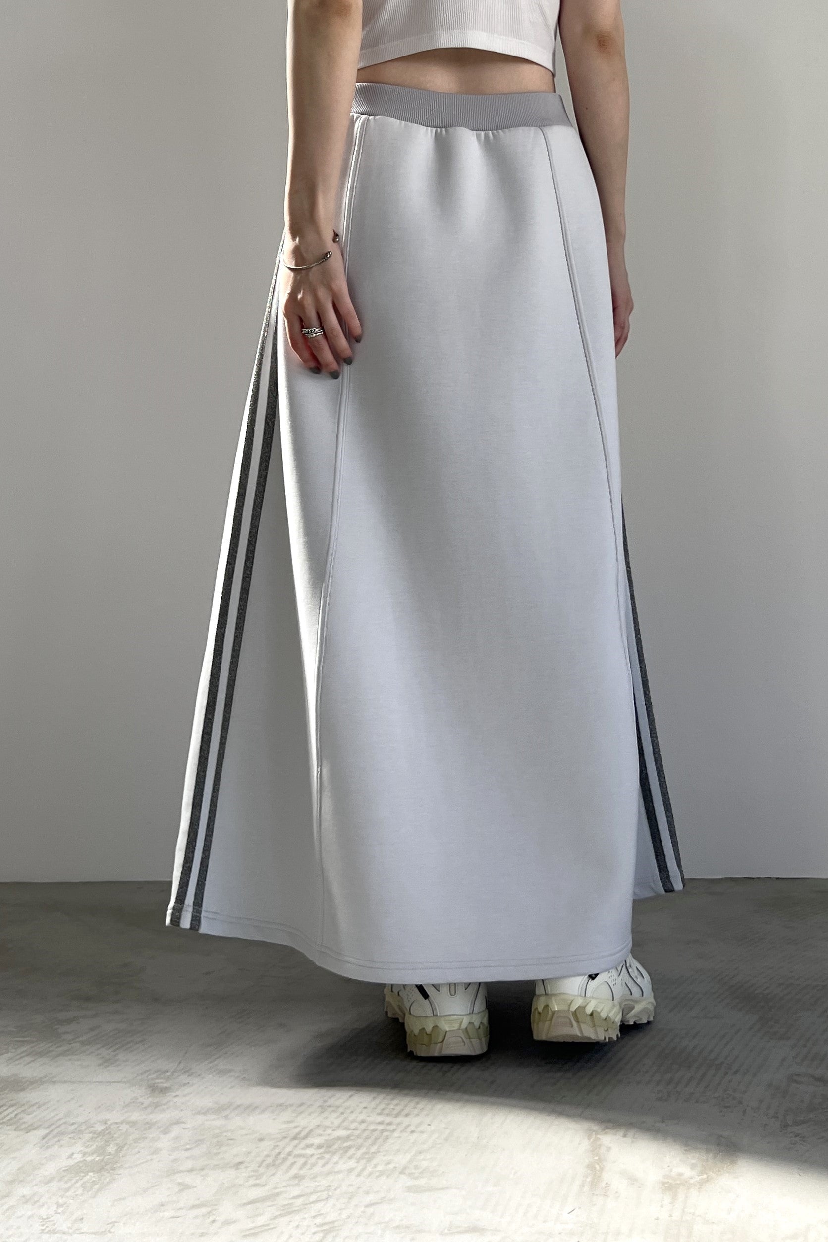ラメ入りサイドラインがスポーティーなボンディングスカート。モチモチとした柔らかな風合いのボンディング素材なので、Aラインシルエットでも広がり過ぎず、切り替えを作る事で細見えにも拘りました。同素材のプルオーバーとセットアップで着用もおすすめ。