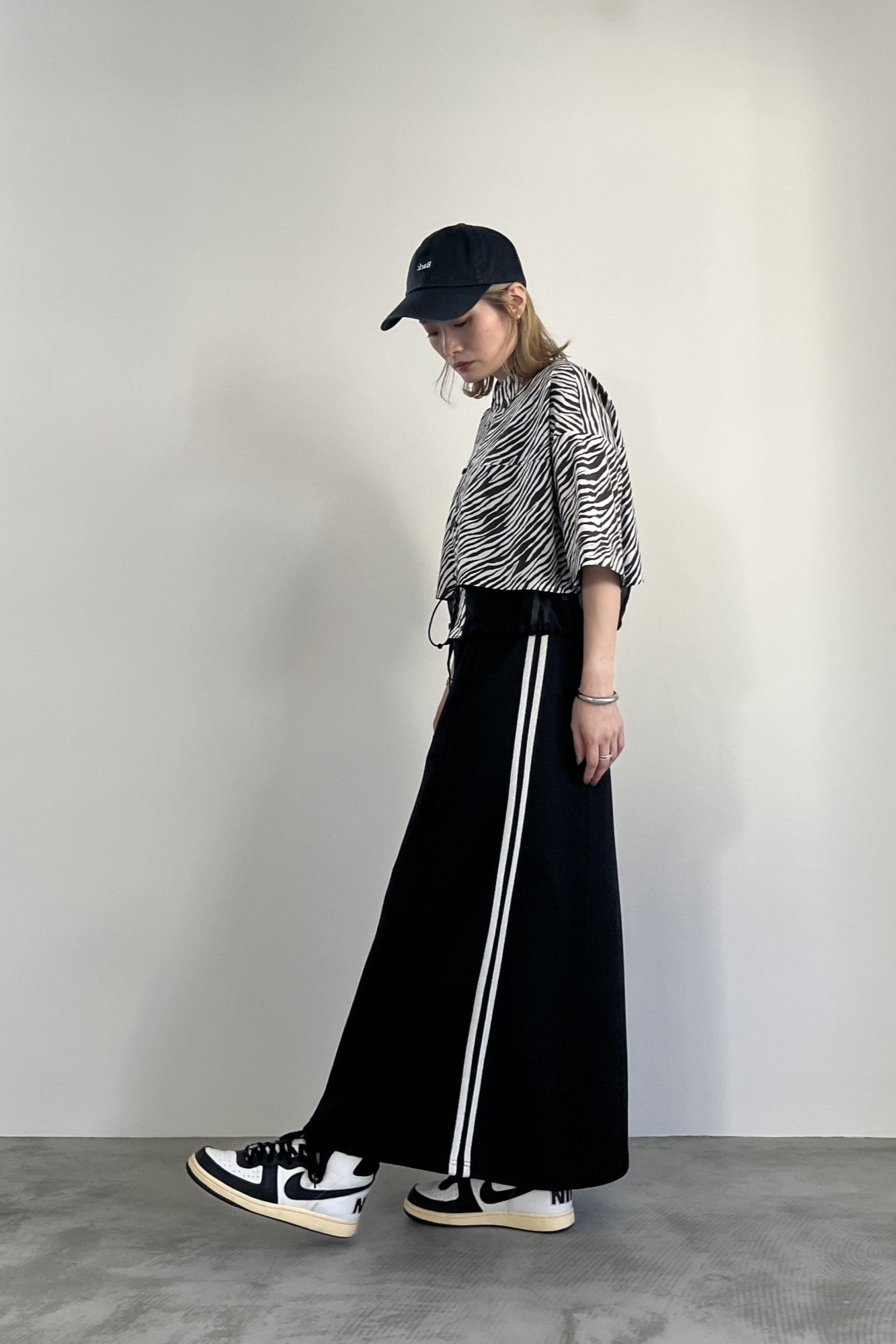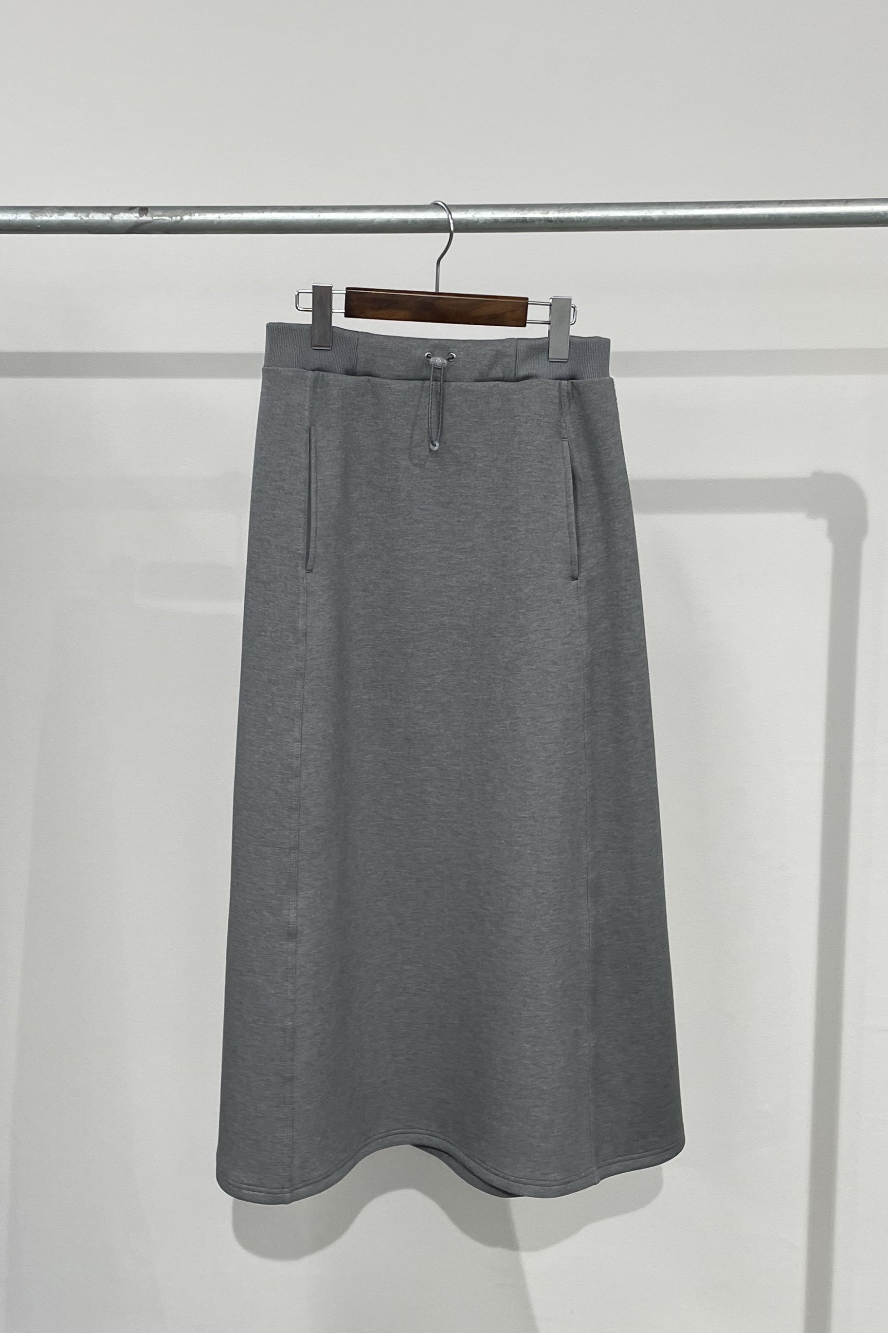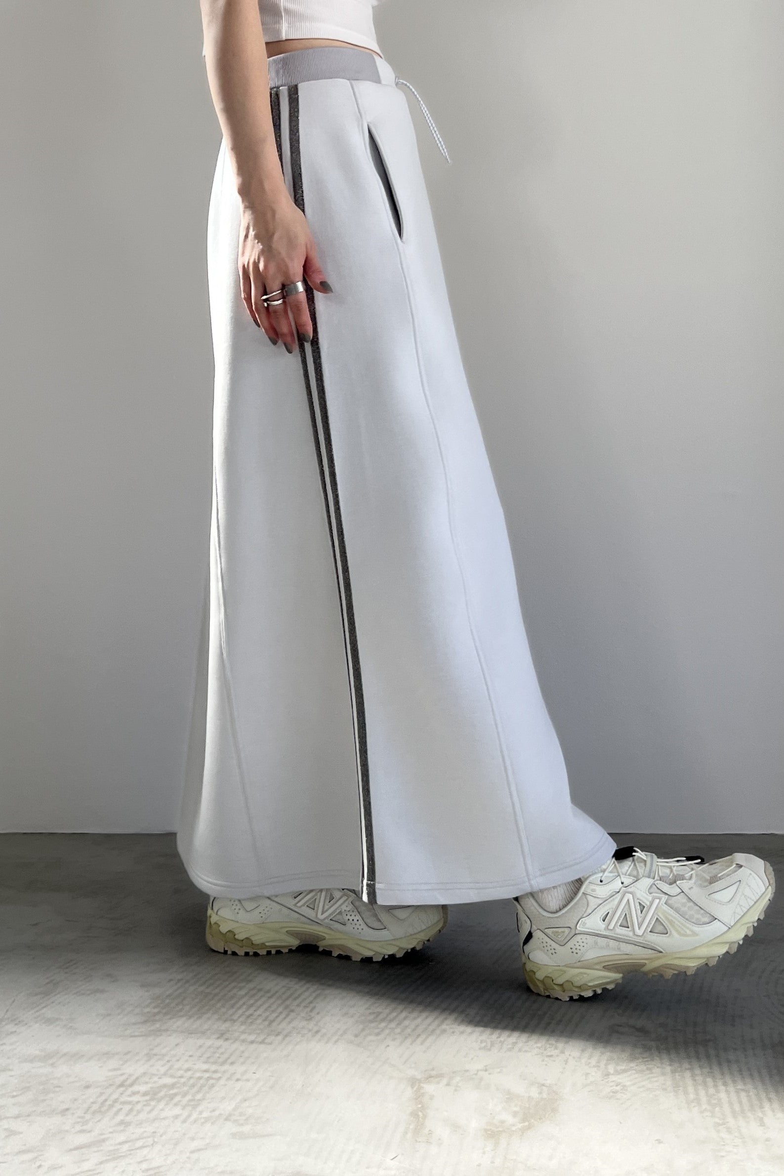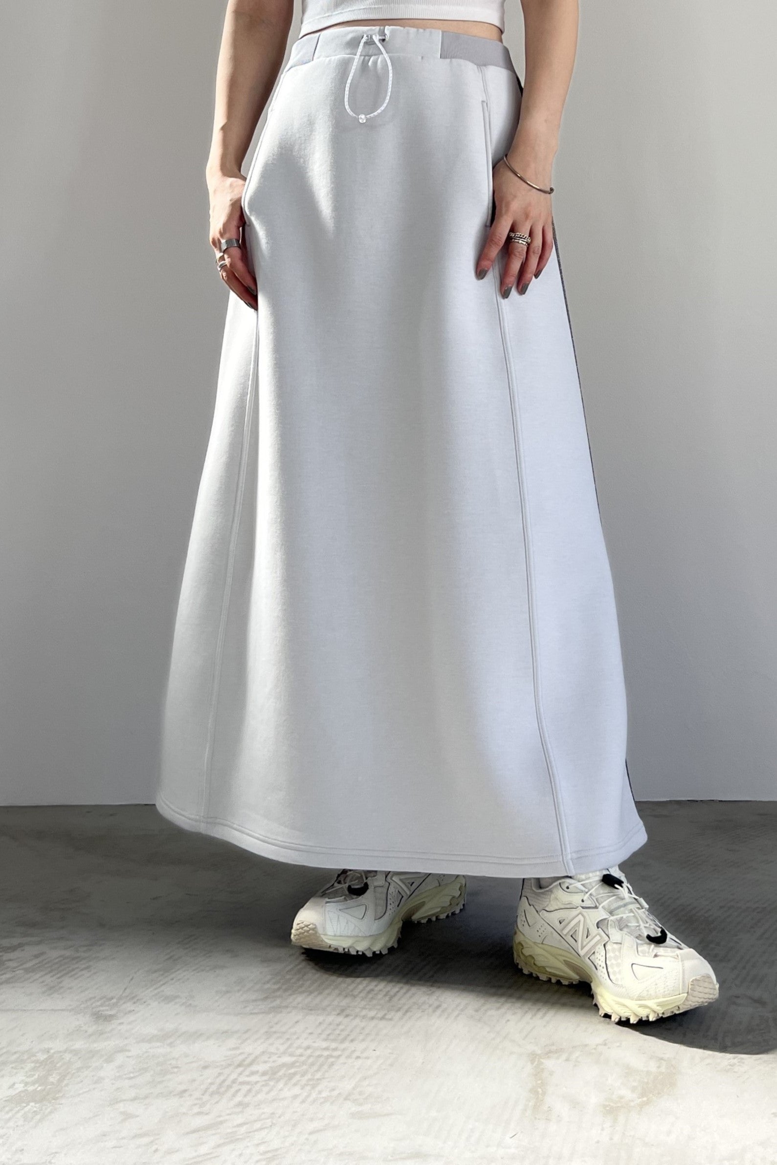 ラメ入りサイドラインがスポーティーなボンディングスカート。モチモチとした柔らかな風合いのボンディング素材なので、Aラインシルエットでも広がり過ぎず、切り替えを作る事で細見えにも拘りました。同素材のプルオーバーとセットアップで着用もおすすめ。