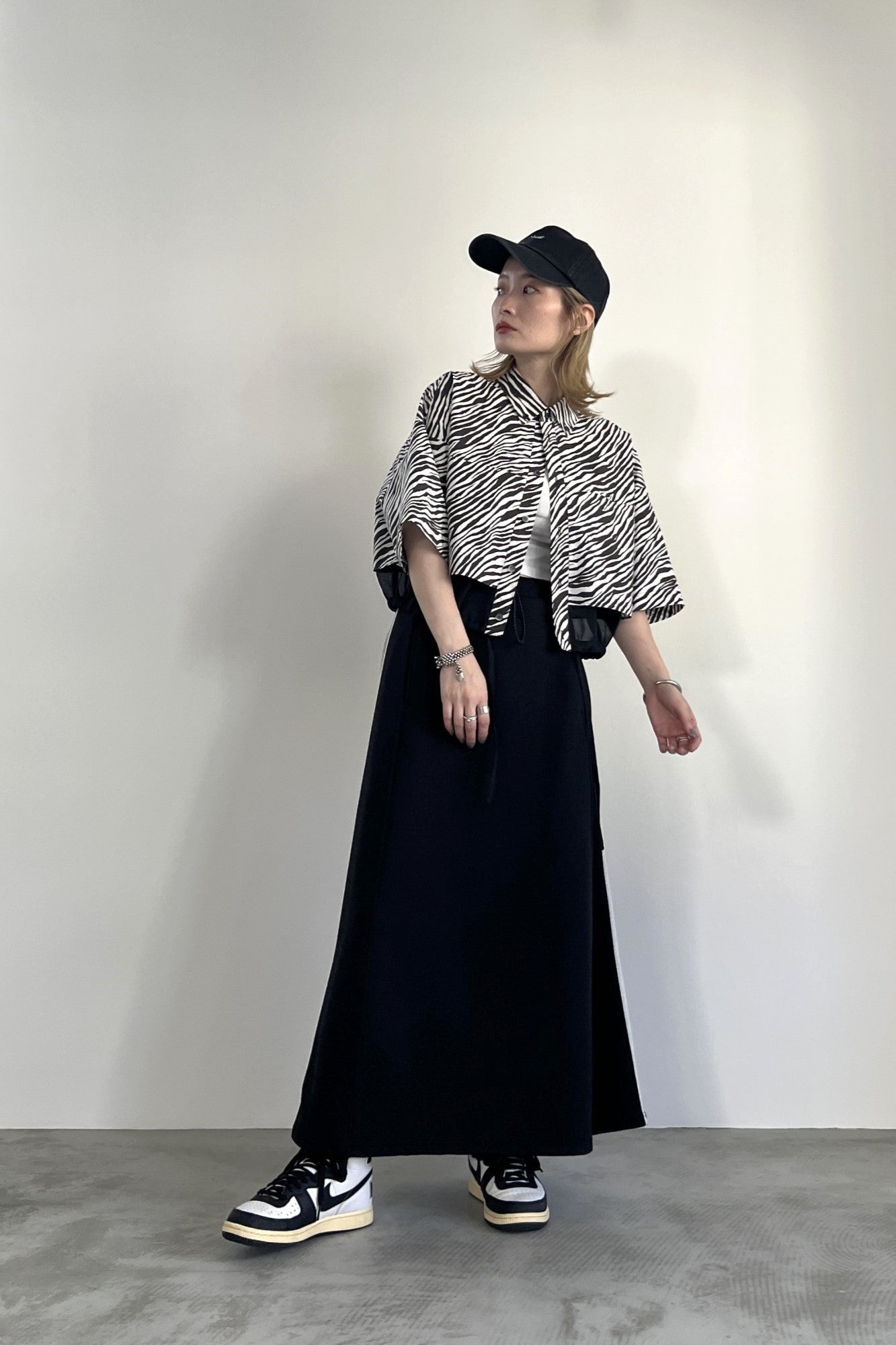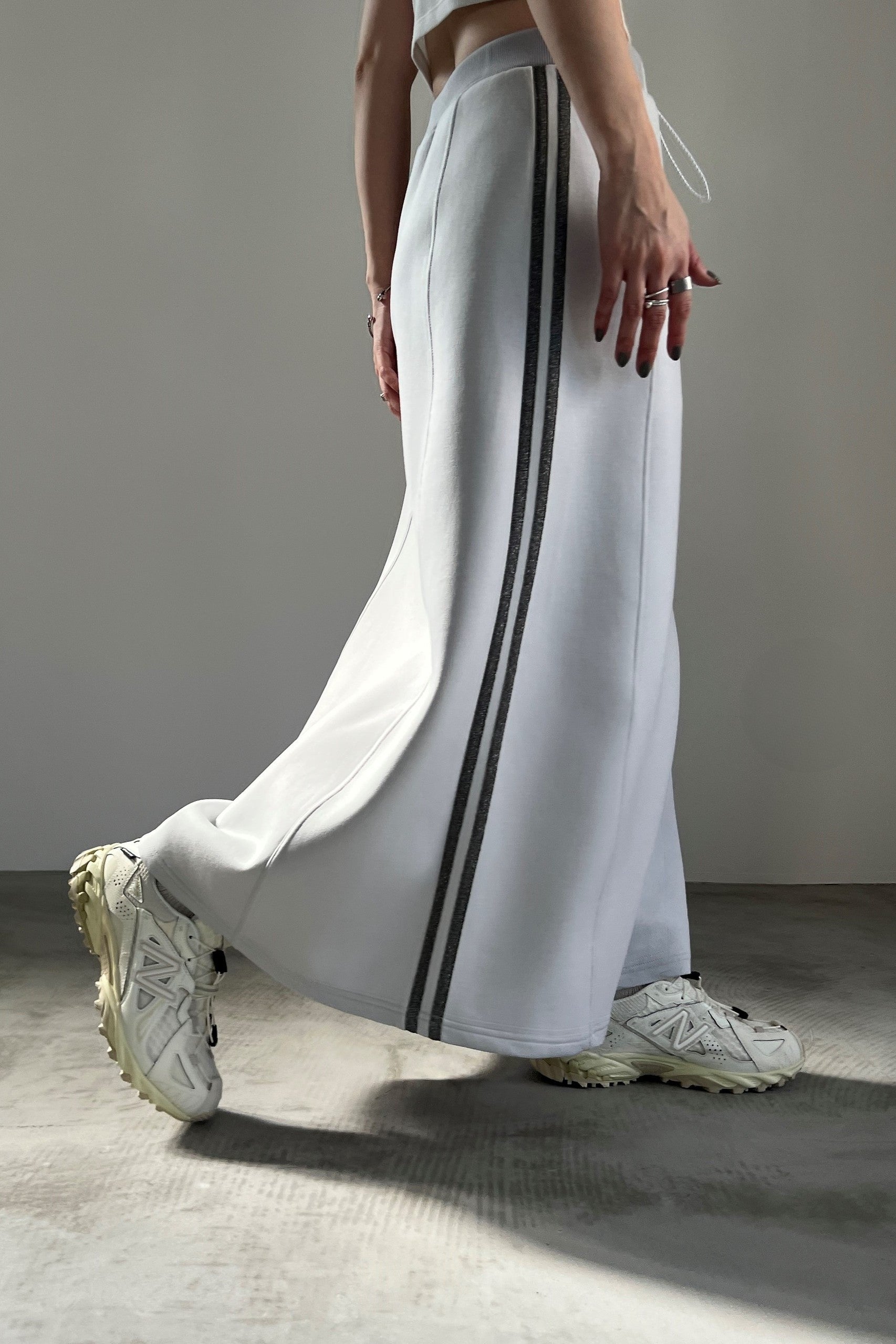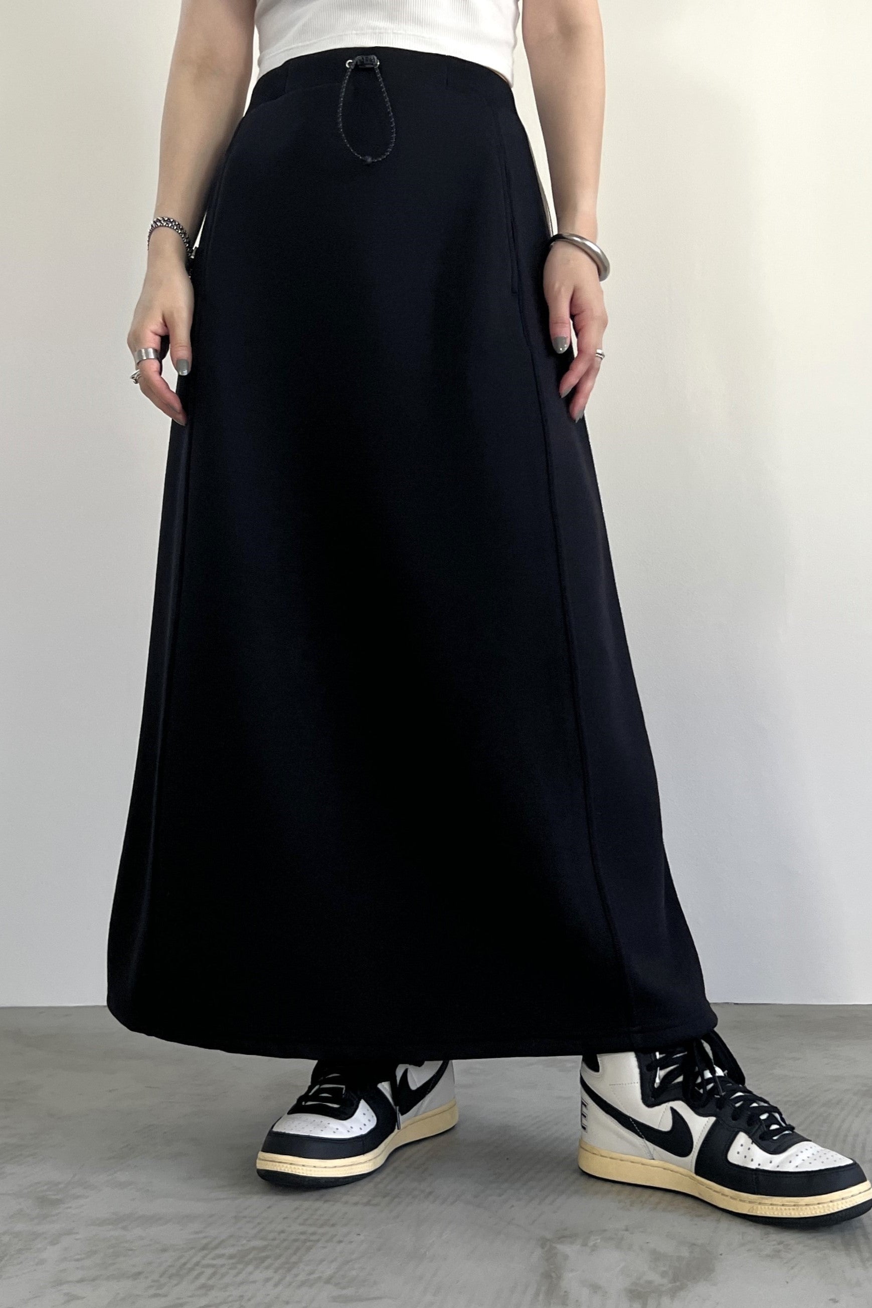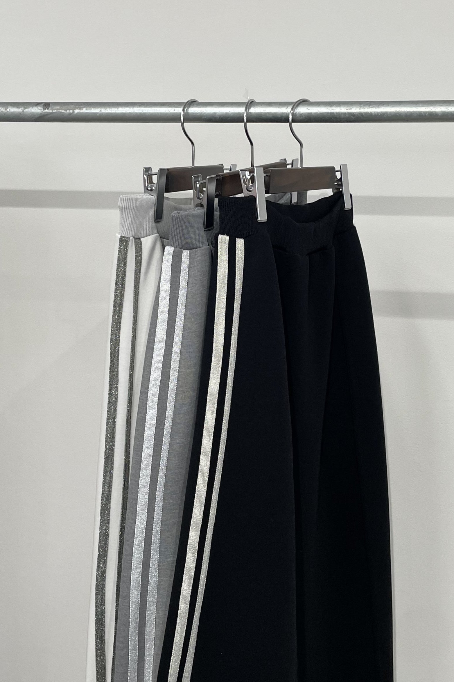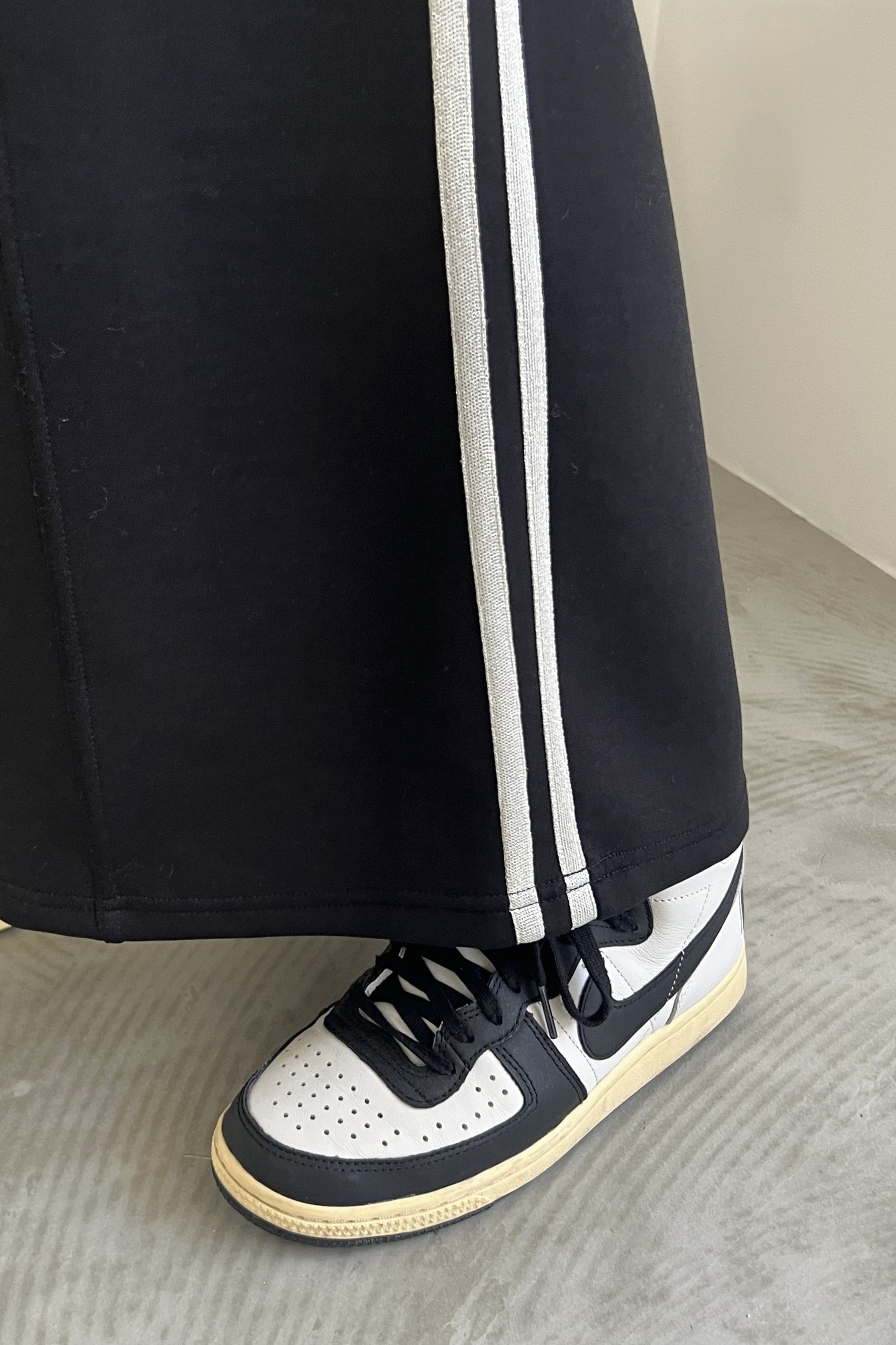 ラメ入りサイドラインがスポーティーなボンディングスカート。モチモチとした柔らかな風合いのボンディング素材なので、Aラインシルエットでも広がり過ぎず、切り替えを作る事で細見えにも拘りました。同素材のプルオーバーとセットアップで着用もおすすめ。