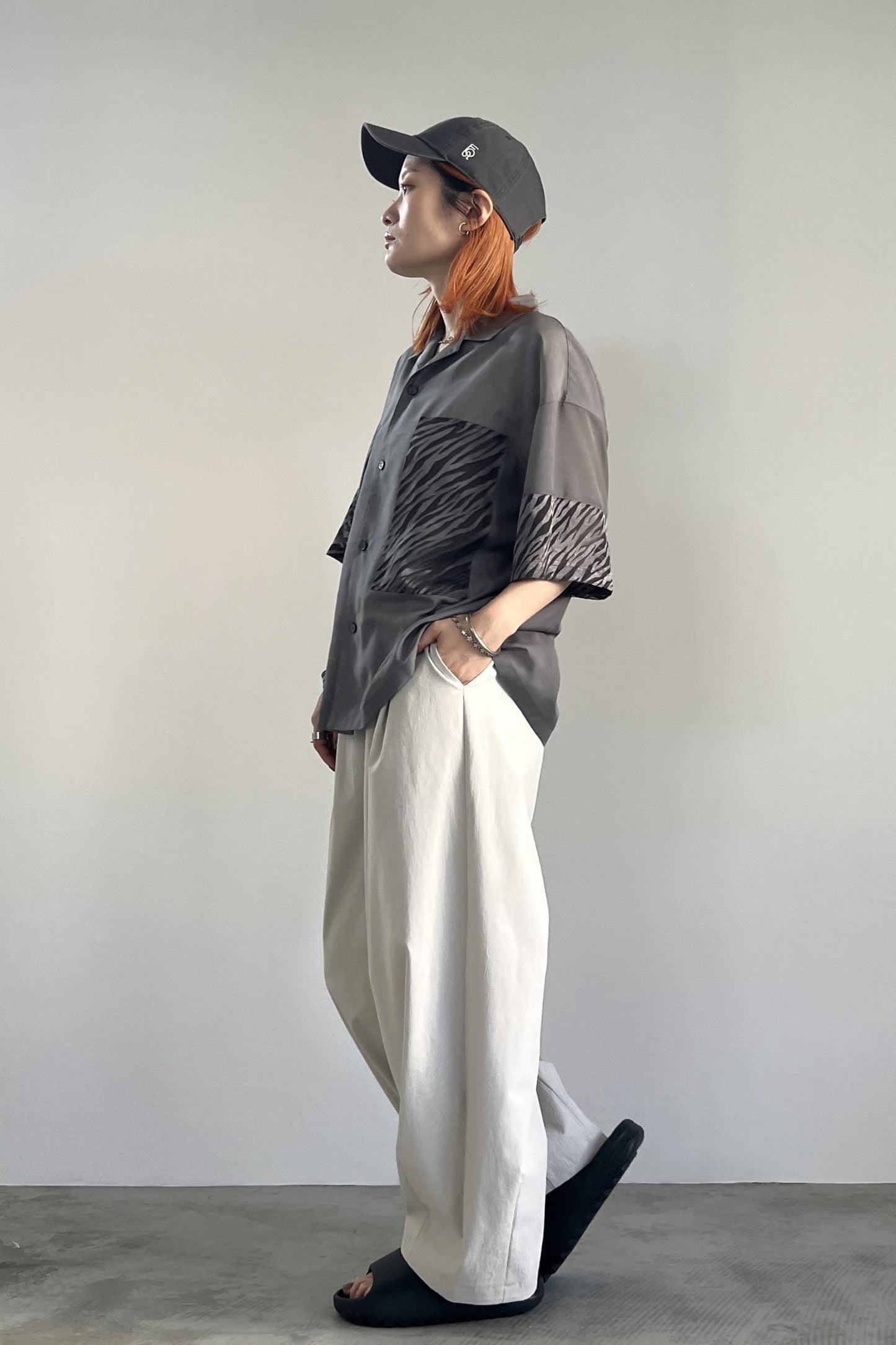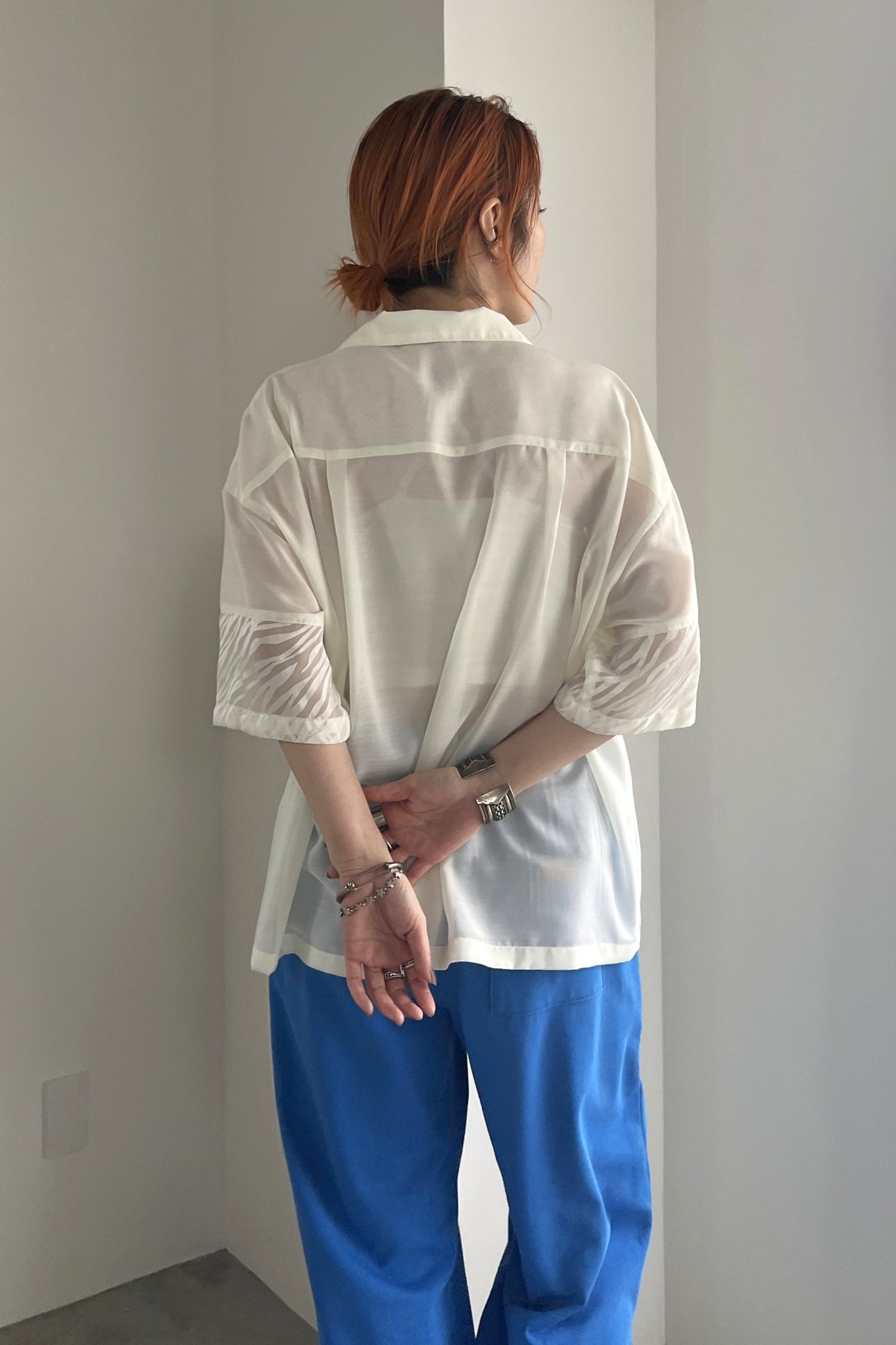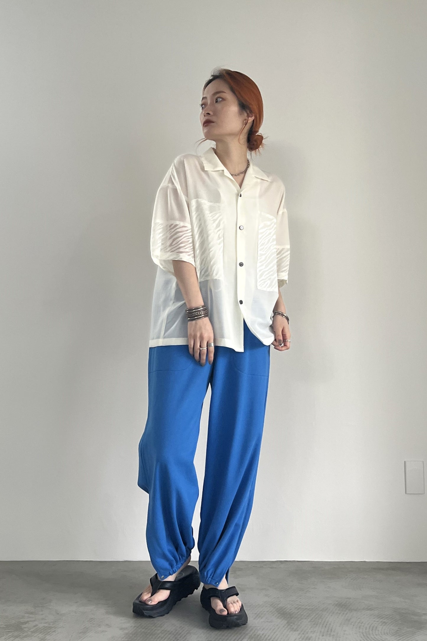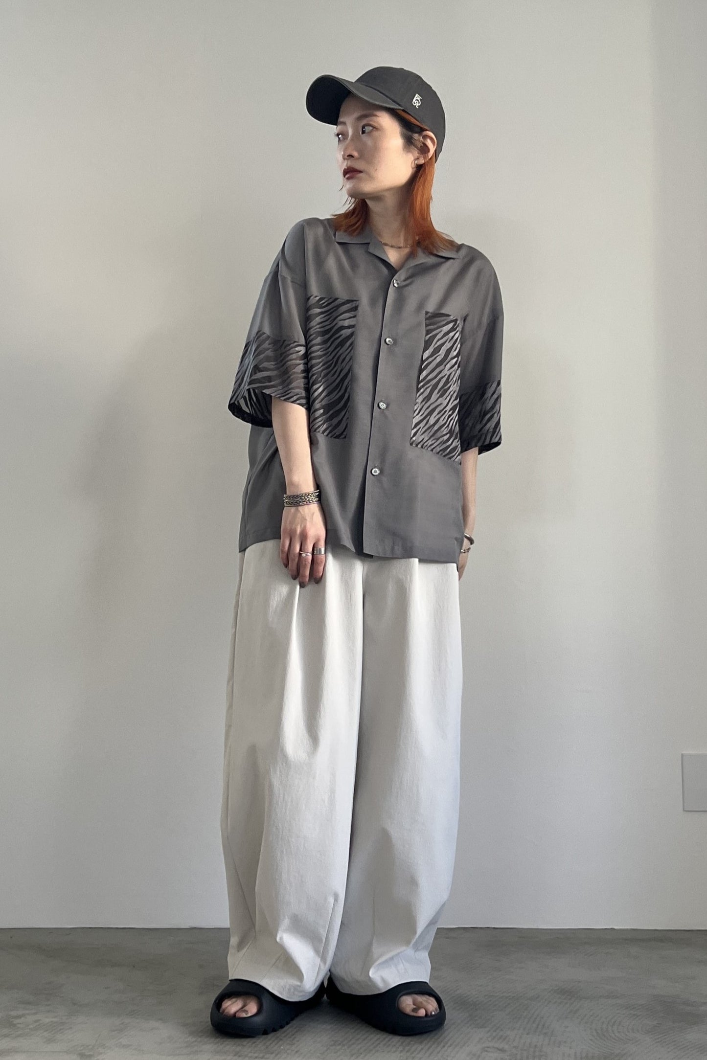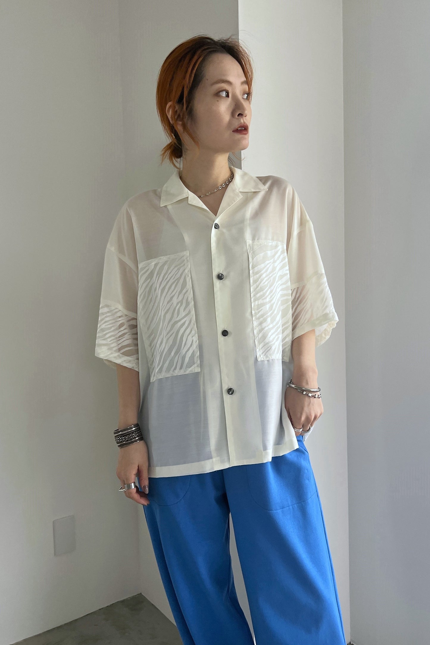 大きなポケットとゼブラ柄のジャガード生地がポイントの開襟シャツ。メンズライクなシルエットですが、程良い透け感と落ち感のある素材で女性らしさをプラスしてくれます。ポリエステル素材なのでシワになりにくいのも嬉しいポイント。