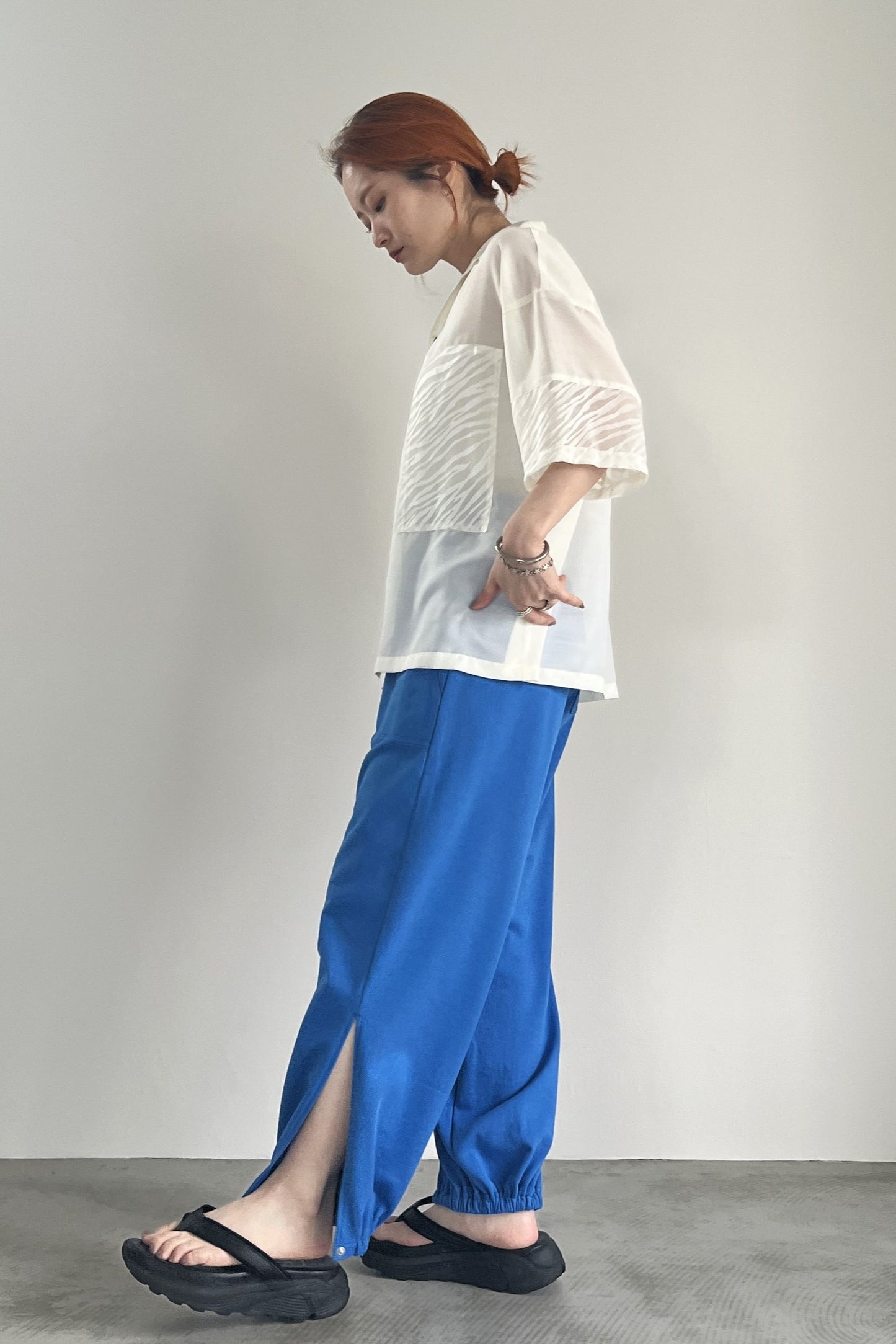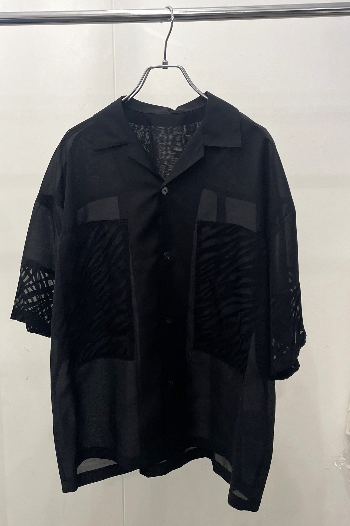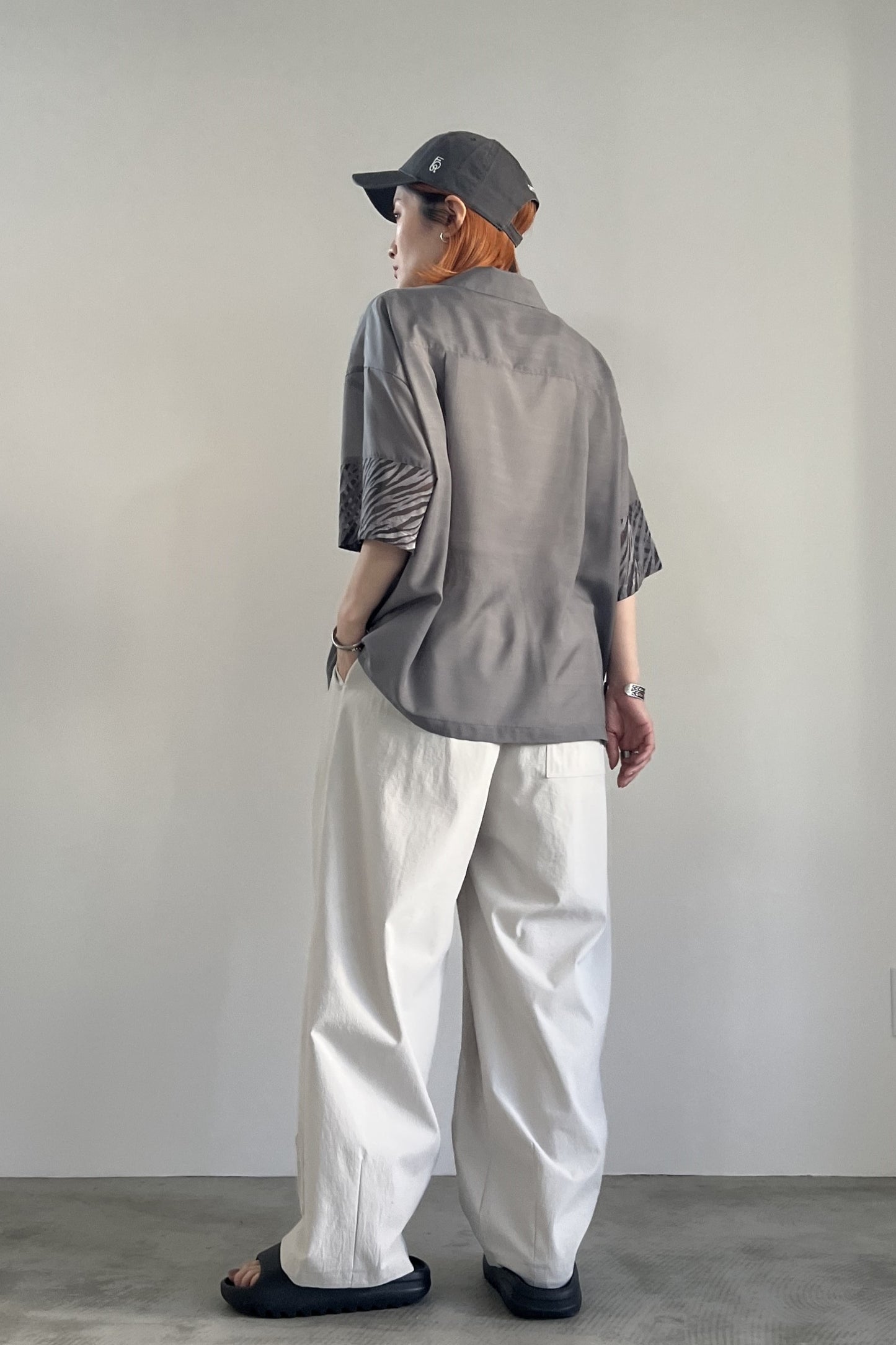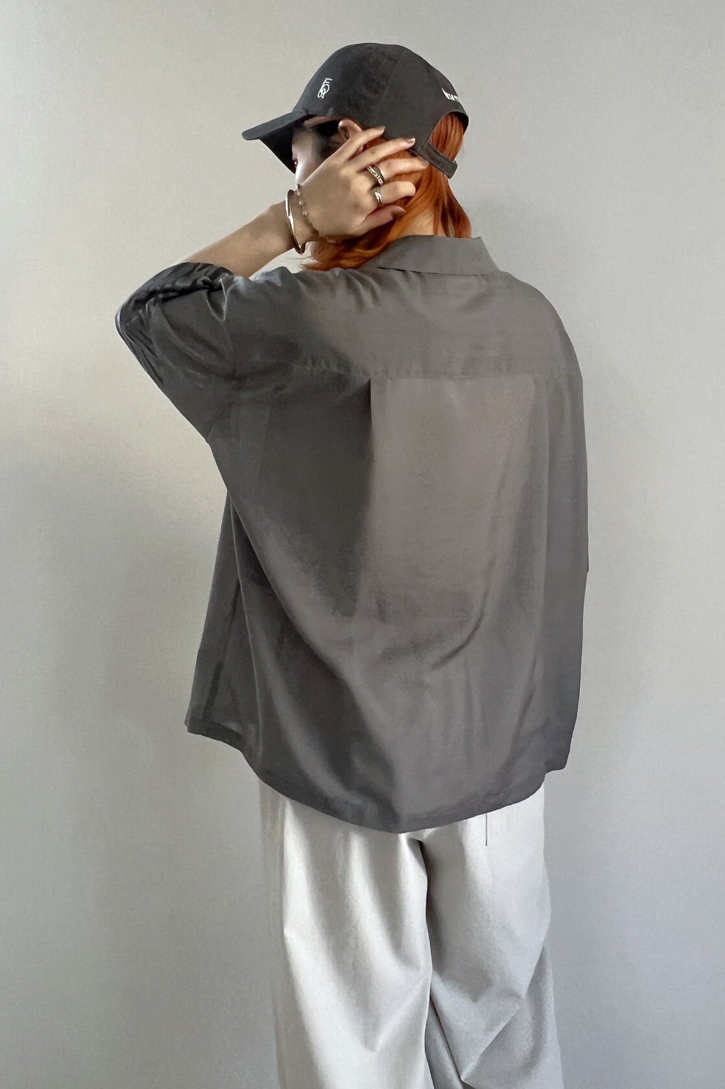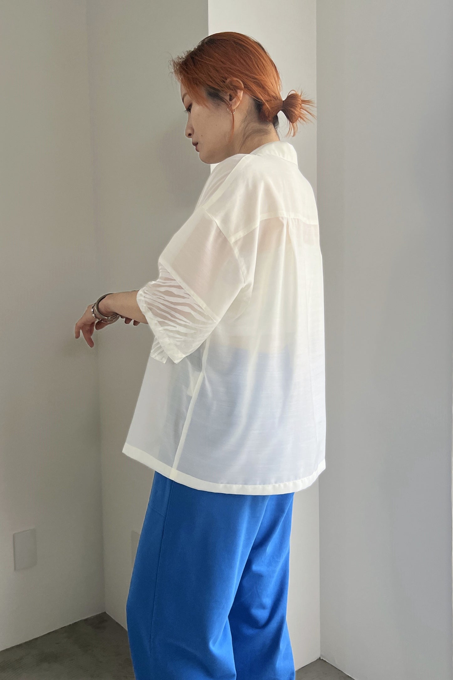 大きなポケットとゼブラ柄のジャガード生地がポイントの開襟シャツ。メンズライクなシルエットですが、程良い透け感と落ち感のある素材で女性らしさをプラスしてくれます。ポリエステル素材なのでシワになりにくいのも嬉しいポイント。