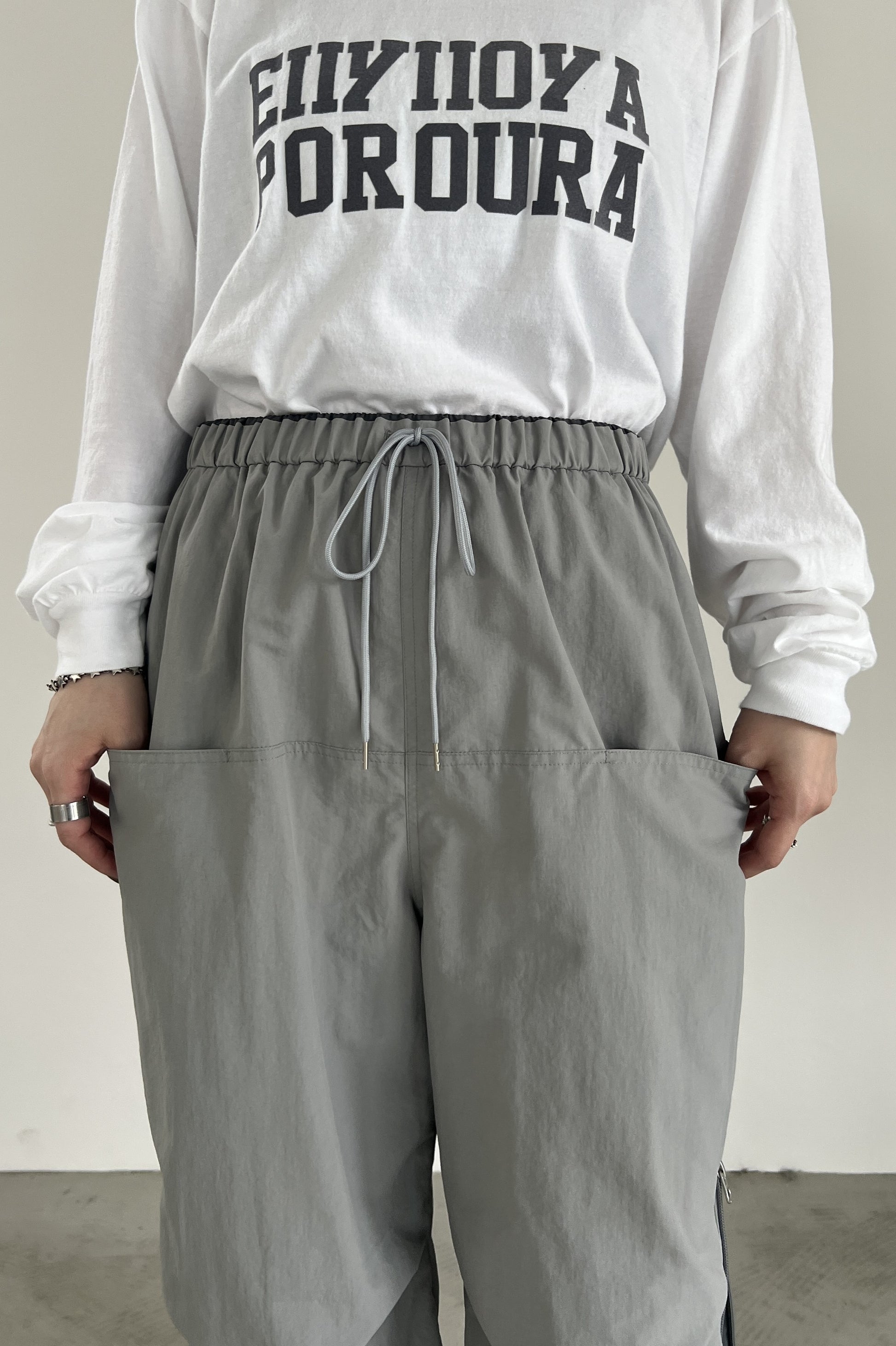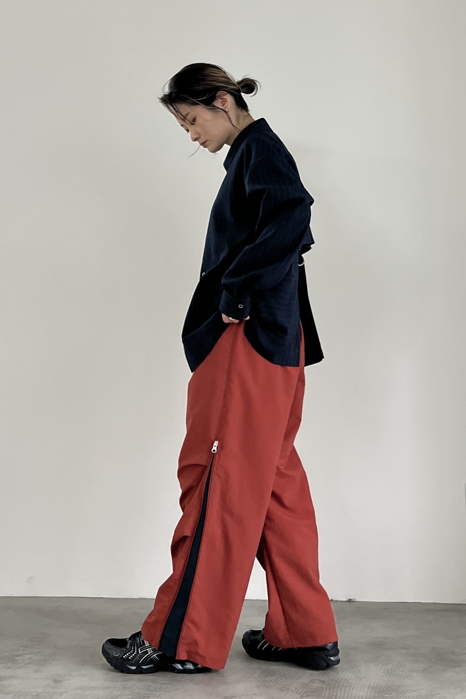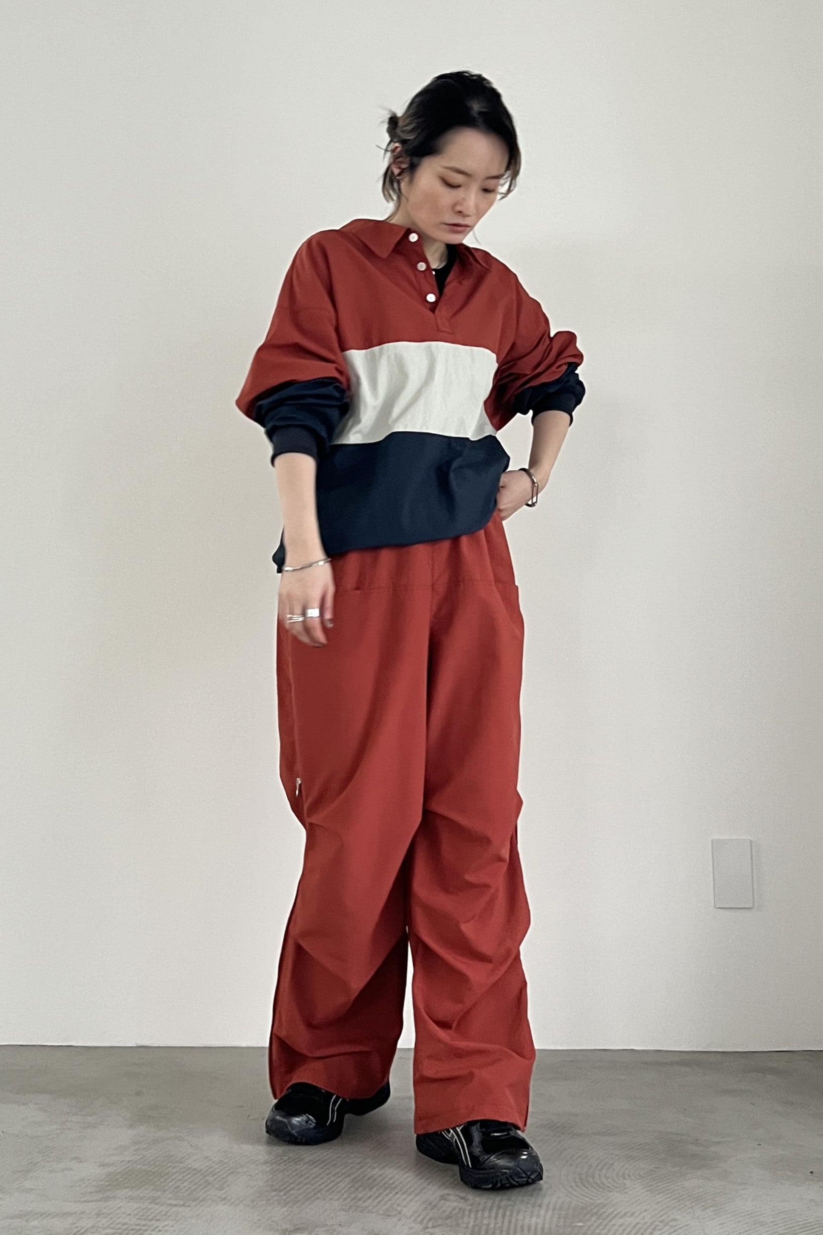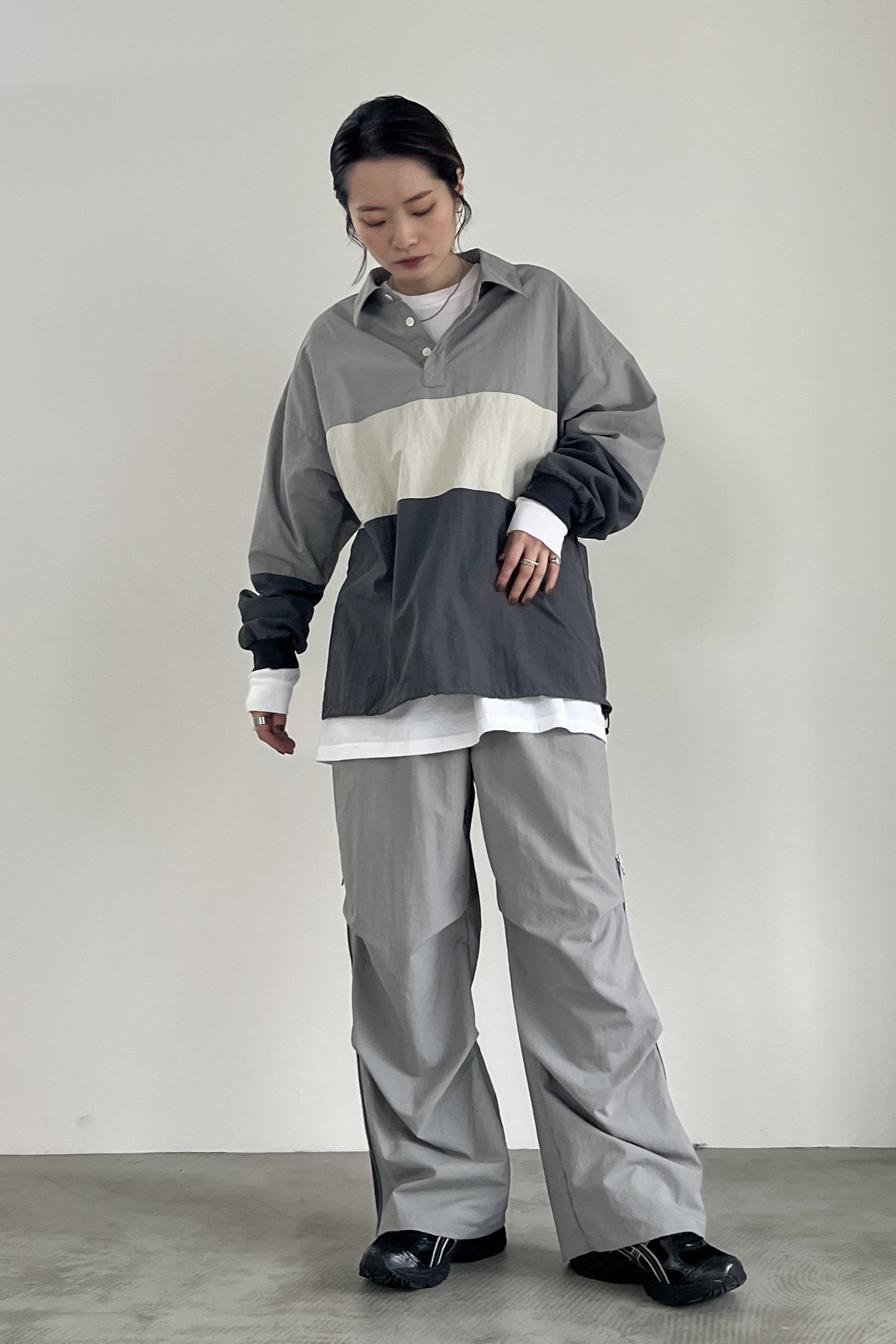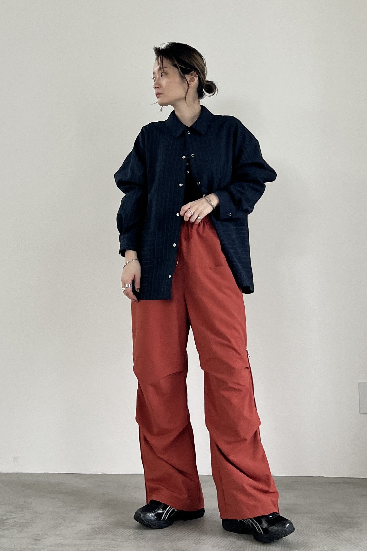 今年のスタイリングに欠かせないパラシュートパンツ。撥水性があり、天然繊維のような軽くて膨らみのあるナイロン素材を使用。サイドジップを開くと配色生地が見え、シルエットの変化も楽しめる2WAY仕様。同素材のシャツとのセットアップもおすすめ。