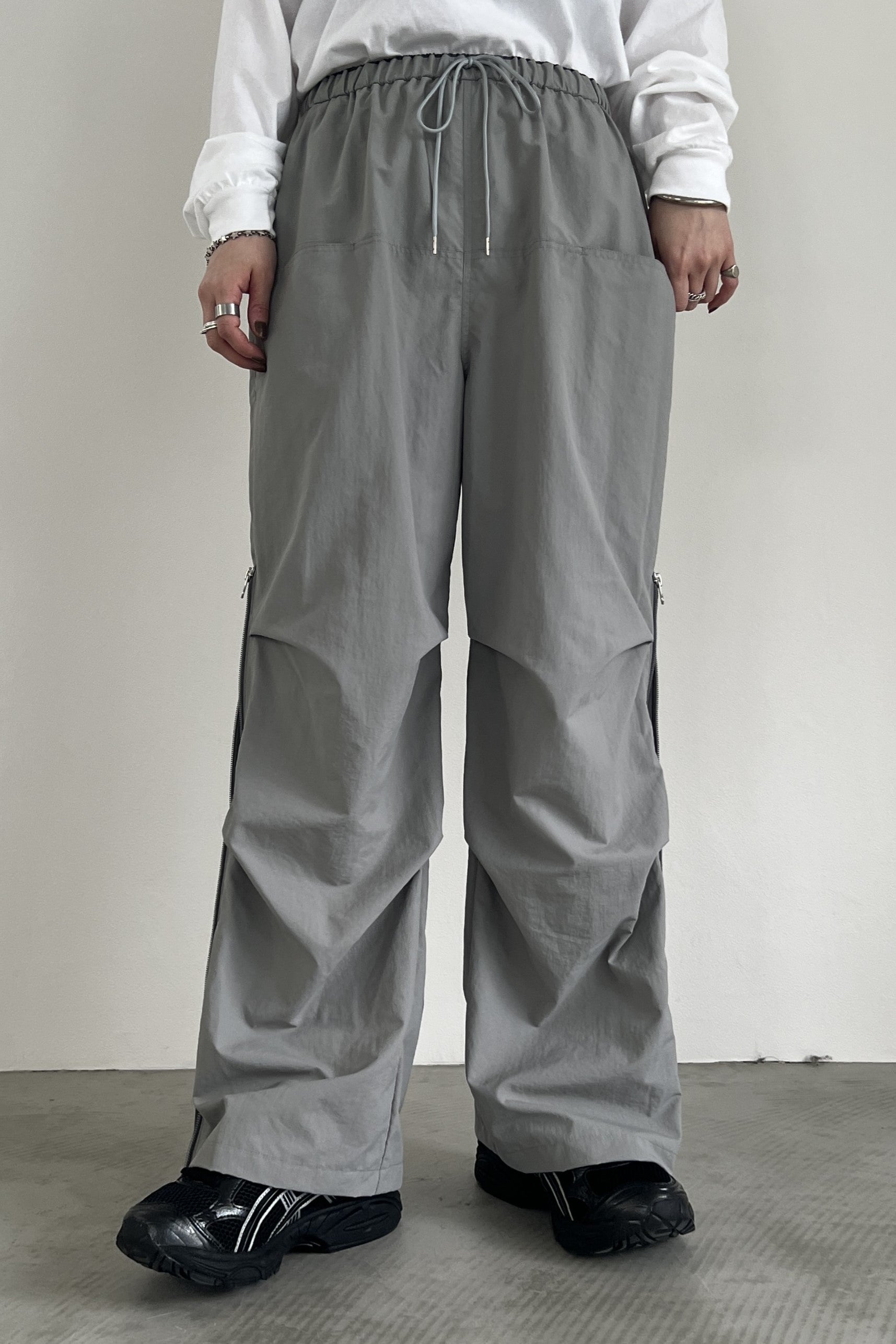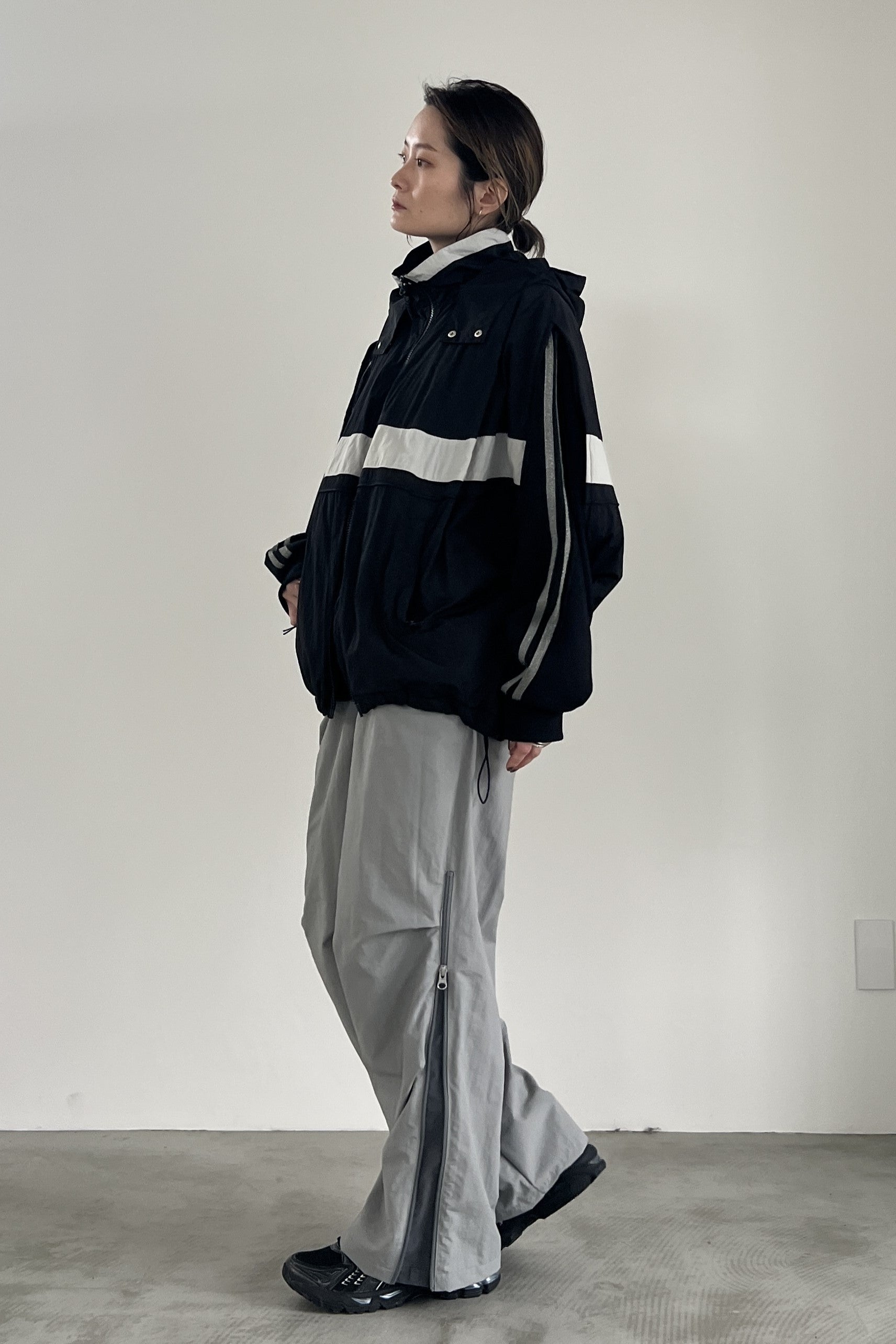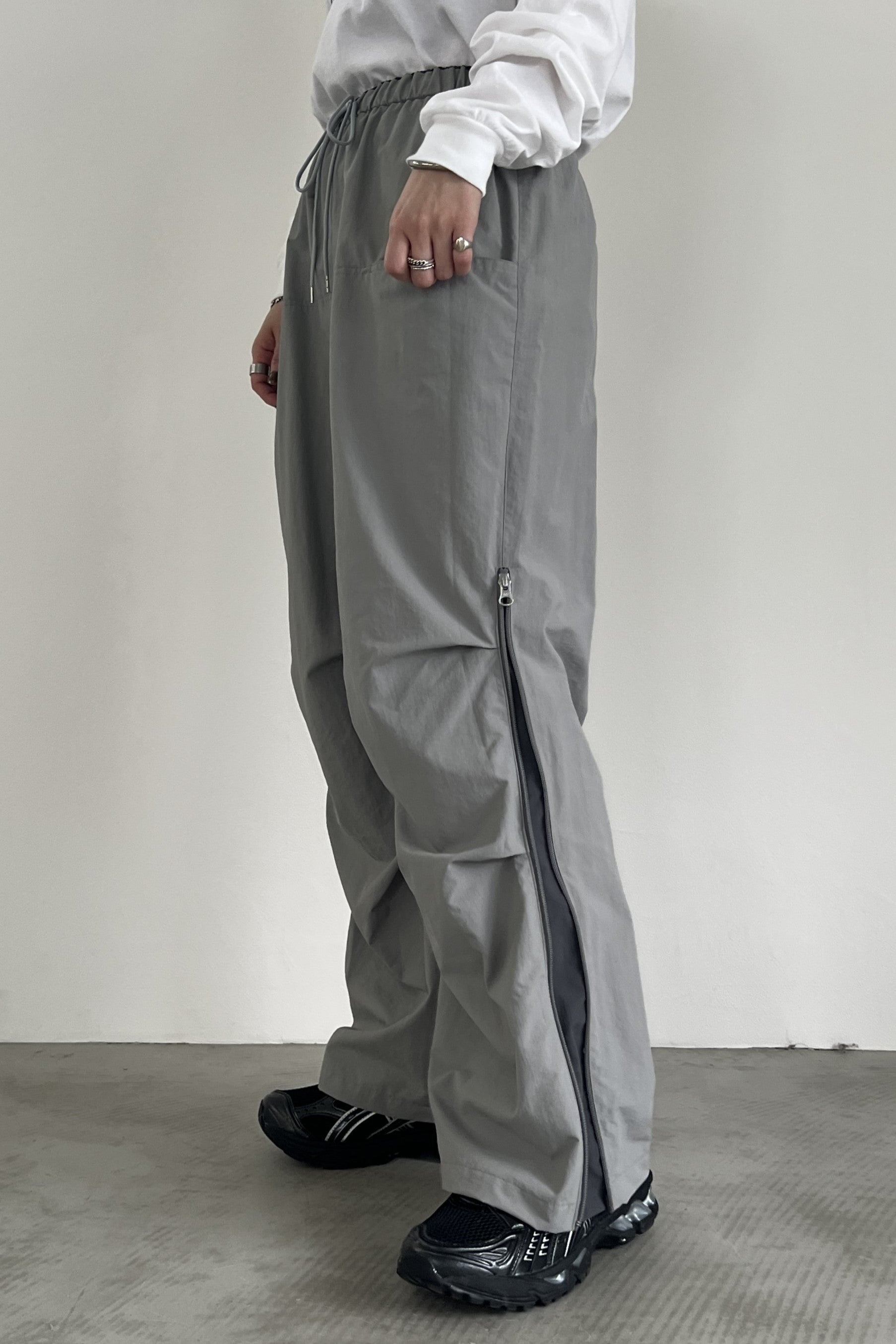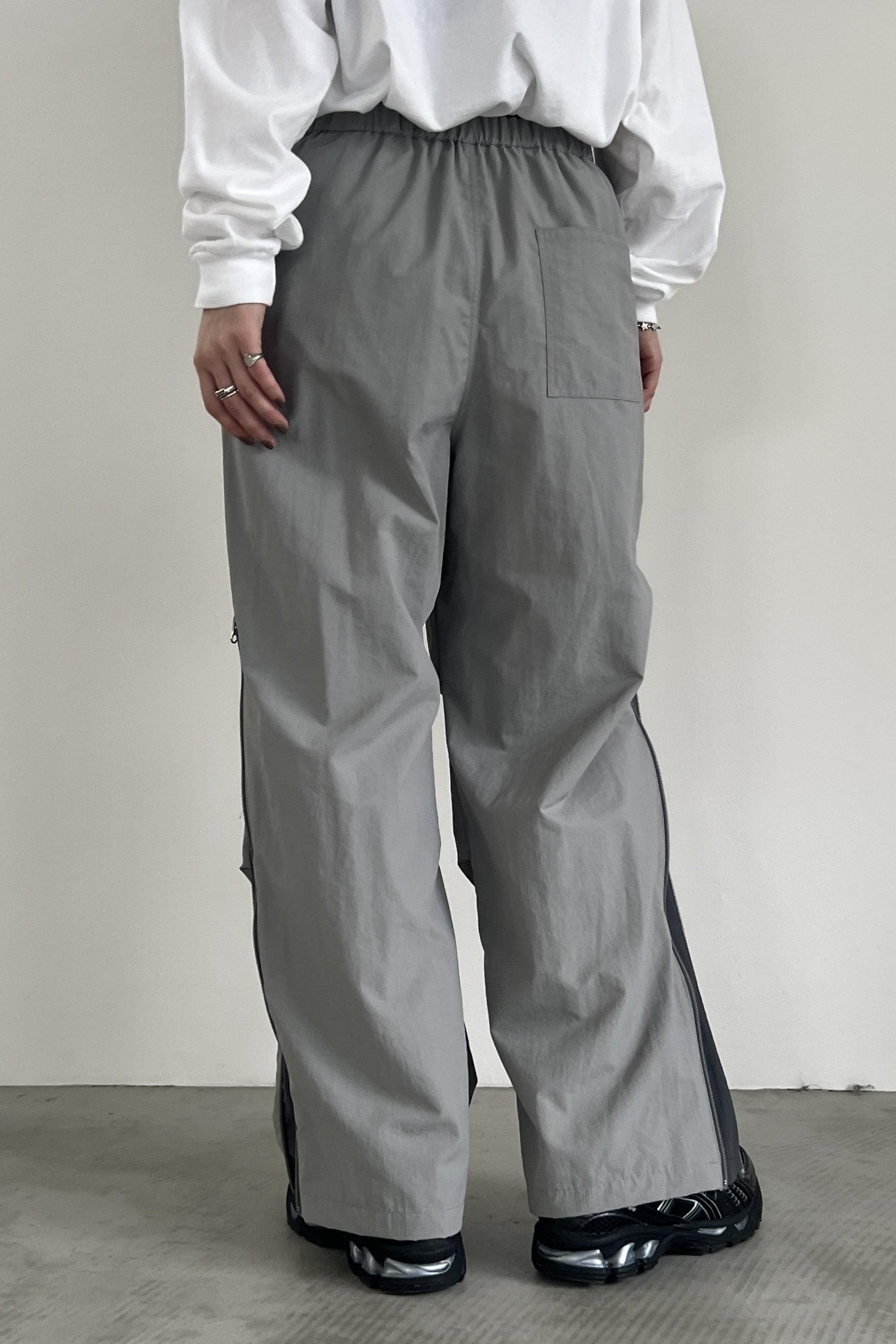 今年のスタイリングに欠かせないパラシュートパンツ。撥水性があり、天然繊維のような軽くて膨らみのあるナイロン素材を使用。サイドジップを開くと配色生地が見え、シルエットの変化も楽しめる2WAY仕様。同素材のシャツとのセットアップもおすすめ。