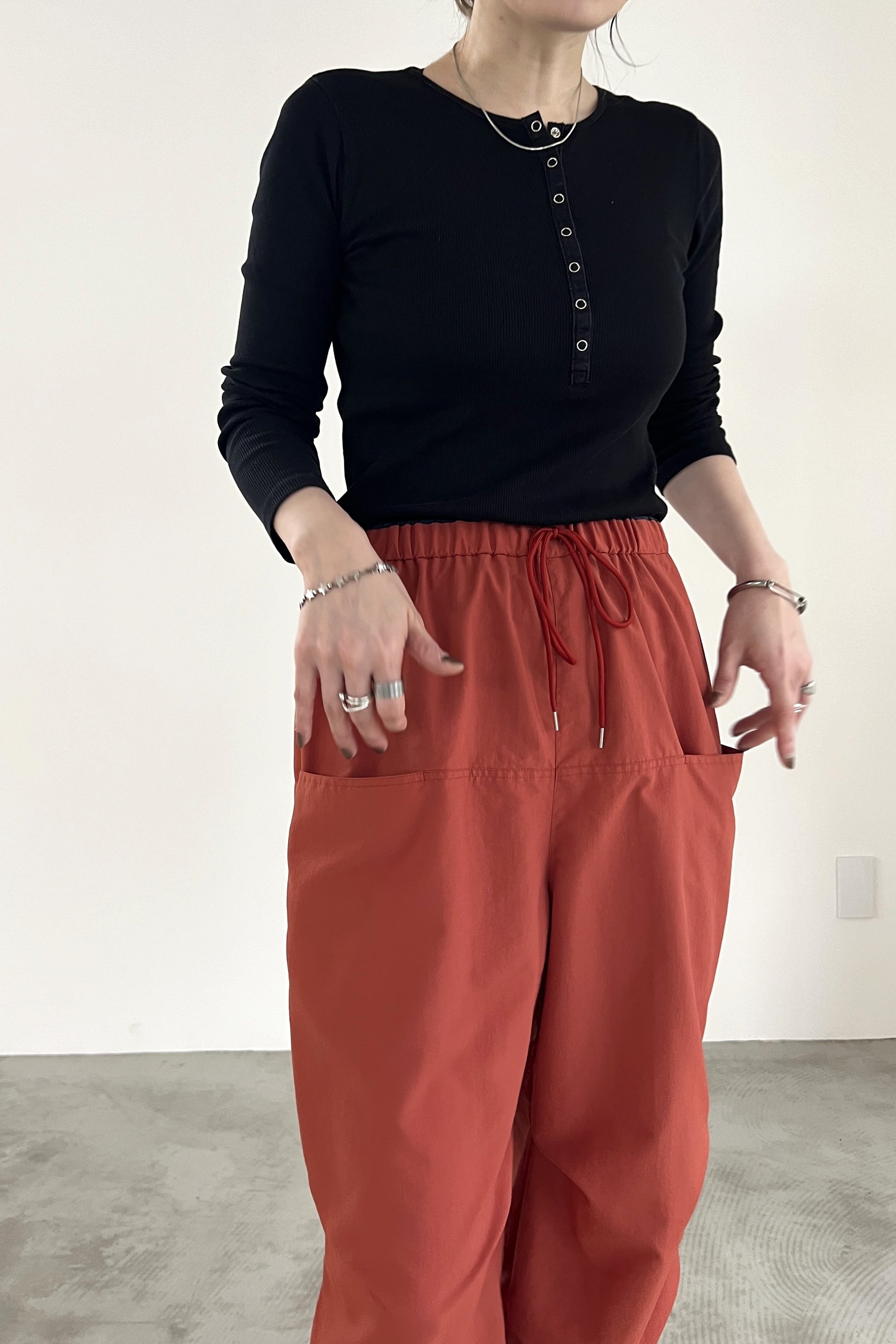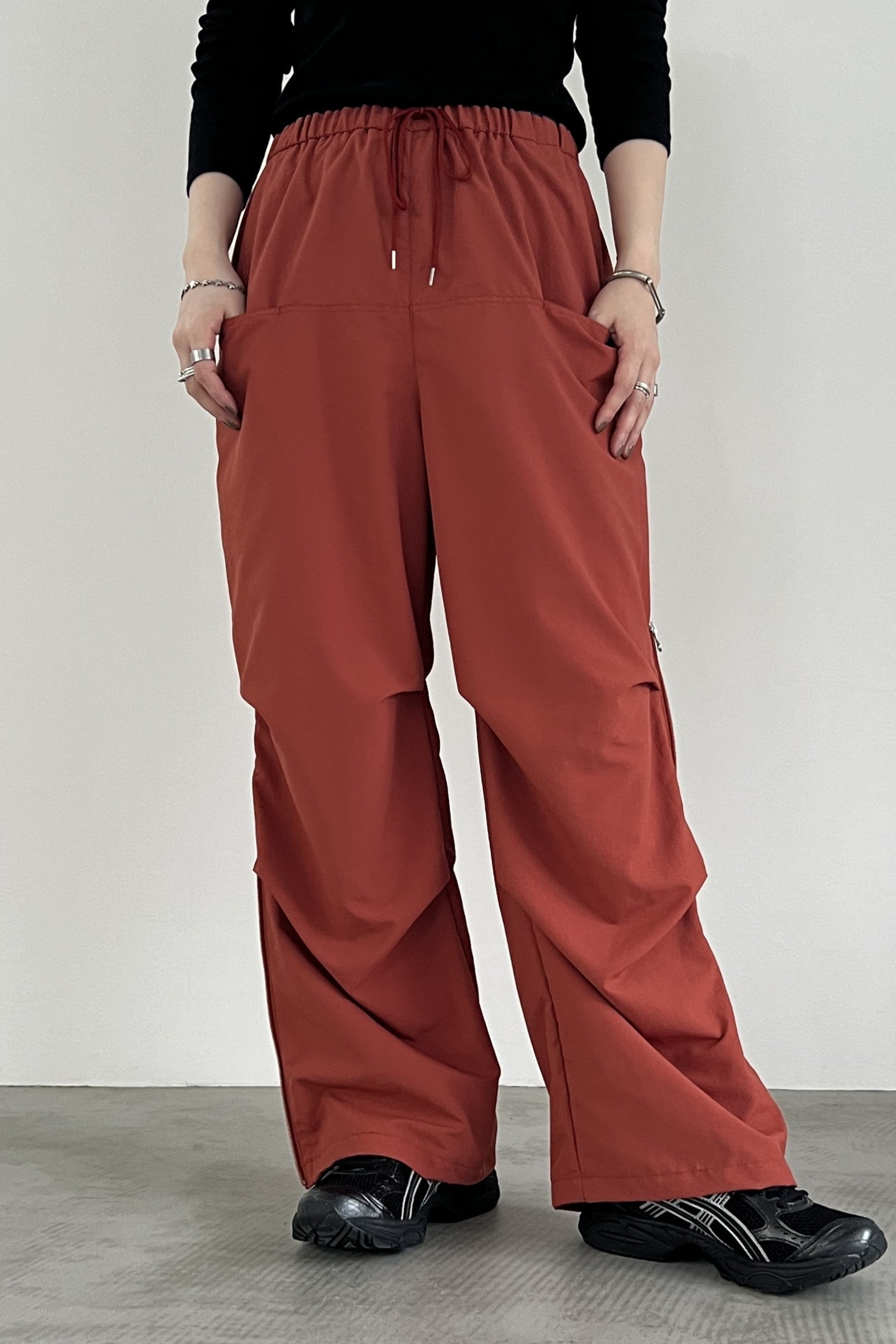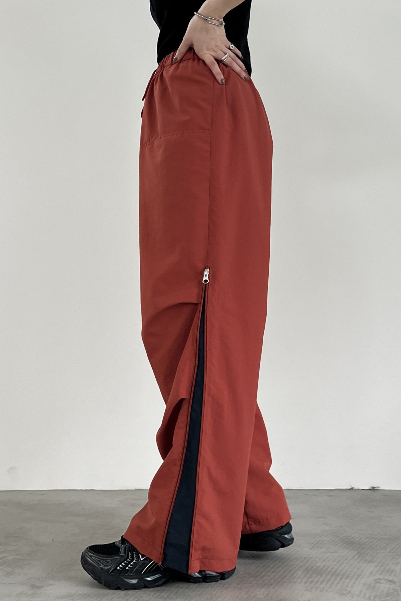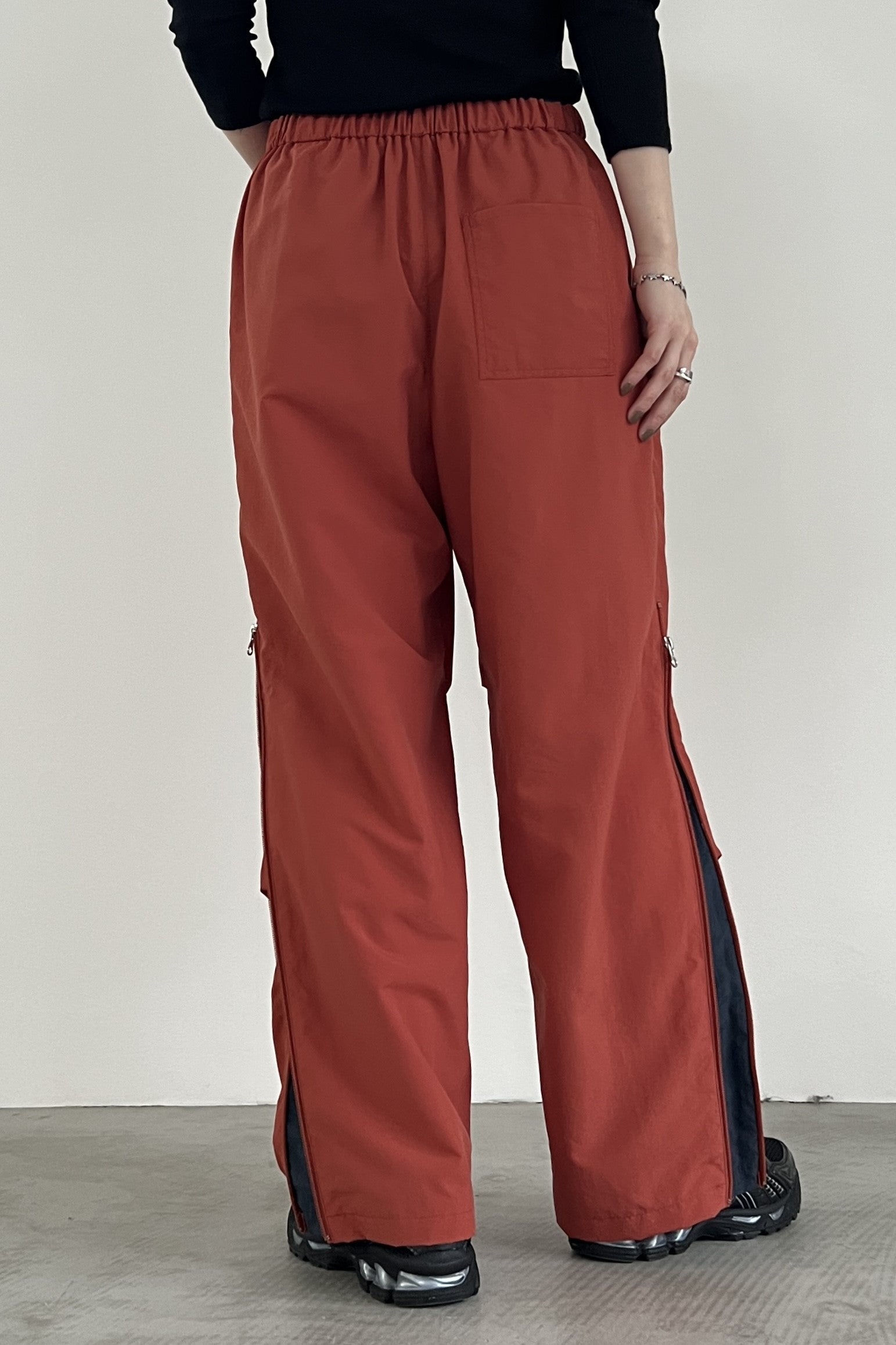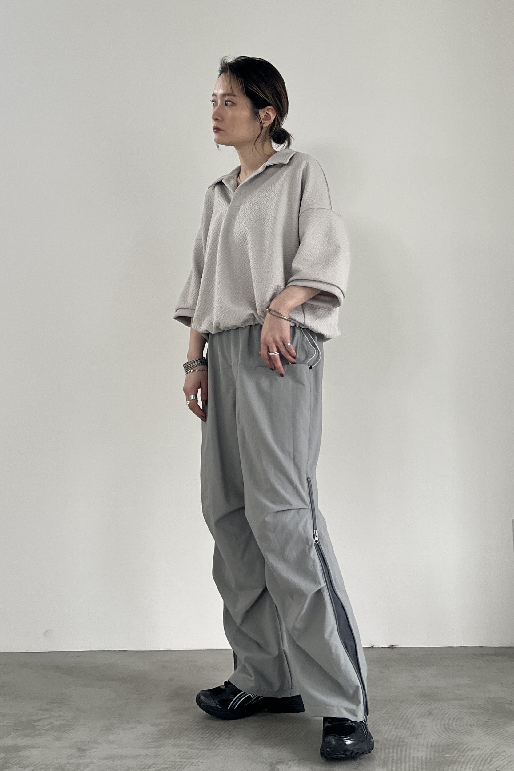 今年のスタイリングに欠かせないパラシュートパンツ。撥水性があり、天然繊維のような軽くて膨らみのあるナイロン素材を使用。サイドジップを開くと配色生地が見え、シルエットの変化も楽しめる2WAY仕様。同素材のシャツとのセットアップもおすすめ。
