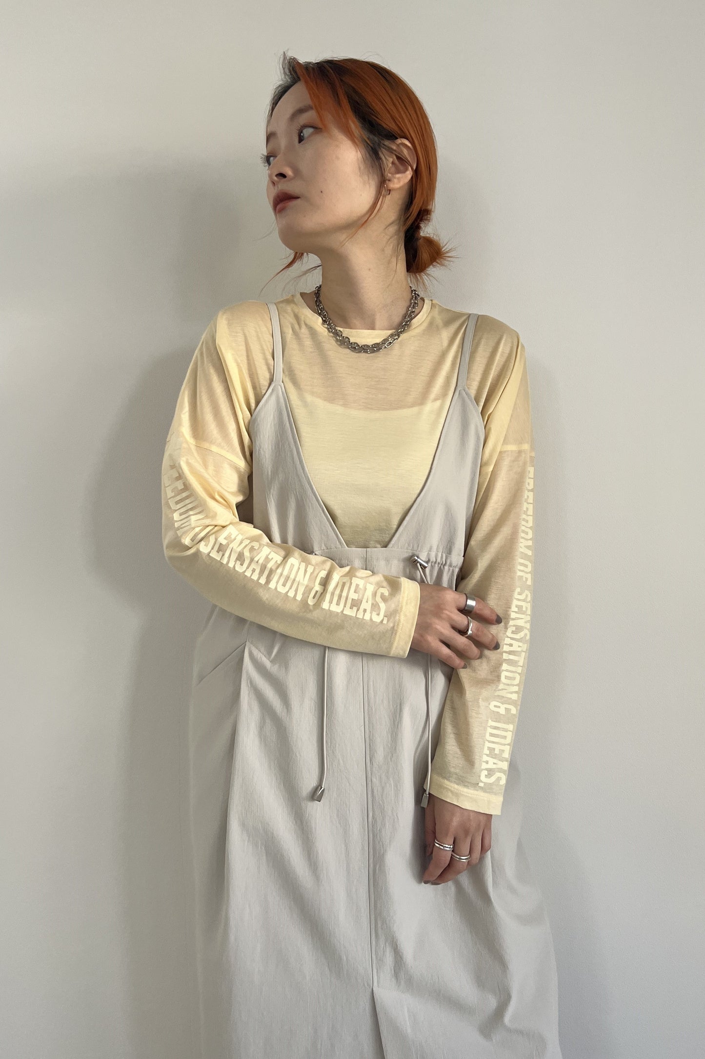 程良い透け感のある、ハイゲージの天竺を使用したロングスリーブのTシャツ。ボディと同系色の主張しすぎないアームのロゴがポイント。見た目以上の軽さがあり、夏場も着用可能なロンTです。