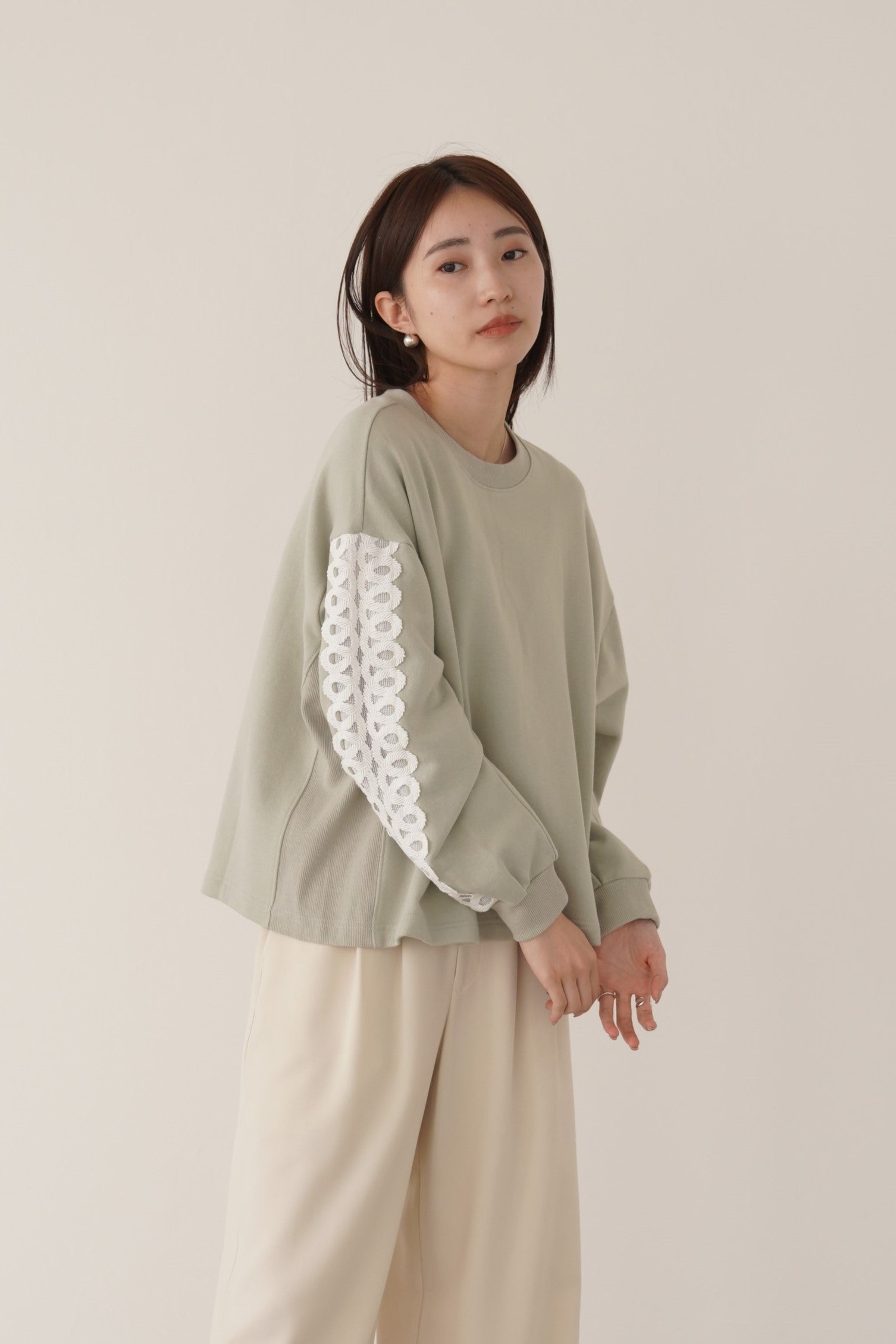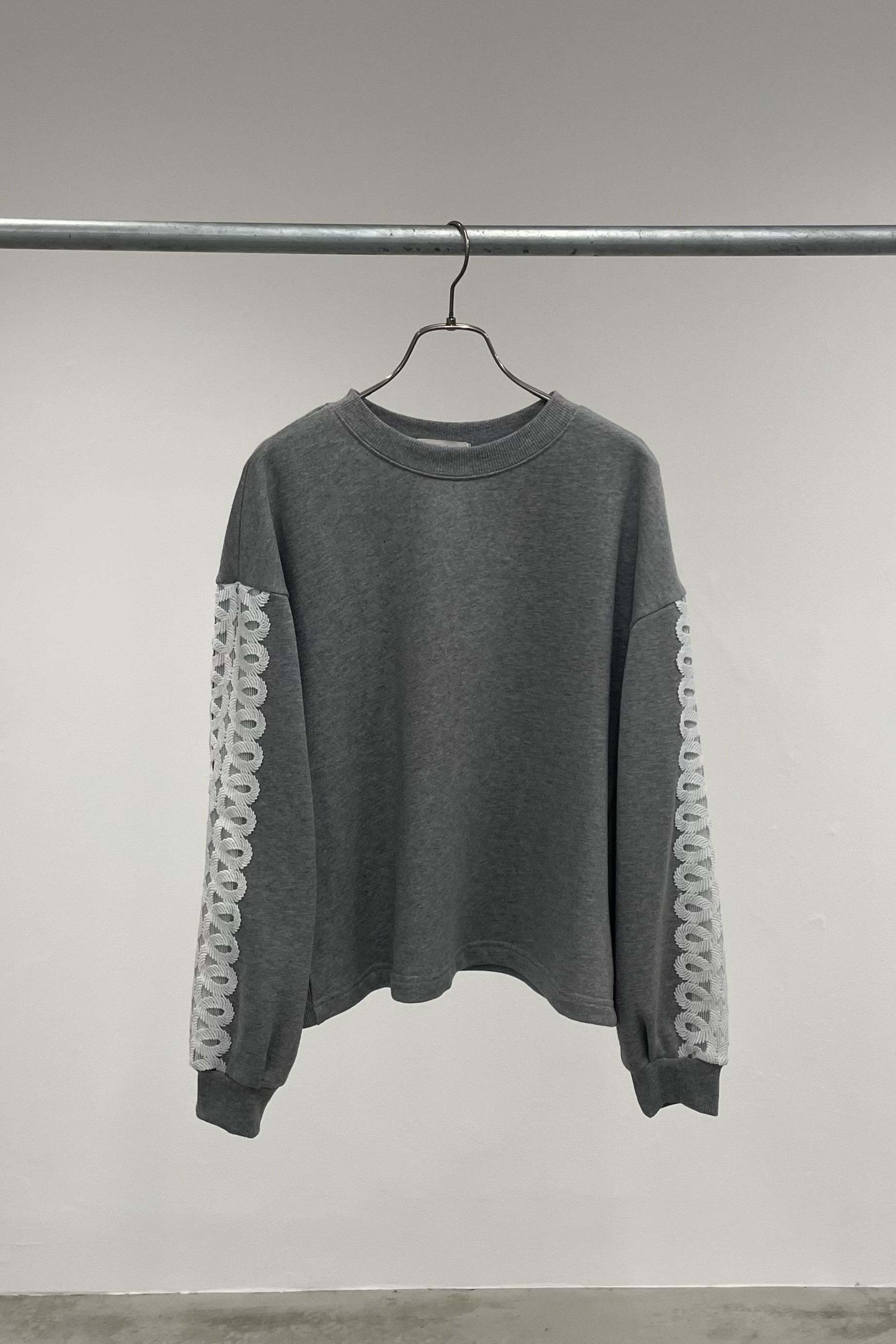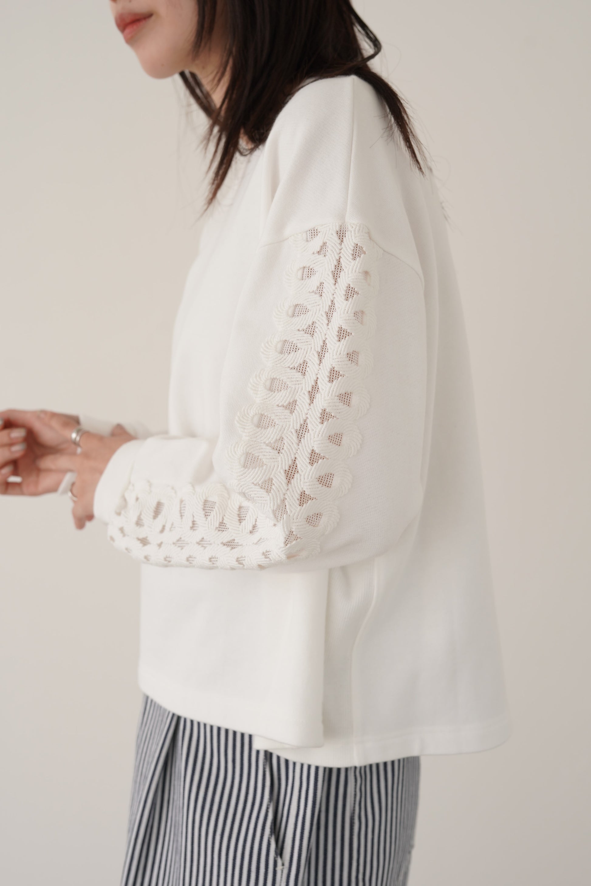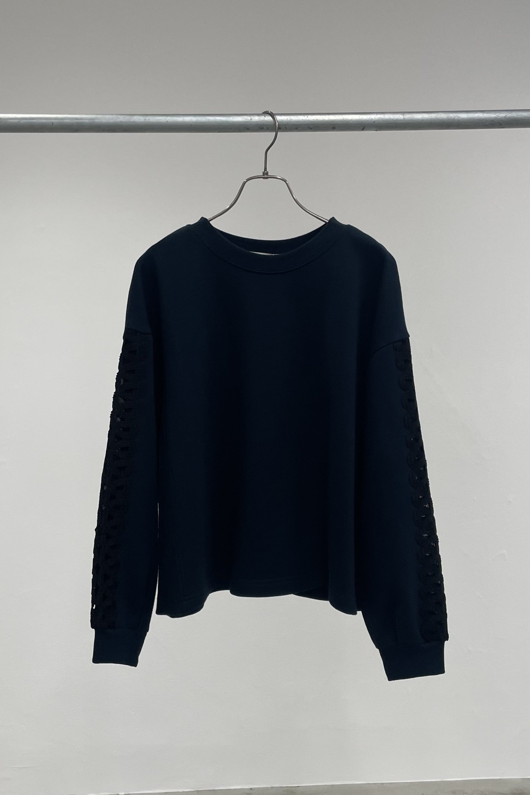ループ状のケミカルレースを組み合わせたスウェット。レース下はメッシュで切り替えており、ほどよく肌を見せてくれます。ややショート丈でボトムとのバランスがとりやすく、ご家庭でケアできるのも嬉しいポイントです。