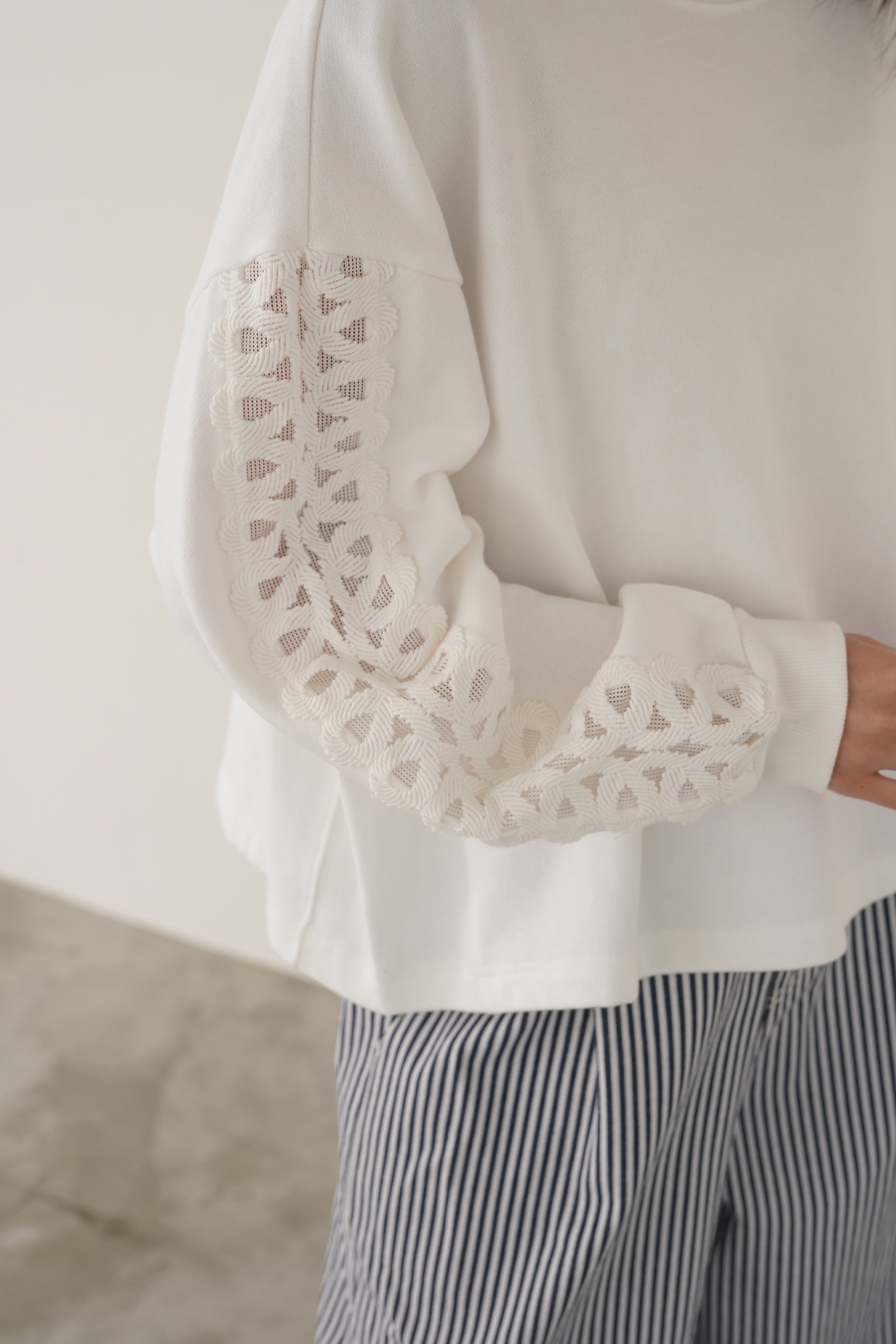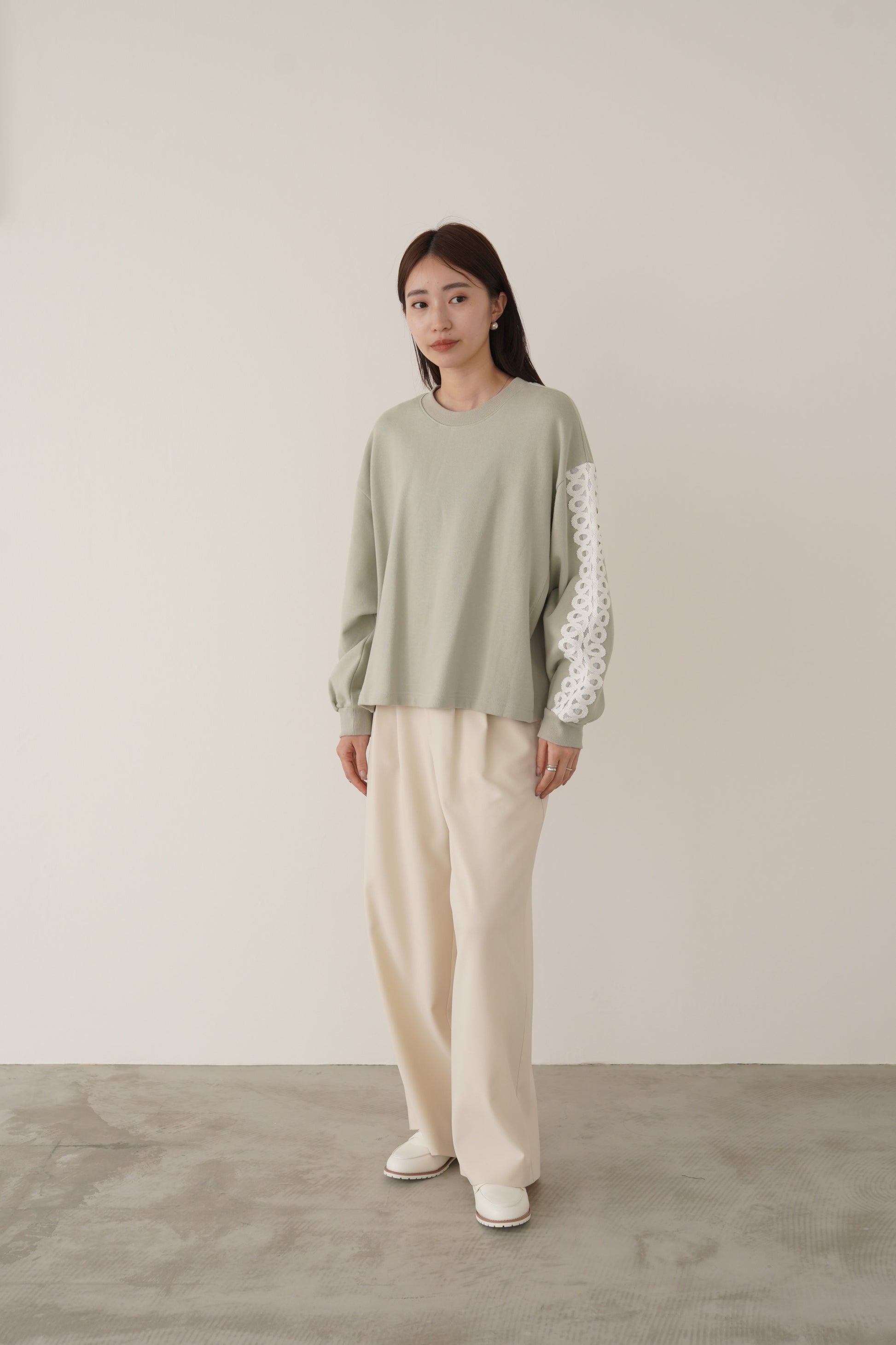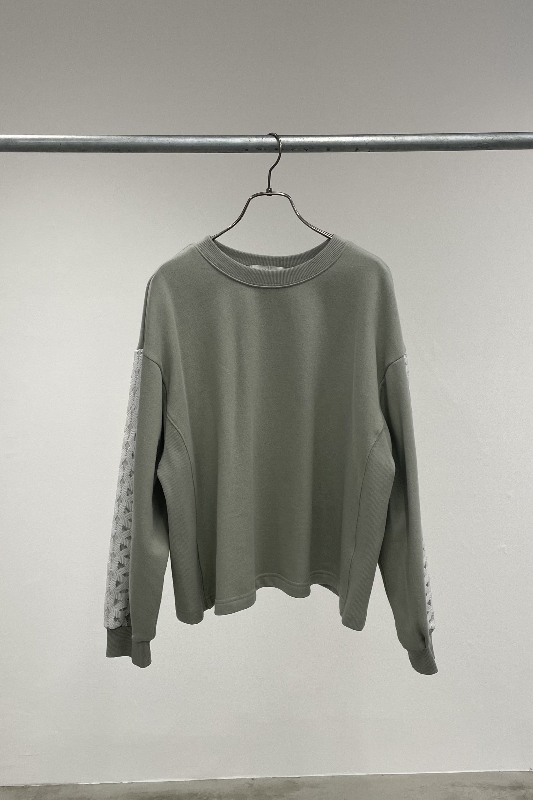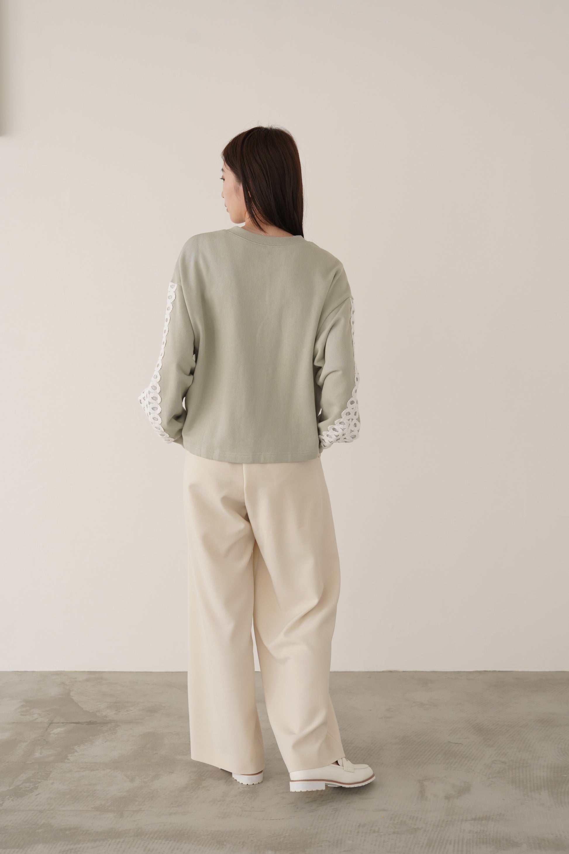 ループ状のケミカルレースを組み合わせたスウェット。レース下はメッシュで切り替えており、ほどよく肌を見せてくれます。ややショート丈でボトムとのバランスがとりやすく、ご家庭でケアできるのも嬉しいポイントです。