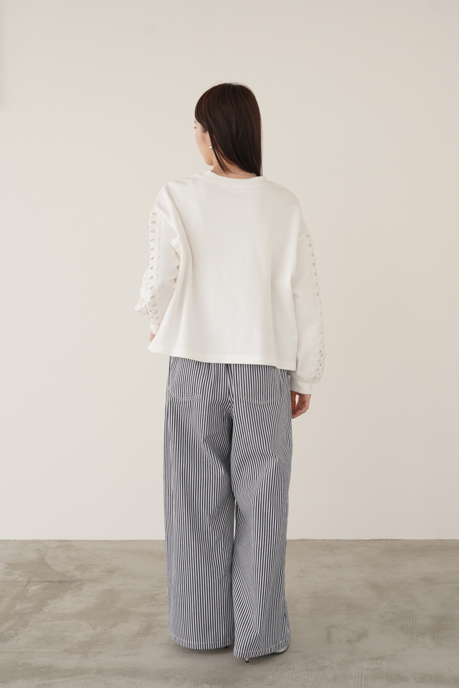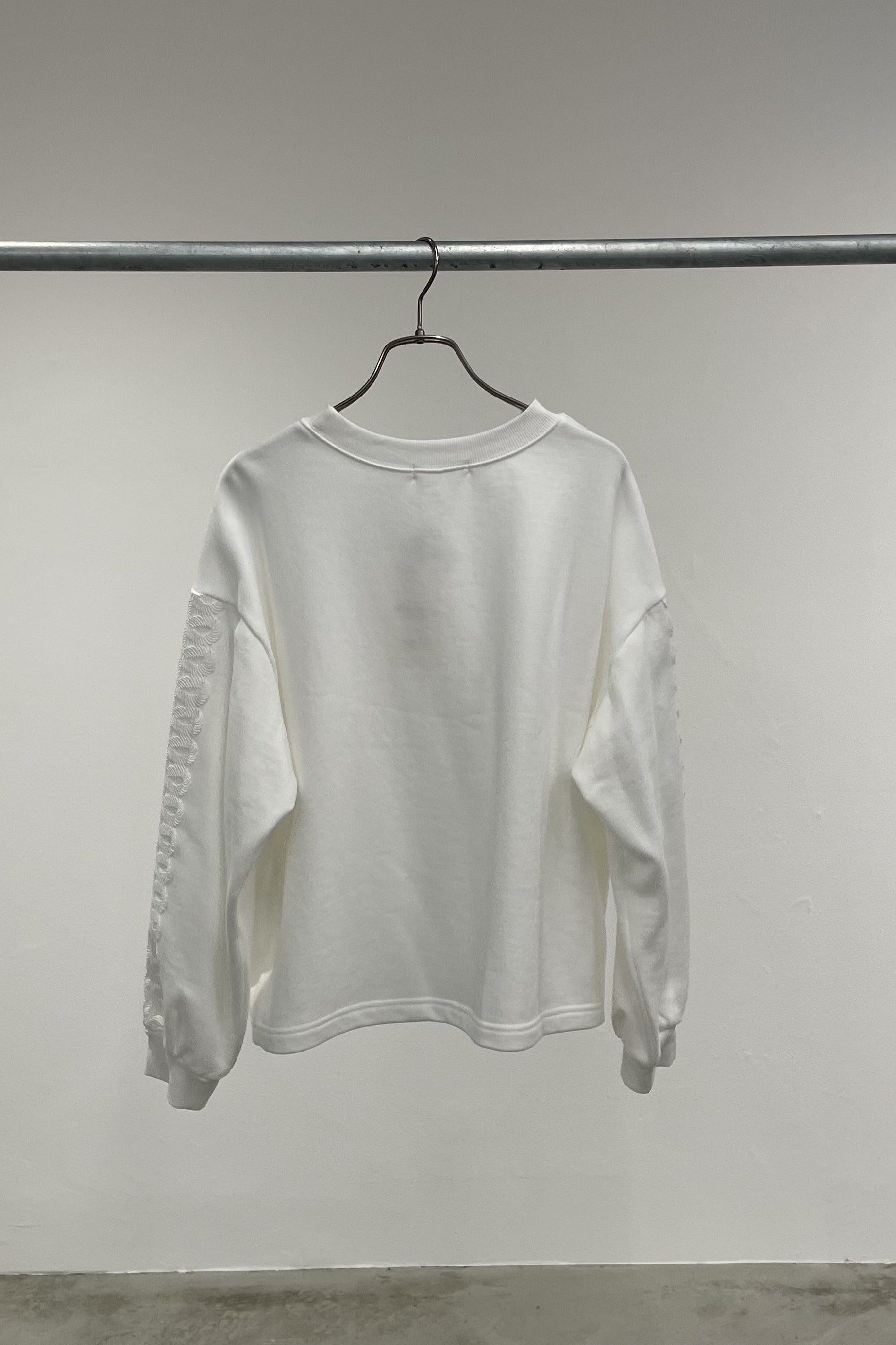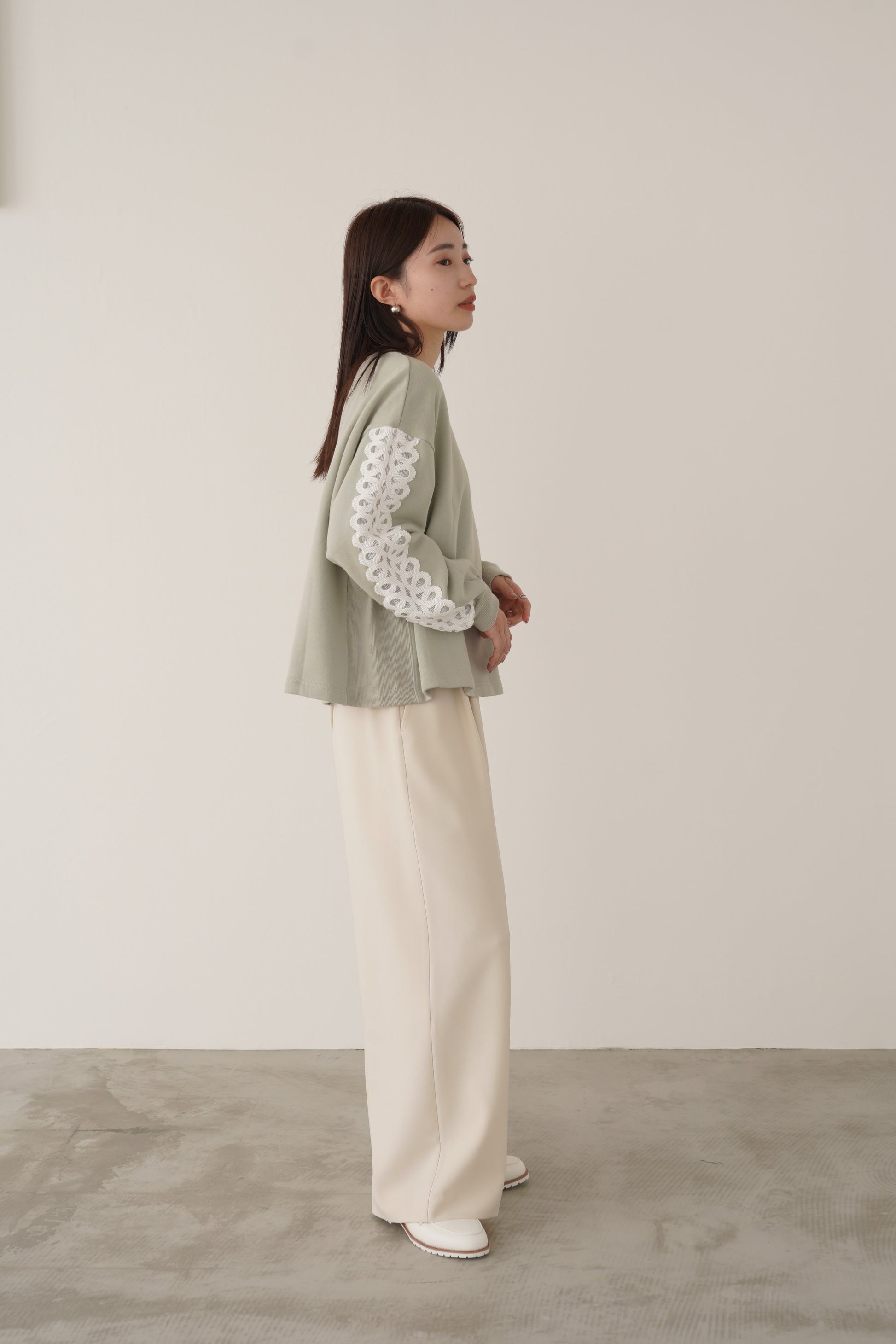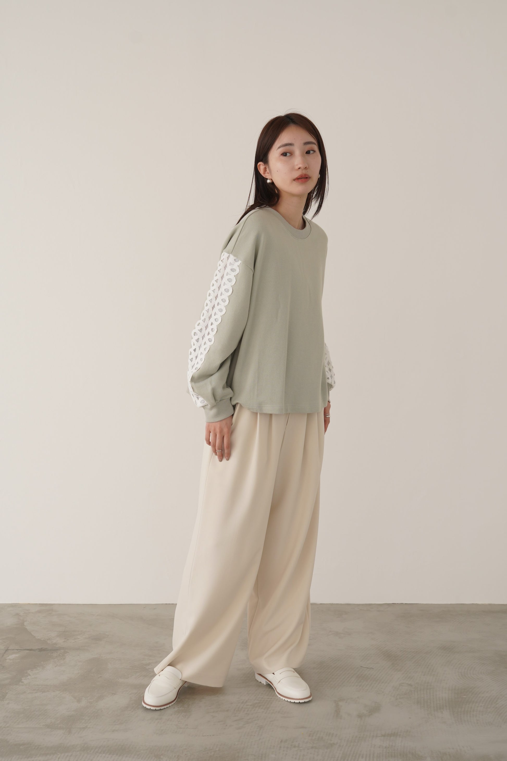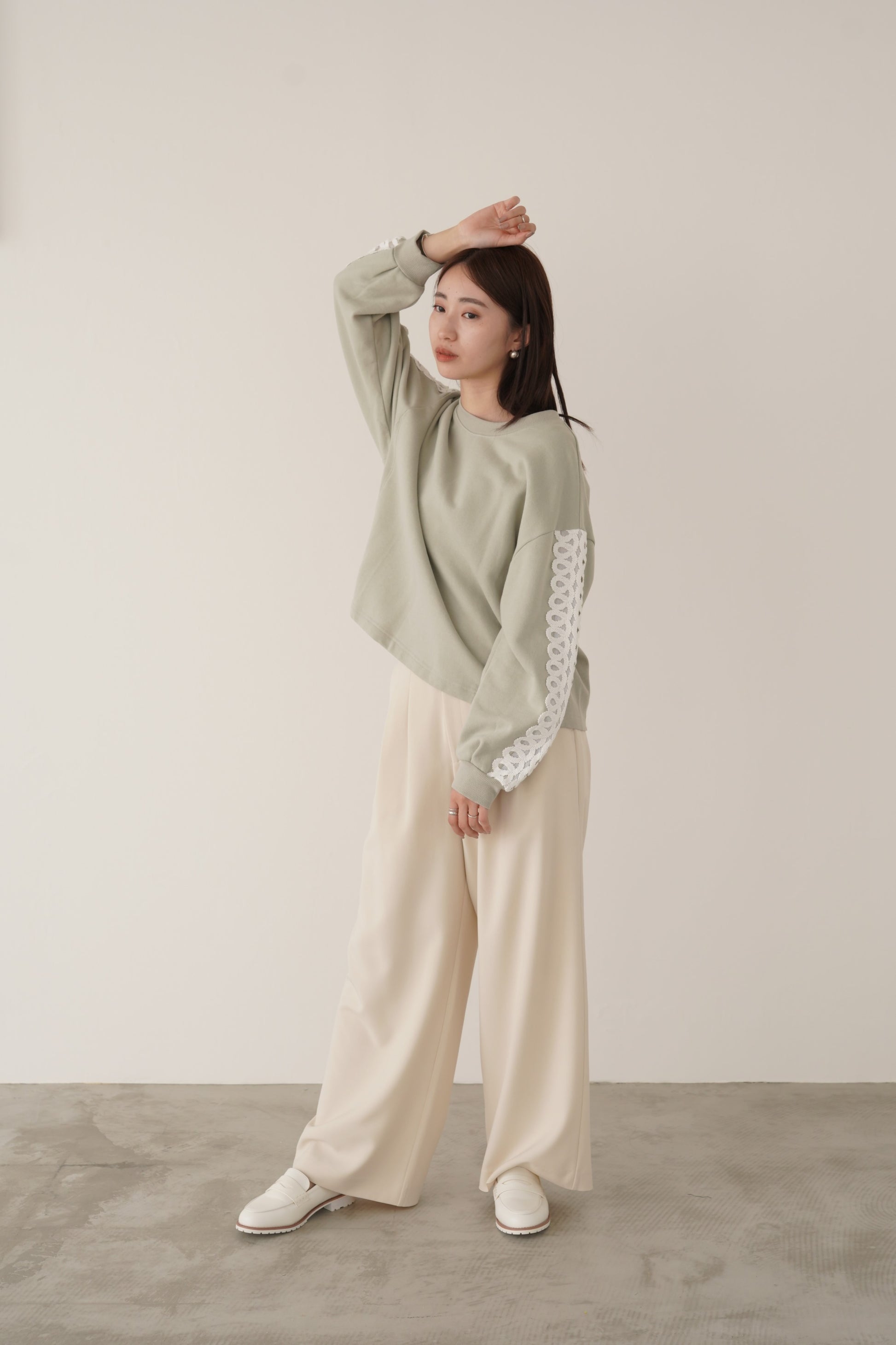 ループ状のケミカルレースを組み合わせたスウェット。レース下はメッシュで切り替えており、ほどよく肌を見せてくれます。ややショート丈でボトムとのバランスがとりやすく、ご家庭でケアできるのも嬉しいポイントです。
