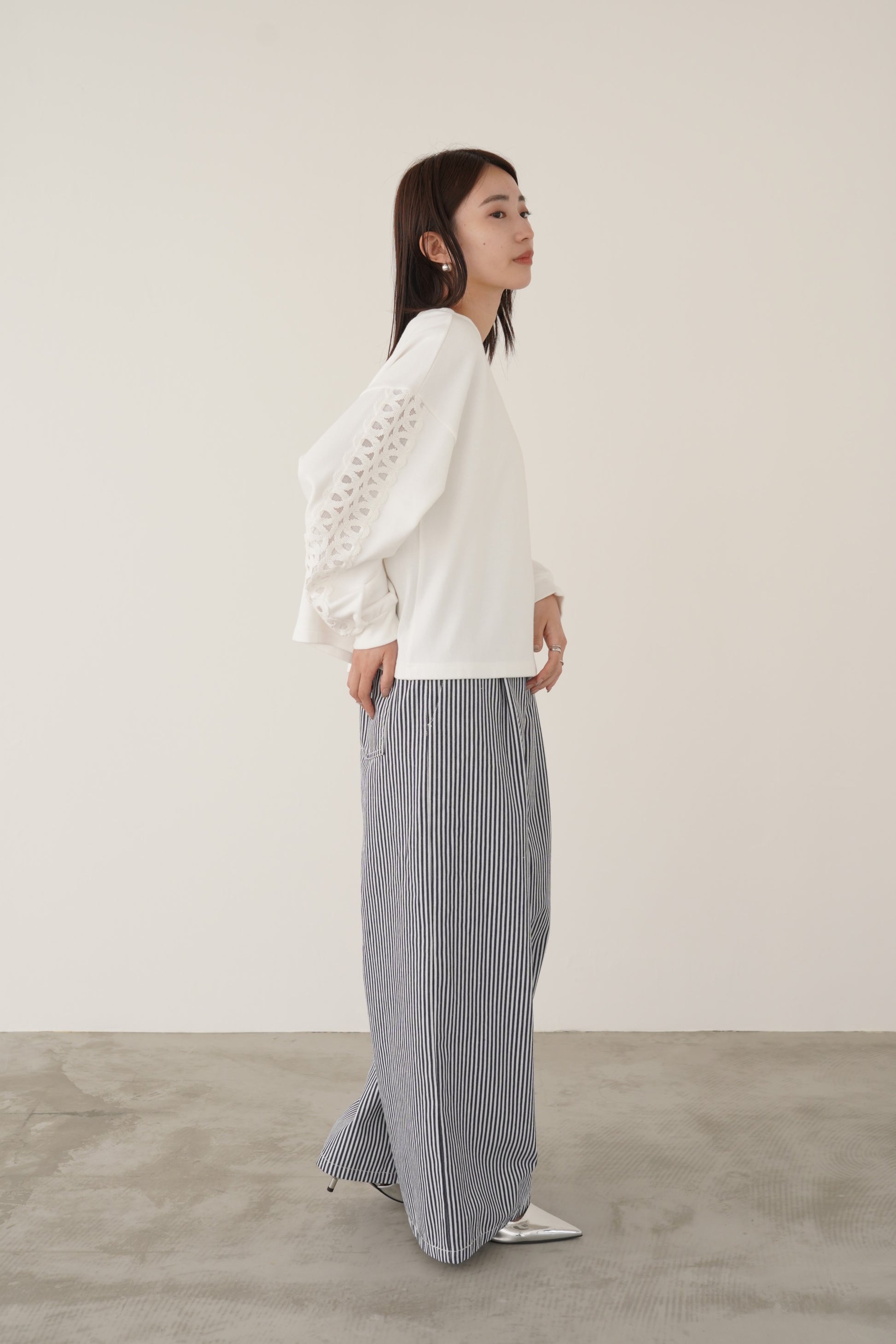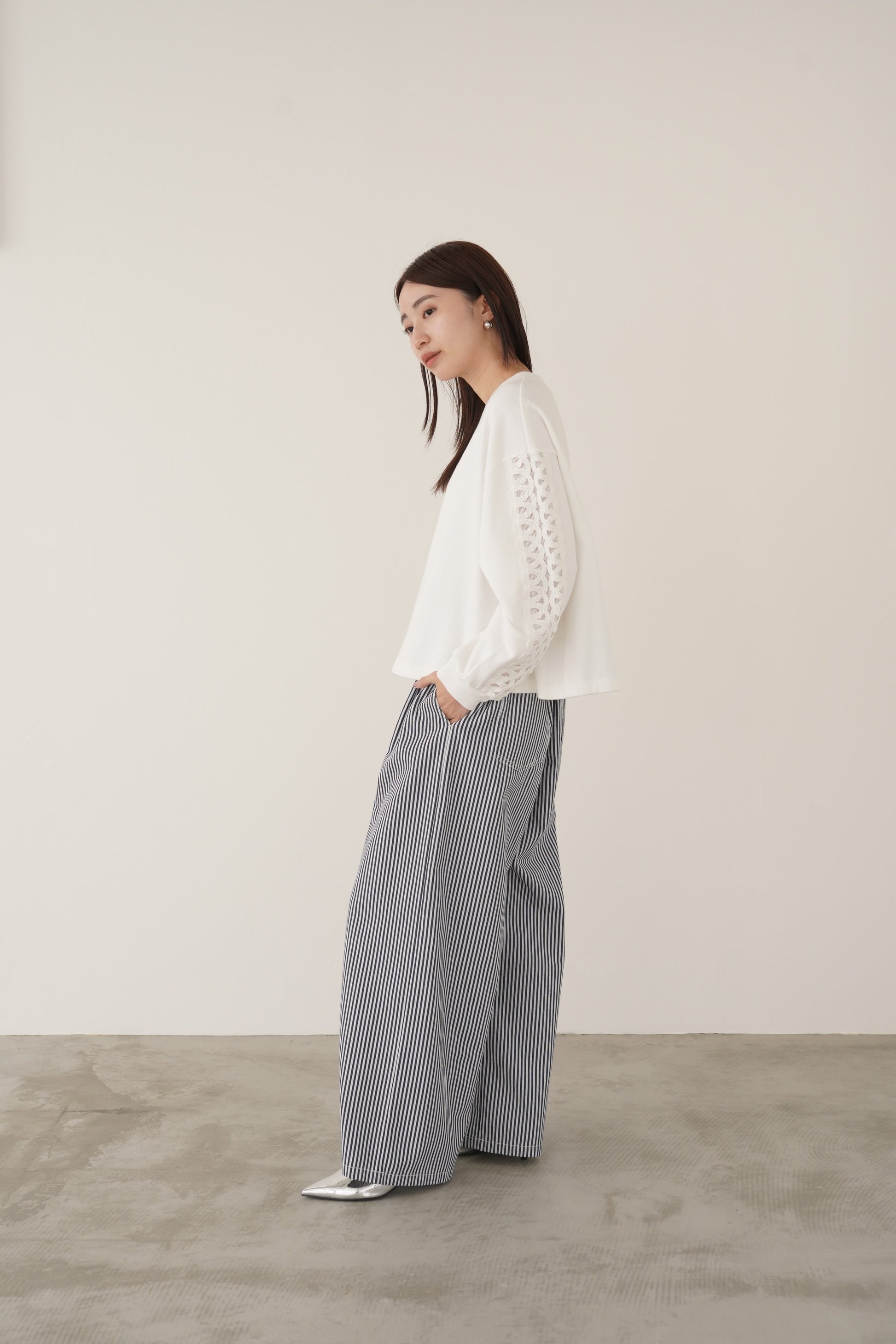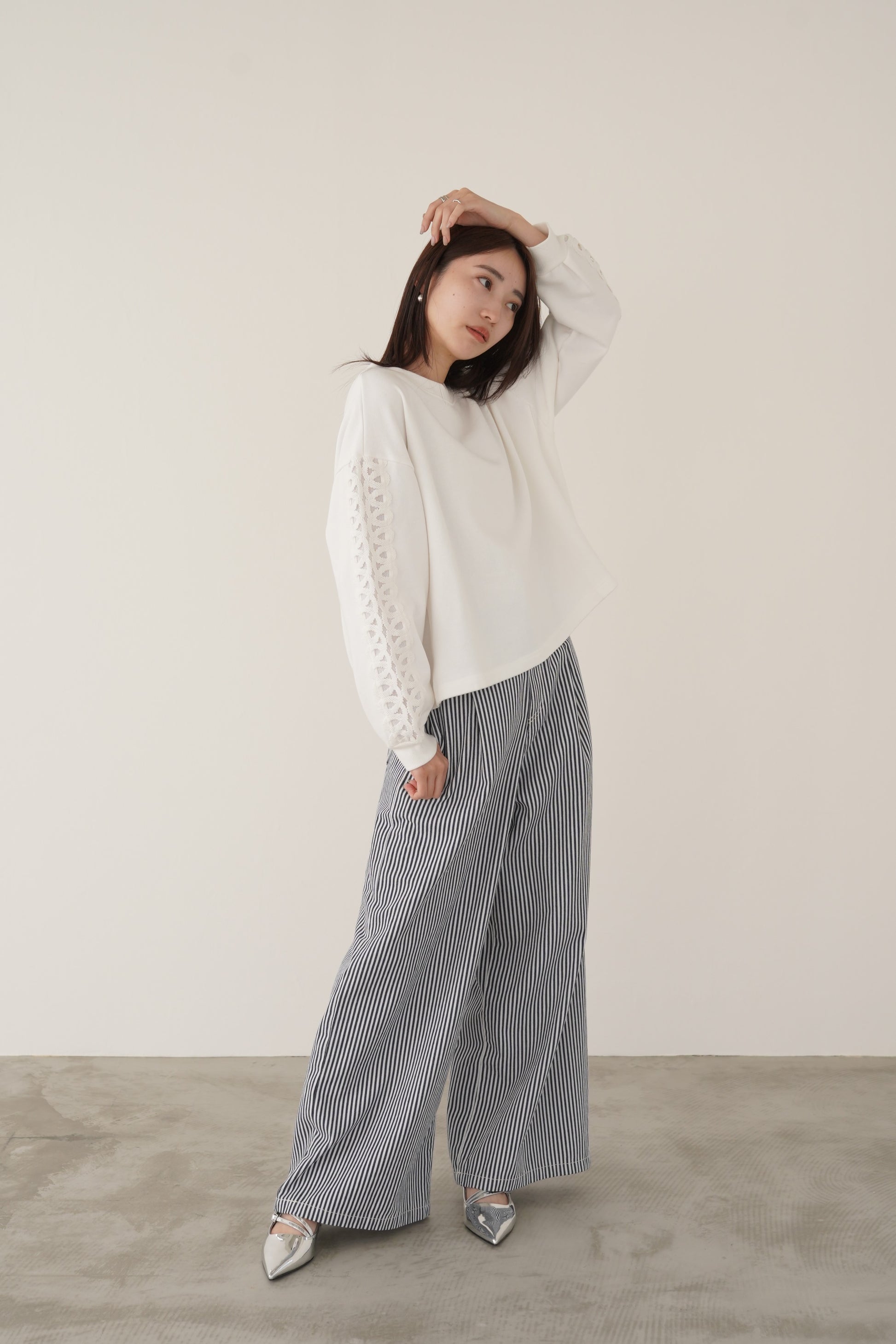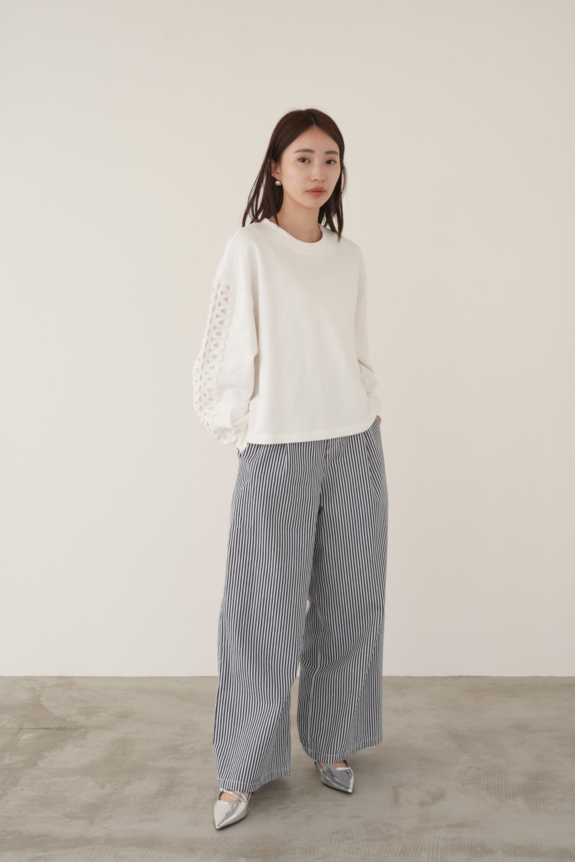 ループ状のケミカルレースを組み合わせたスウェット。レース下はメッシュで切り替えており、ほどよく肌を見せてくれます。ややショート丈でボトムとのバランスがとりやすく、ご家庭でケアできるのも嬉しいポイントです。