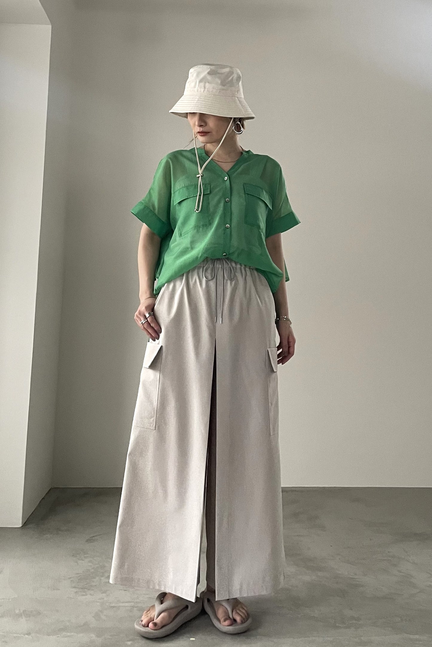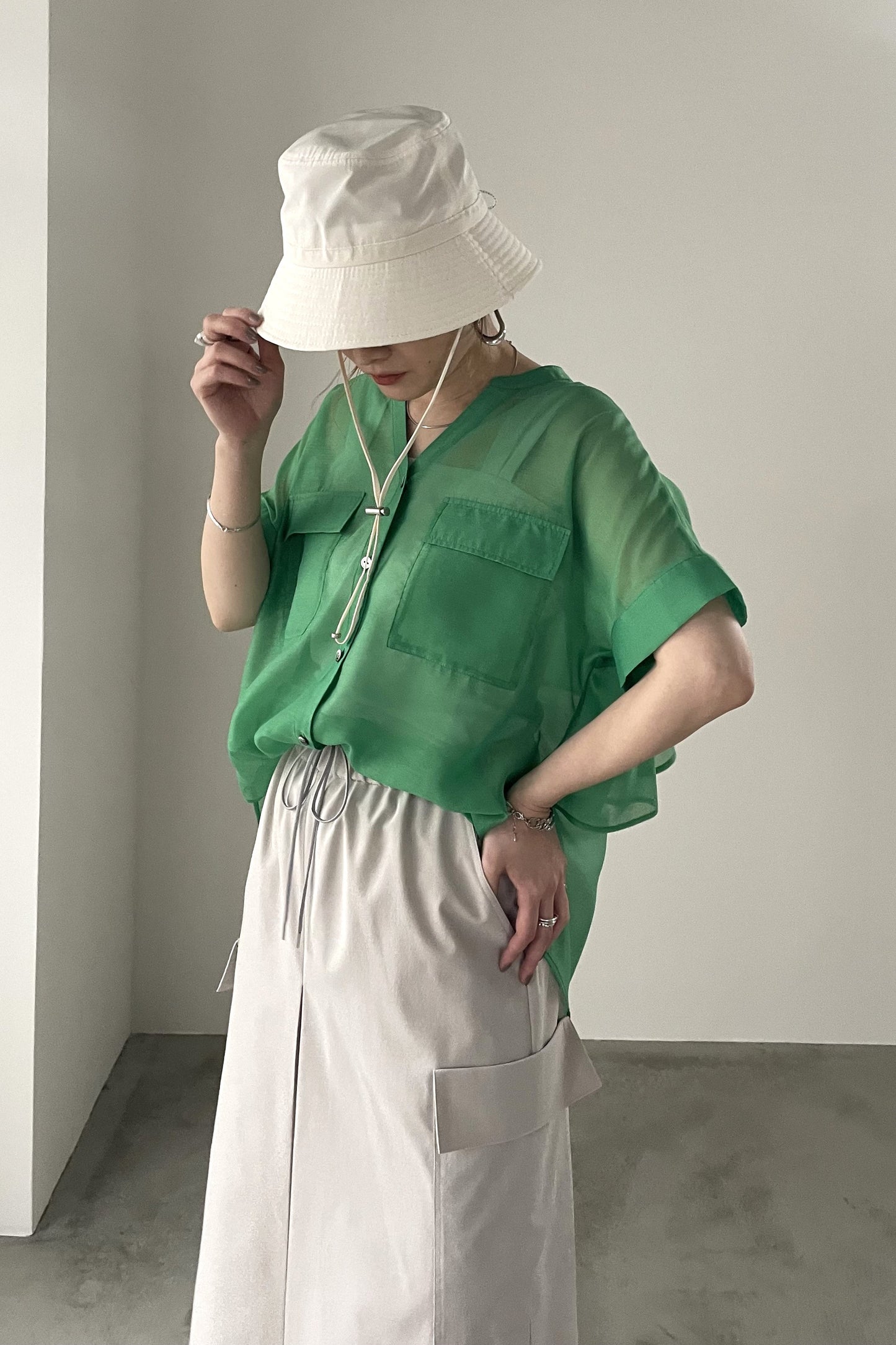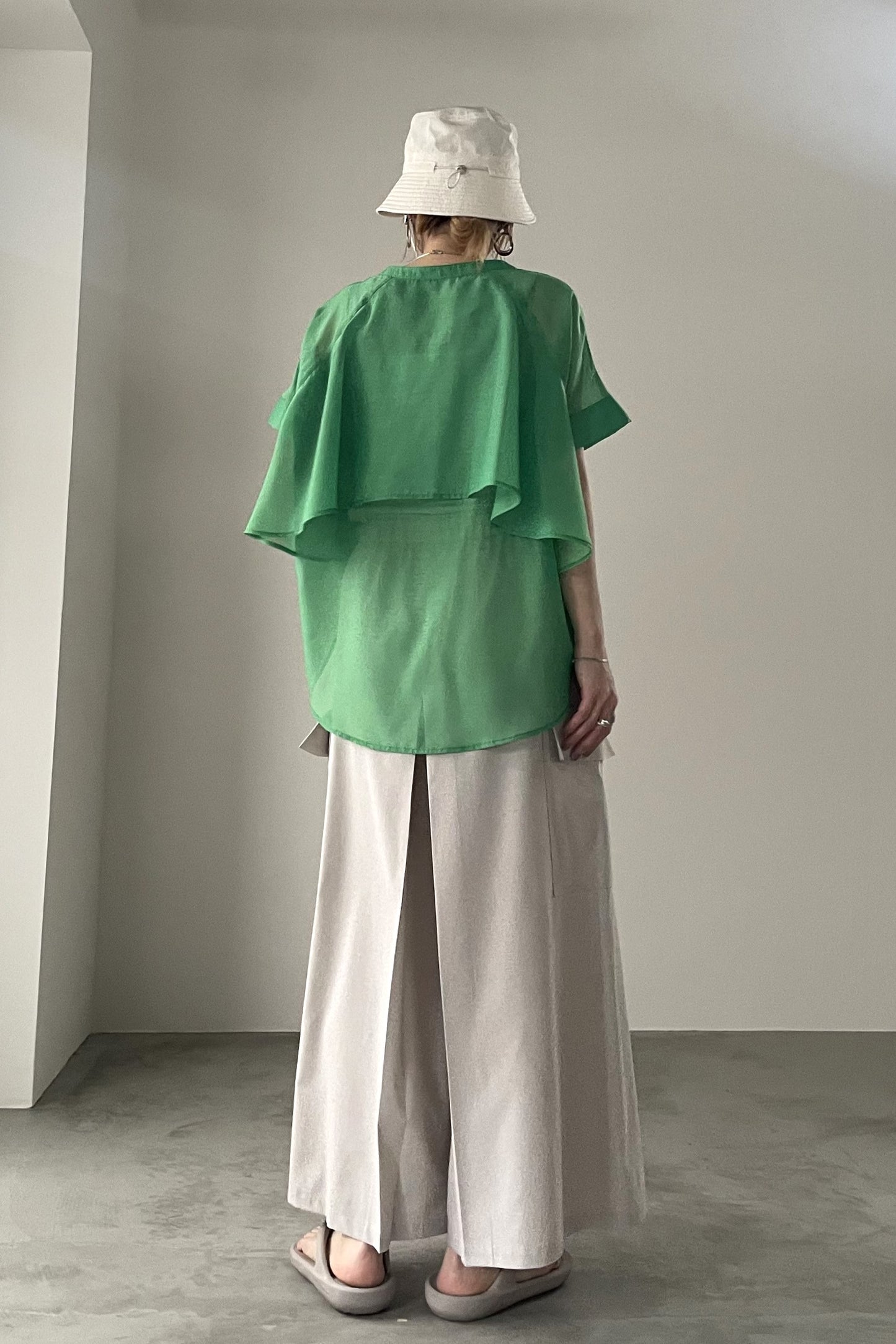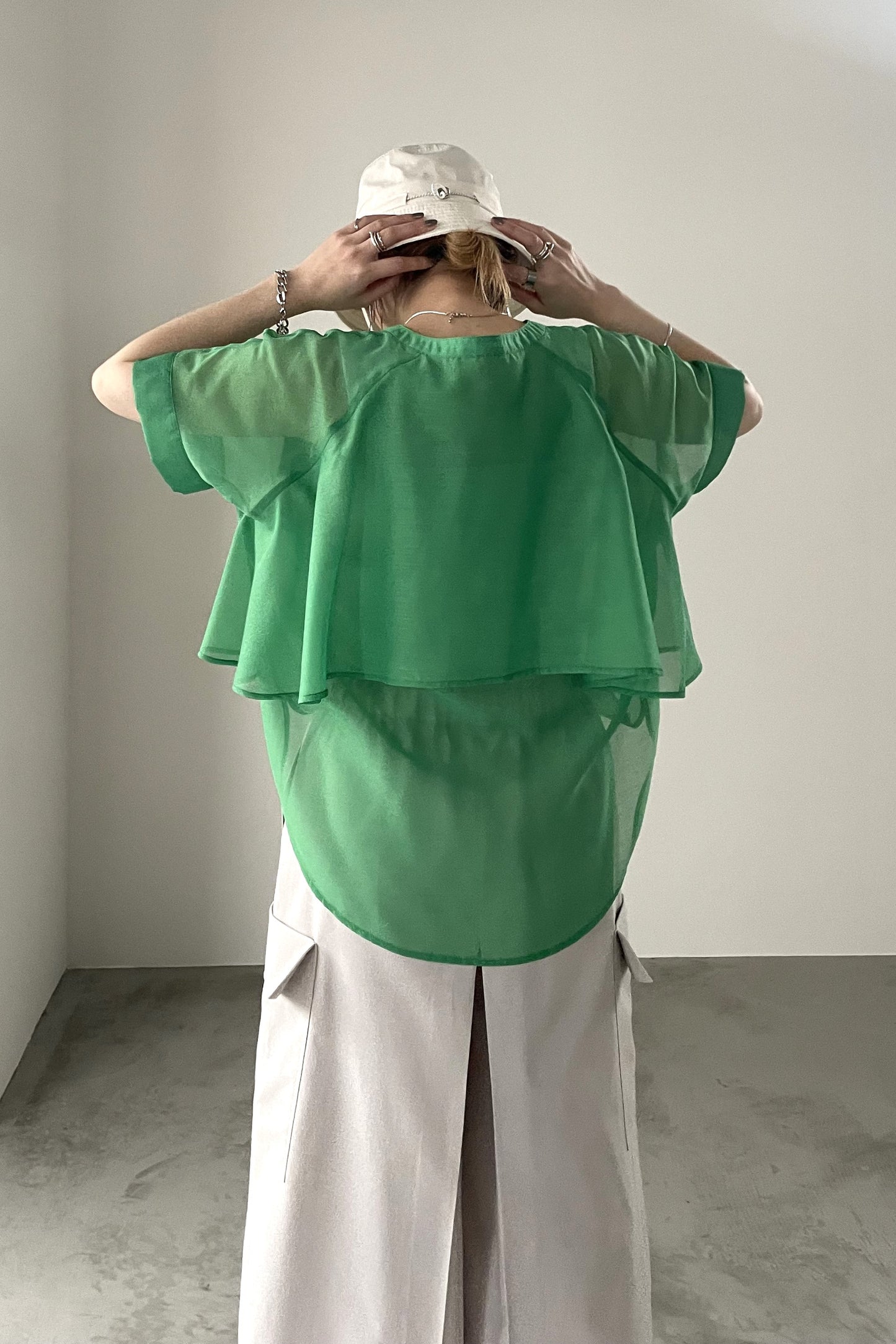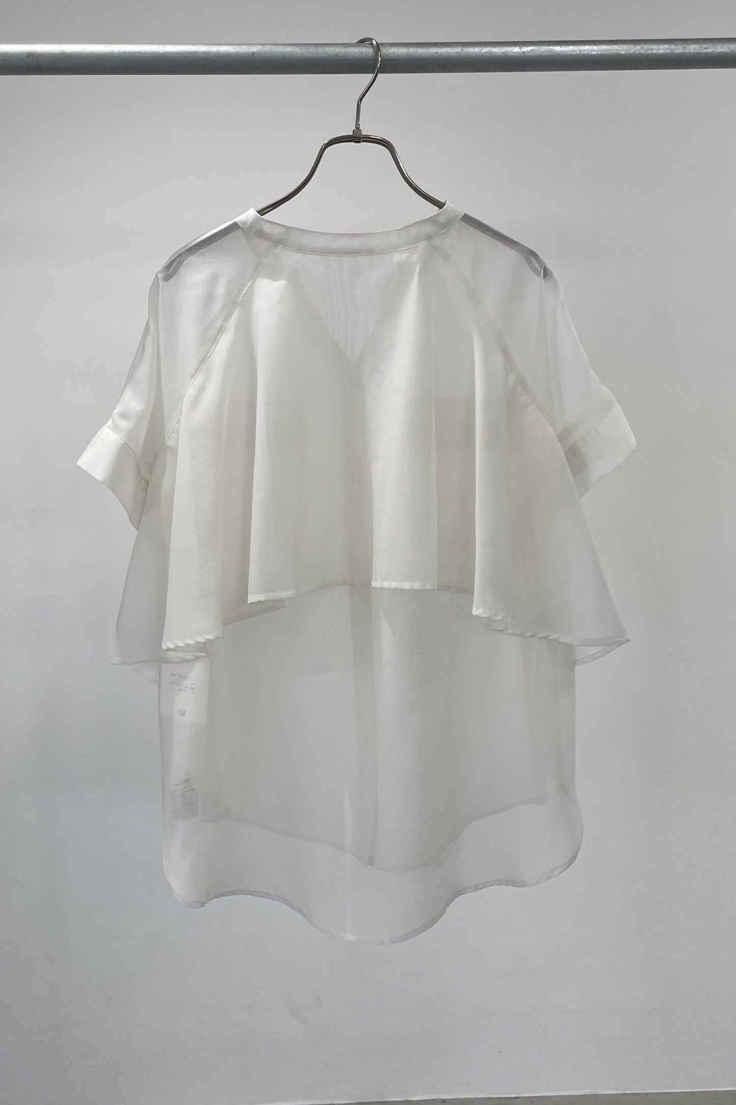 アイコンディティールのバックティアードシャツ。控えめな光沢でエアリーなシアー感のあるシャツ生地を使用。ヒップをカバーしてくれる長めの着丈も嬉しいポイント。