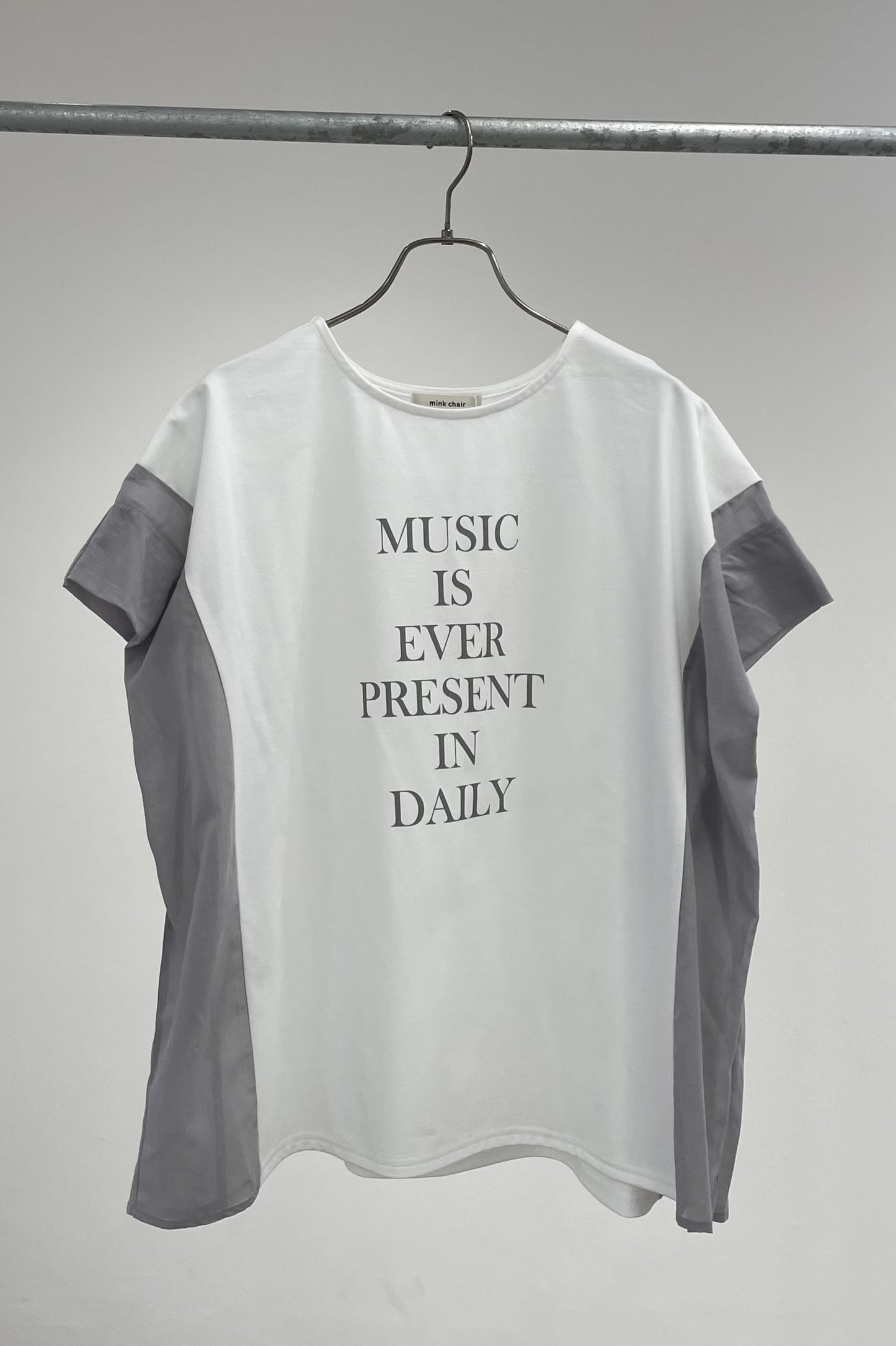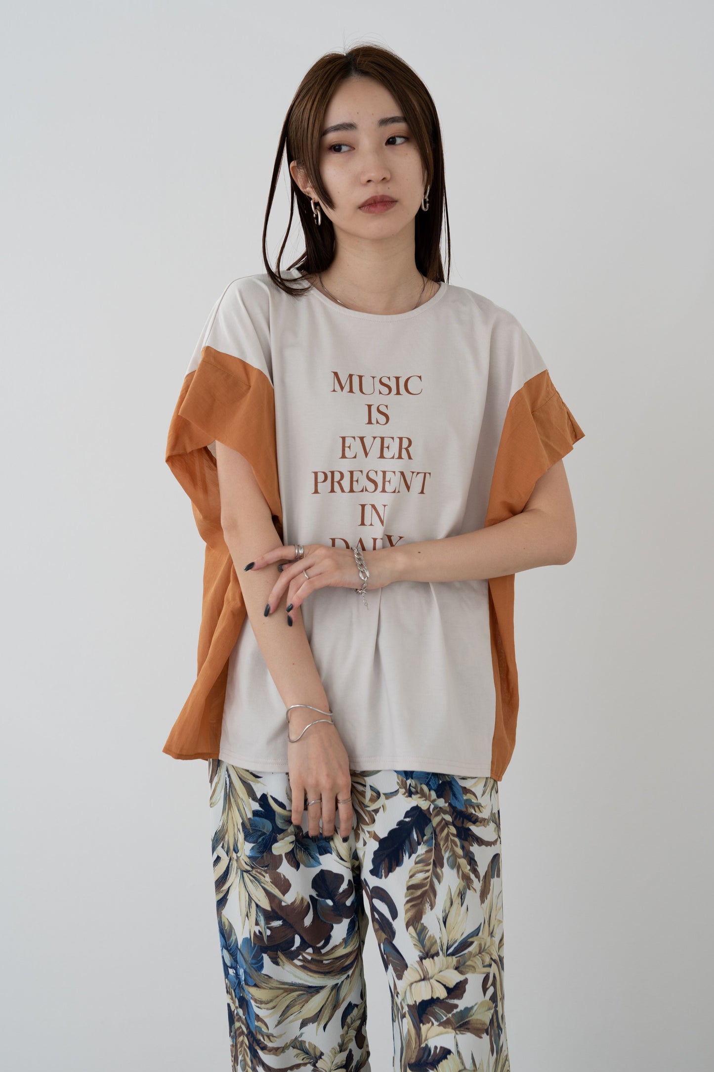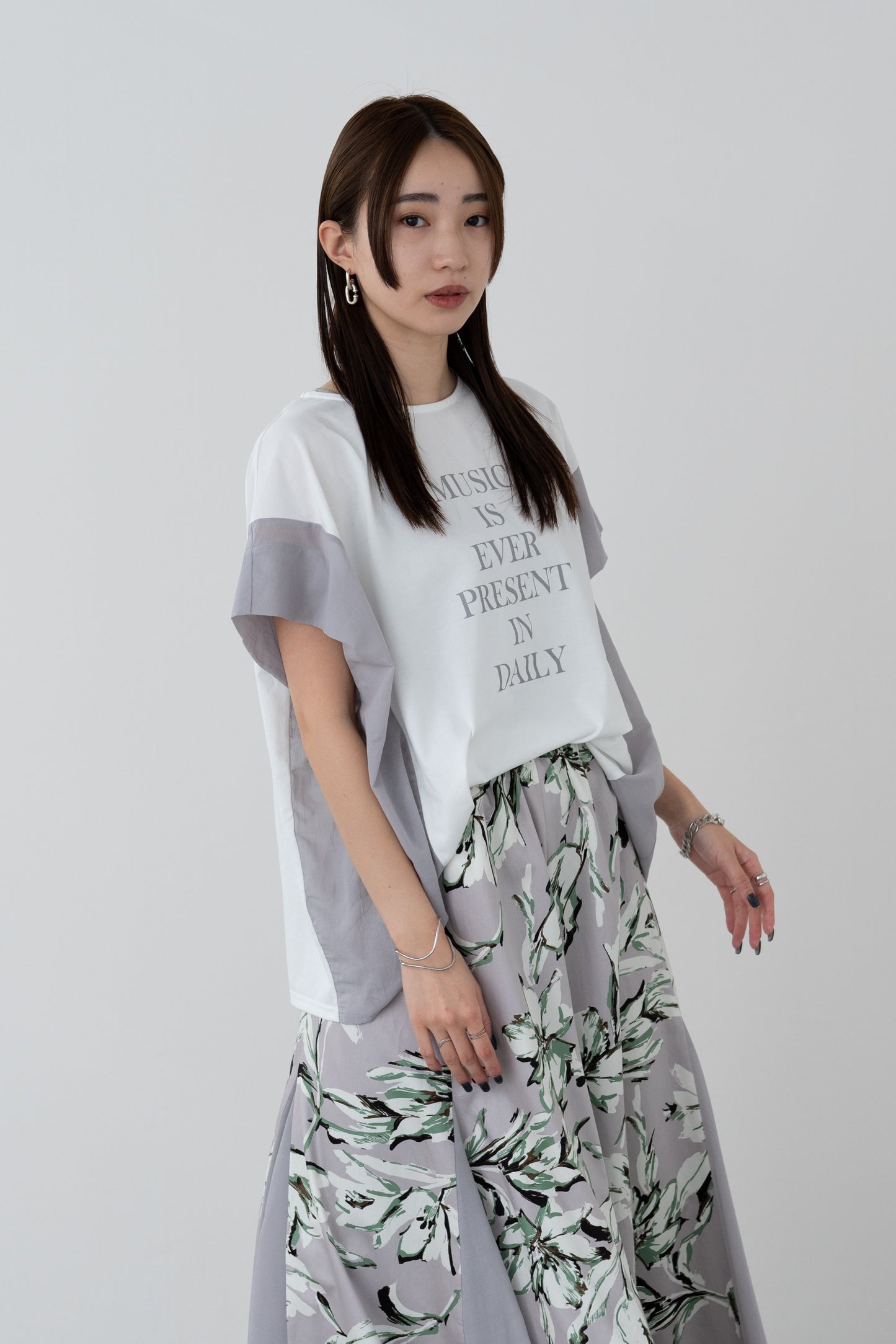 プリント・袖部分シフォンと身頃をバイカラーに仕上げたトップス。袖をドライな肌ざわりの柔らかいシフォンに切り替えることにより袖を華奢に見せてくれます。身頃生地にはコットン見えするポリエステル天竺を使用しており、コットンよりもシワになりにくく吸水速乾性の高い夏にぴったりのカットソーです。