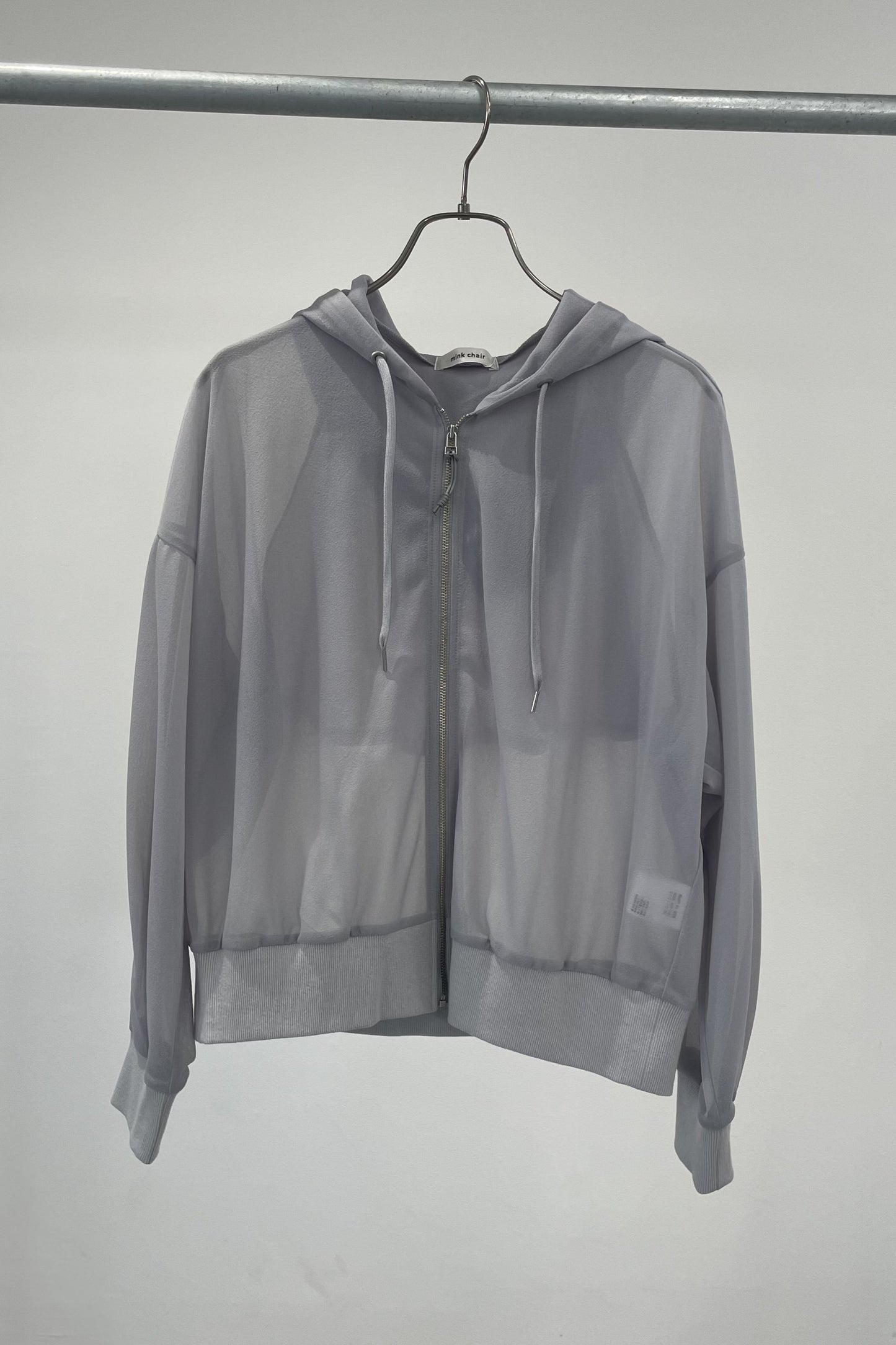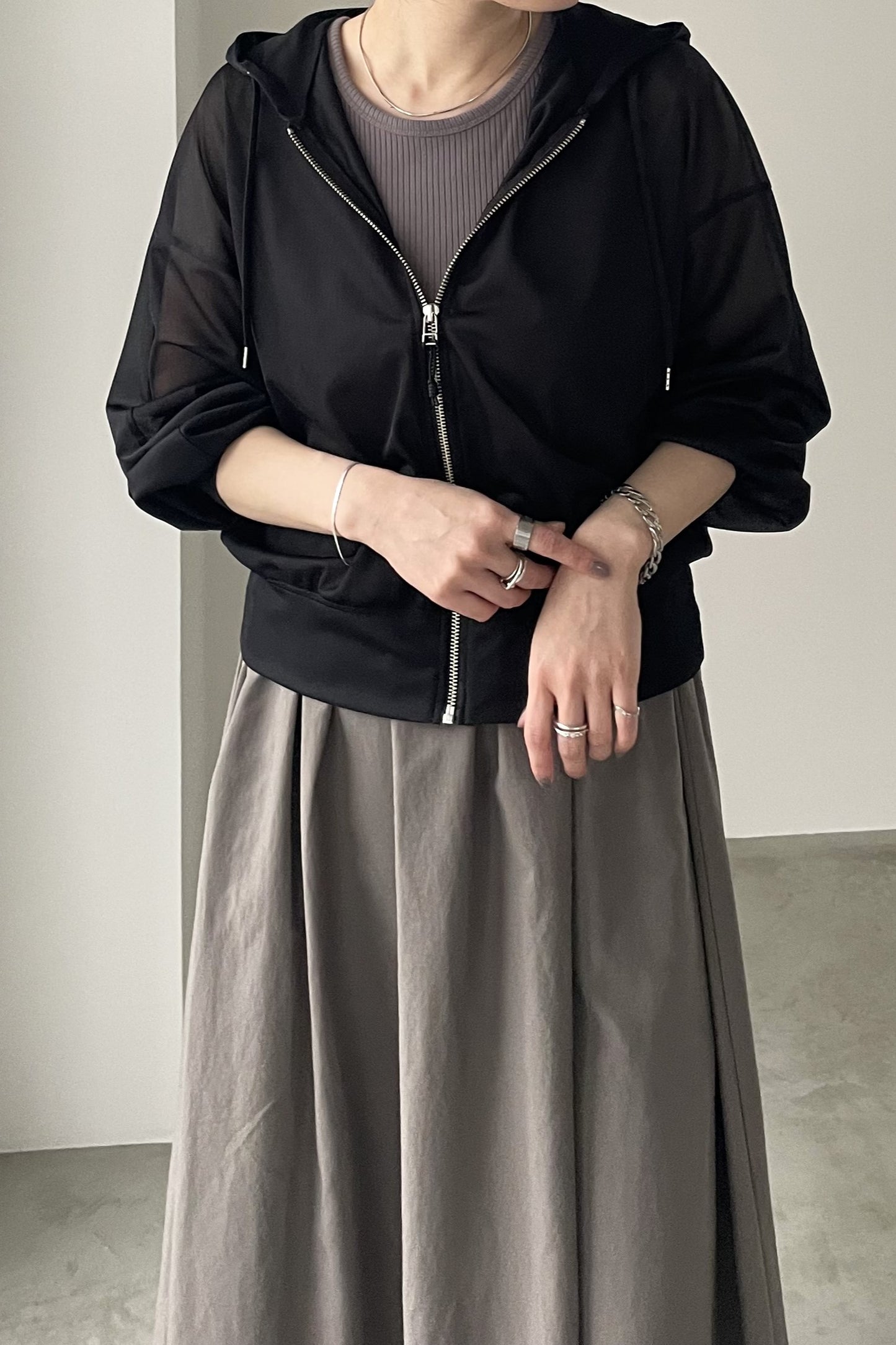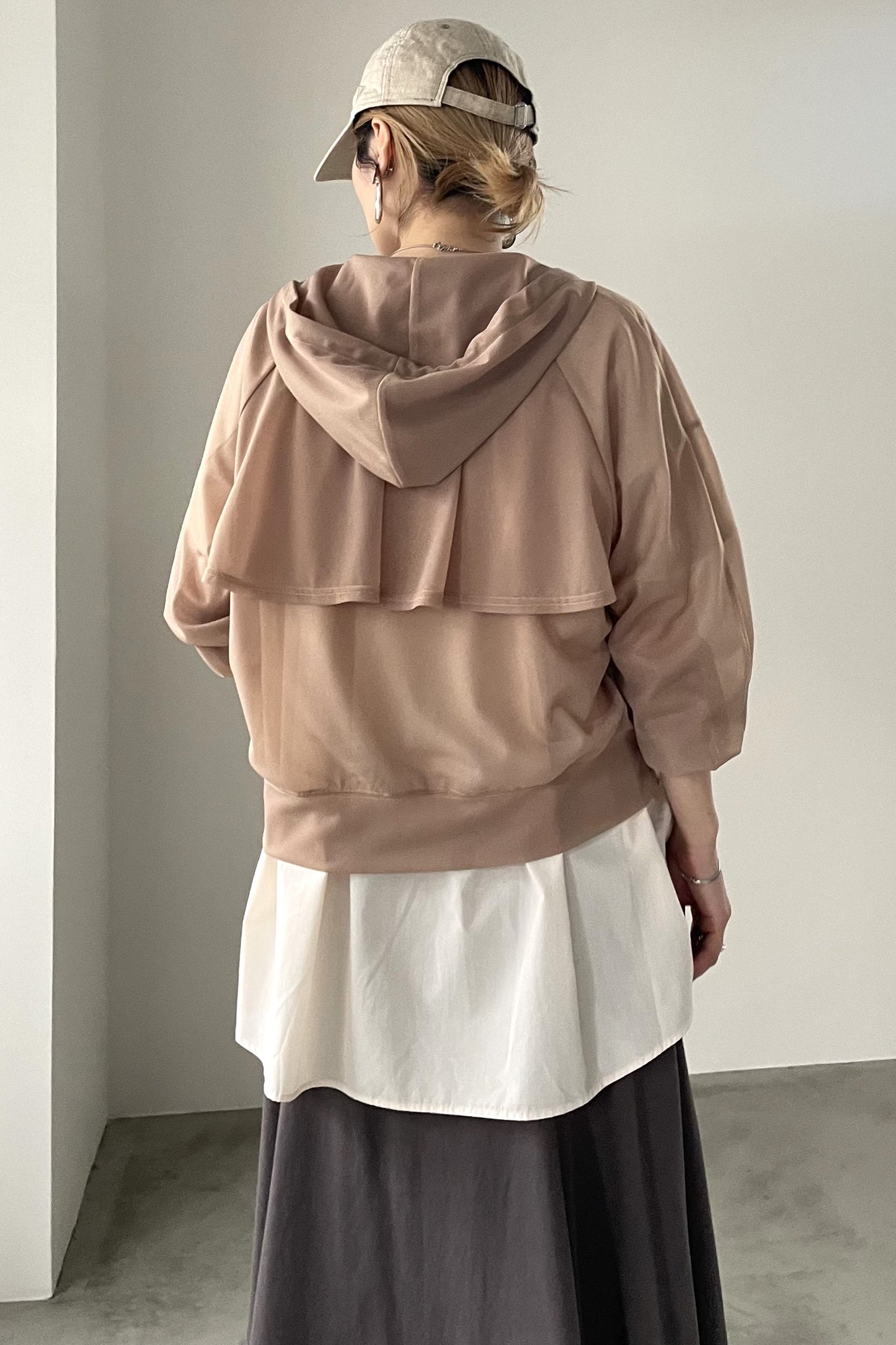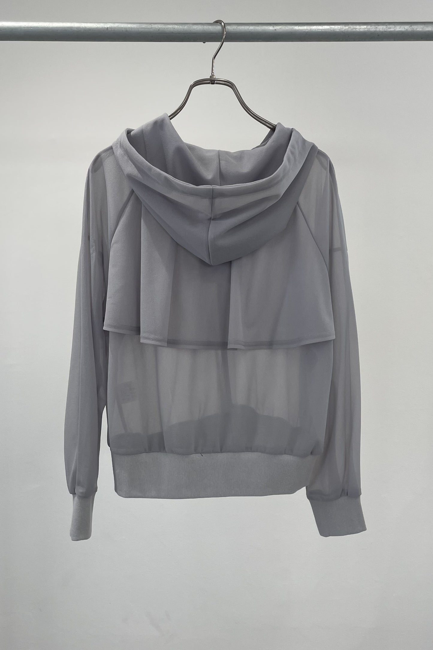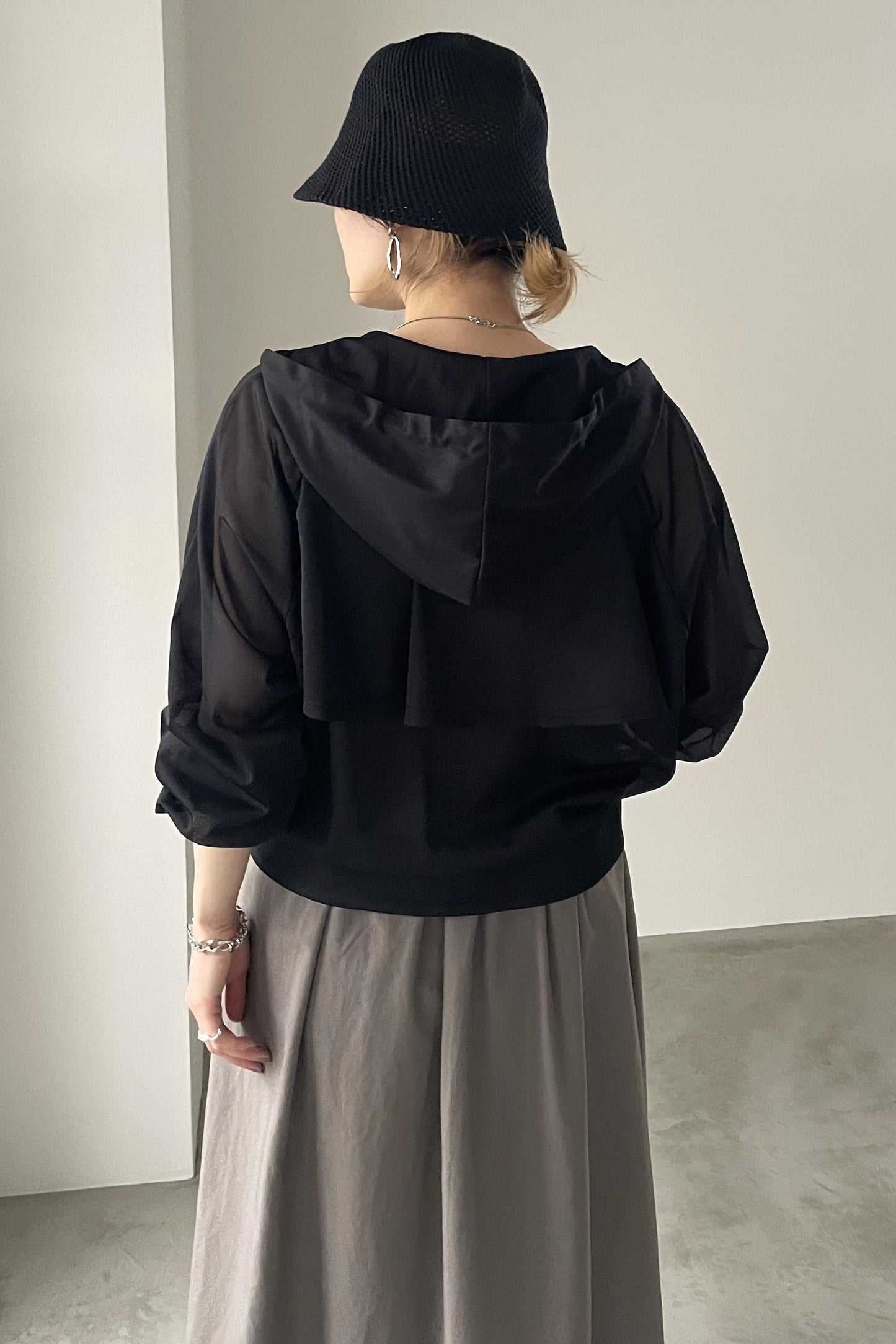 アイコンディティールのバックティアードパーカー。ストレッチ性のある超軽量のトリコットオーガンジーは光沢とシアー感を併せ持ち、夏の日除けや冷房除けにぴったり。気軽に羽織れるショート丈で、シワになりづらい生地なのでバッグの中に入れて持ち運べる優秀パーカーです。