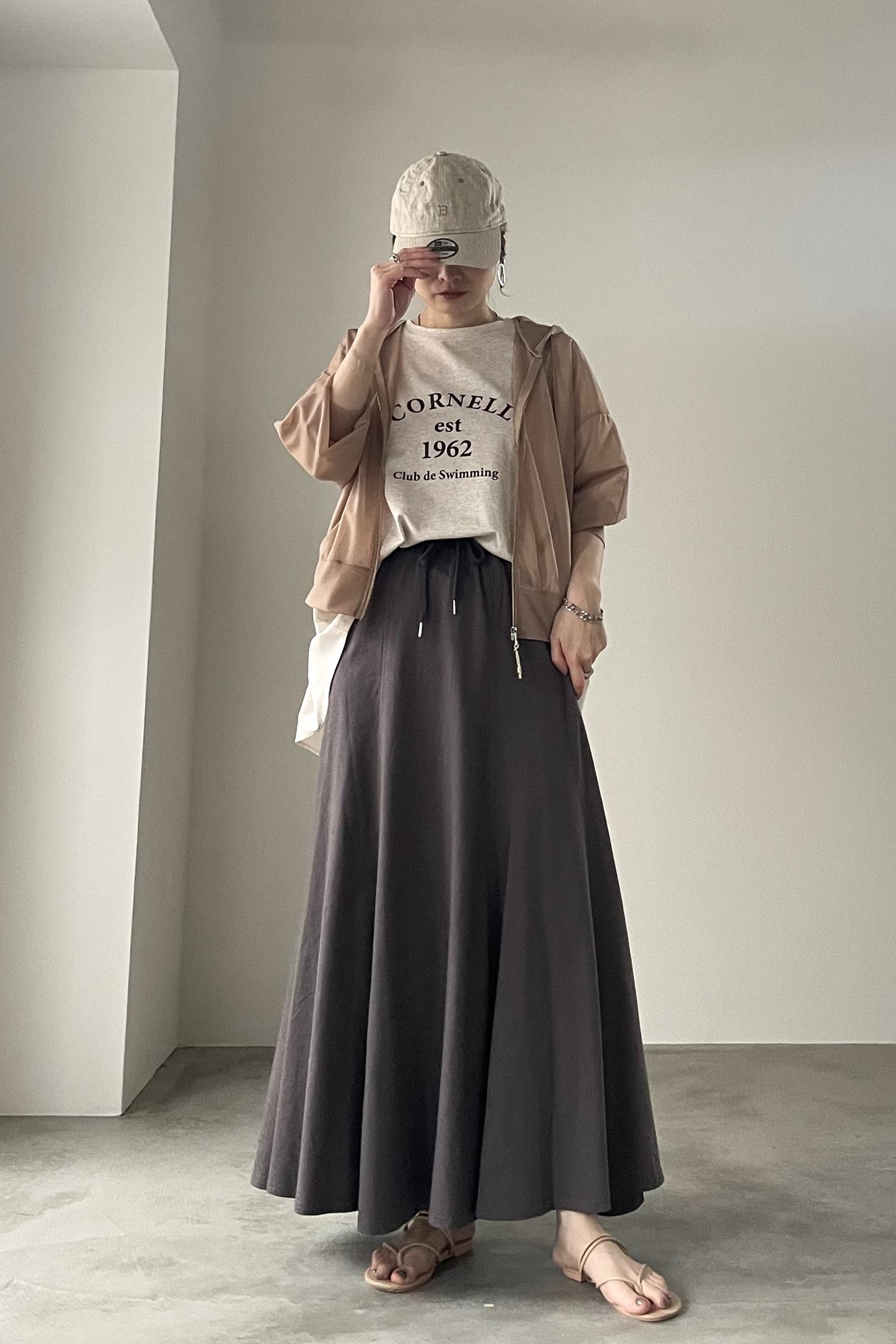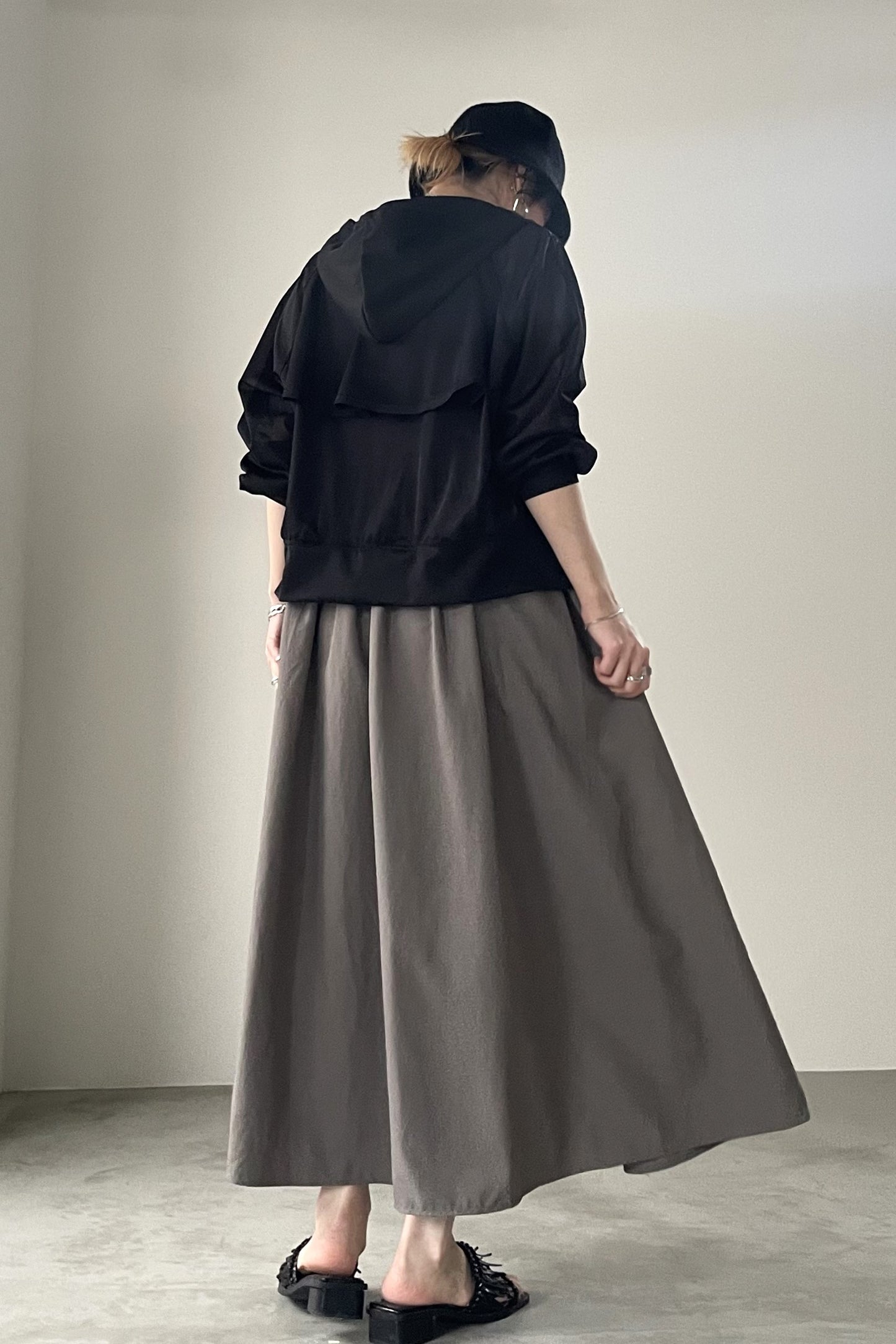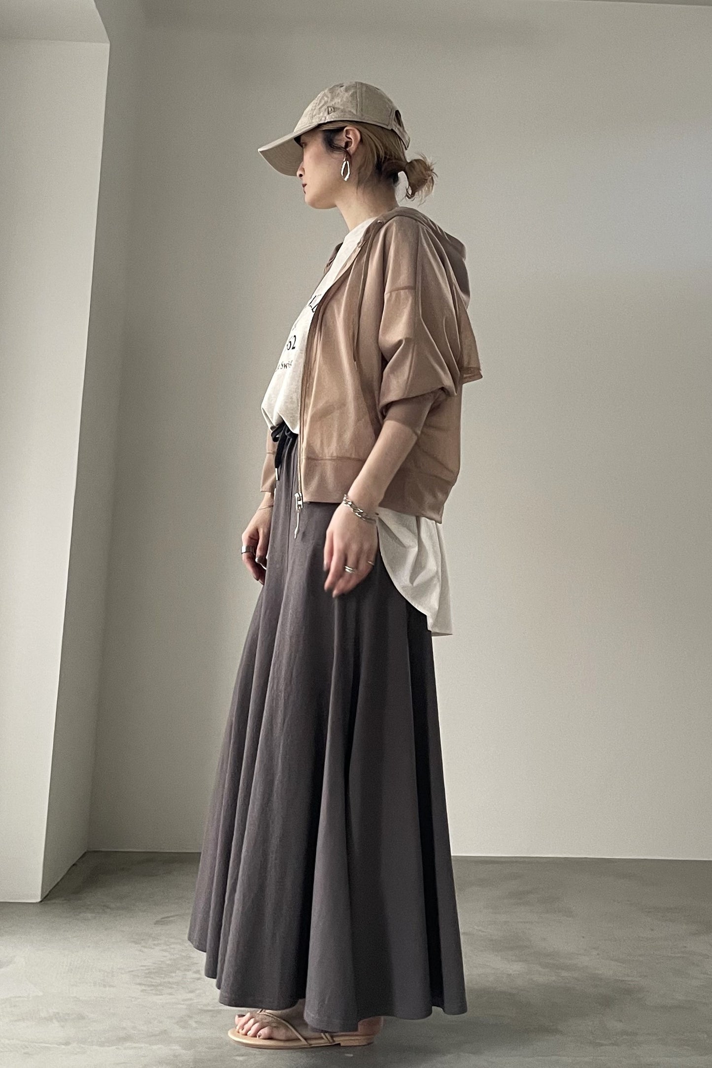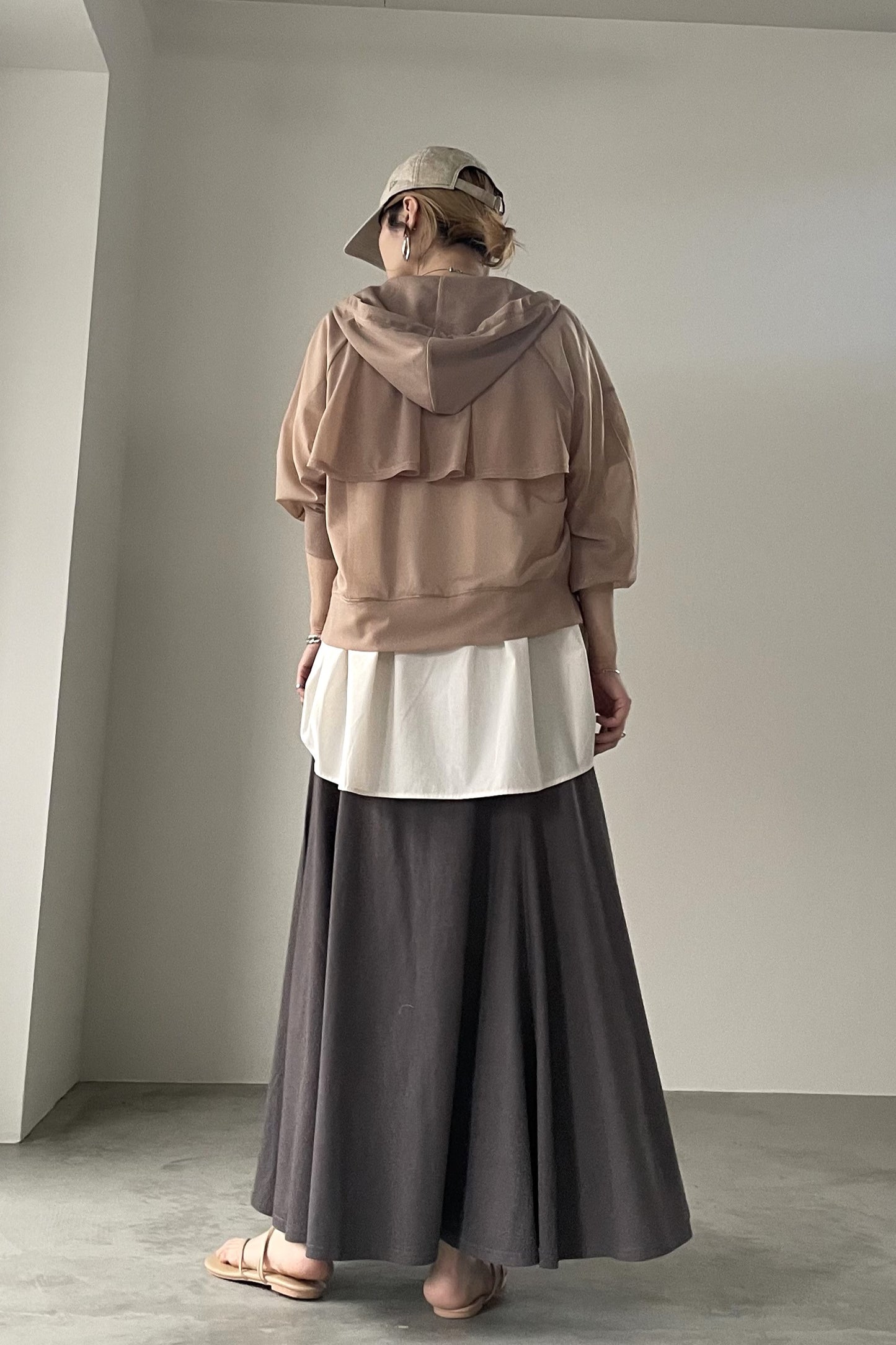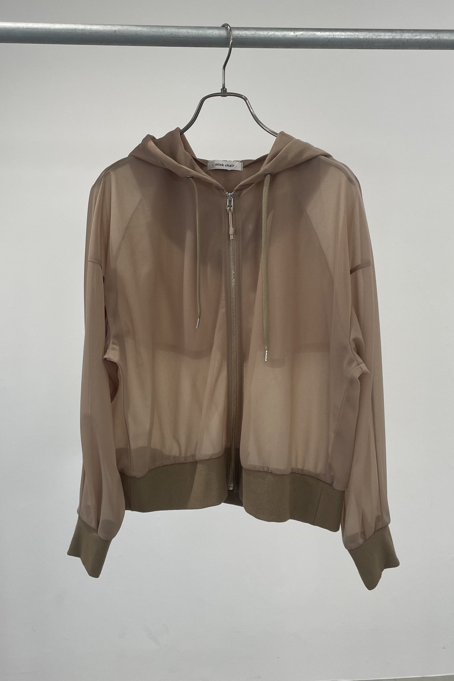 アイコンディティールのバックティアードパーカー。ストレッチ性のある超軽量のトリコットオーガンジーは光沢とシアー感を併せ持ち、夏の日除けや冷房除けにぴったり。気軽に羽織れるショート丈で、シワになりづらい生地なのでバッグの中に入れて持ち運べる優秀パーカーです。
