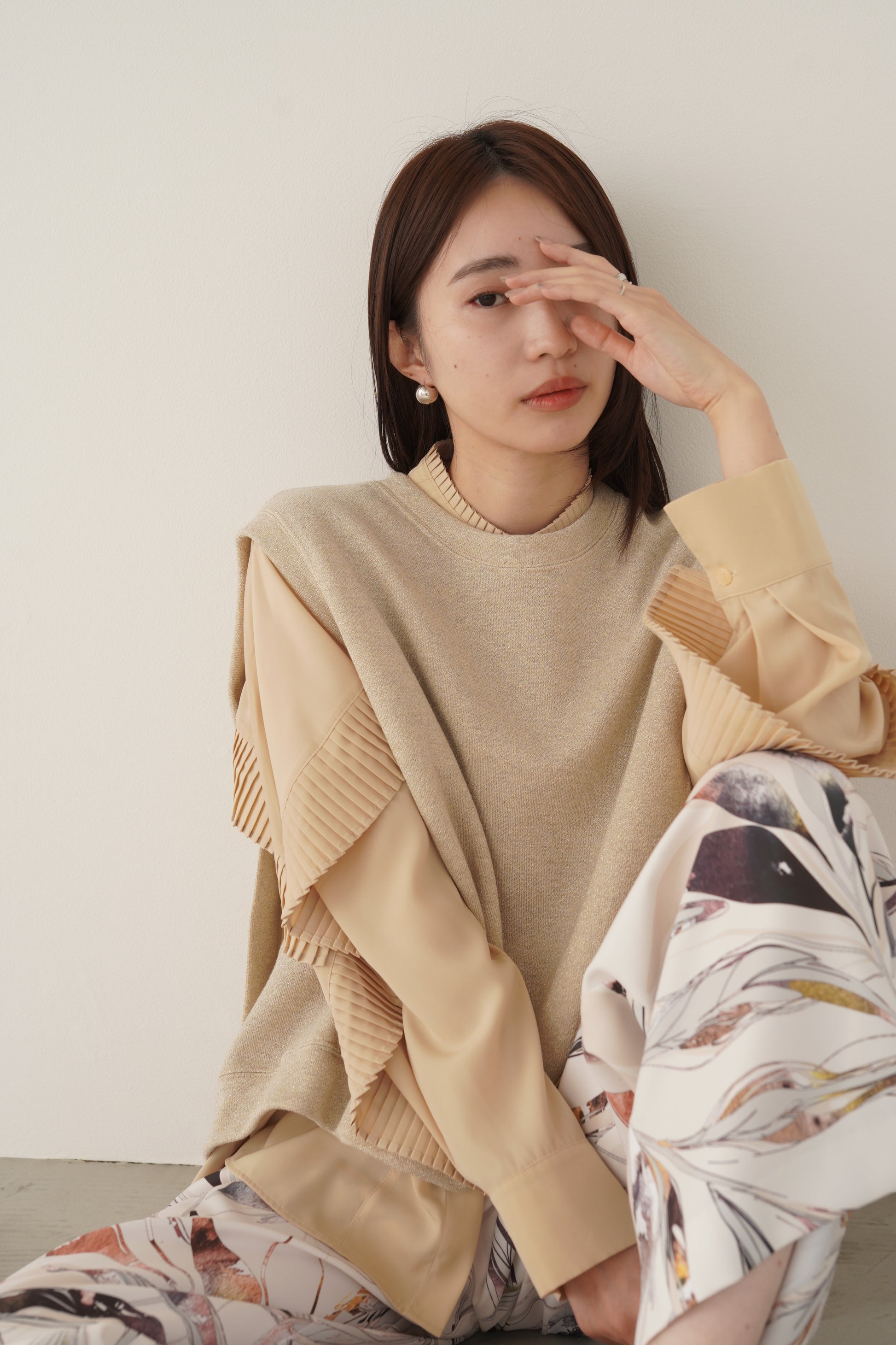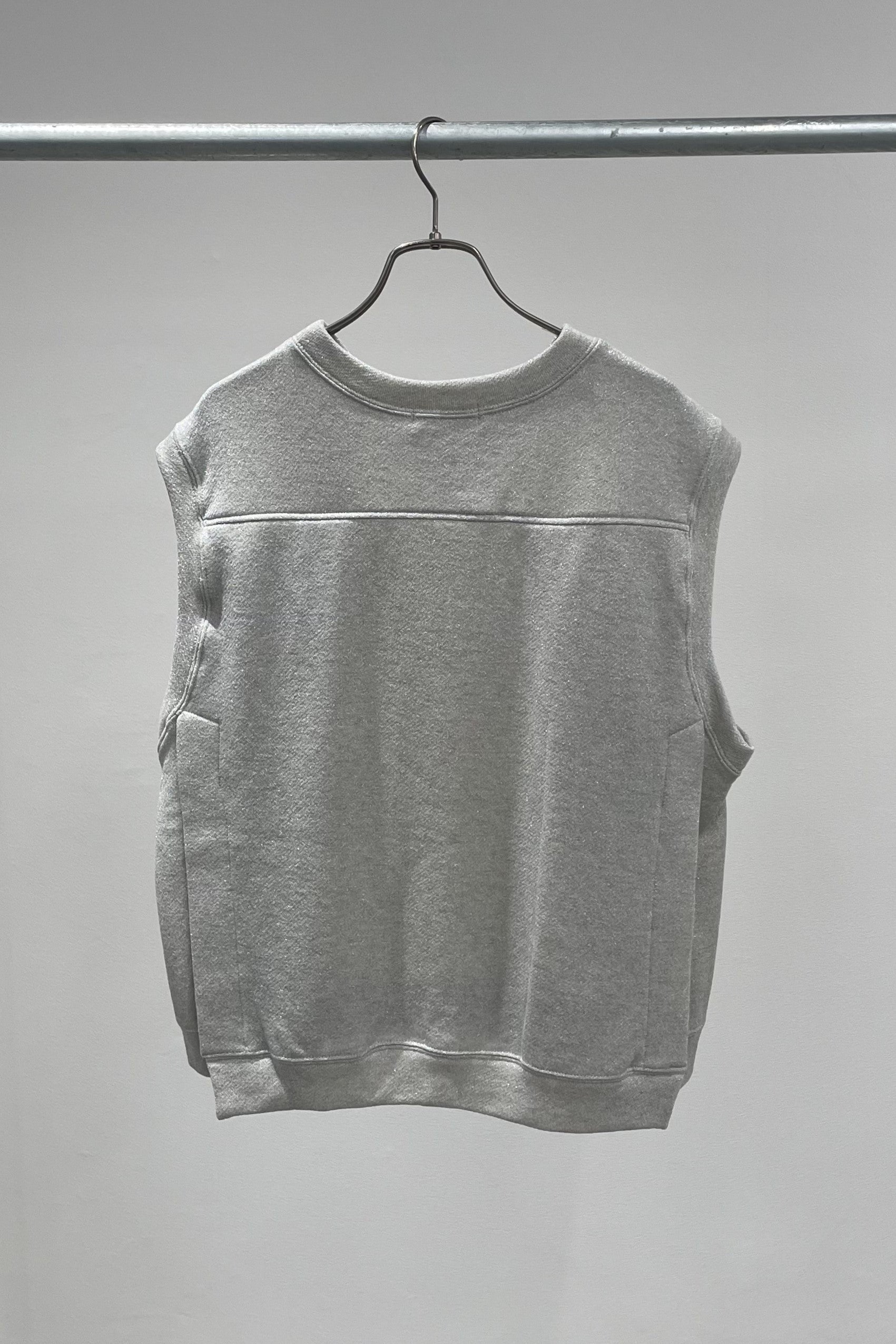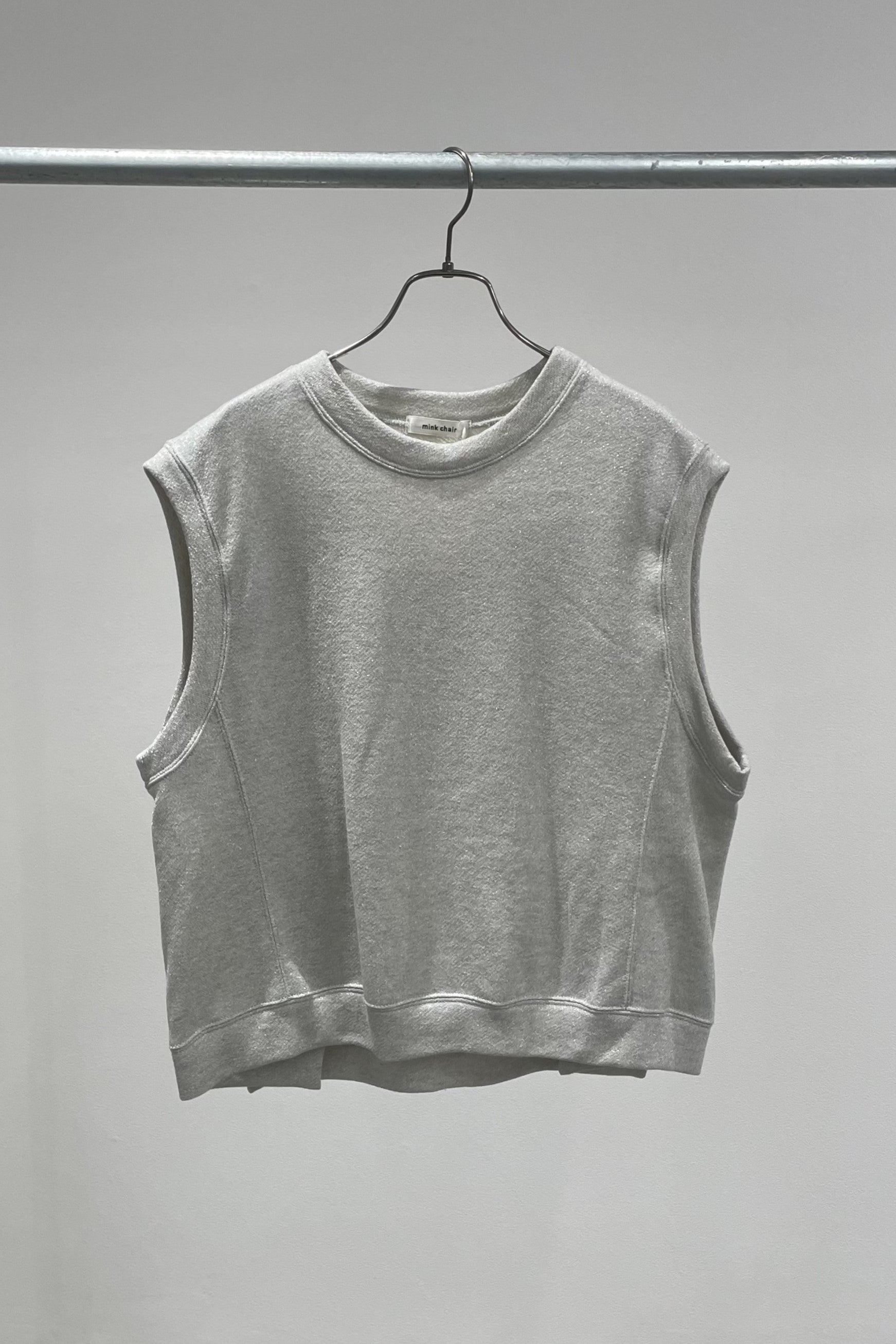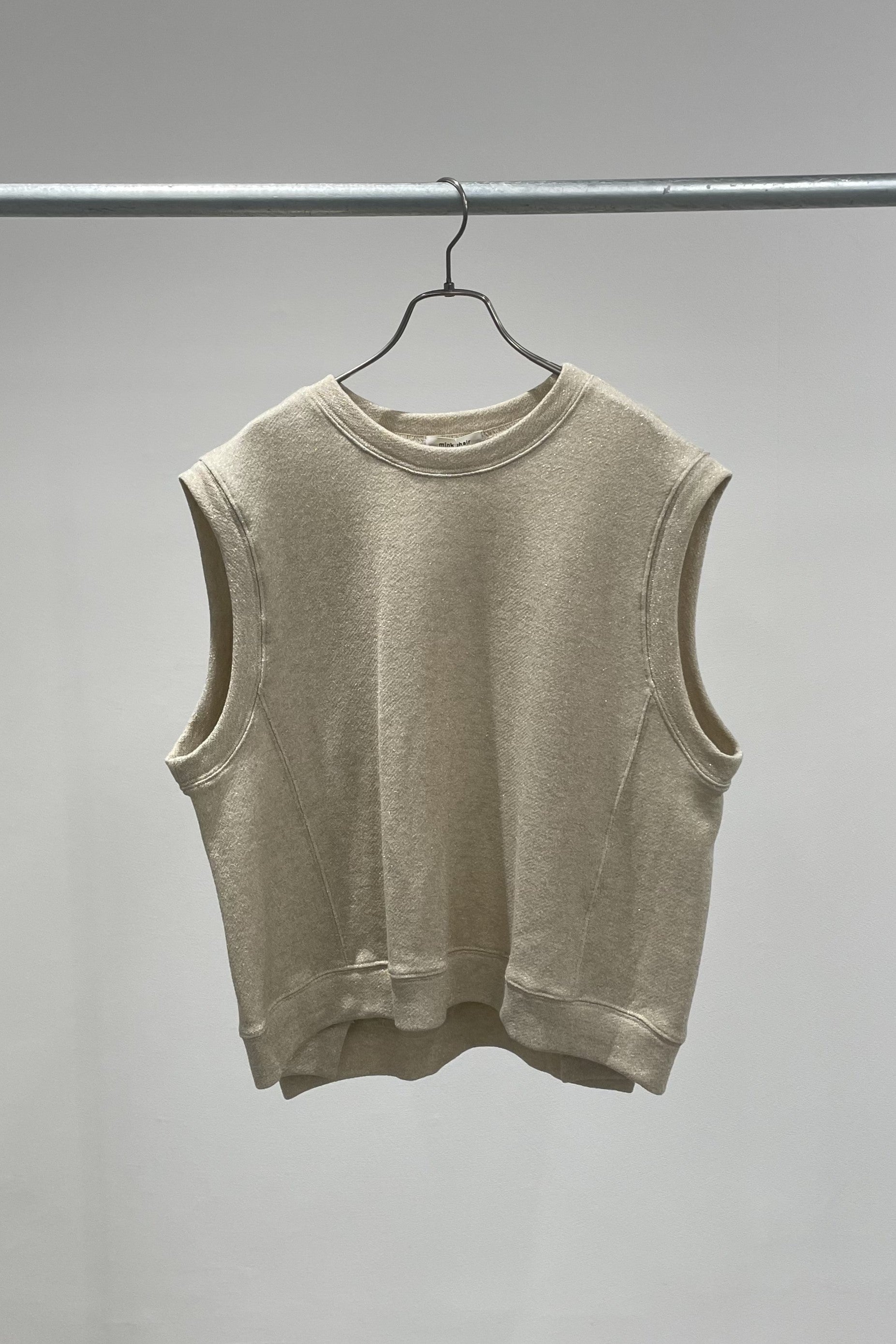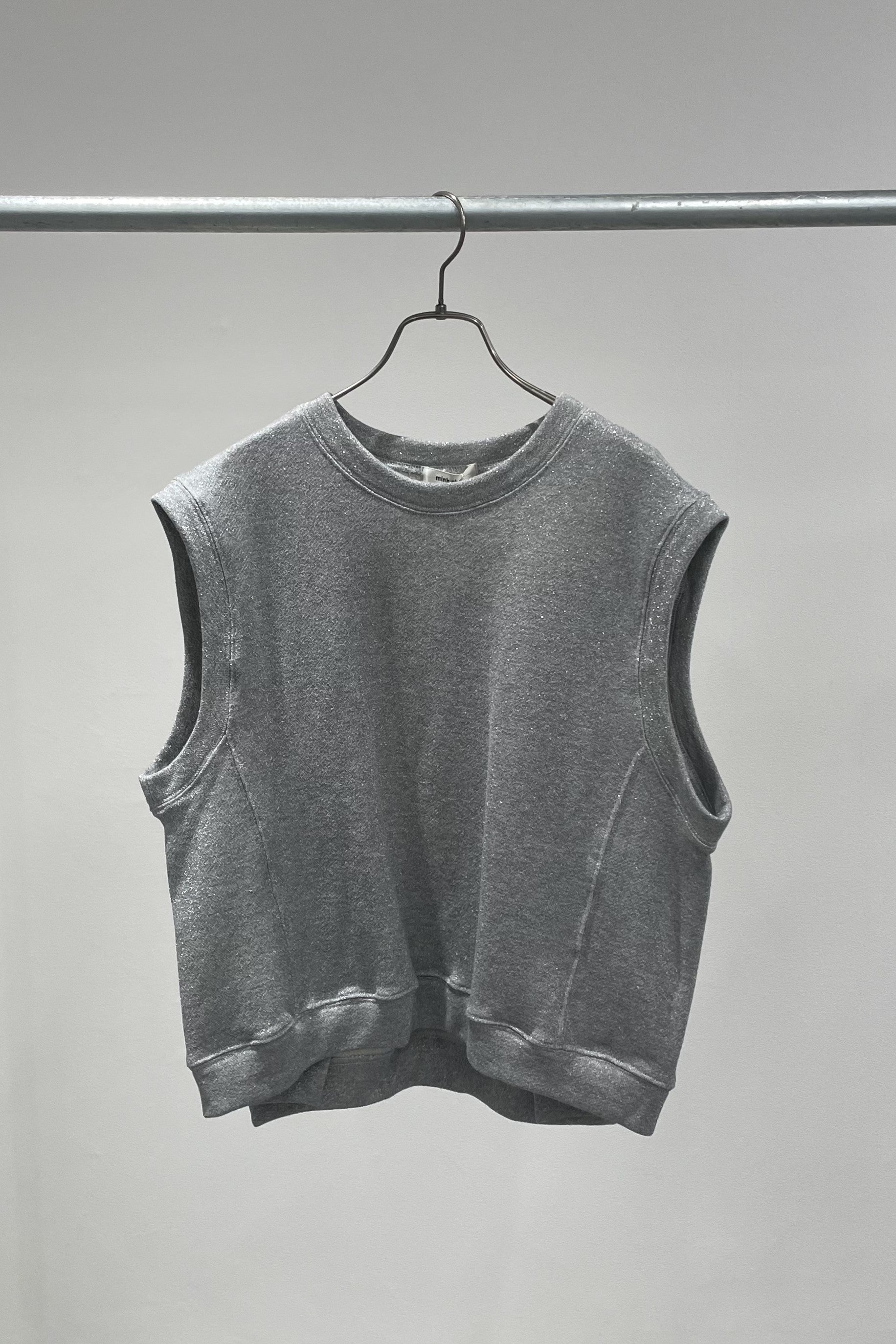 アクセサリー感覚で着用できる、キャッチーなラメスウェットのベスト。バックスタイルにスリットがあり、裾がもたつかず様々なアイテムとレイヤードが楽しめるようにコンパクトな着丈で仕上げました。ニットと違いイージーケアなアイテムでシーズンレスに活躍します。