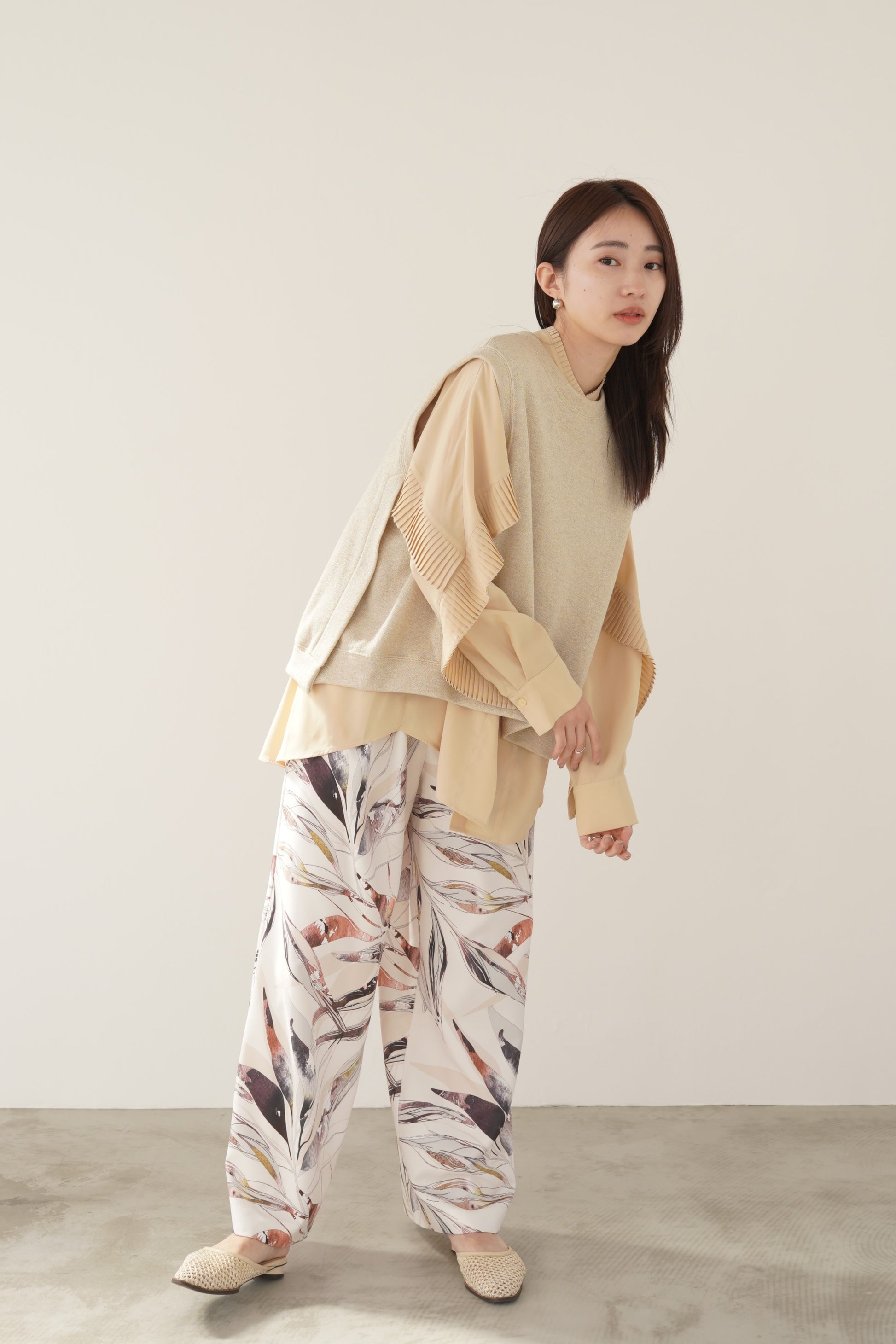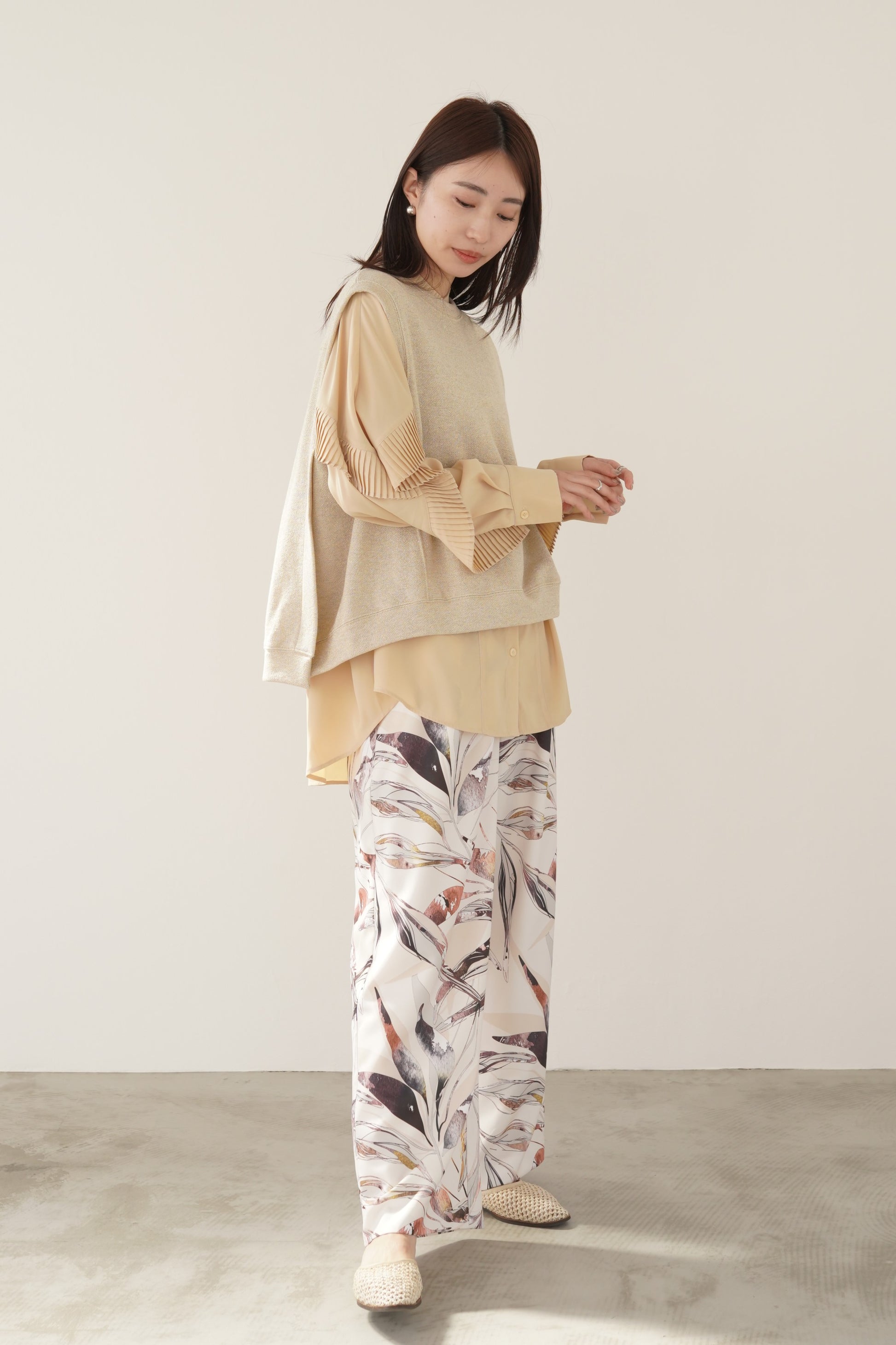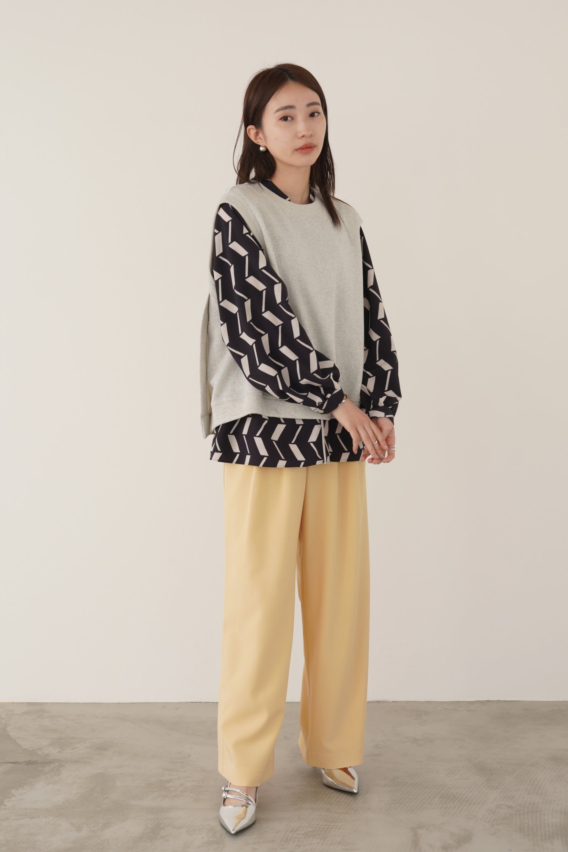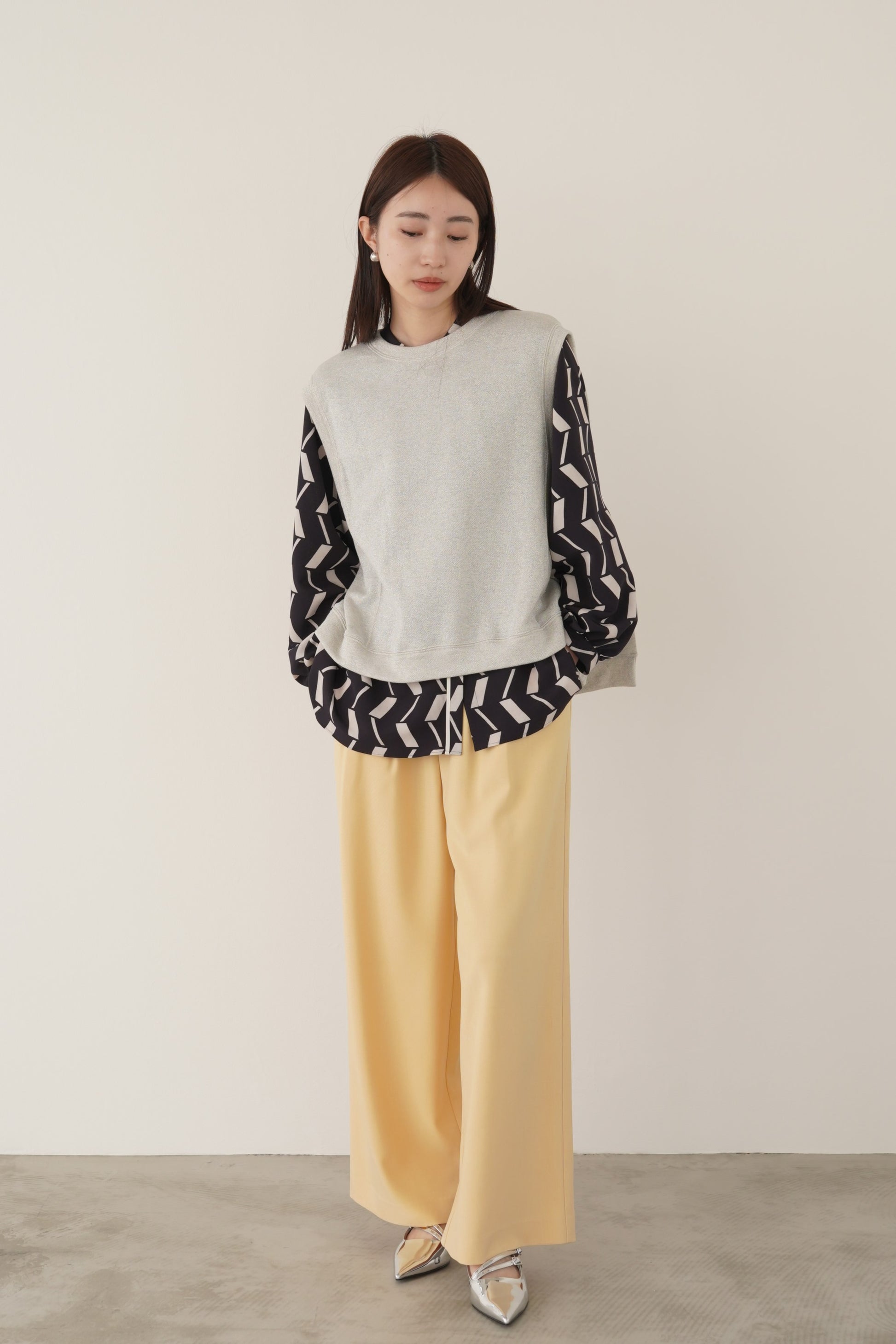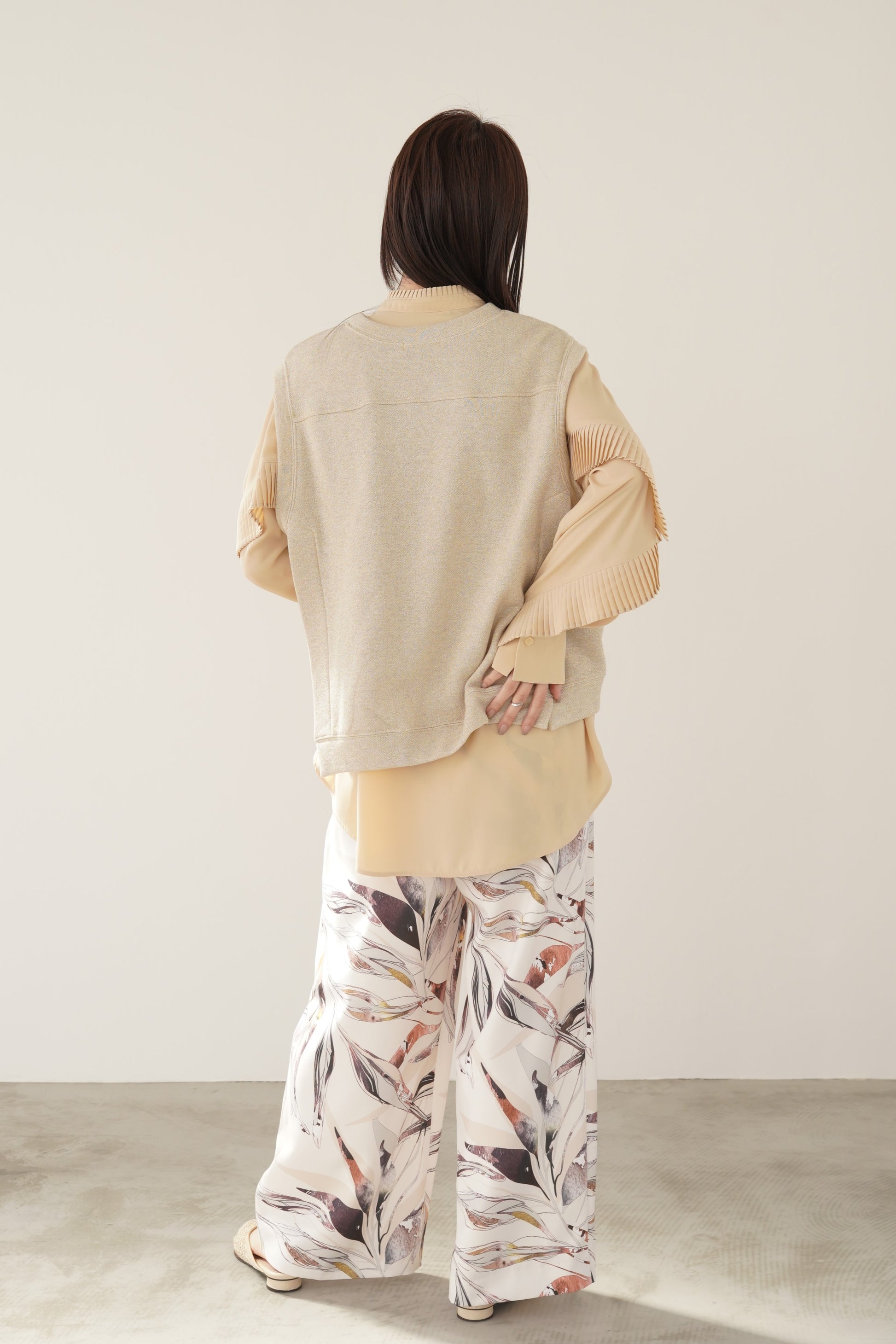 アクセサリー感覚で着用できる、キャッチーなラメスウェットのベスト。バックスタイルにスリットがあり、裾がもたつかず様々なアイテムとレイヤードが楽しめるようにコンパクトな着丈で仕上げました。ニットと違いイージーケアなアイテムでシーズンレスに活躍します。