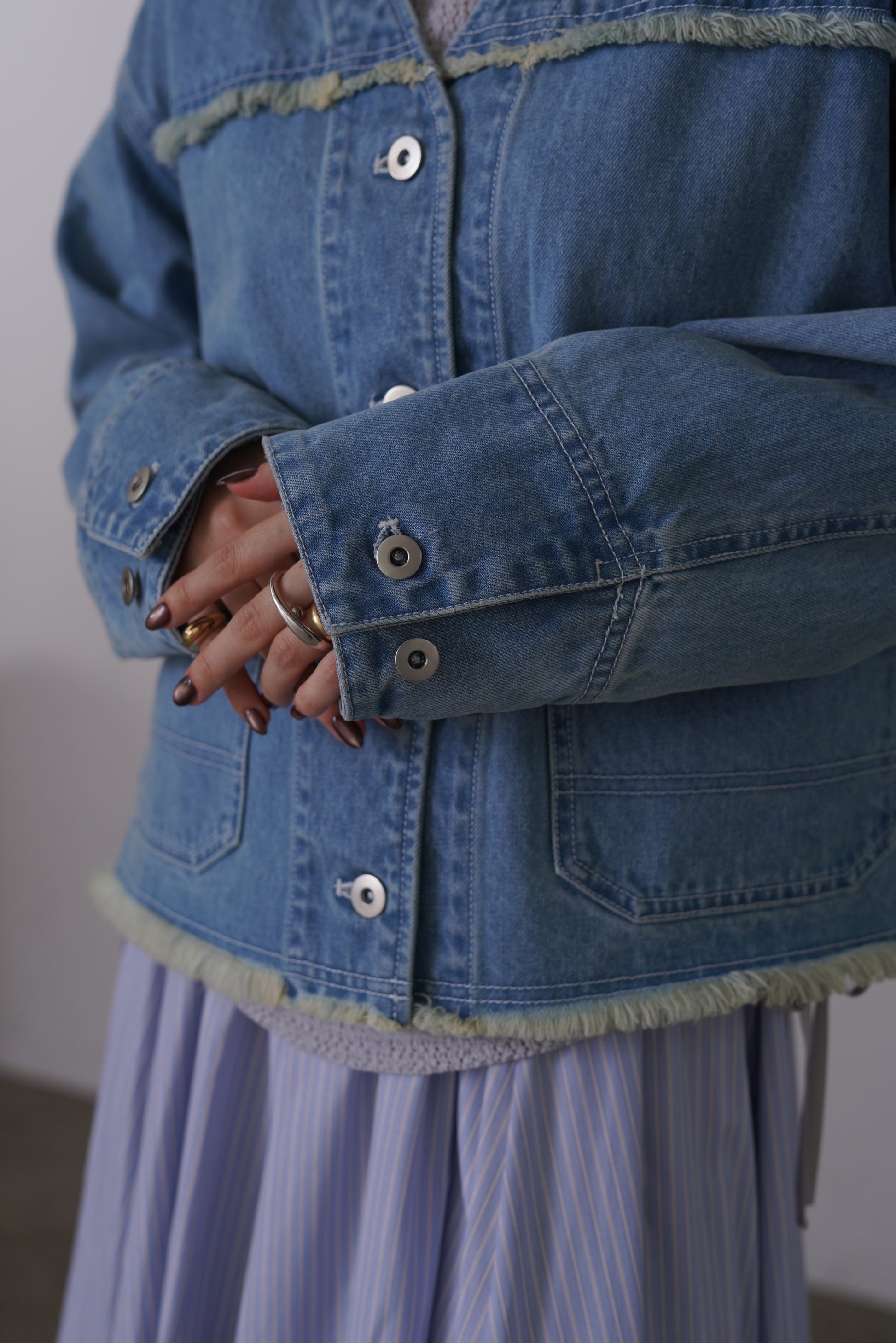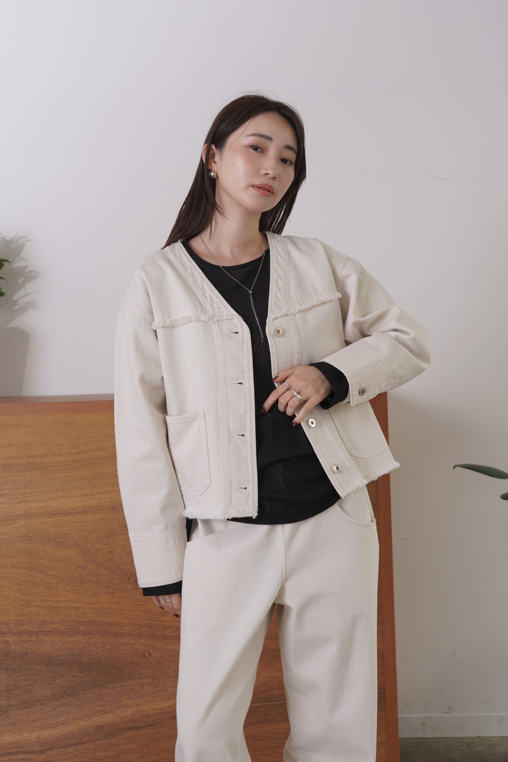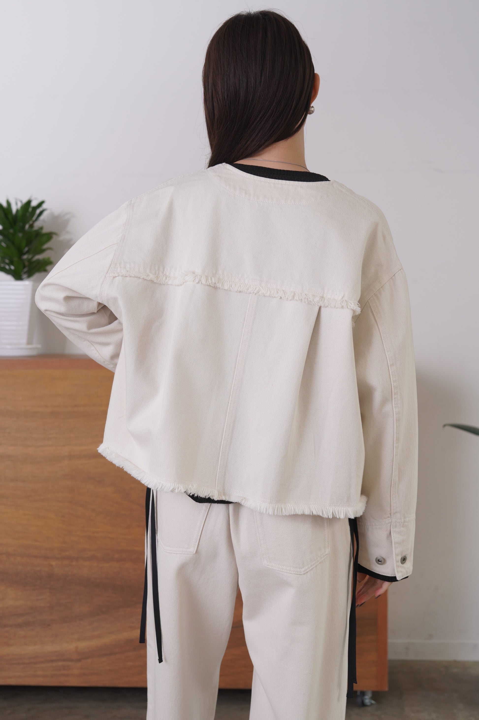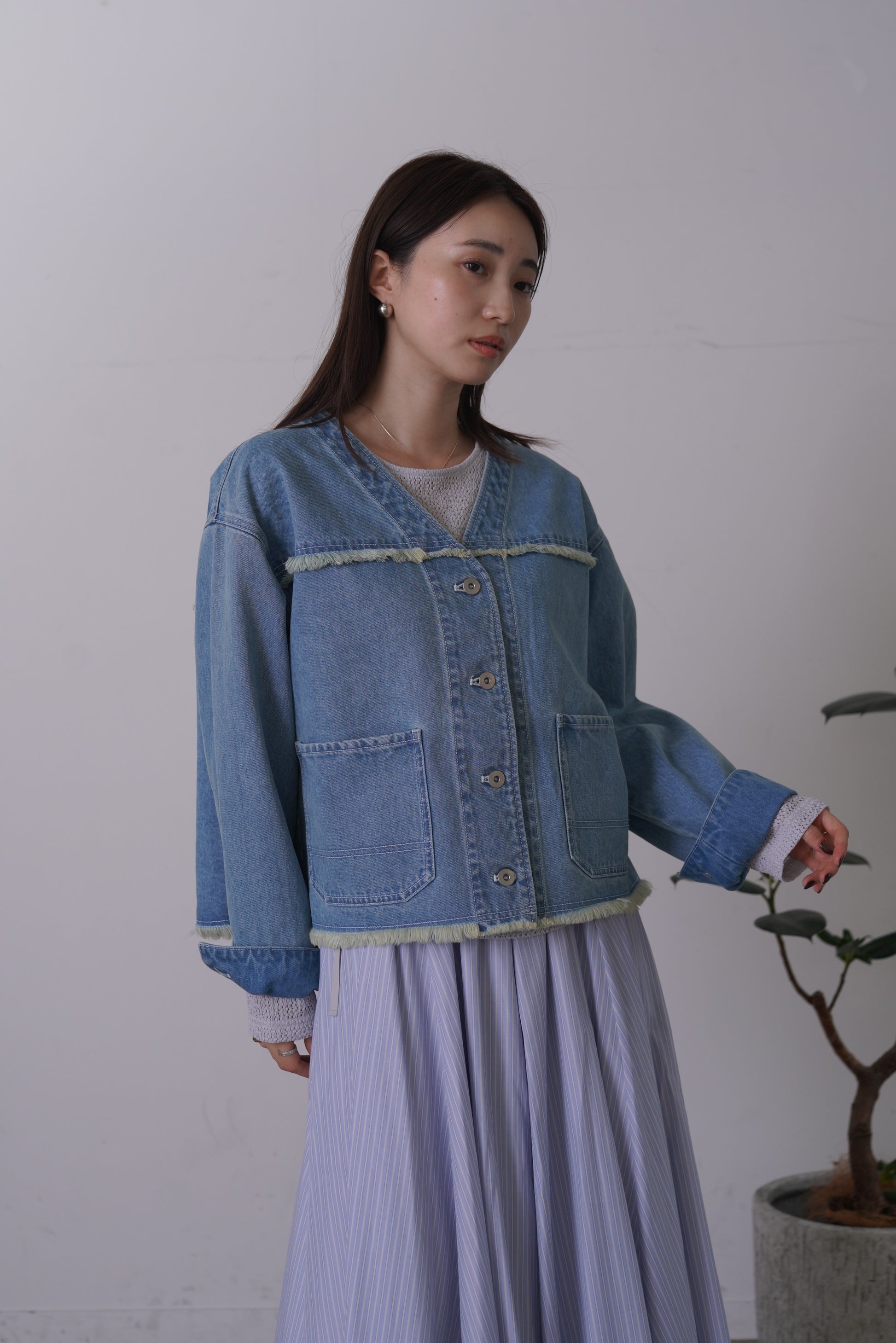 随所にフリンジを施したVカラーのデニムジャケット。コンパクトな着丈とリラックスシルエットで、パンツにもスカートにも合わせやすいサイズ感に仕上げました。同素材デニムパンツとのセットアップもおすすめです。