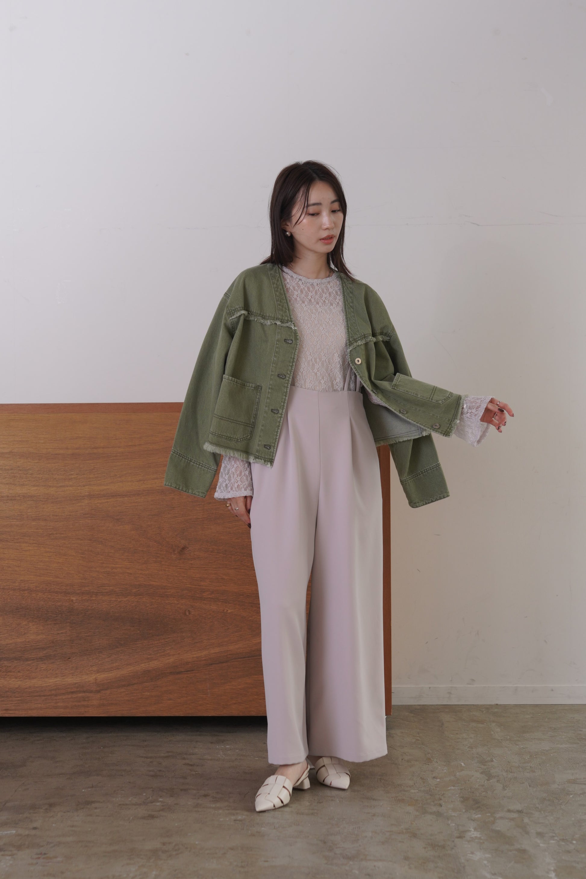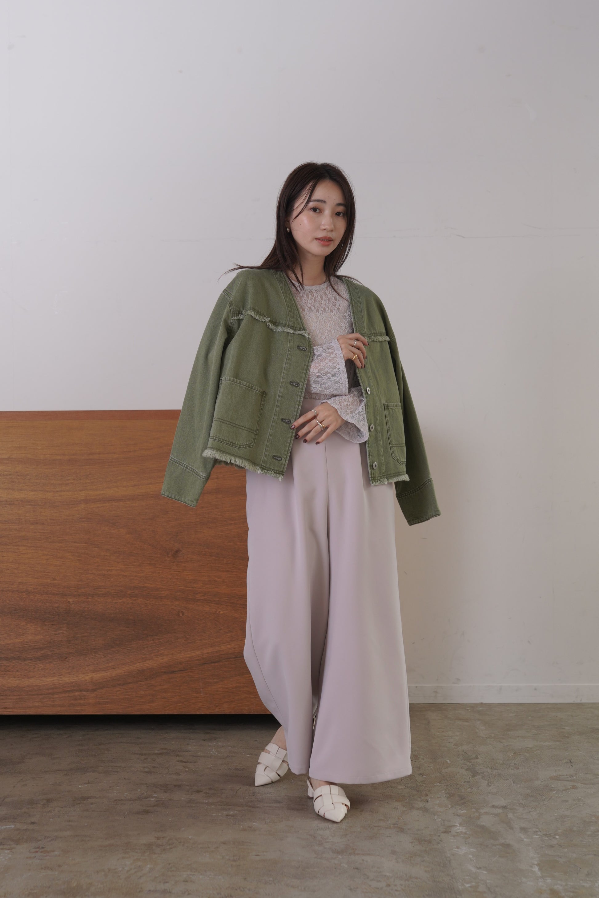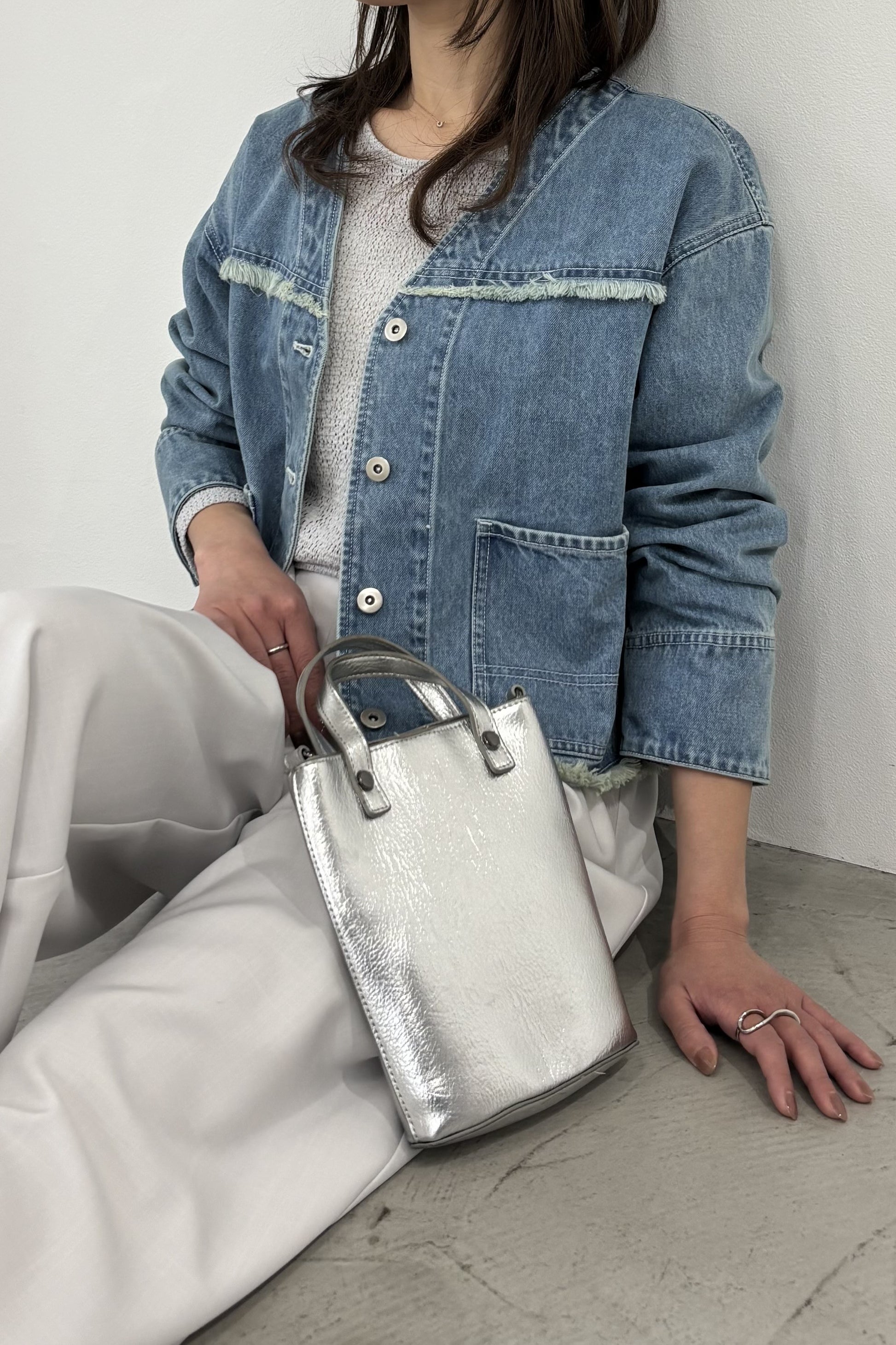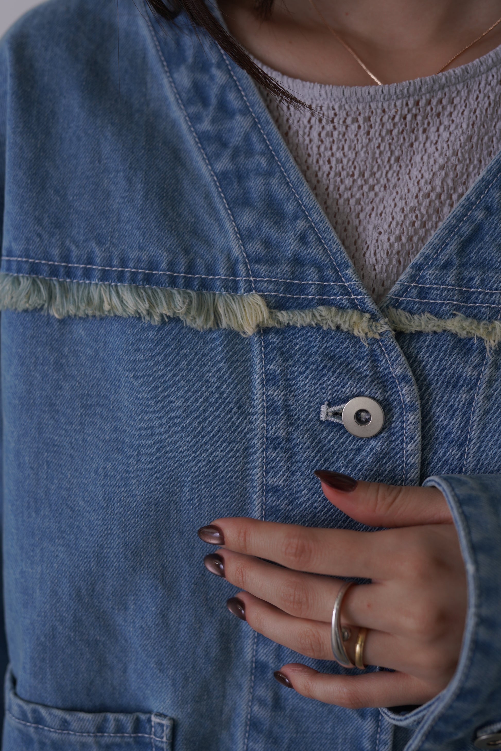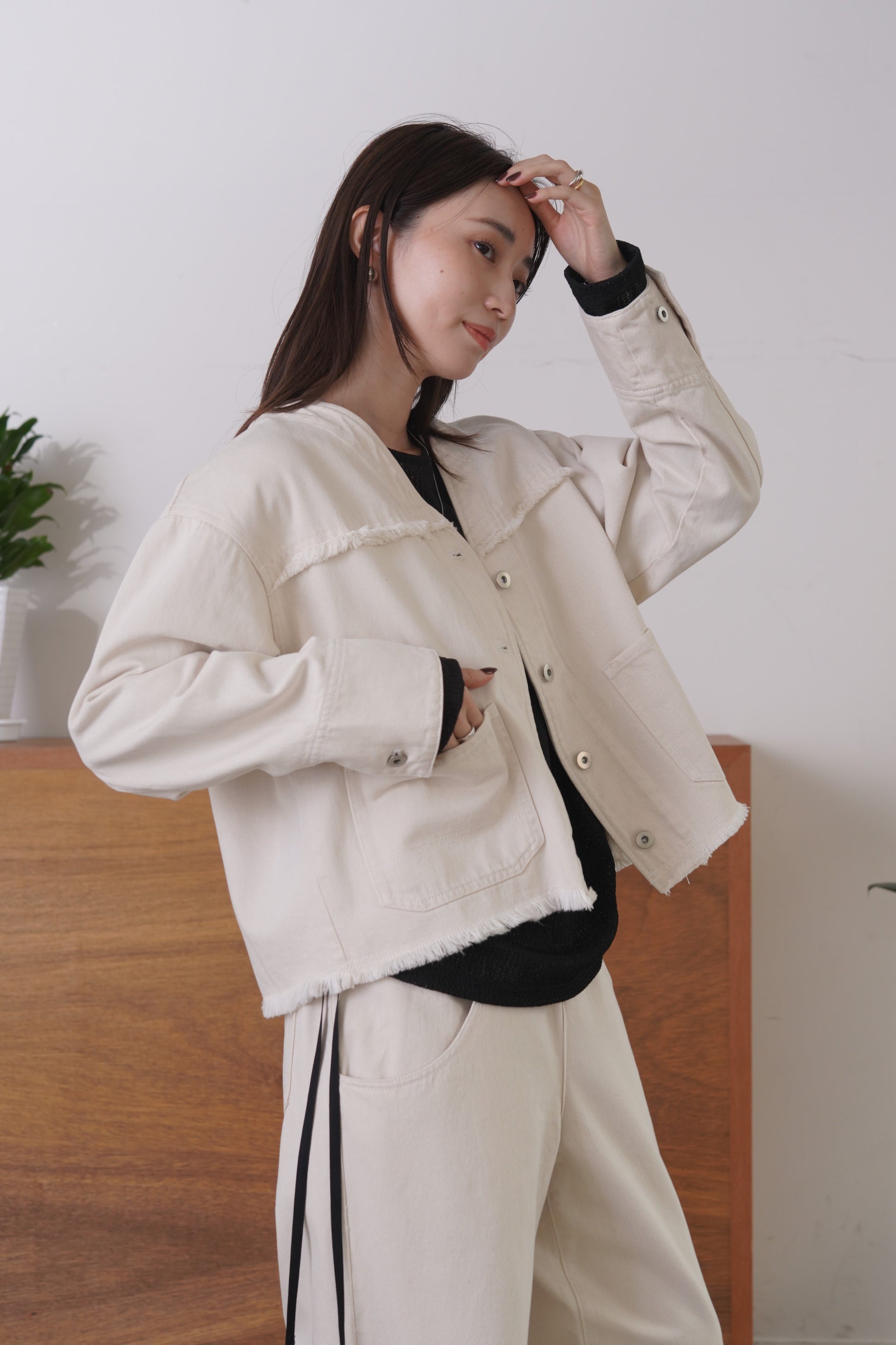 随所にフリンジを施したVカラーのデニムジャケット。コンパクトな着丈とリラックスシルエットで、パンツにもスカートにも合わせやすいサイズ感に仕上げました。同素材デニムパンツとのセットアップもおすすめです。